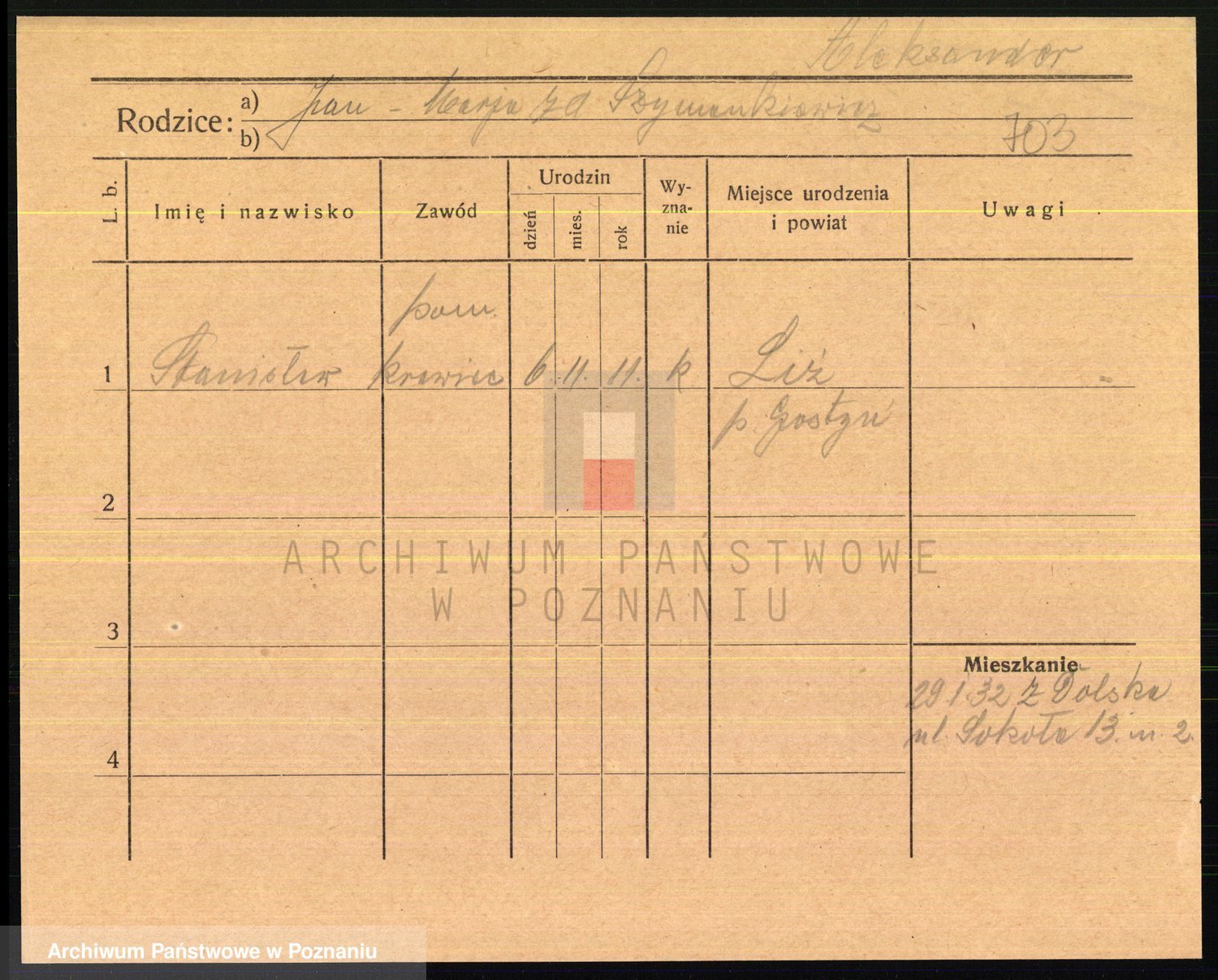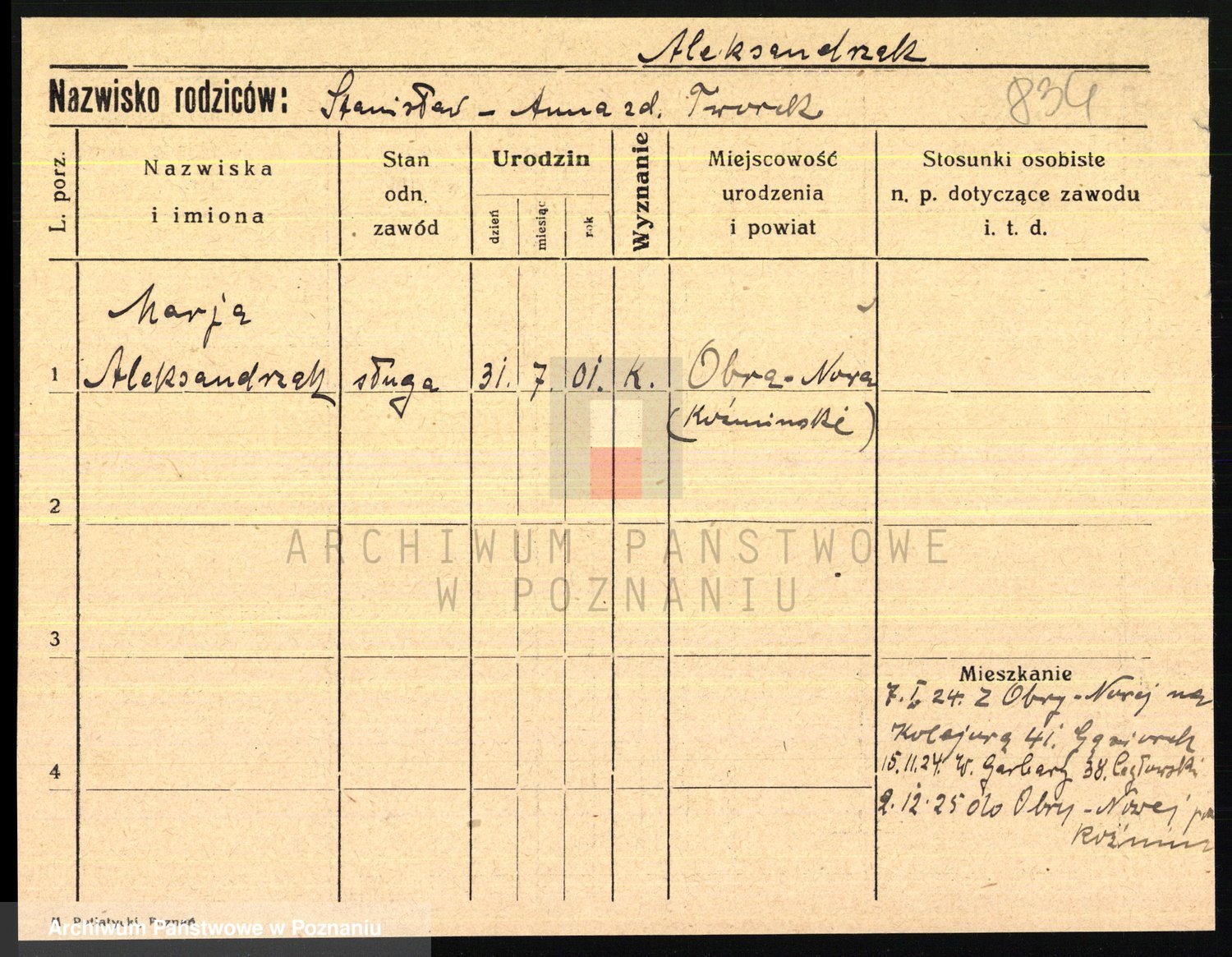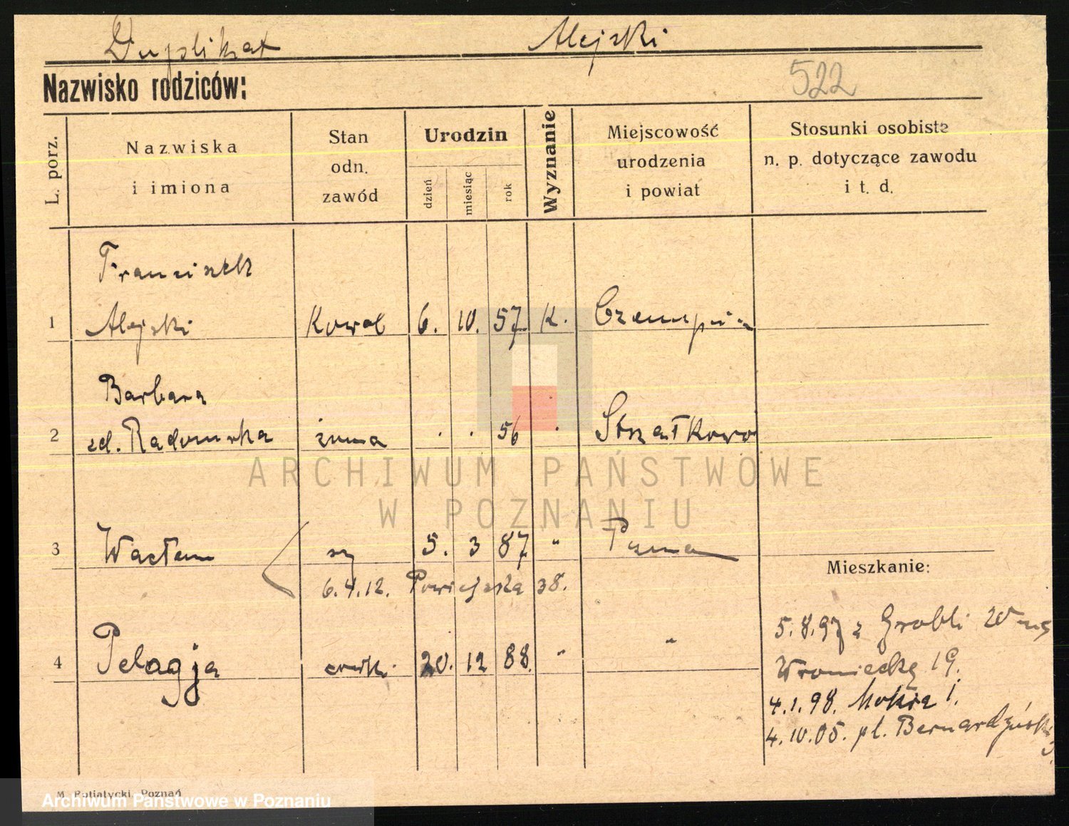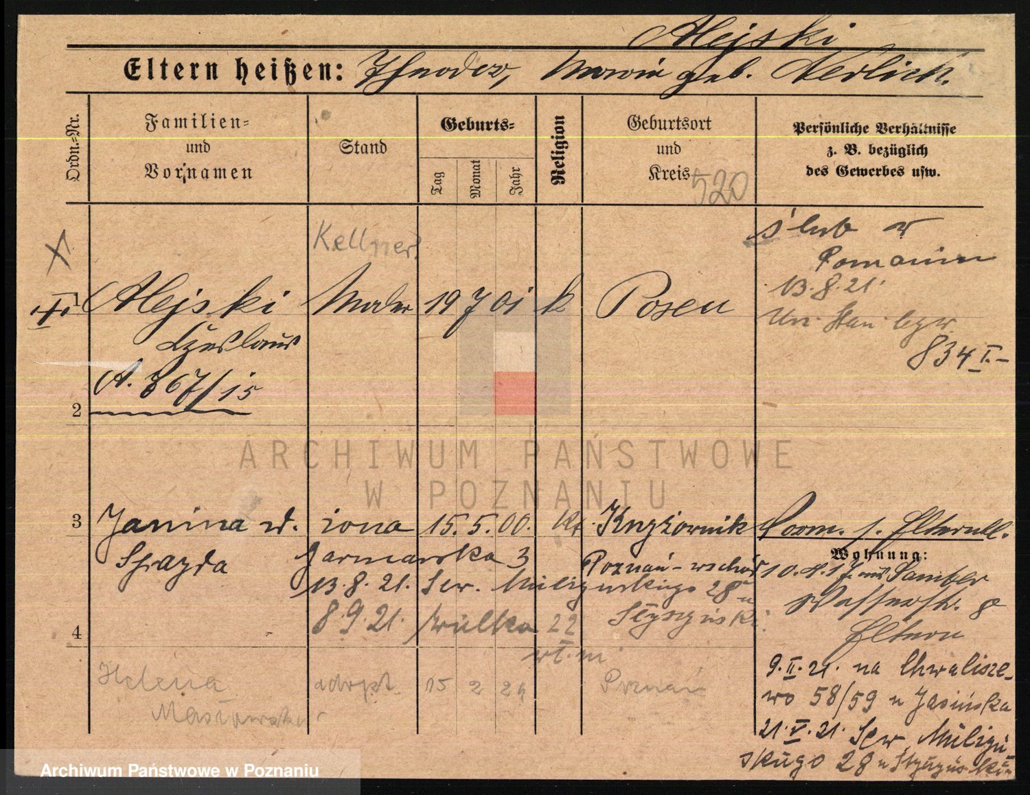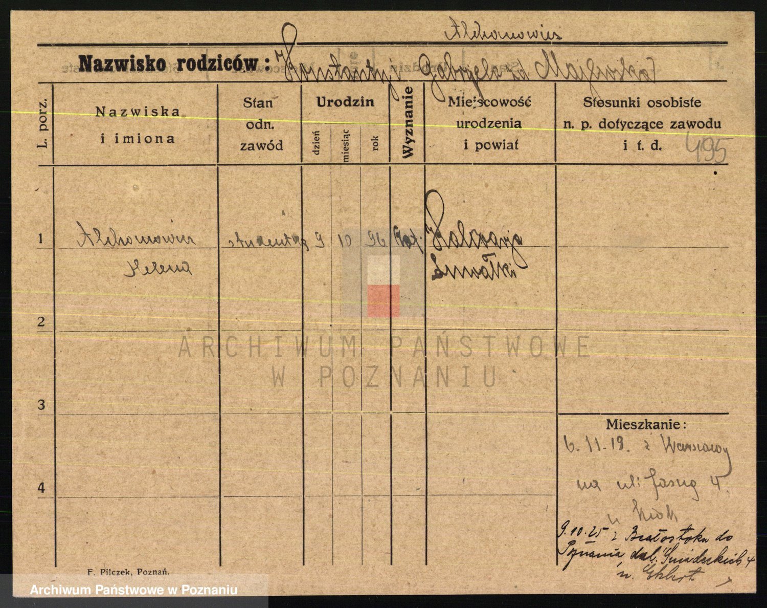 Podgląd karty osobowej dostępny jest po kliknięciu na nazwisko lub ikonkę karty. Można dokonywać powiększenia (ikony na górze) lub przechodzić między kolejnymi skanami (strzałki po bokach).