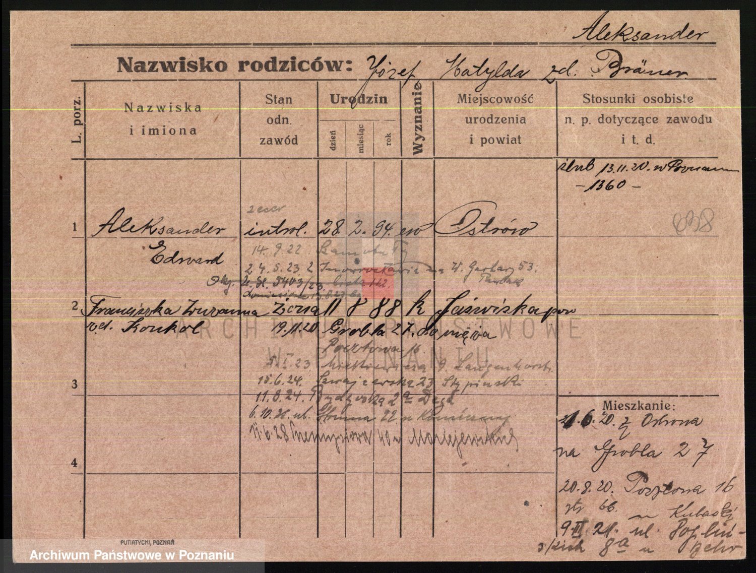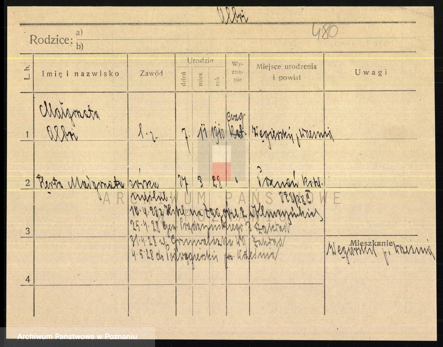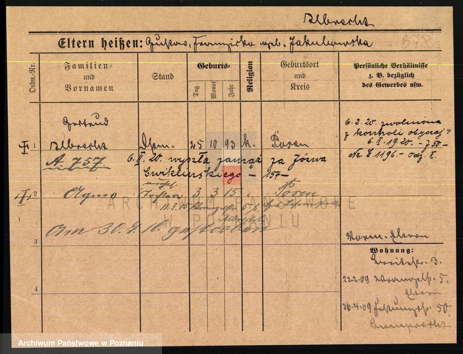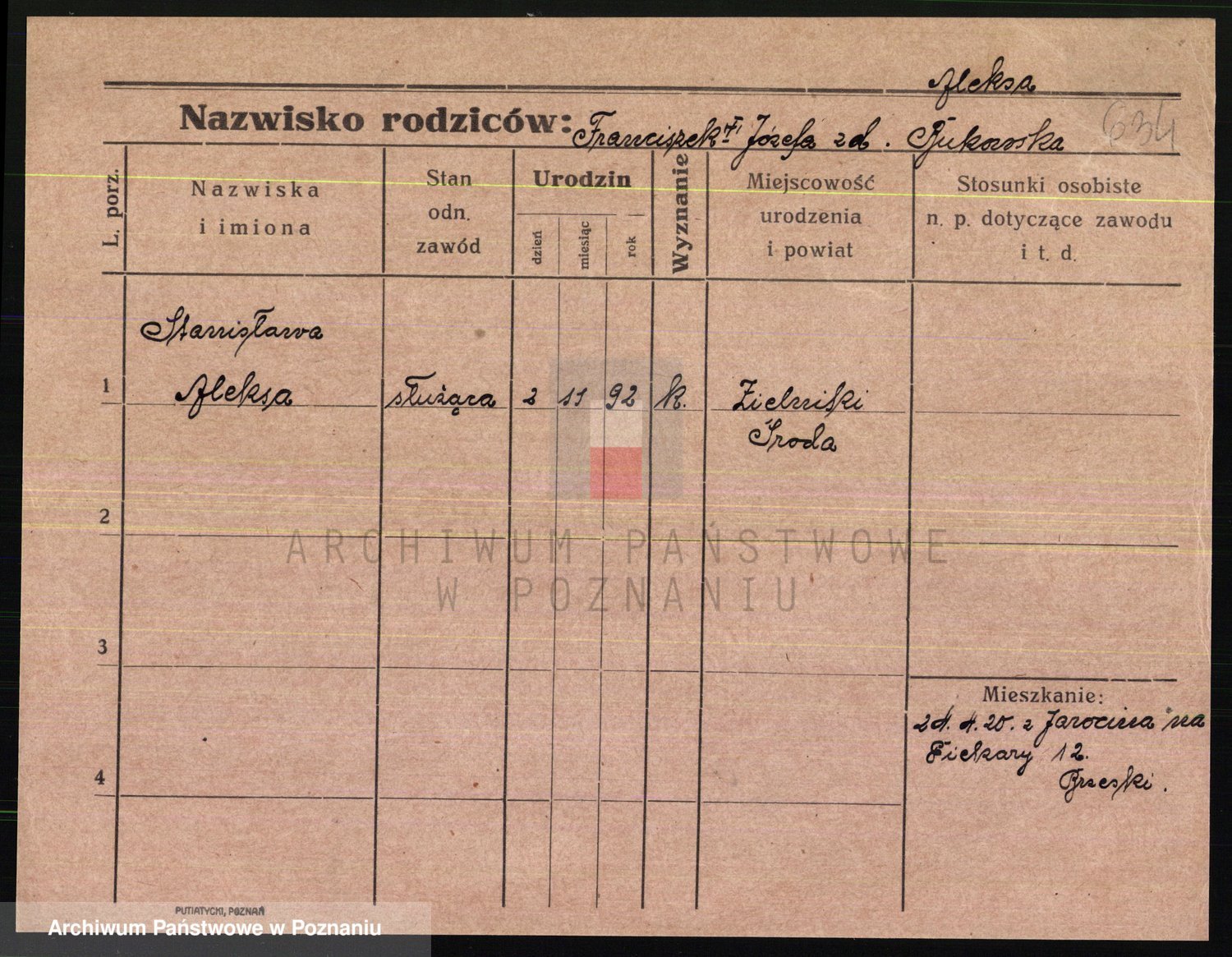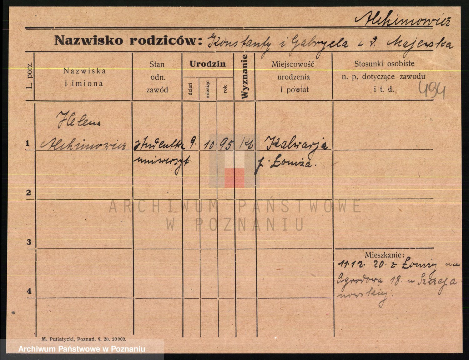 Podgląd karty osobowej dostępny jest po kliknięciu na nazwisko lub ikonkę karty. Można dokonywać powiększenia (ikony na górze) lub przechodzić między kolejnymi skanami (strzałki po bokach).