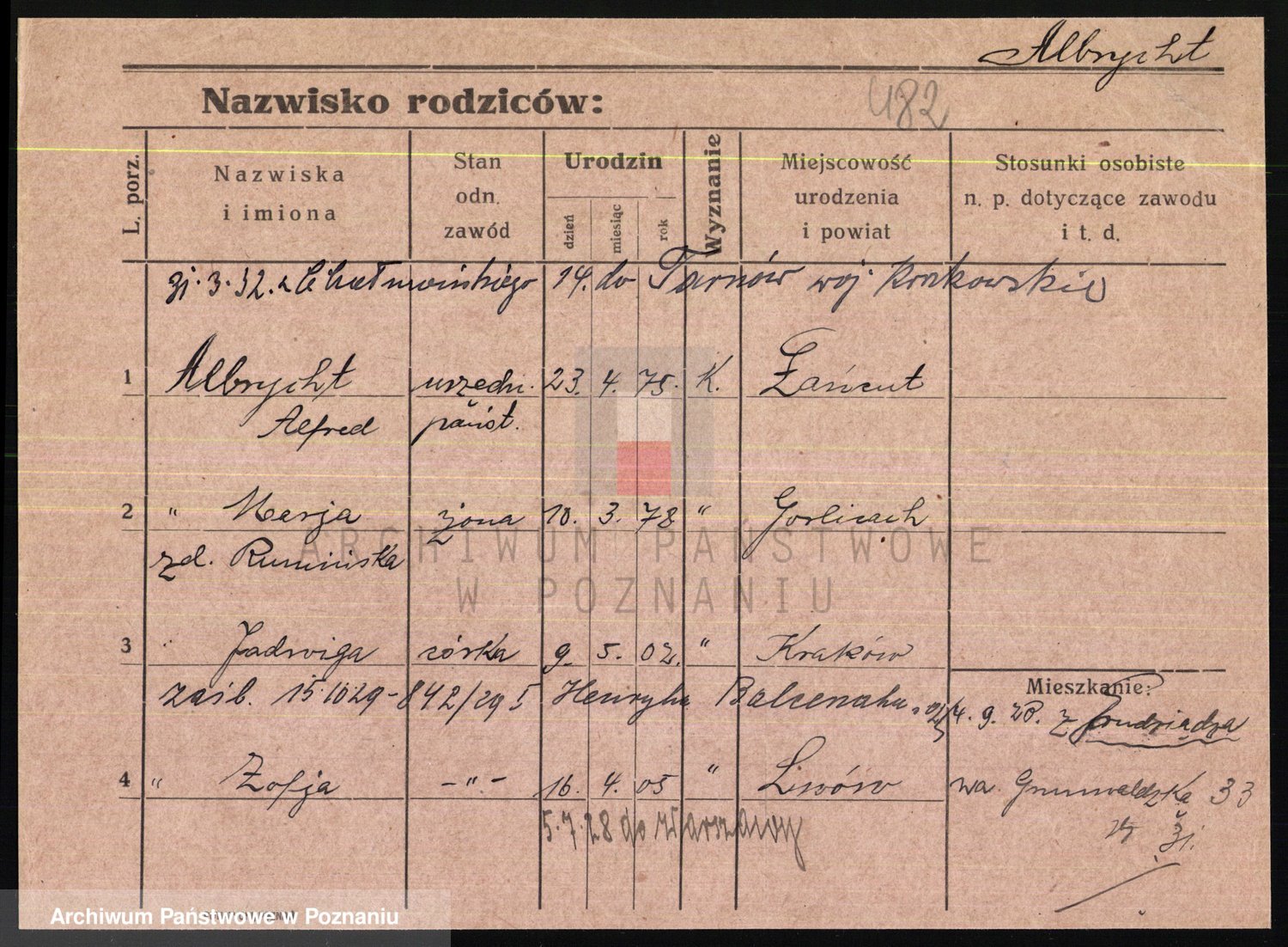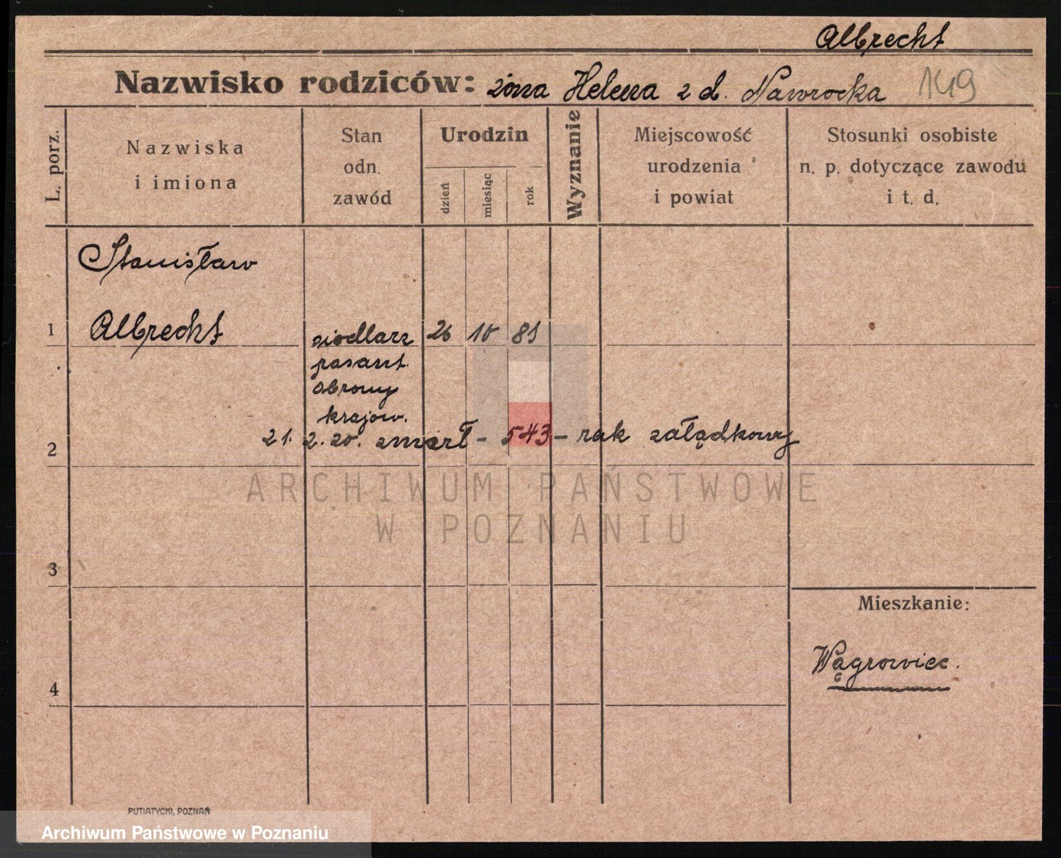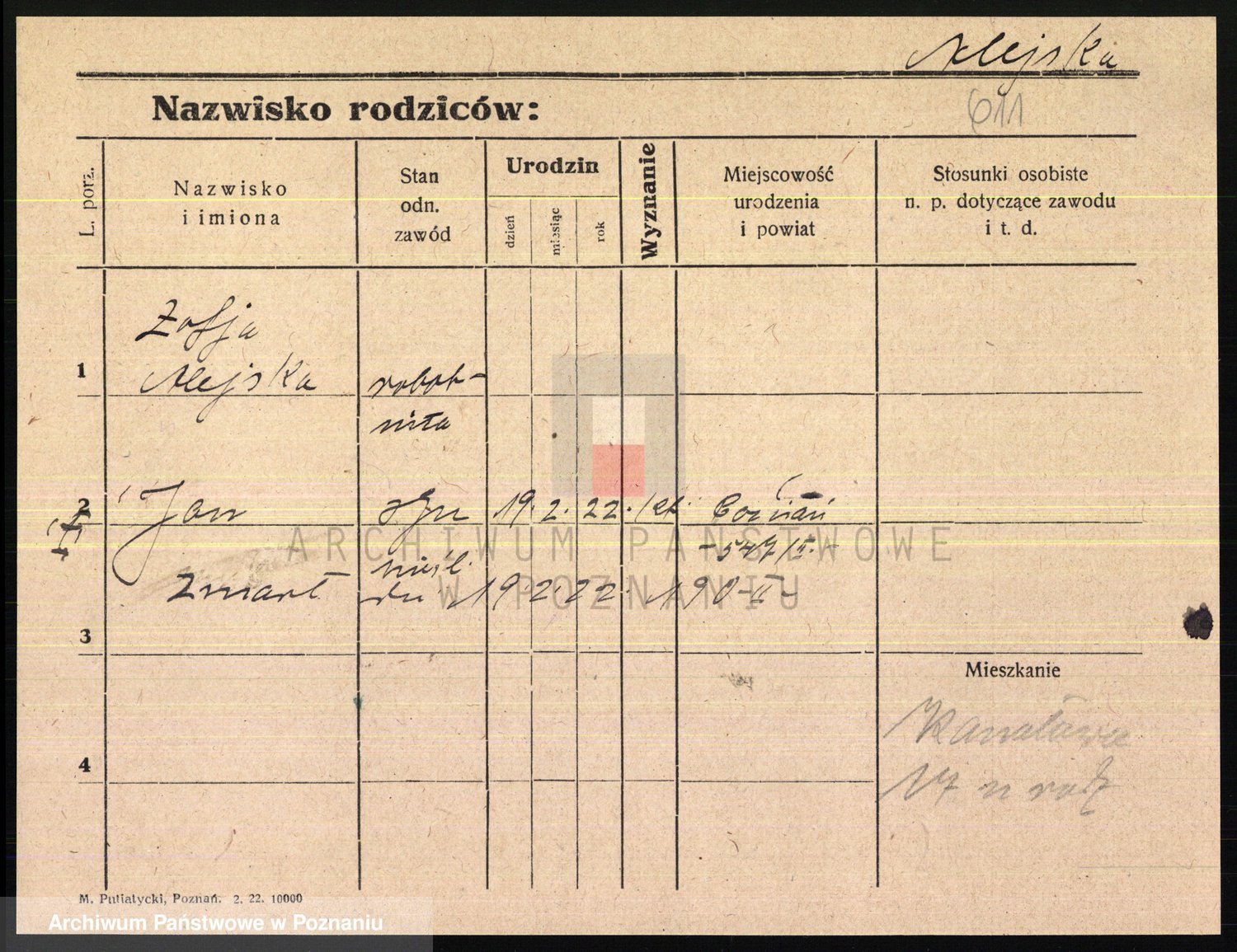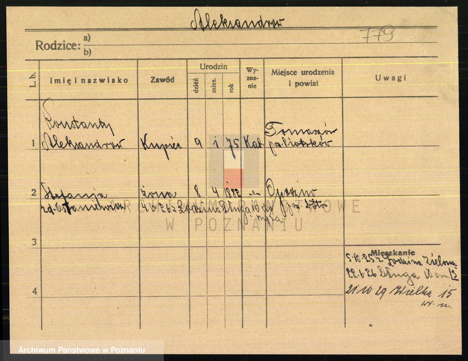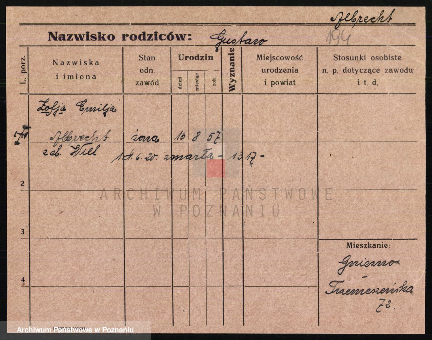 Podgląd karty osobowej dostępny jest po kliknięciu na nazwisko lub ikonkę karty. Można dokonywać powiększenia (ikony na górze) lub przechodzić między kolejnymi skanami (strzałki po bokach).