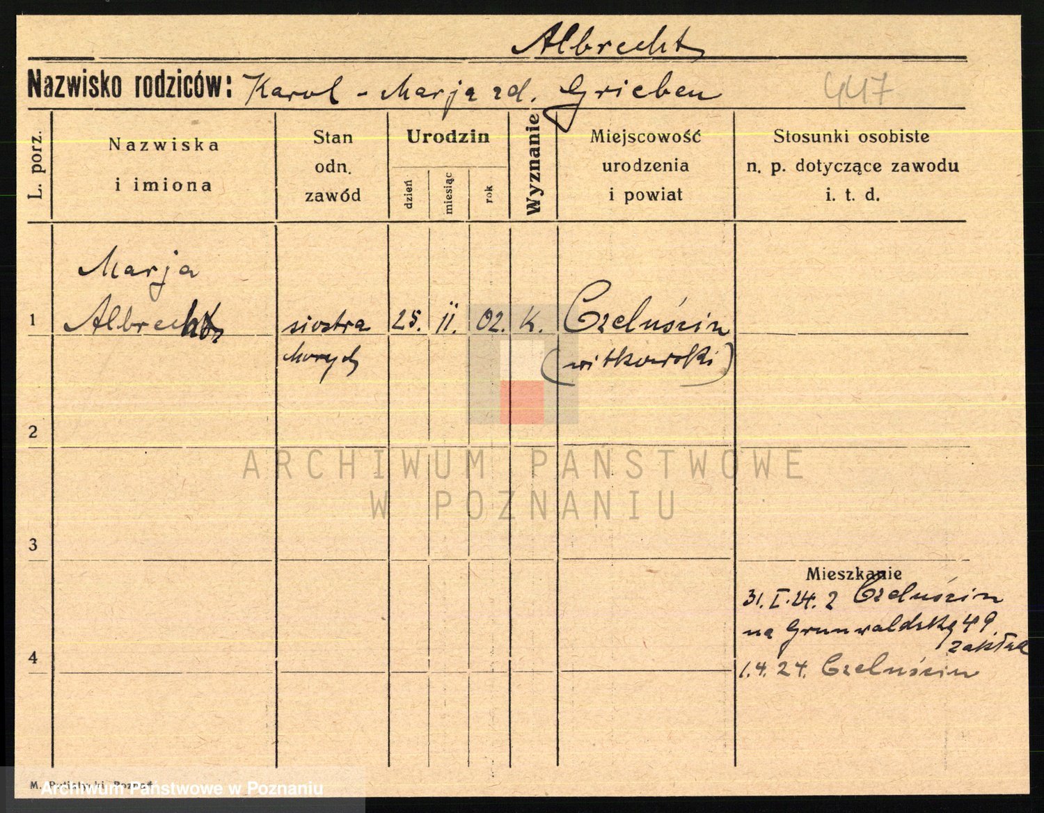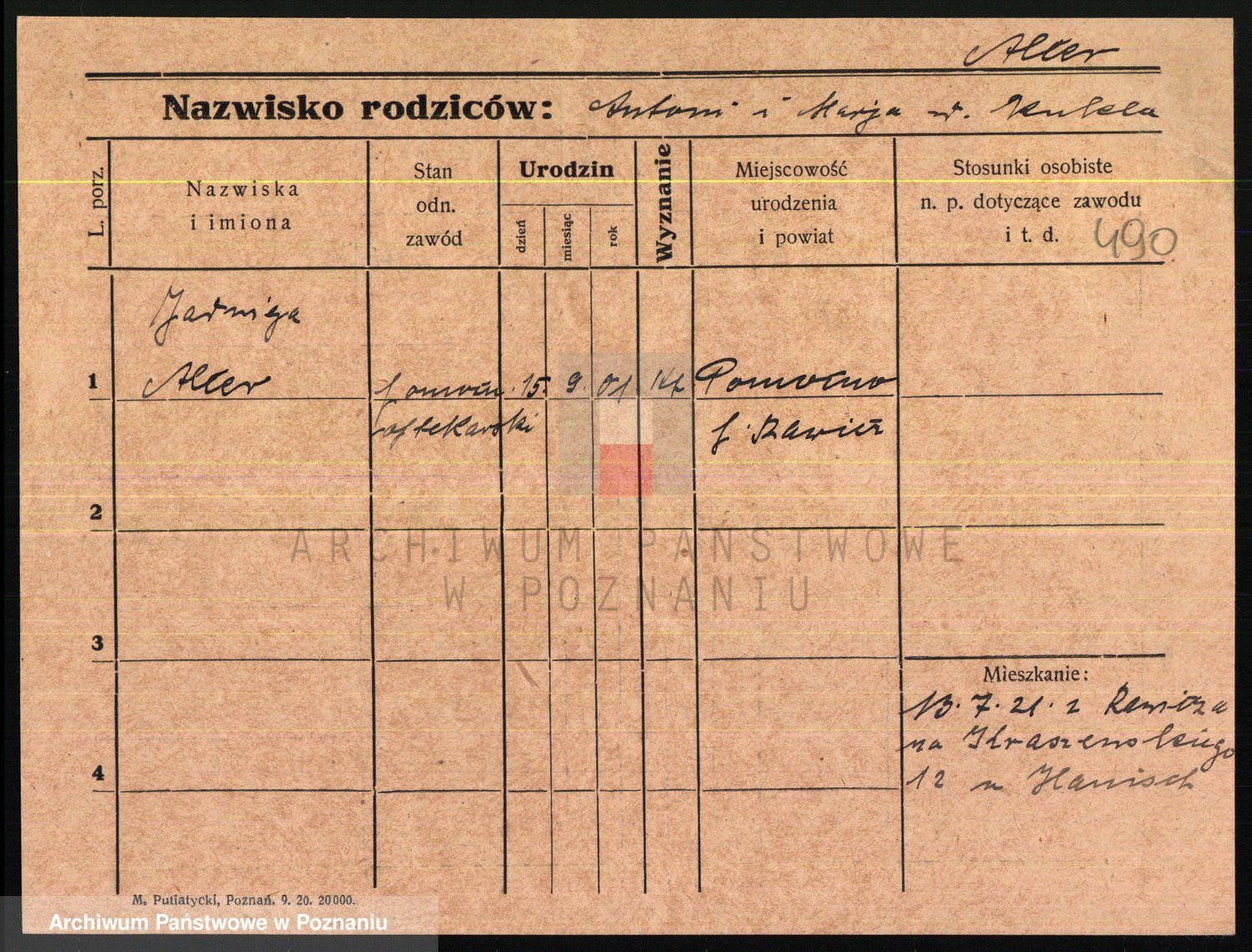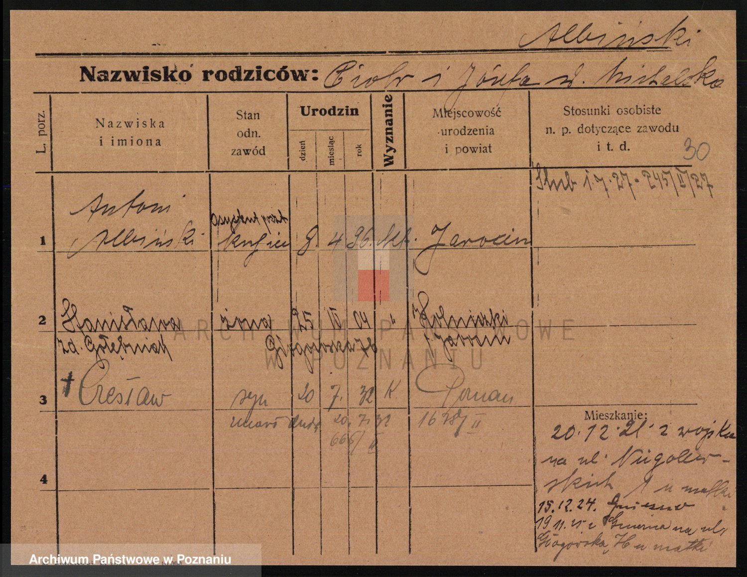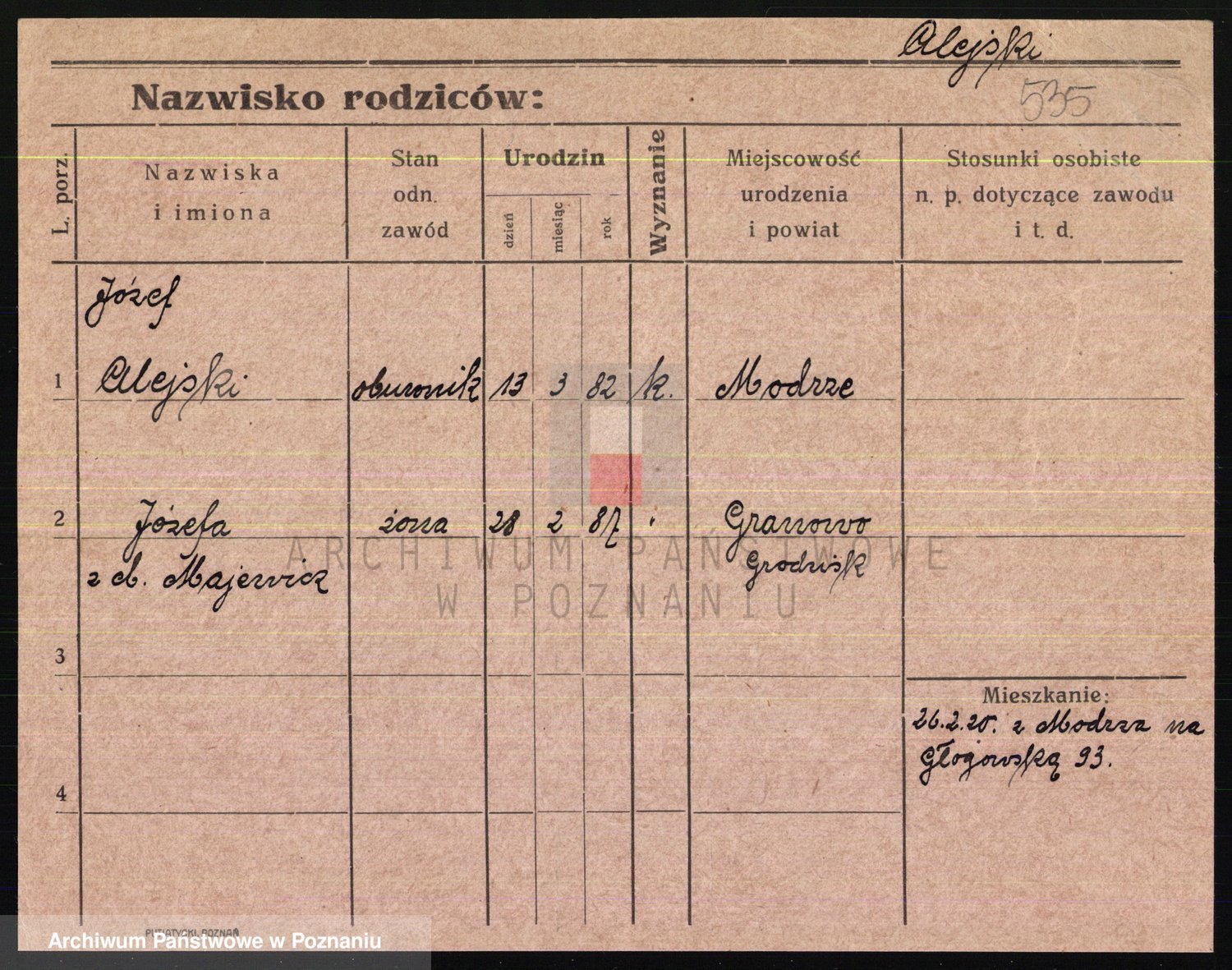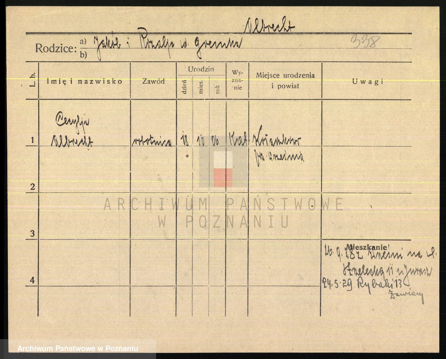 Podgląd karty osobowej dostępny jest po kliknięciu na nazwisko lub ikonkę karty. Można dokonywać powiększenia (ikony na górze) lub przechodzić między kolejnymi skanami (strzałki po bokach).
