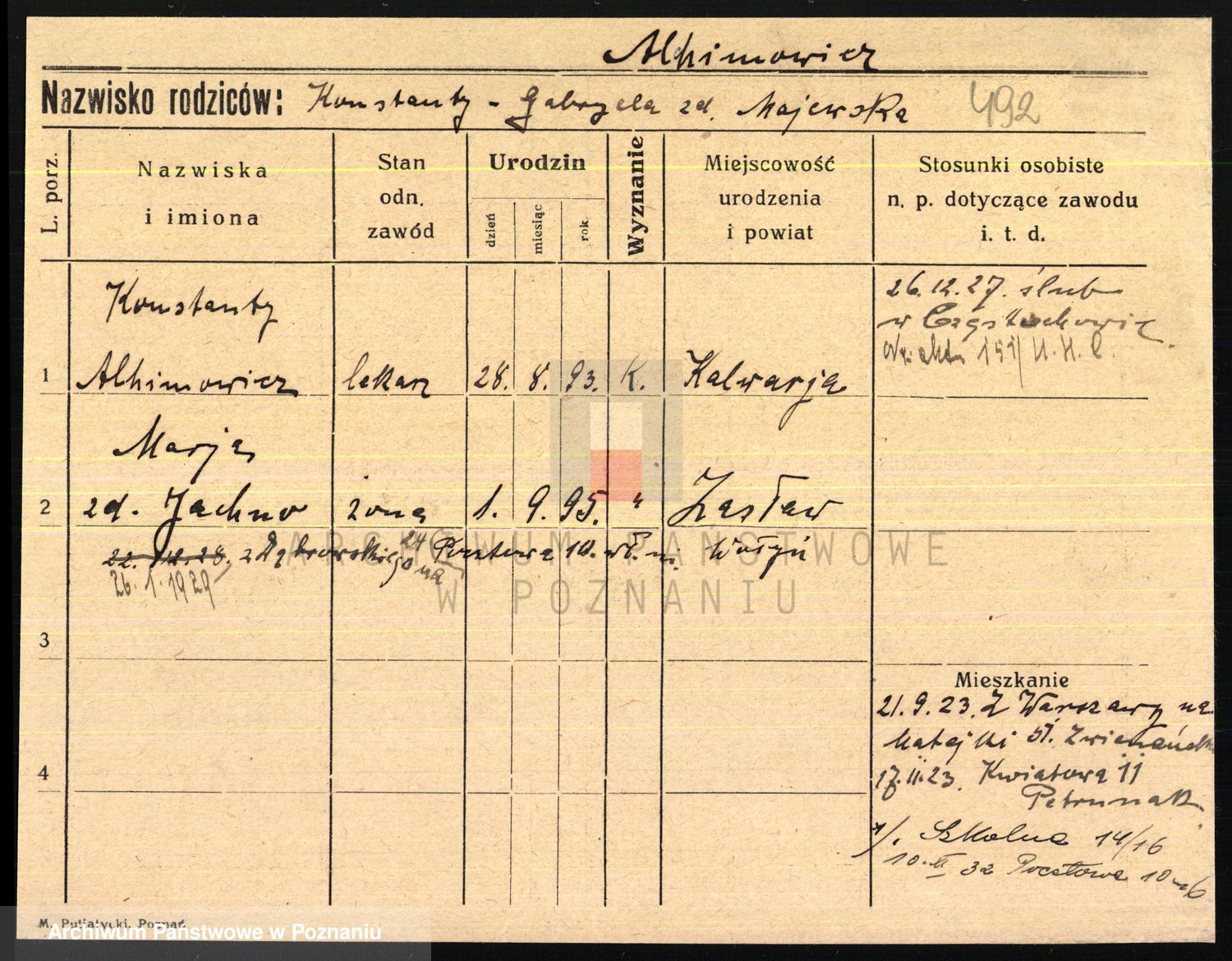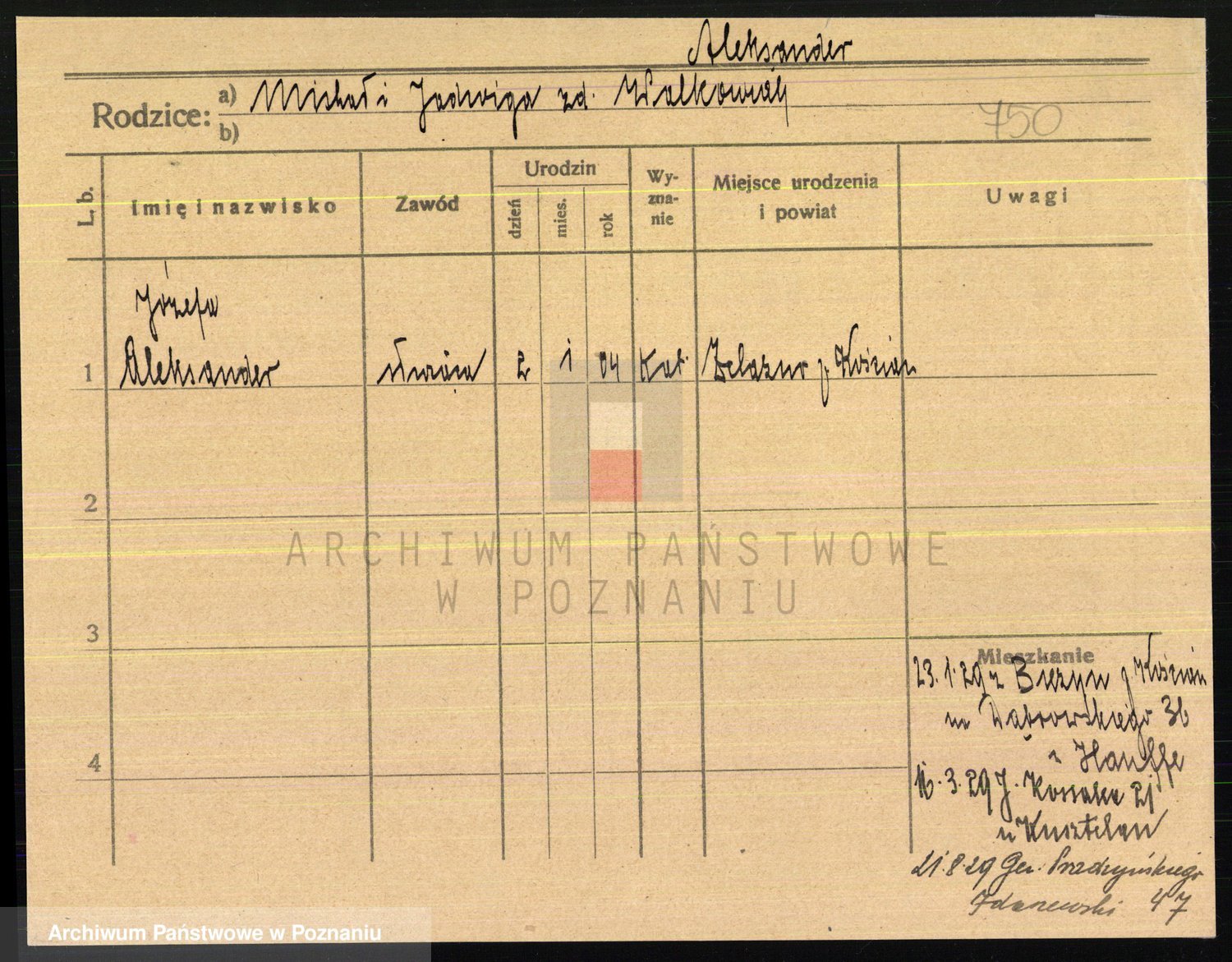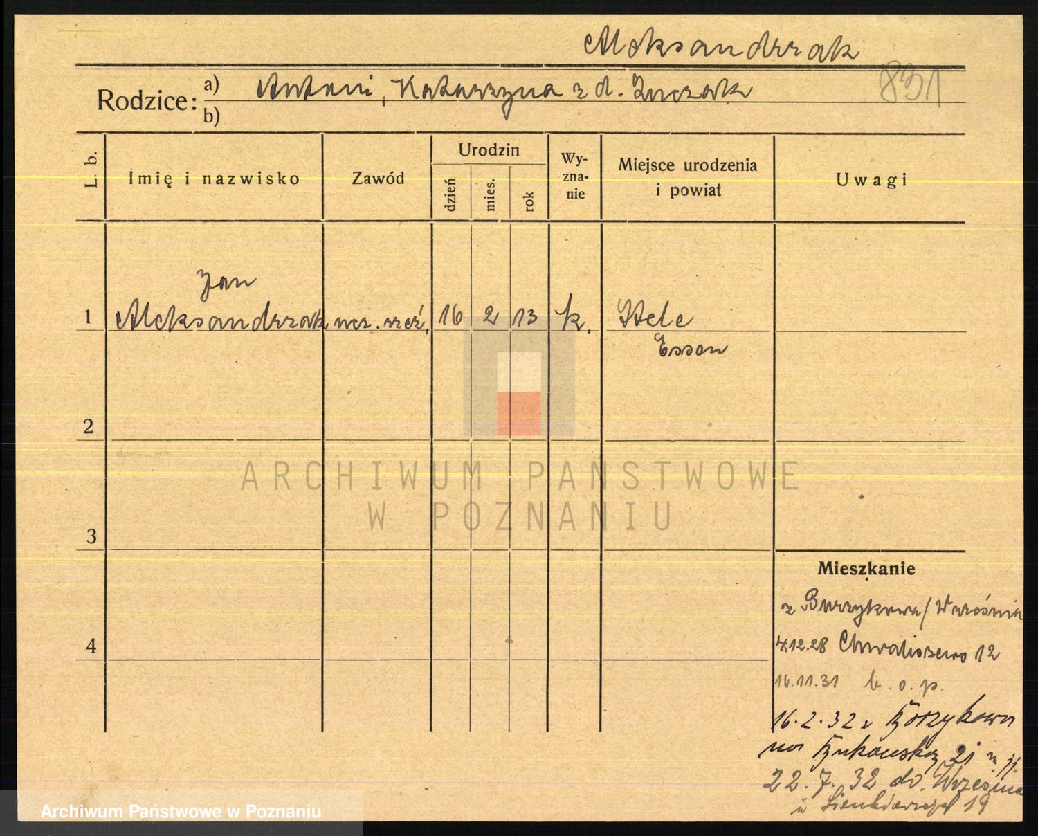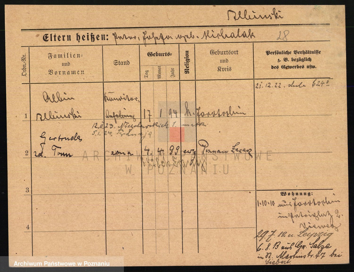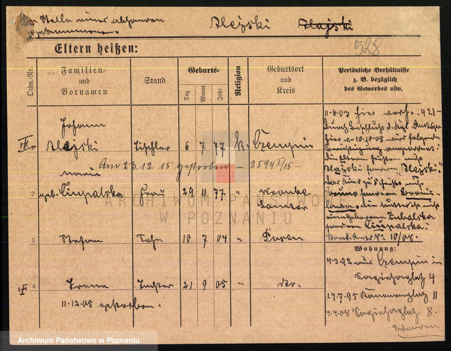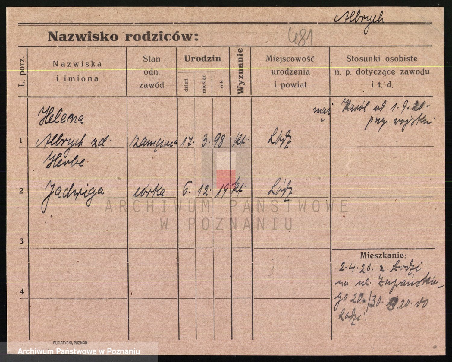 Podgląd karty osobowej dostępny jest po kliknięciu na nazwisko lub ikonkę karty. Można dokonywać powiększenia (ikony na górze) lub przechodzić między kolejnymi skanami (strzałki po bokach).