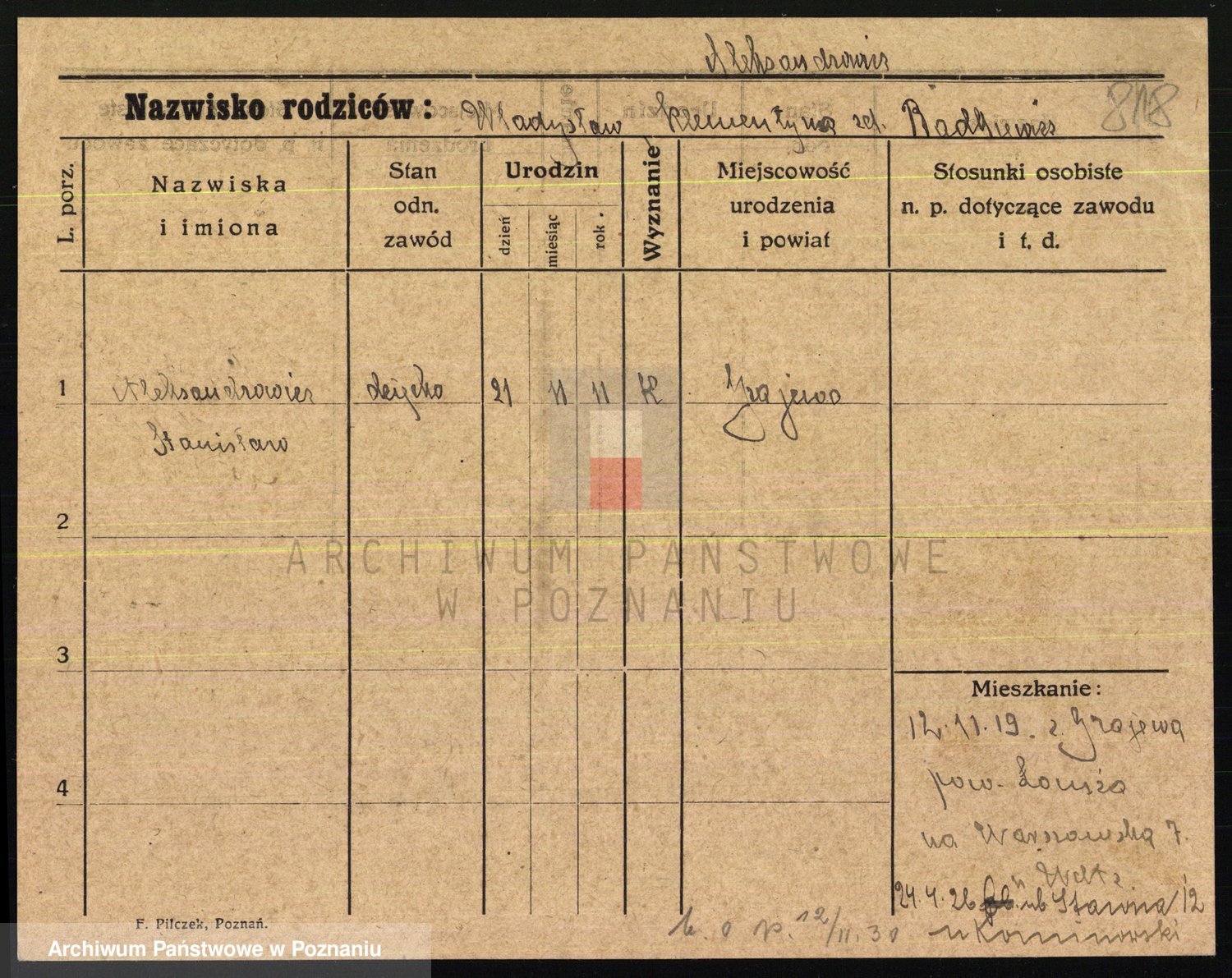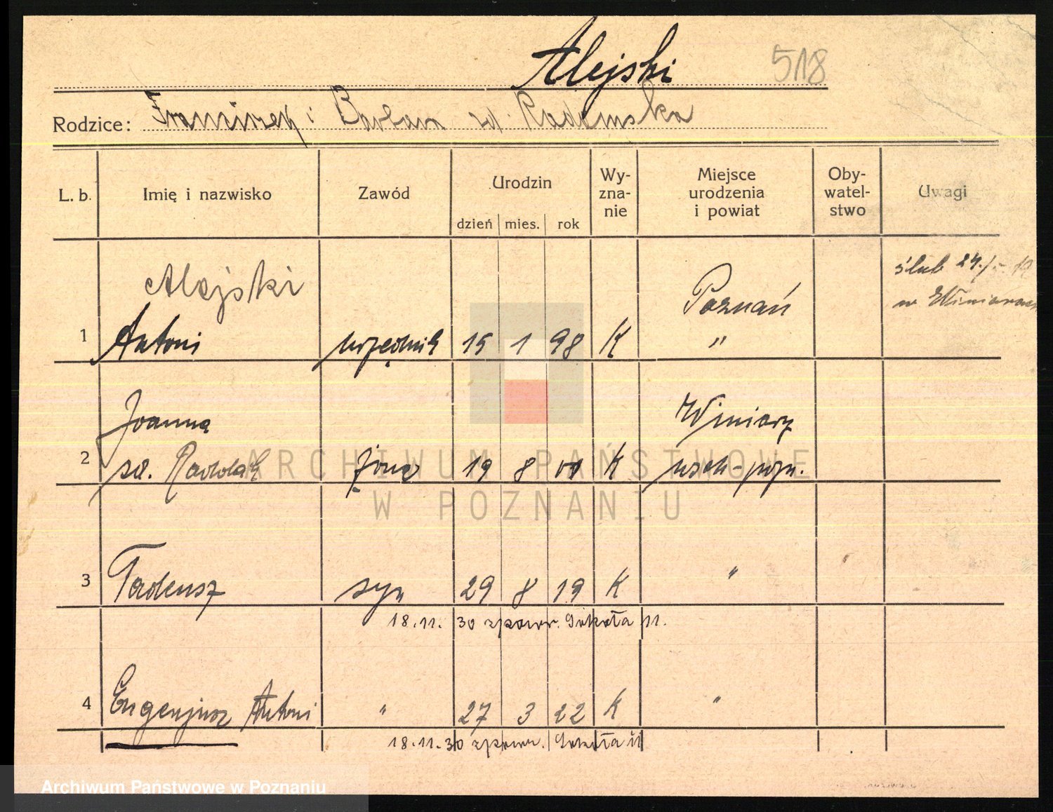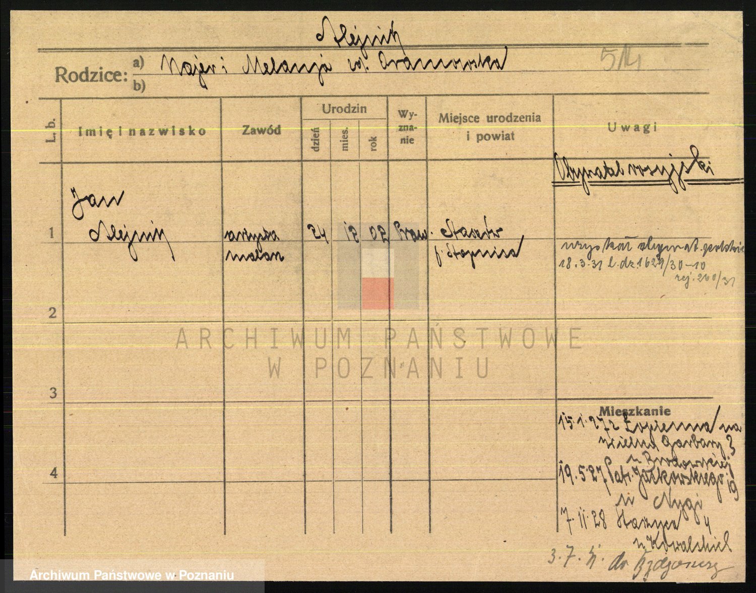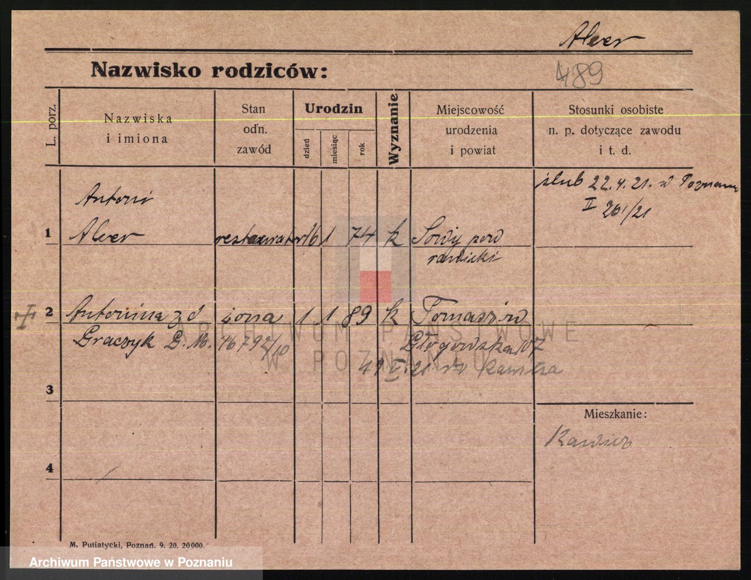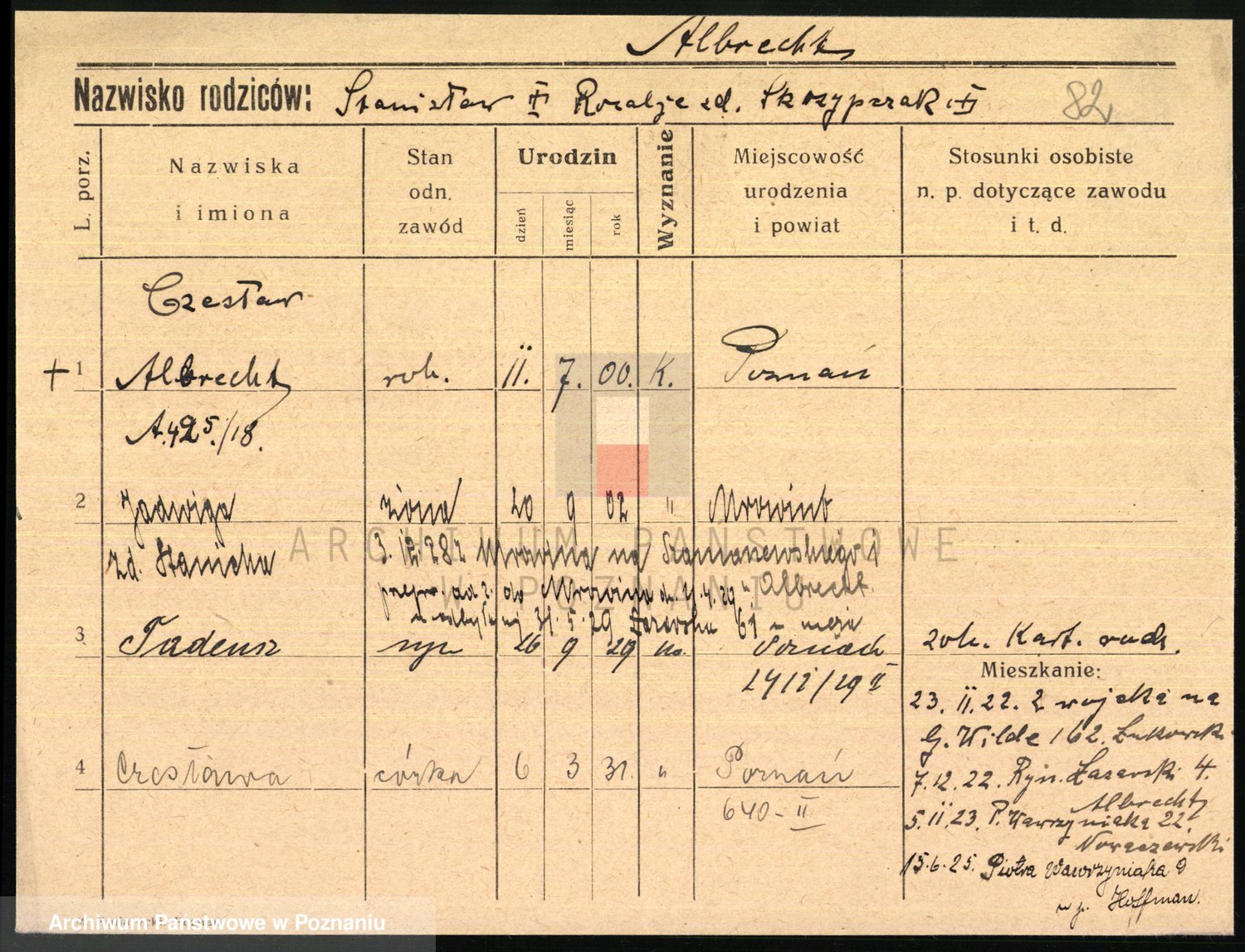 Podgląd karty osobowej dostępny jest po kliknięciu na nazwisko lub ikonkę karty. Można dokonywać powiększenia (ikony na górze) lub przechodzić między kolejnymi skanami (strzałki po bokach).