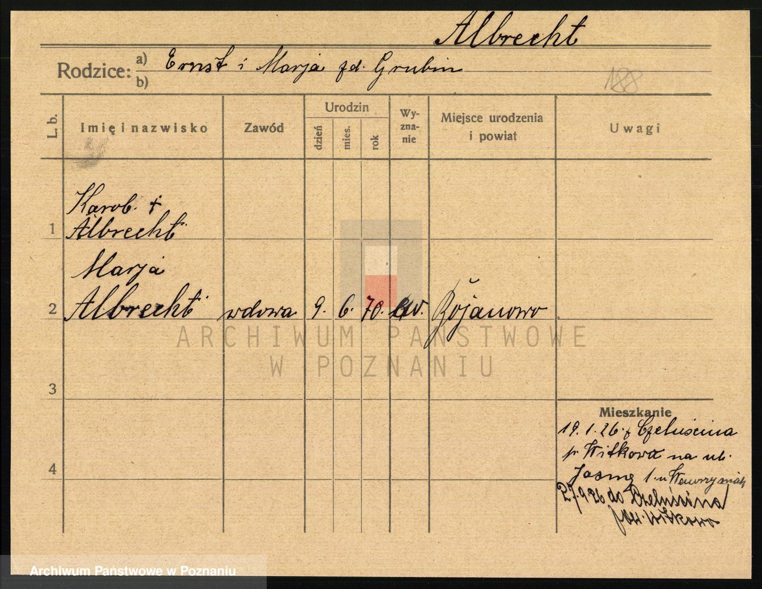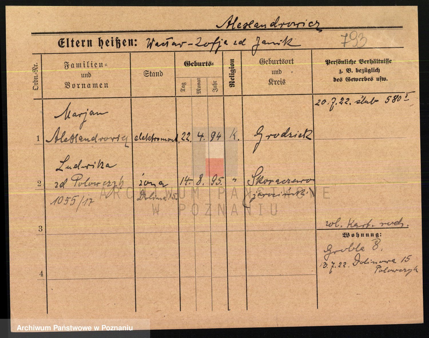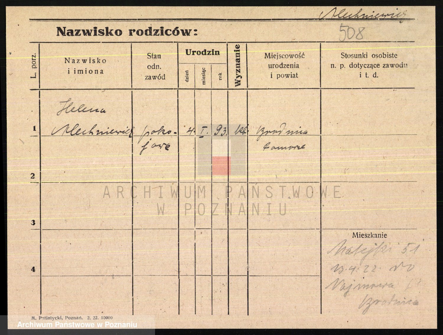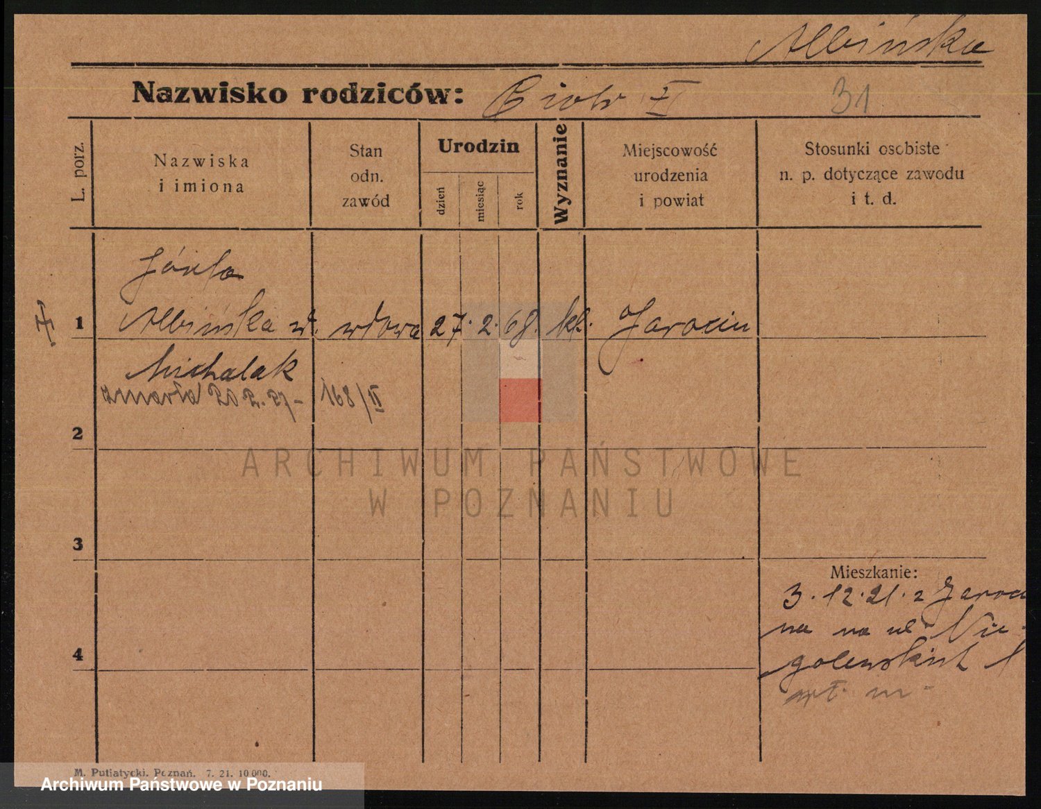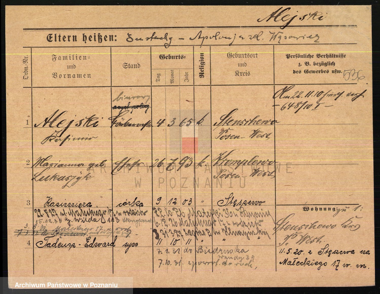 Podgląd karty osobowej dostępny jest po kliknięciu na nazwisko lub ikonkę karty. Można dokonywać powiększenia (ikony na górze) lub przechodzić między kolejnymi skanami (strzałki po bokach).