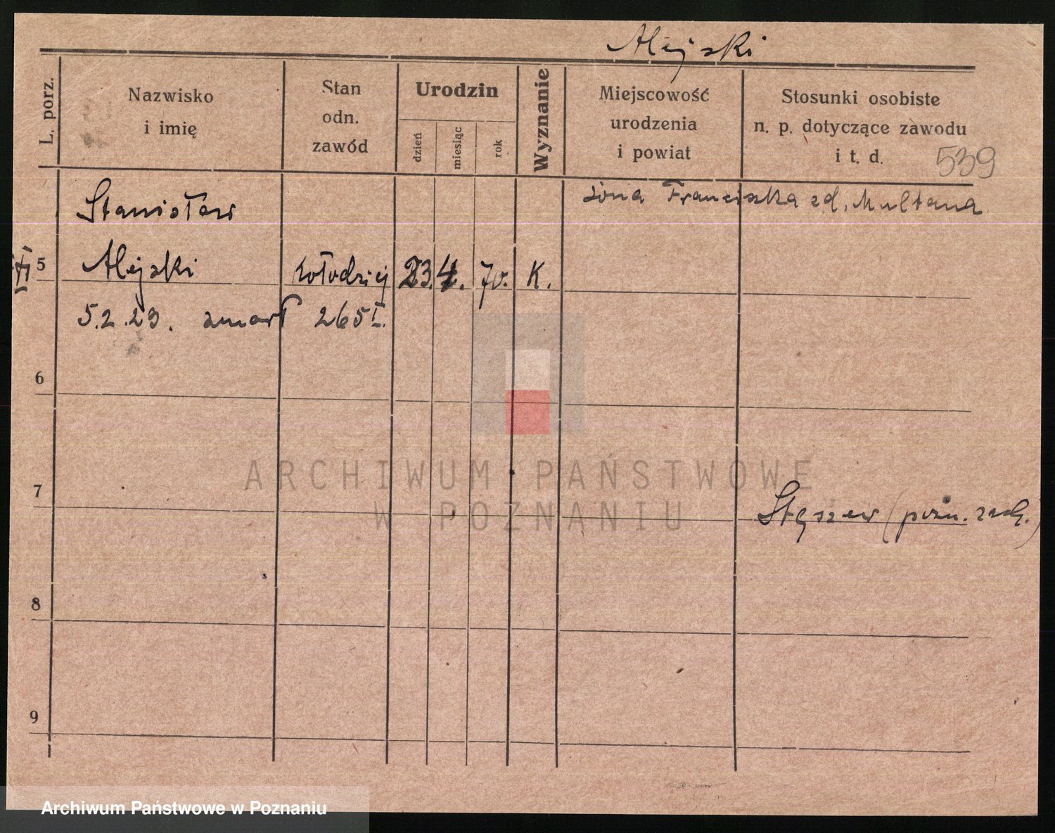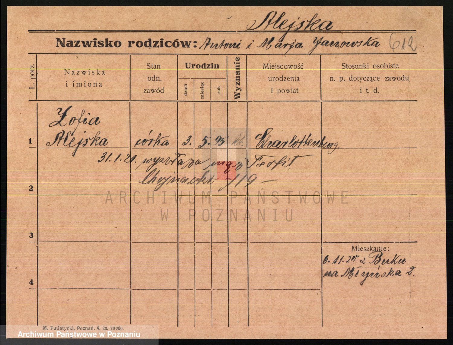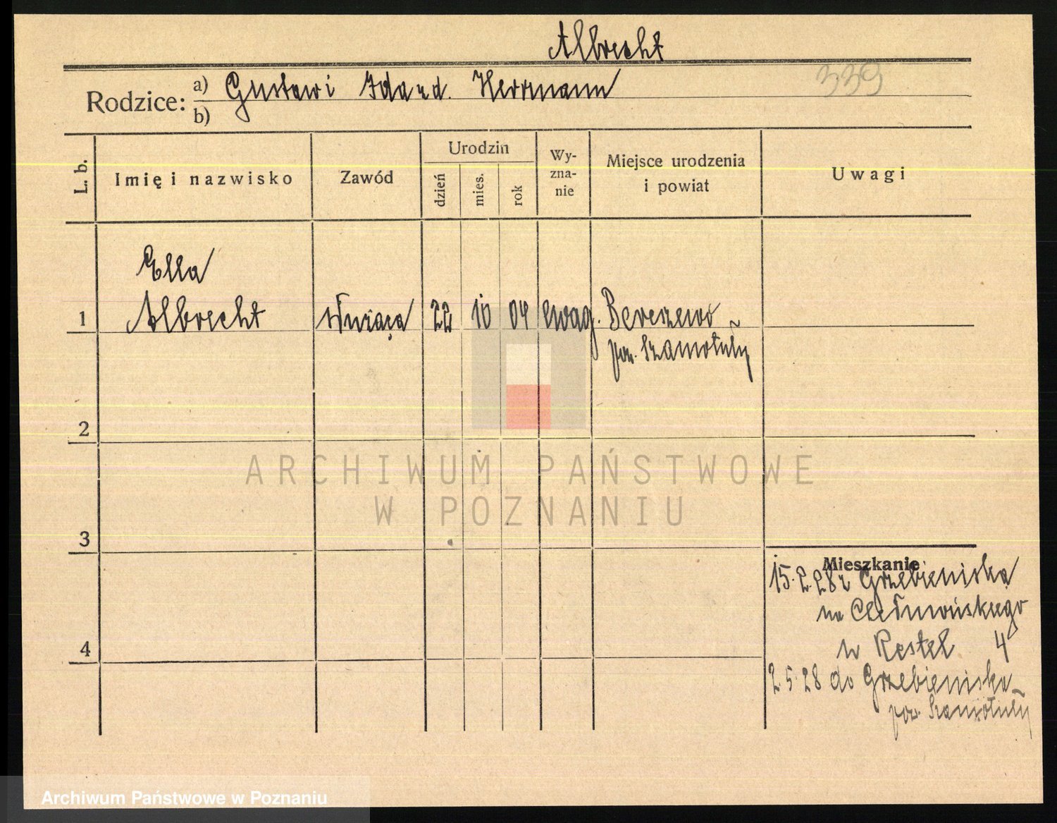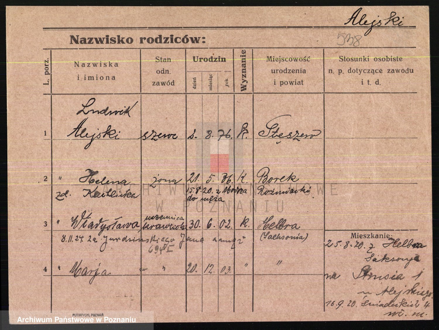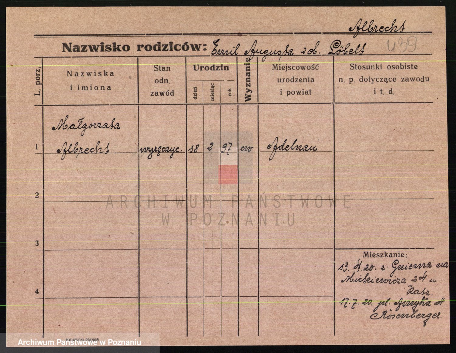 Podgląd karty osobowej dostępny jest po kliknięciu na nazwisko lub ikonkę karty. Można dokonywać powiększenia (ikony na górze) lub przechodzić między kolejnymi skanami (strzałki po bokach).