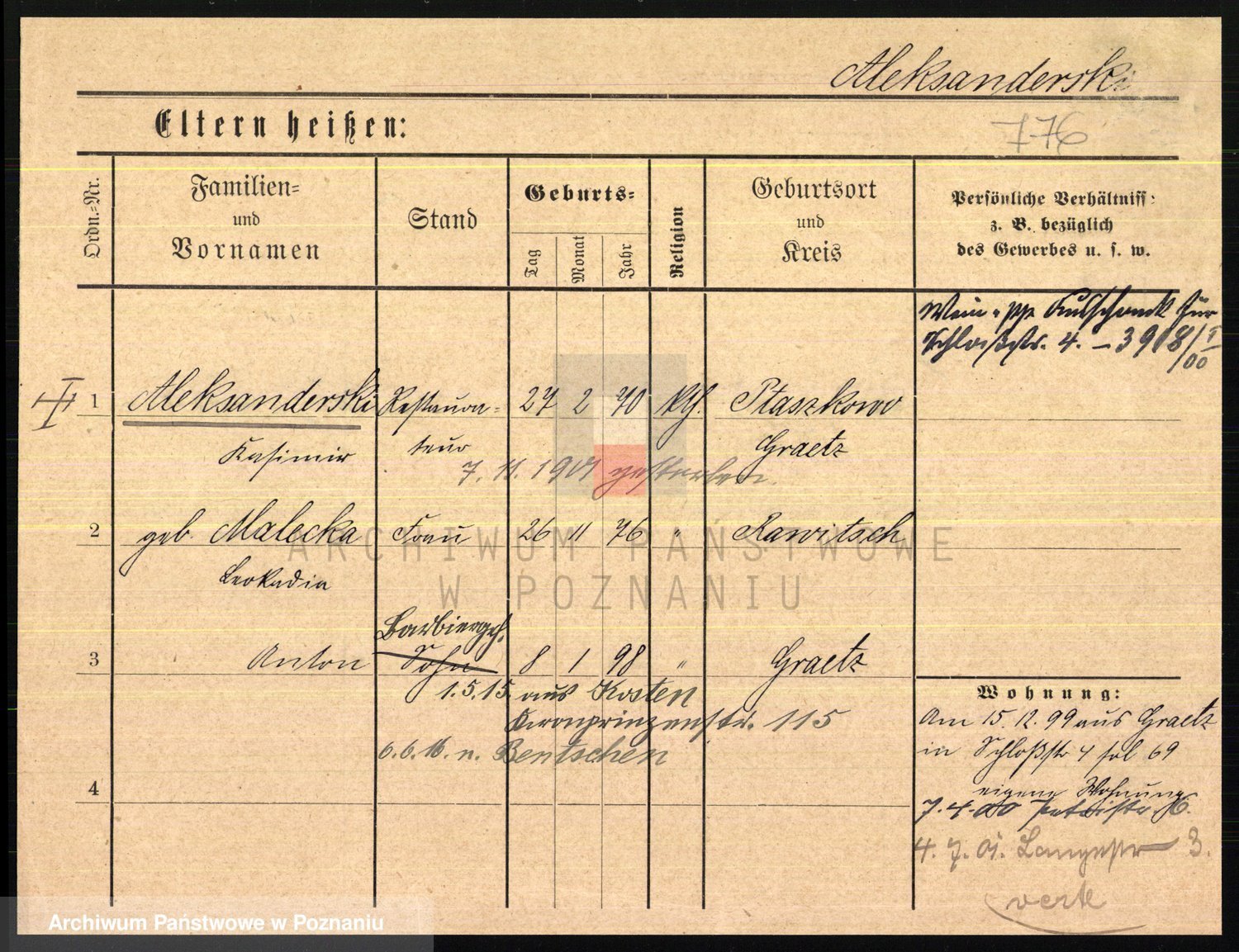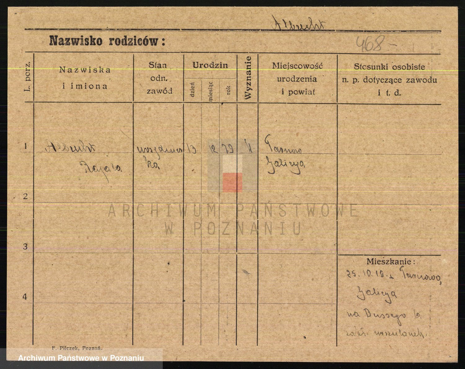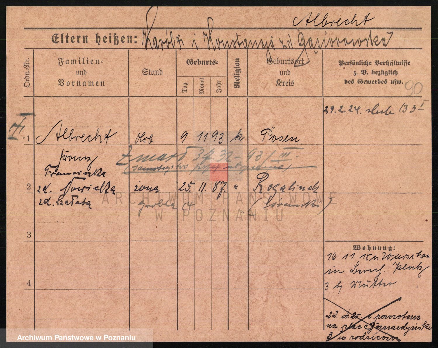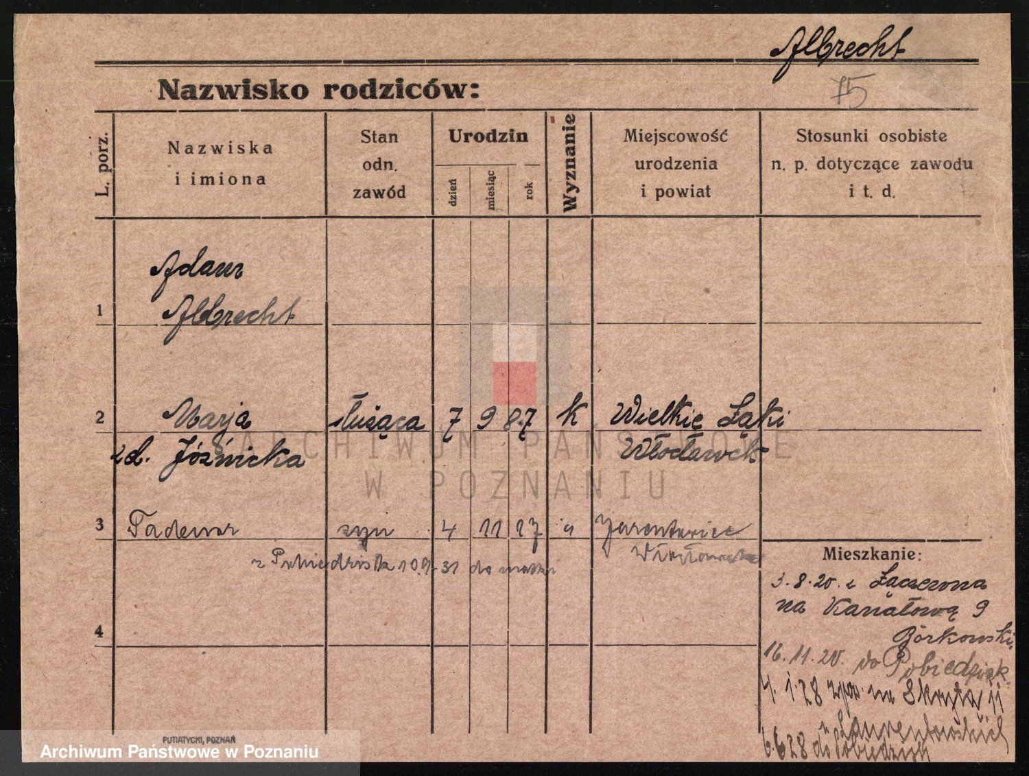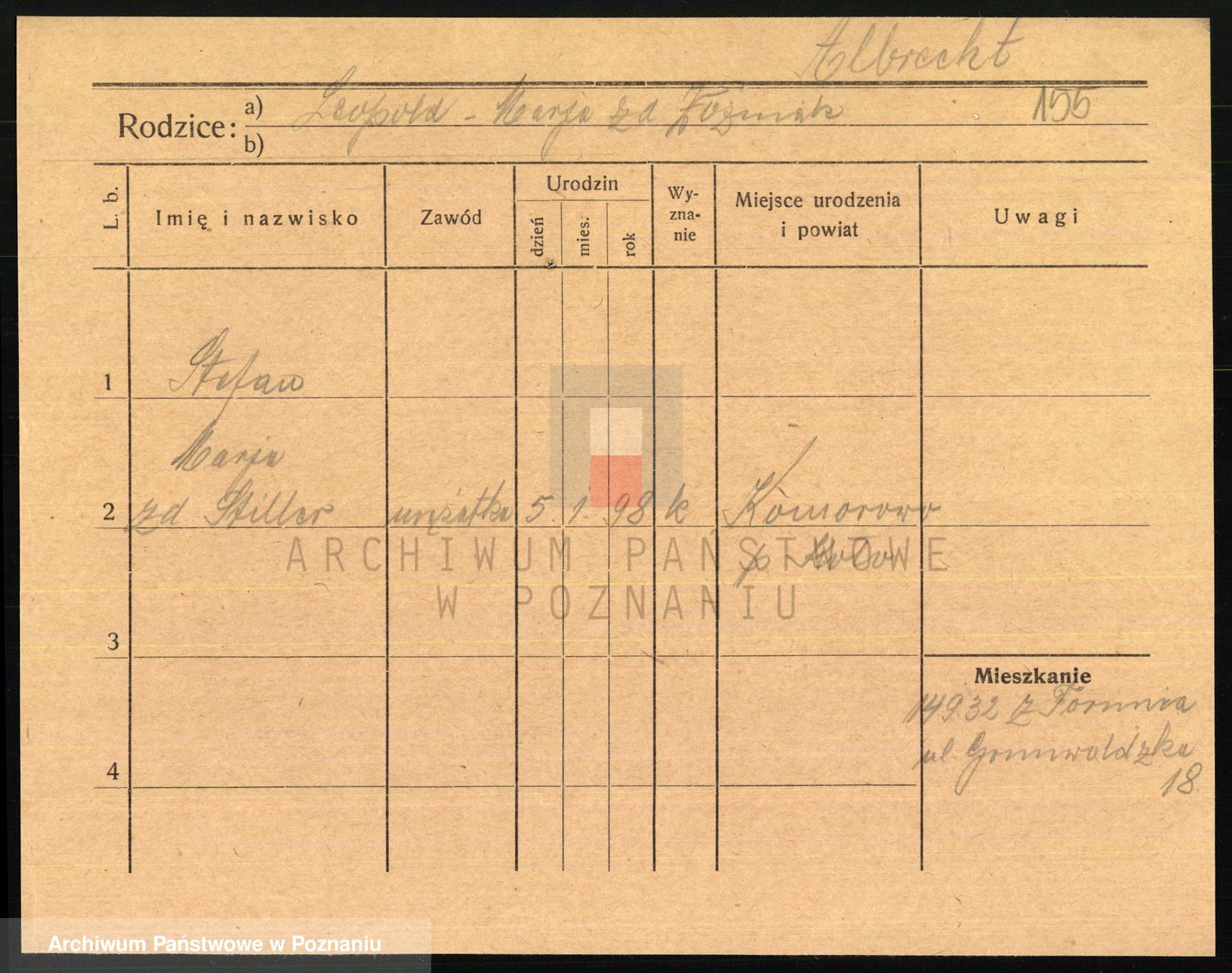 Podgląd karty osobowej dostępny jest po kliknięciu na nazwisko lub ikonkę karty. Można dokonywać powiększenia (ikony na górze) lub przechodzić między kolejnymi skanami (strzałki po bokach).