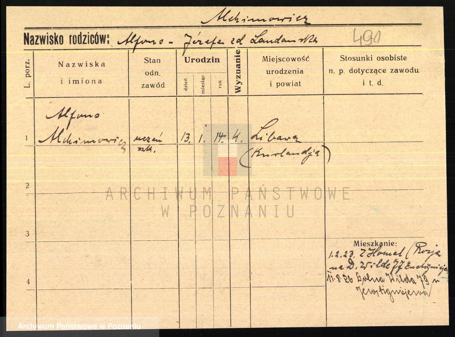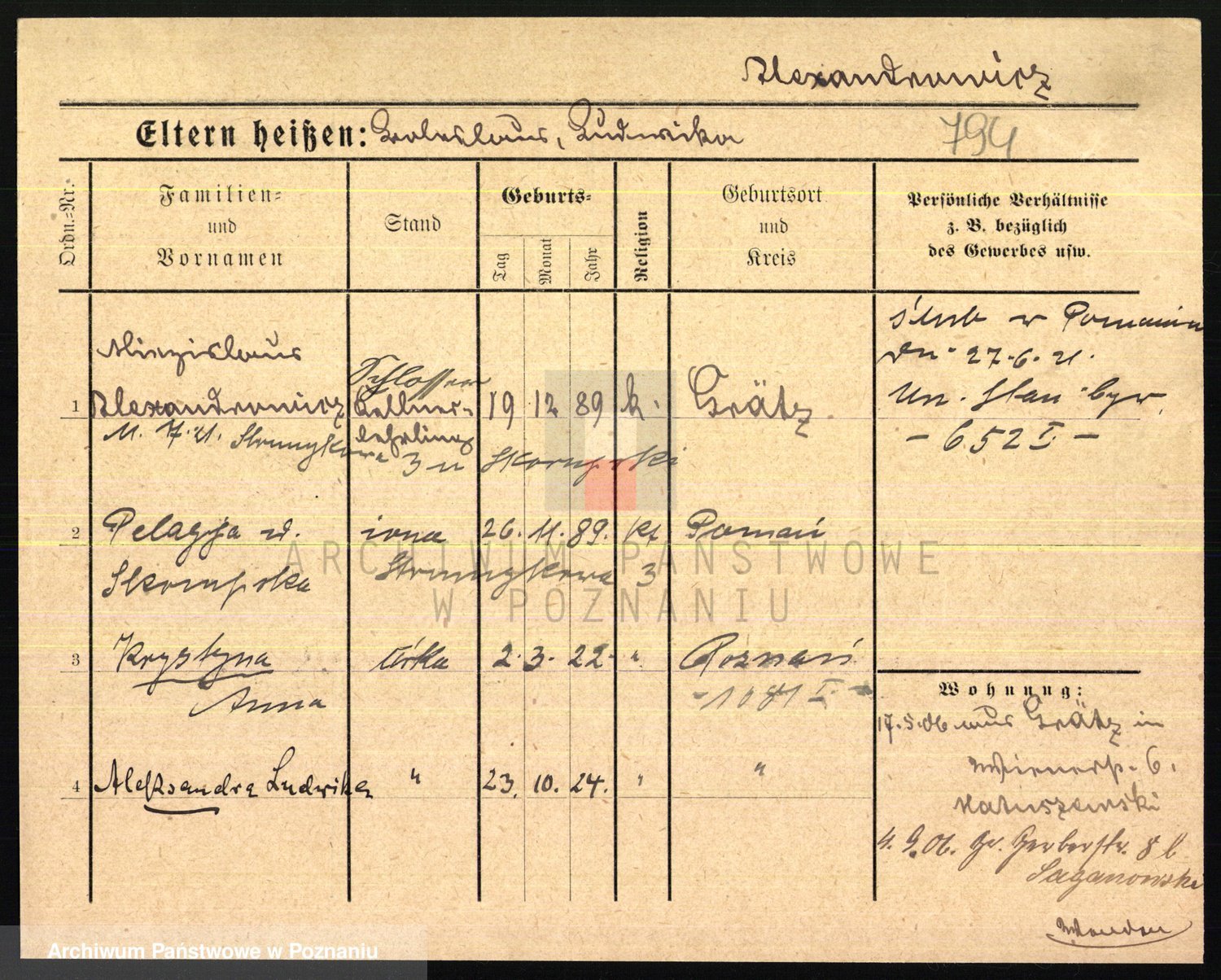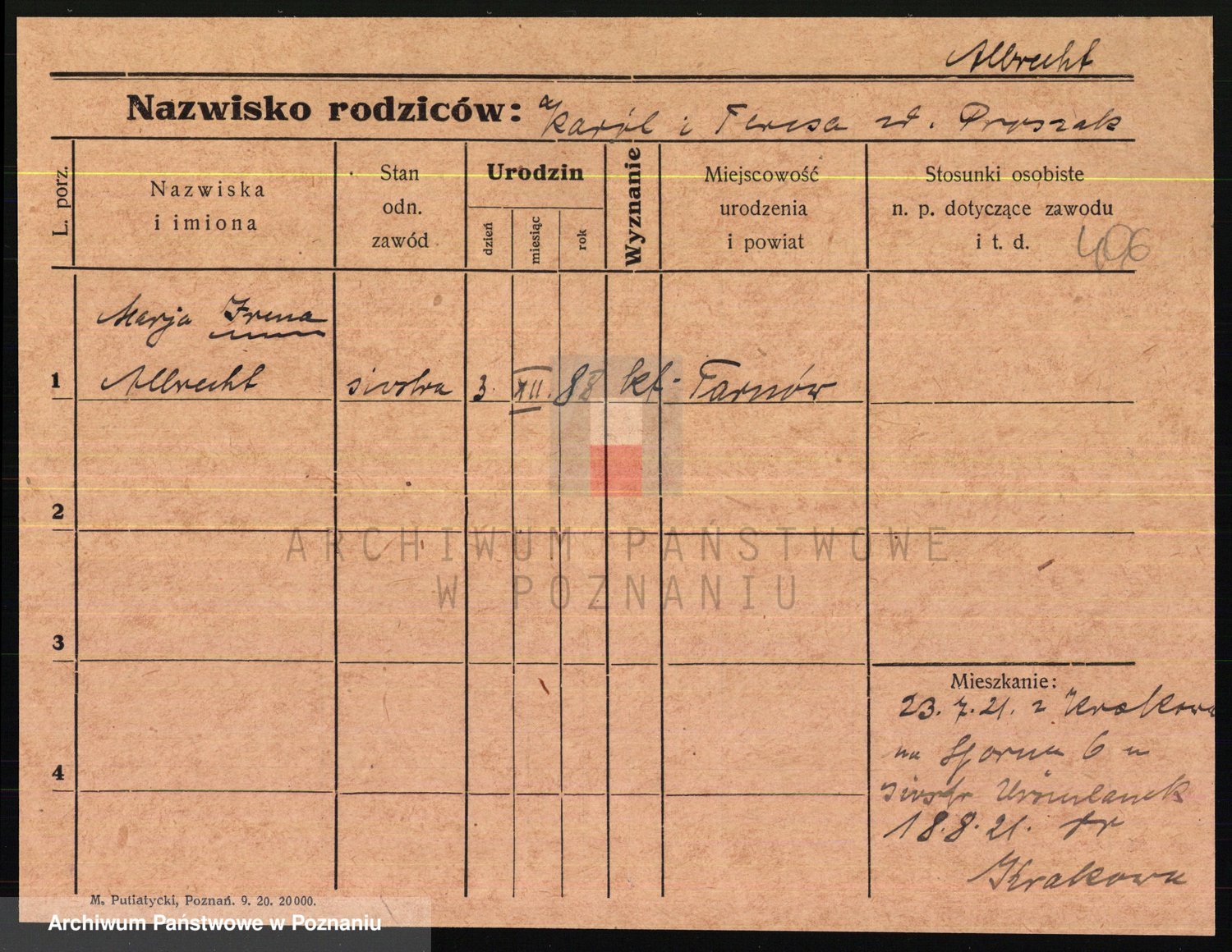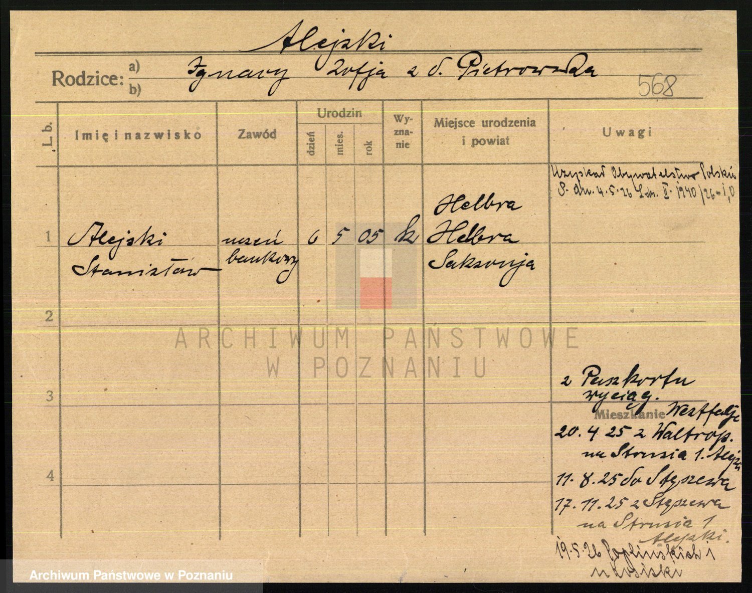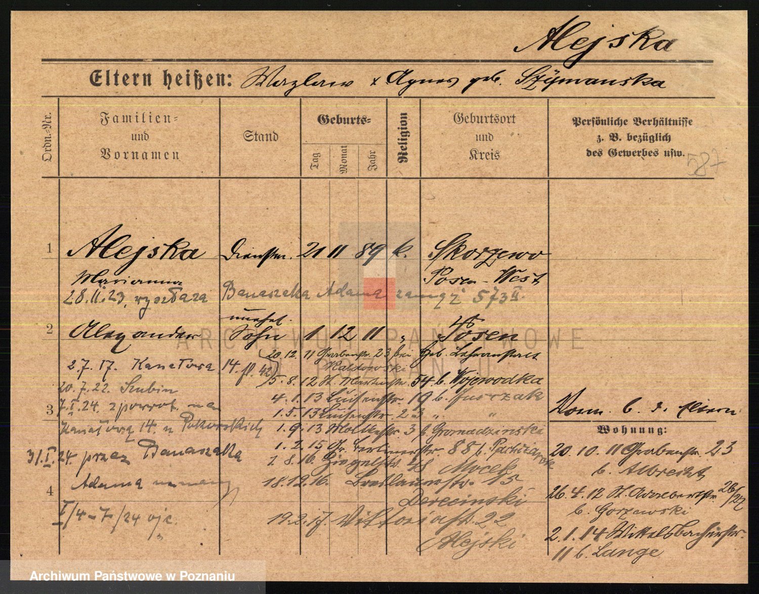 Podgląd karty osobowej dostępny jest po kliknięciu na nazwisko lub ikonkę karty. Można dokonywać powiększenia (ikony na górze) lub przechodzić między kolejnymi skanami (strzałki po bokach).
