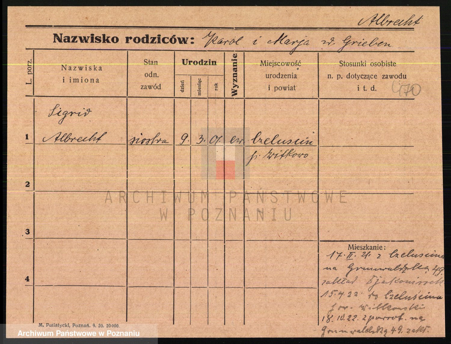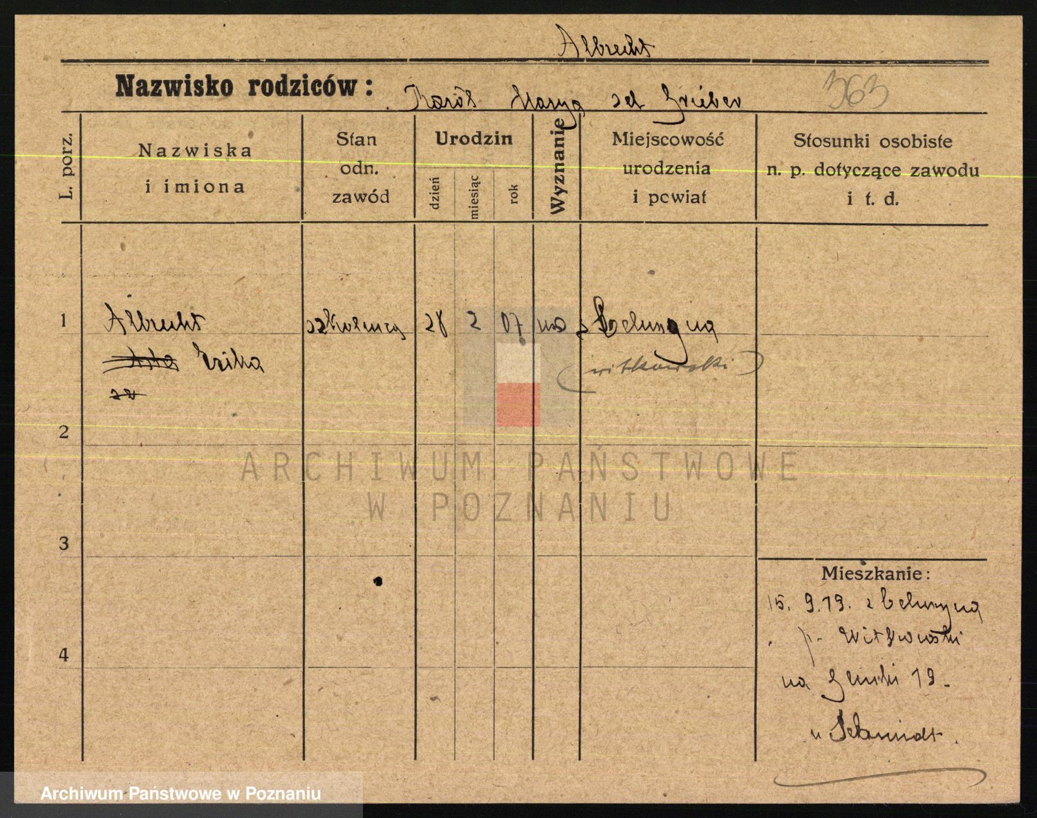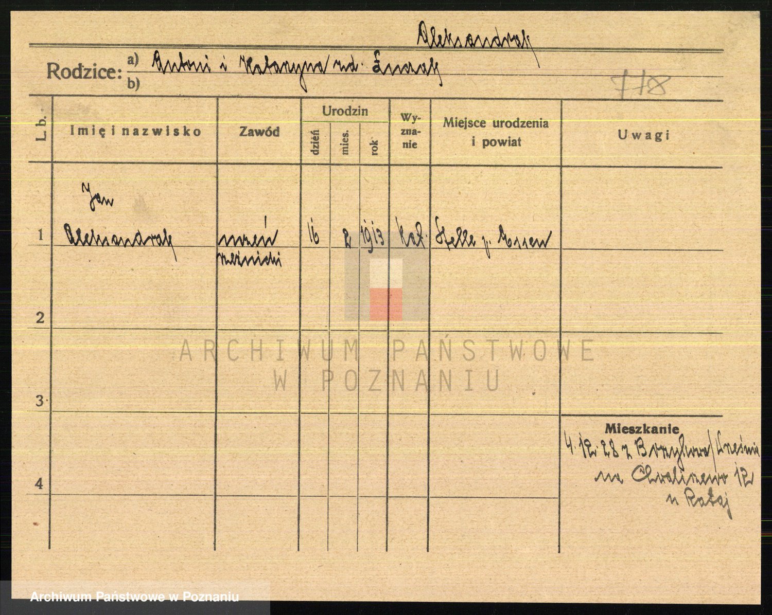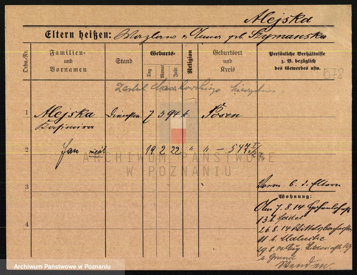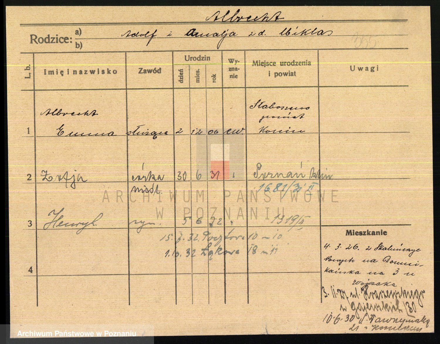 Podgląd karty osobowej dostępny jest po kliknięciu na nazwisko lub ikonkę karty. Można dokonywać powiększenia (ikony na górze) lub przechodzić między kolejnymi skanami (strzałki po bokach).