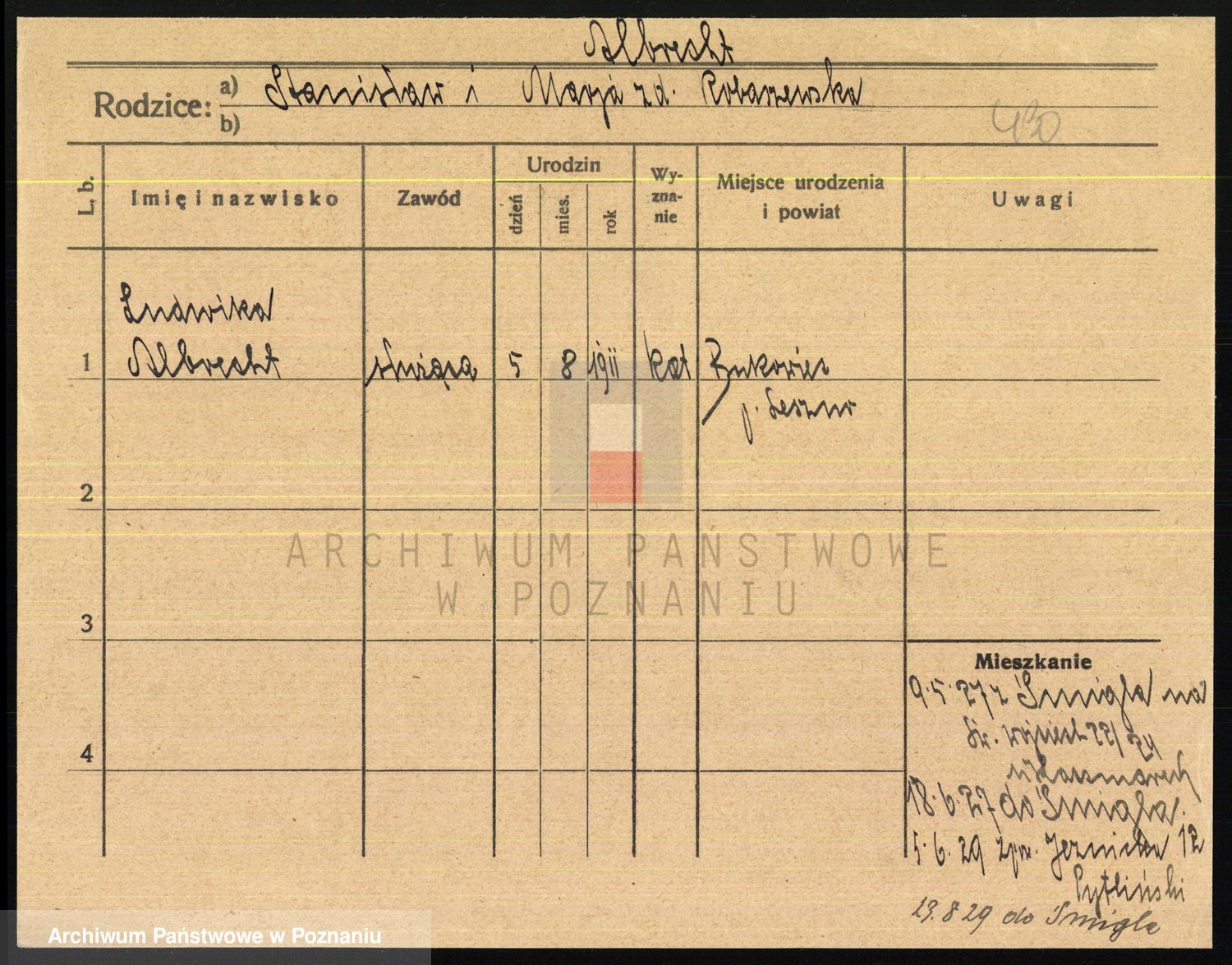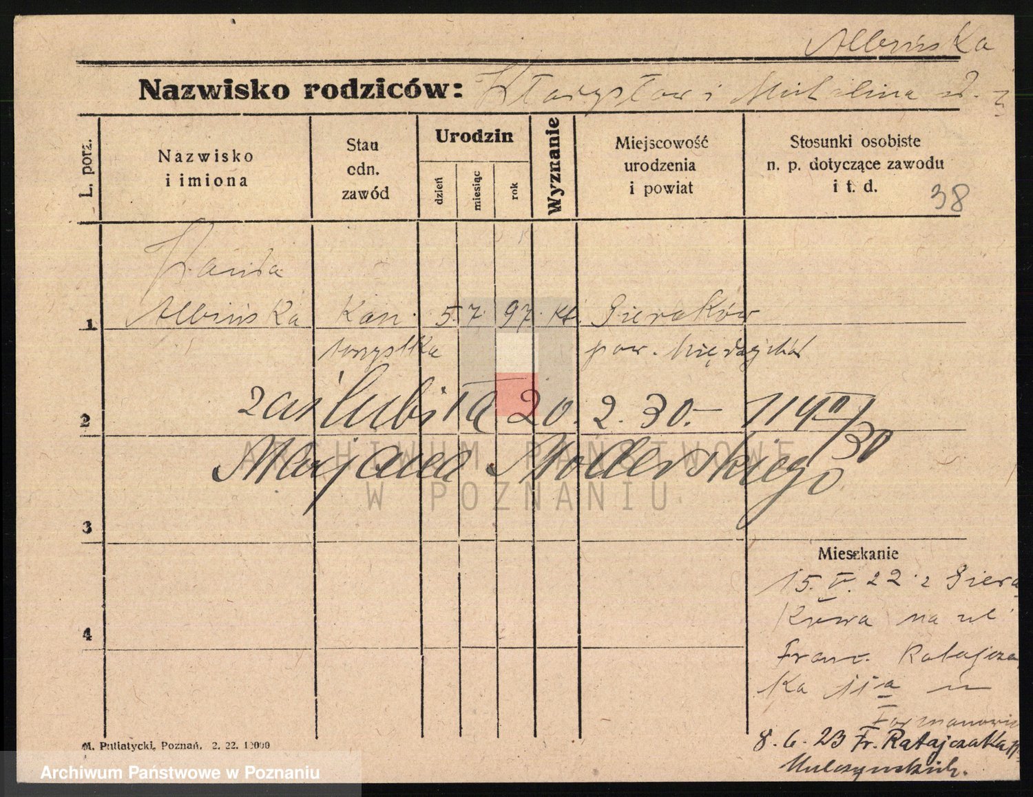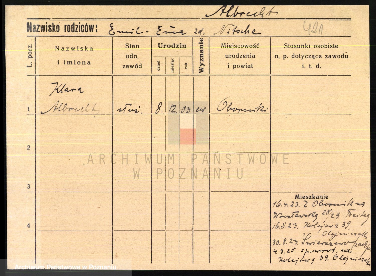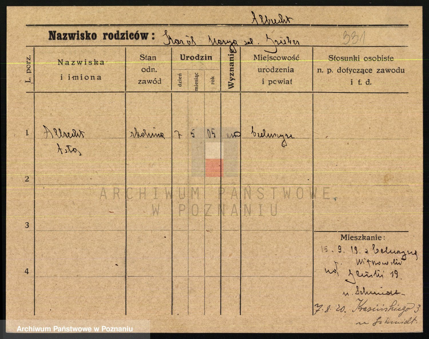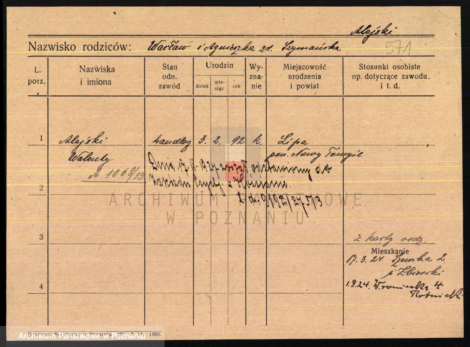 Podgląd karty osobowej dostępny jest po kliknięciu na nazwisko lub ikonkę karty. Można dokonywać powiększenia (ikony na górze) lub przechodzić między kolejnymi skanami (strzałki po bokach).