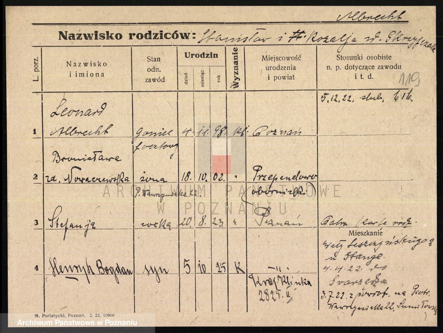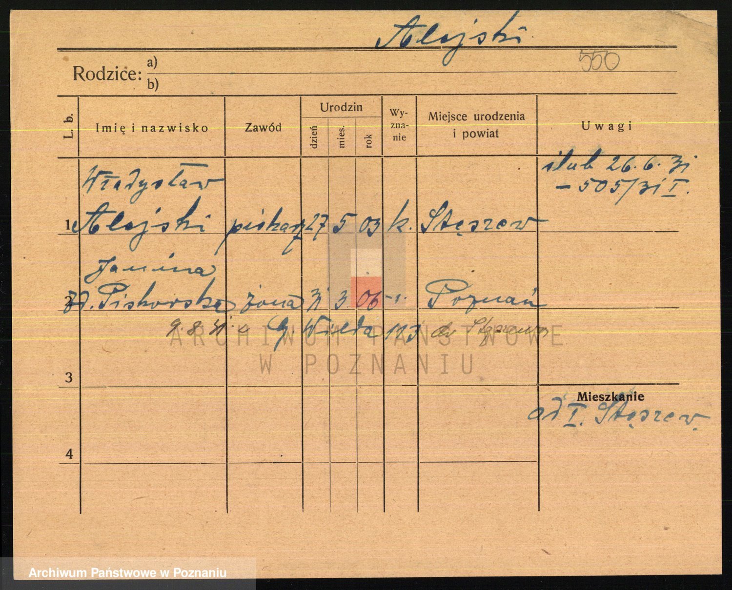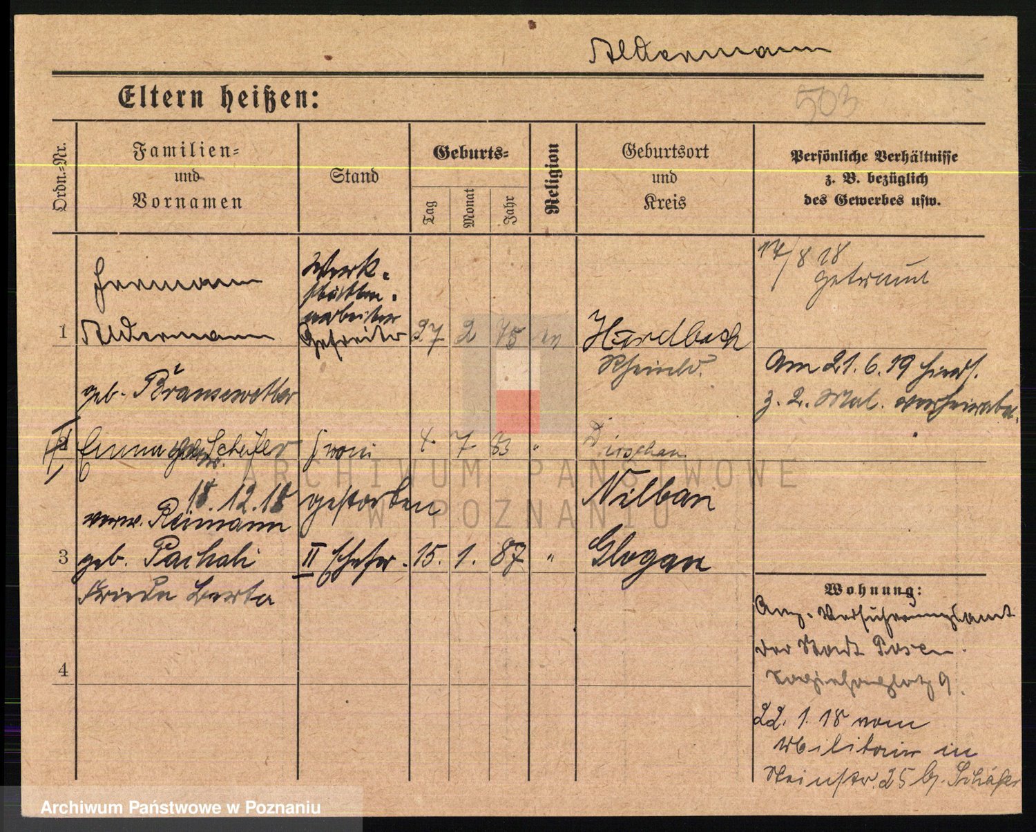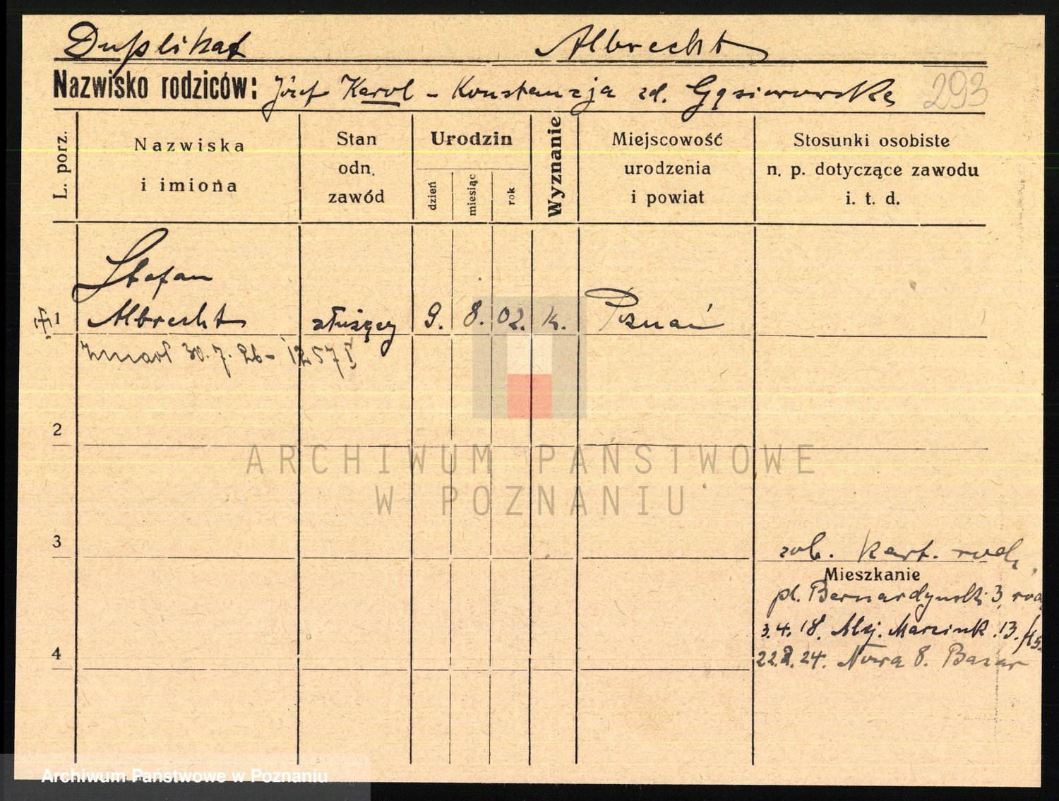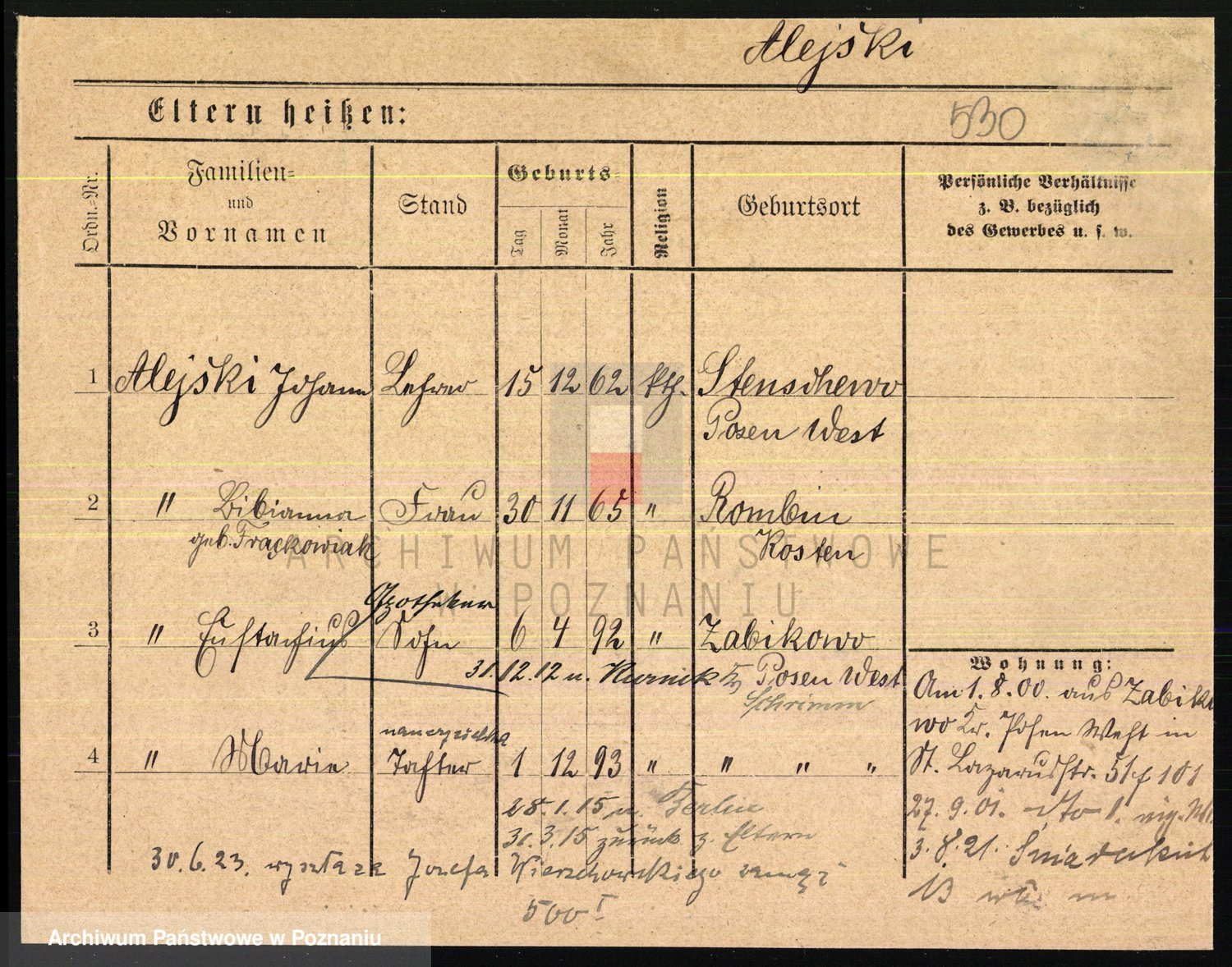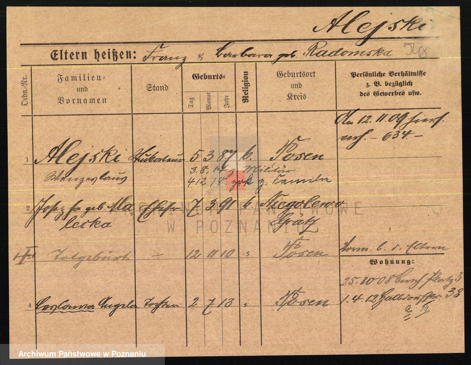 Podgląd karty osobowej dostępny jest po kliknięciu na nazwisko lub ikonkę karty. Można dokonywać powiększenia (ikony na górze) lub przechodzić między kolejnymi skanami (strzałki po bokach).