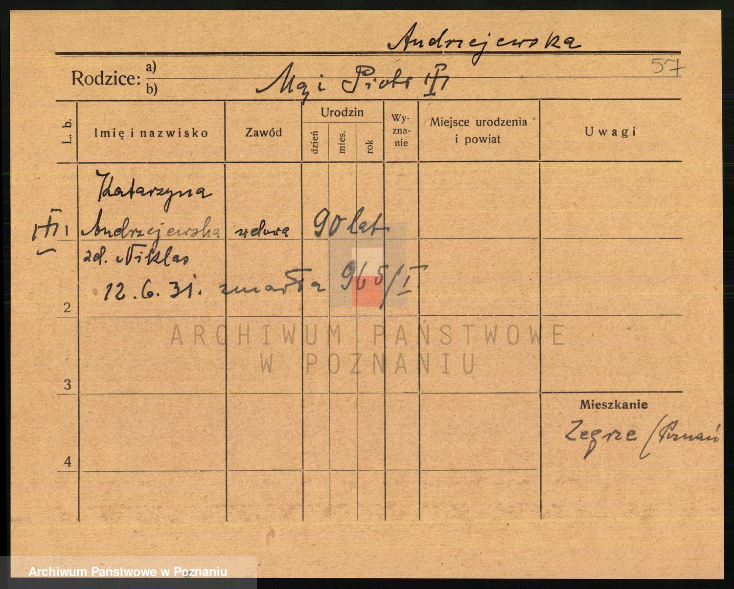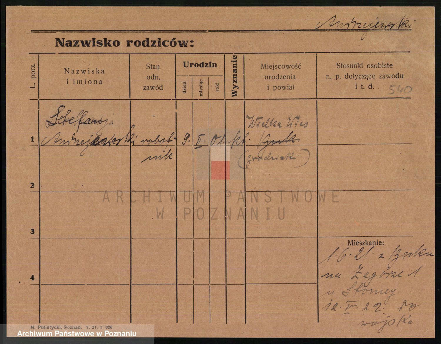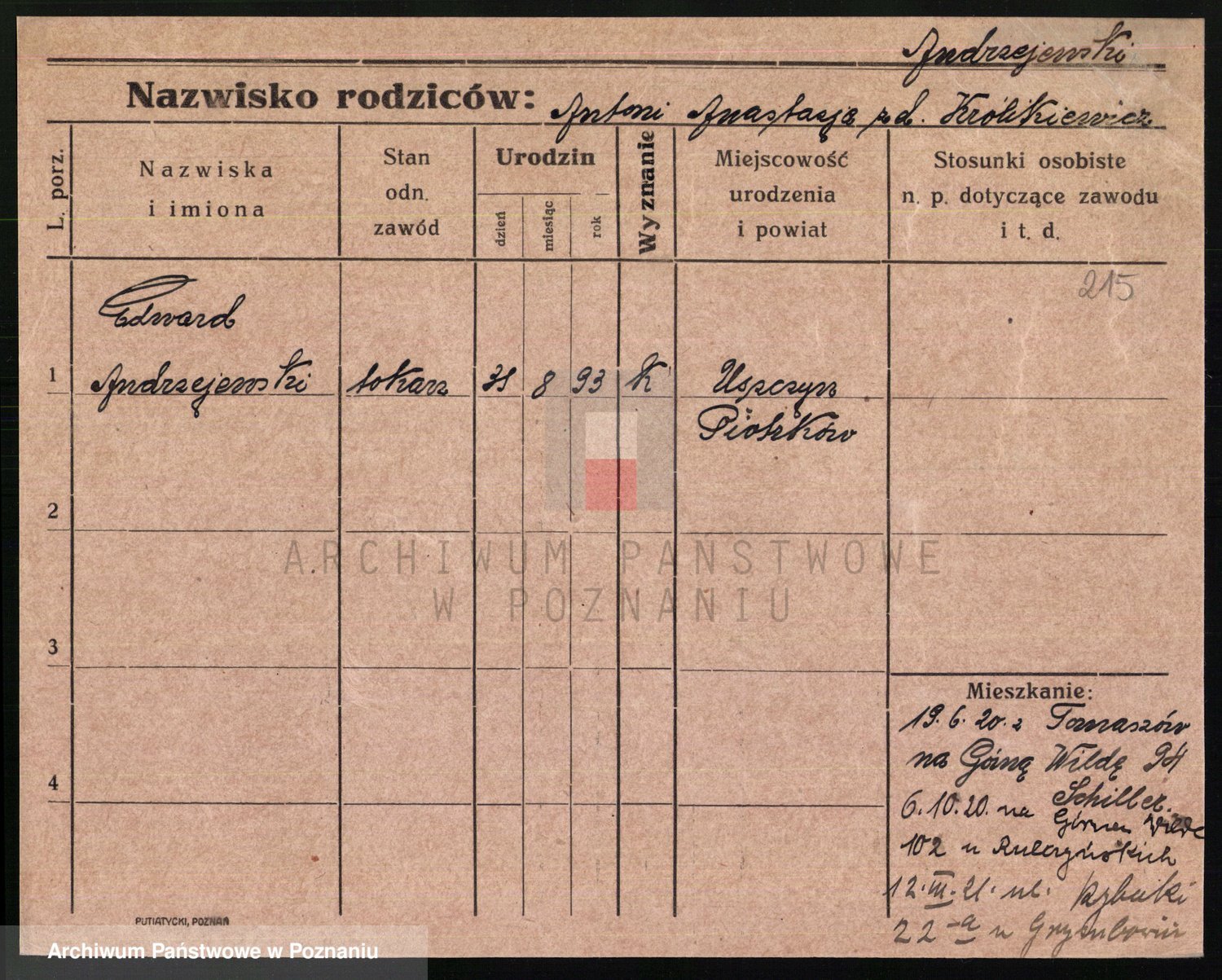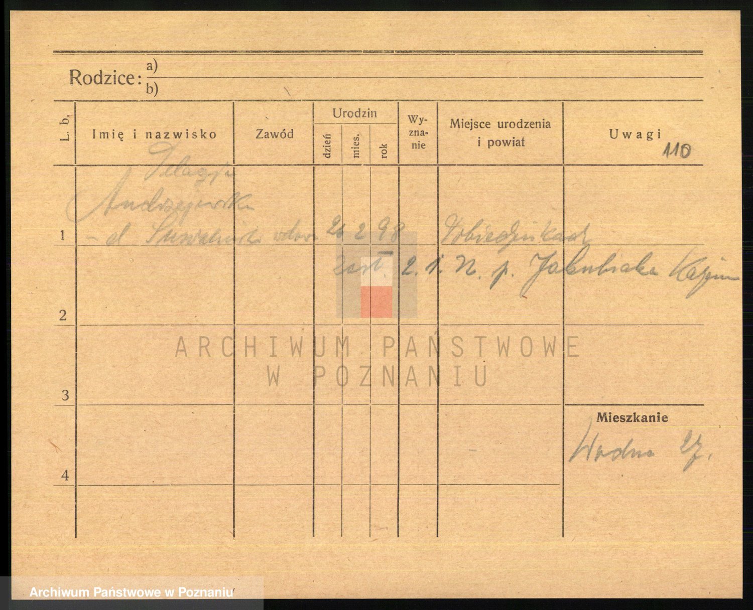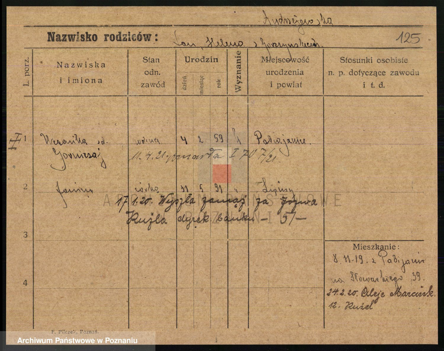 Podgląd karty osobowej dostępny jest po kliknięciu na nazwisko lub ikonkę karty. Można dokonywać powiększenia (ikony na górze) lub przechodzić między kolejnymi skanami (strzałki po bokach).