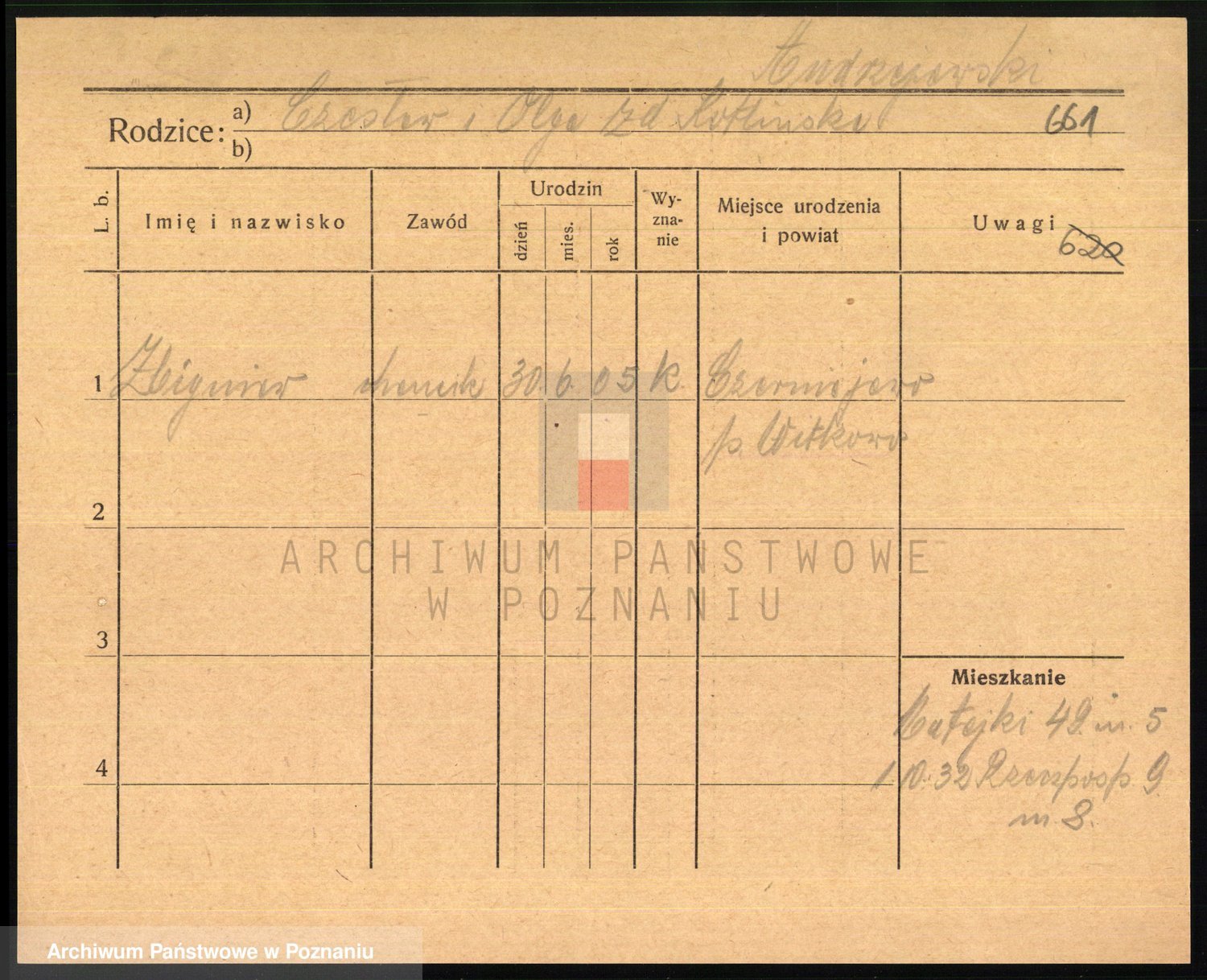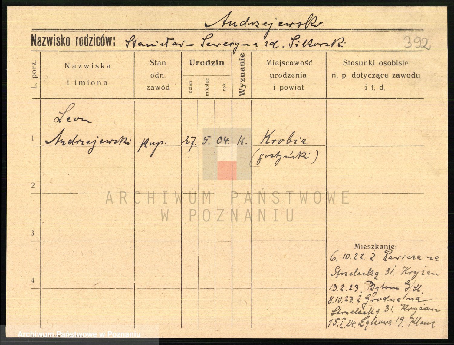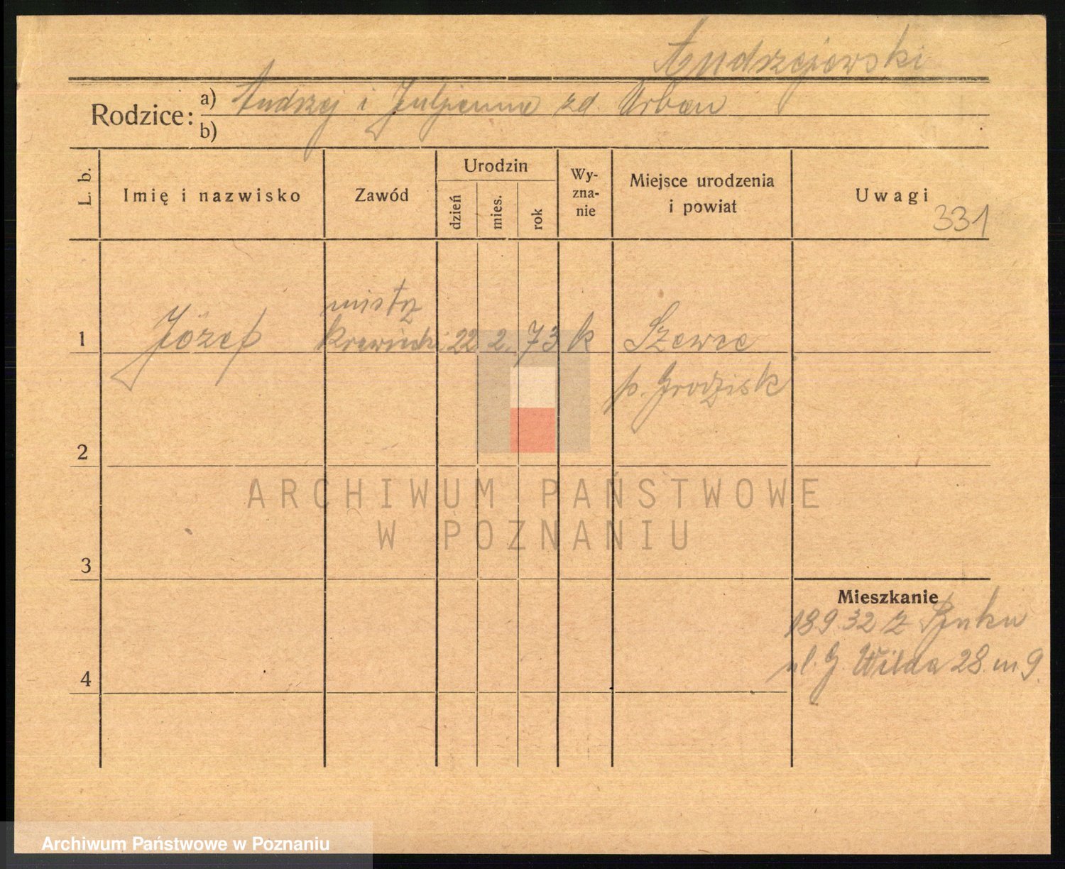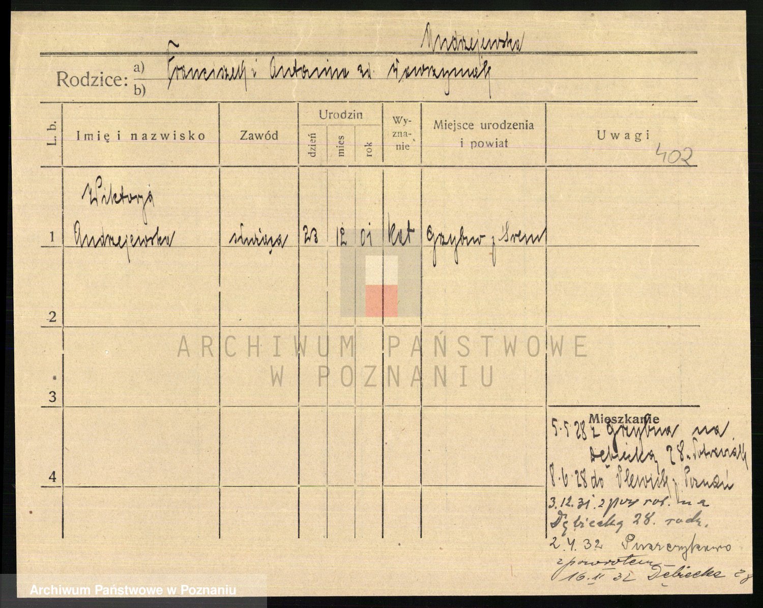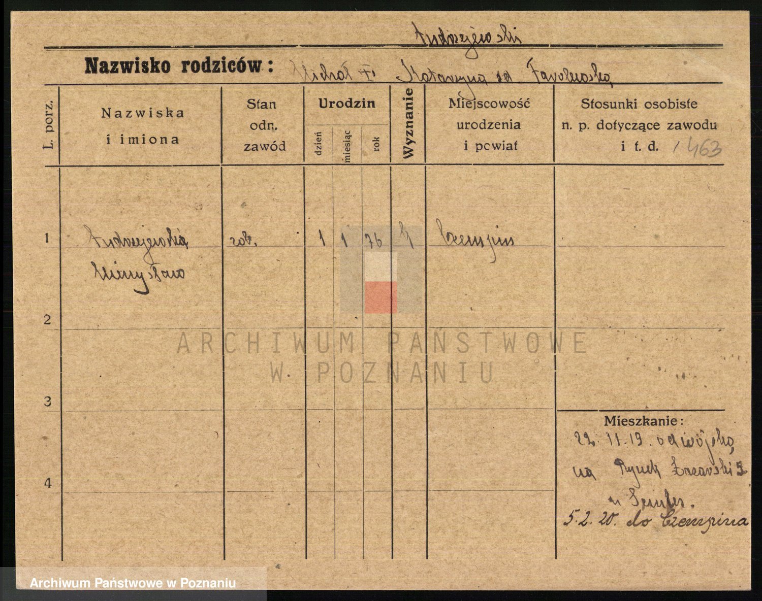 Podgląd karty osobowej dostępny jest po kliknięciu na nazwisko lub ikonkę karty. Można dokonywać powiększenia (ikony na górze) lub przechodzić między kolejnymi skanami (strzałki po bokach).