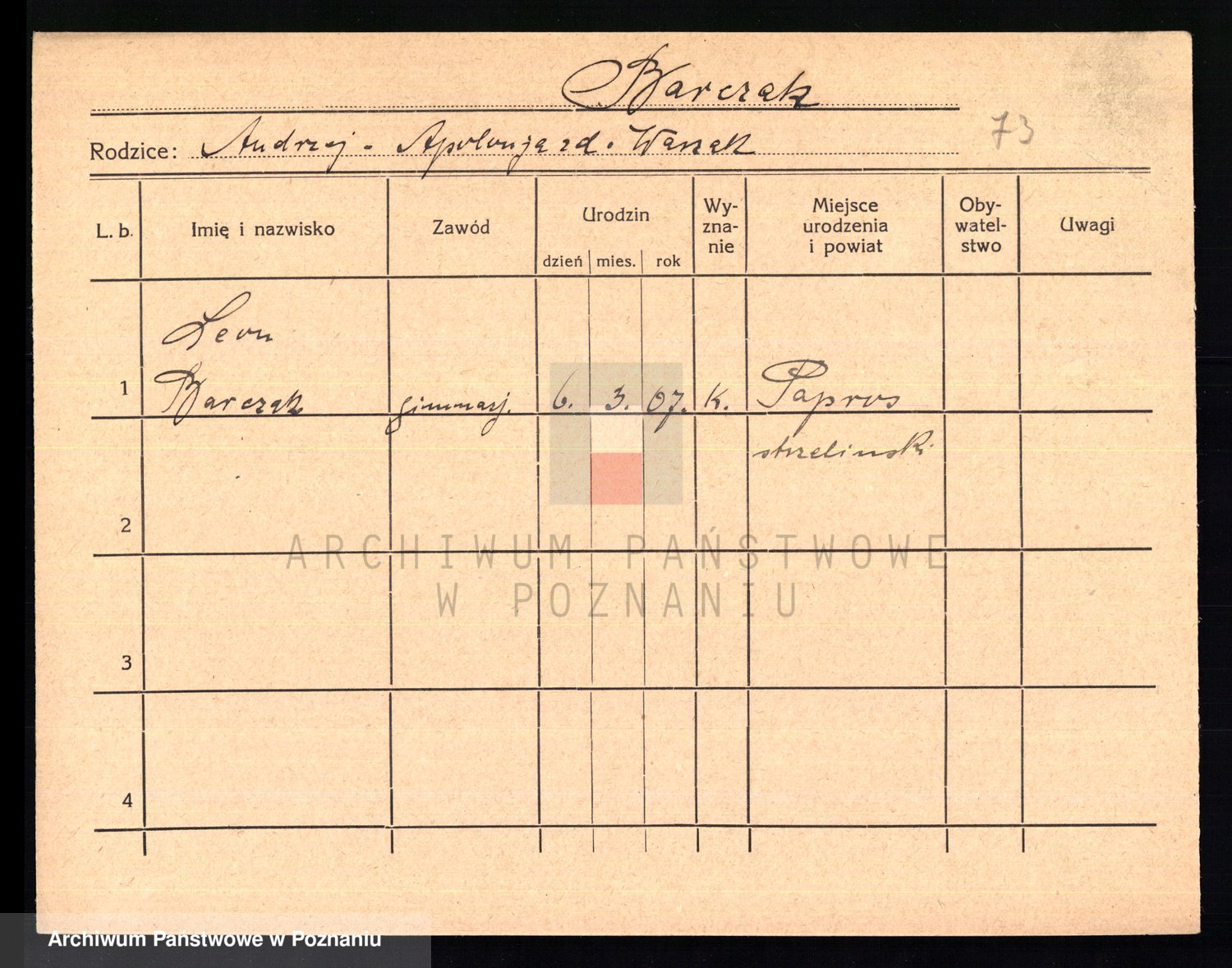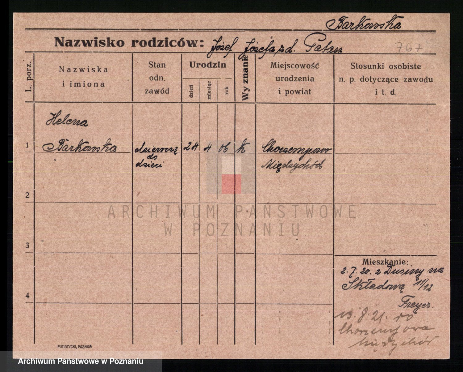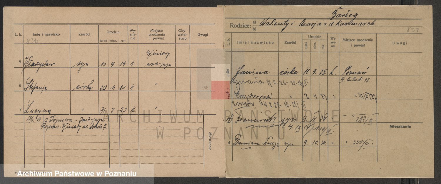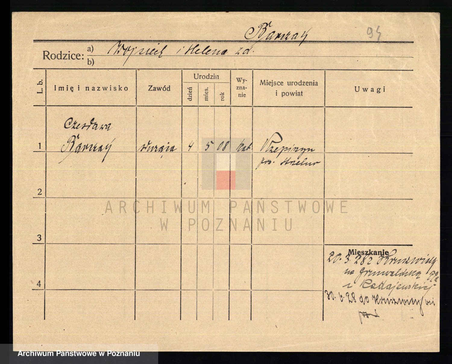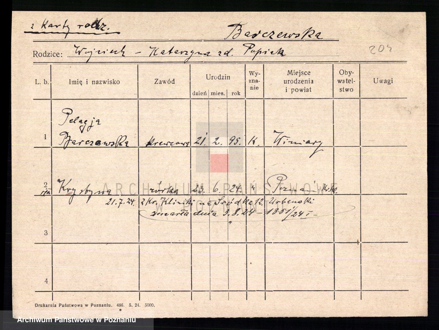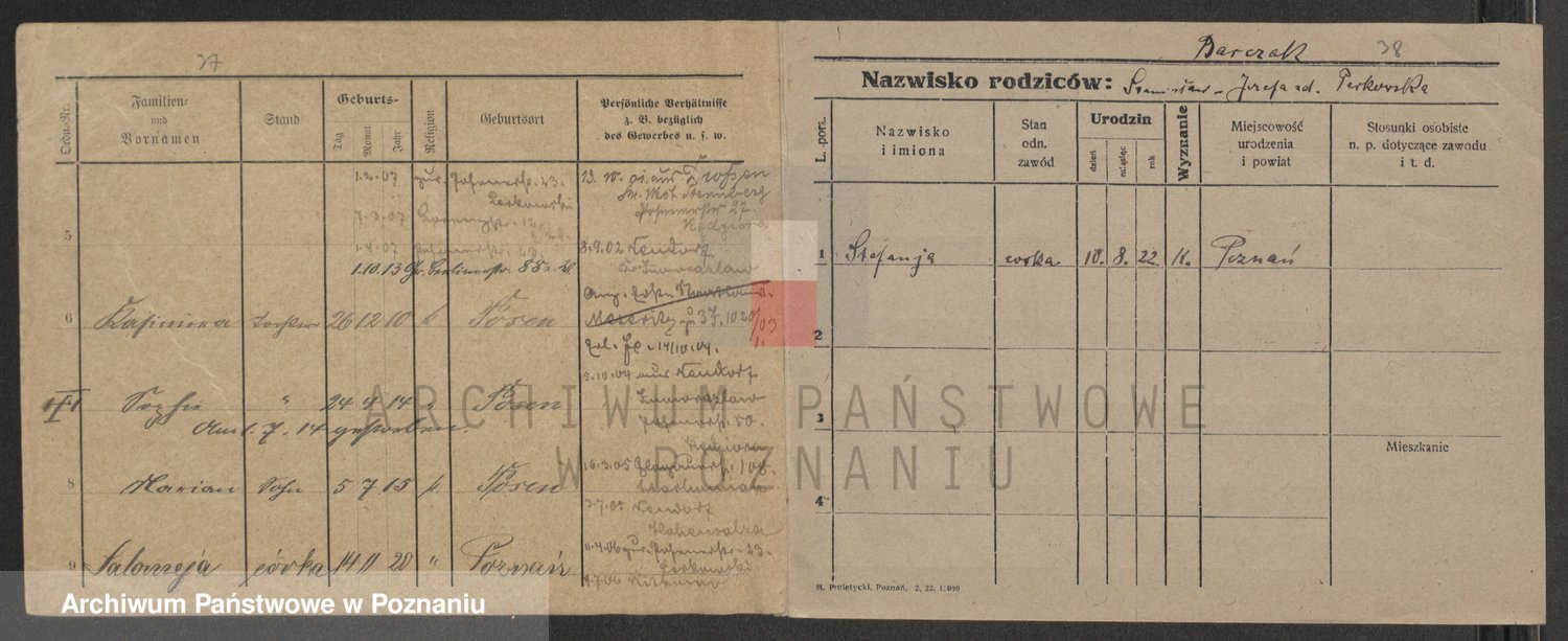 Podgląd karty osobowej dostępny jest po kliknięciu na nazwisko lub ikonkę karty. Można dokonywać powiększenia (ikony na górze) lub przechodzić między kolejnymi skanami (strzałki po bokach).