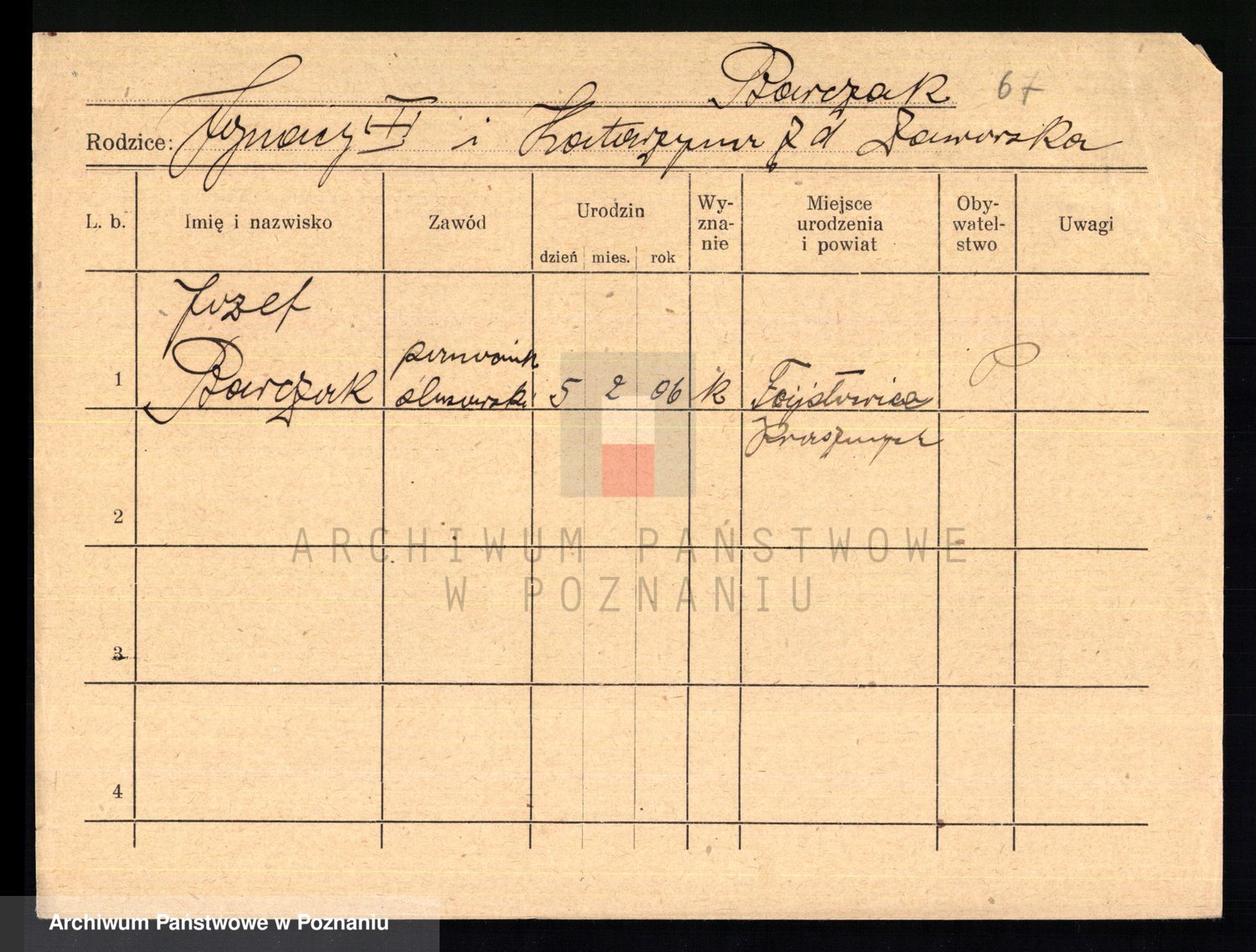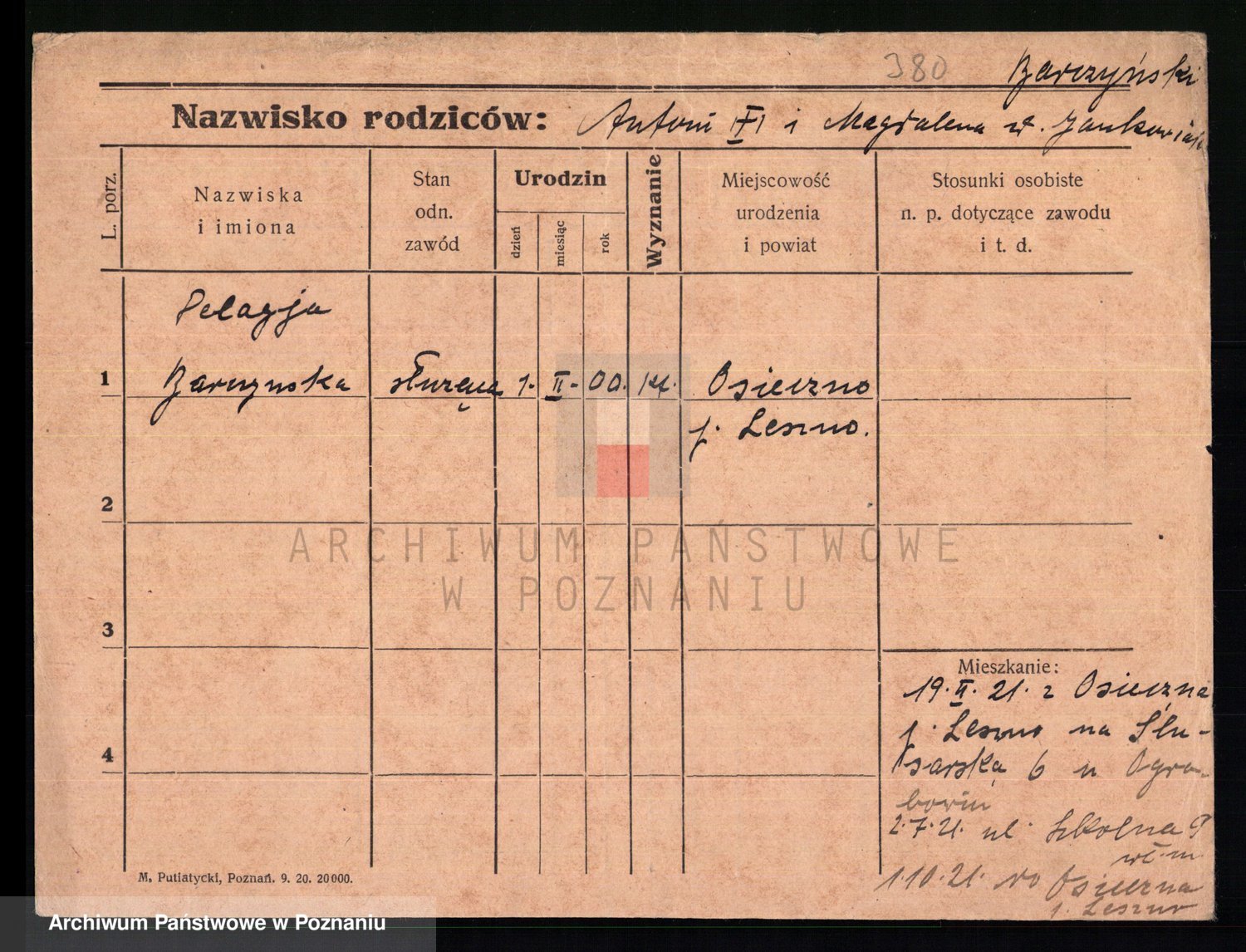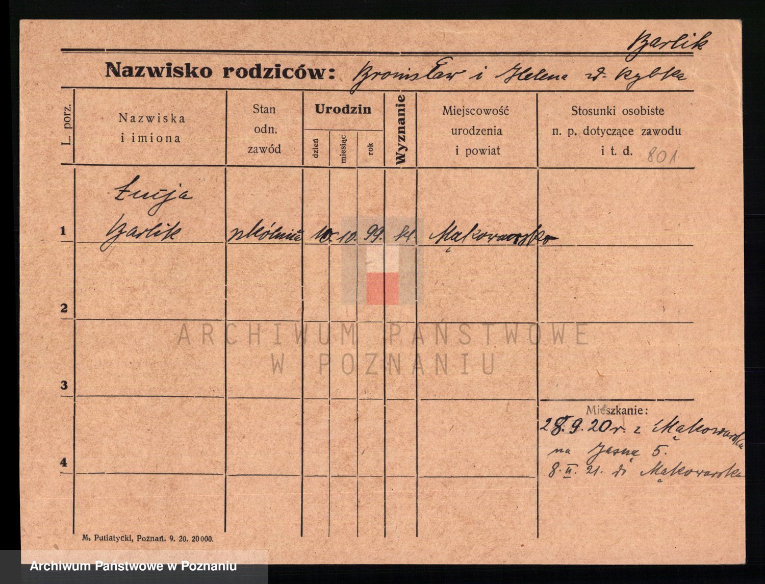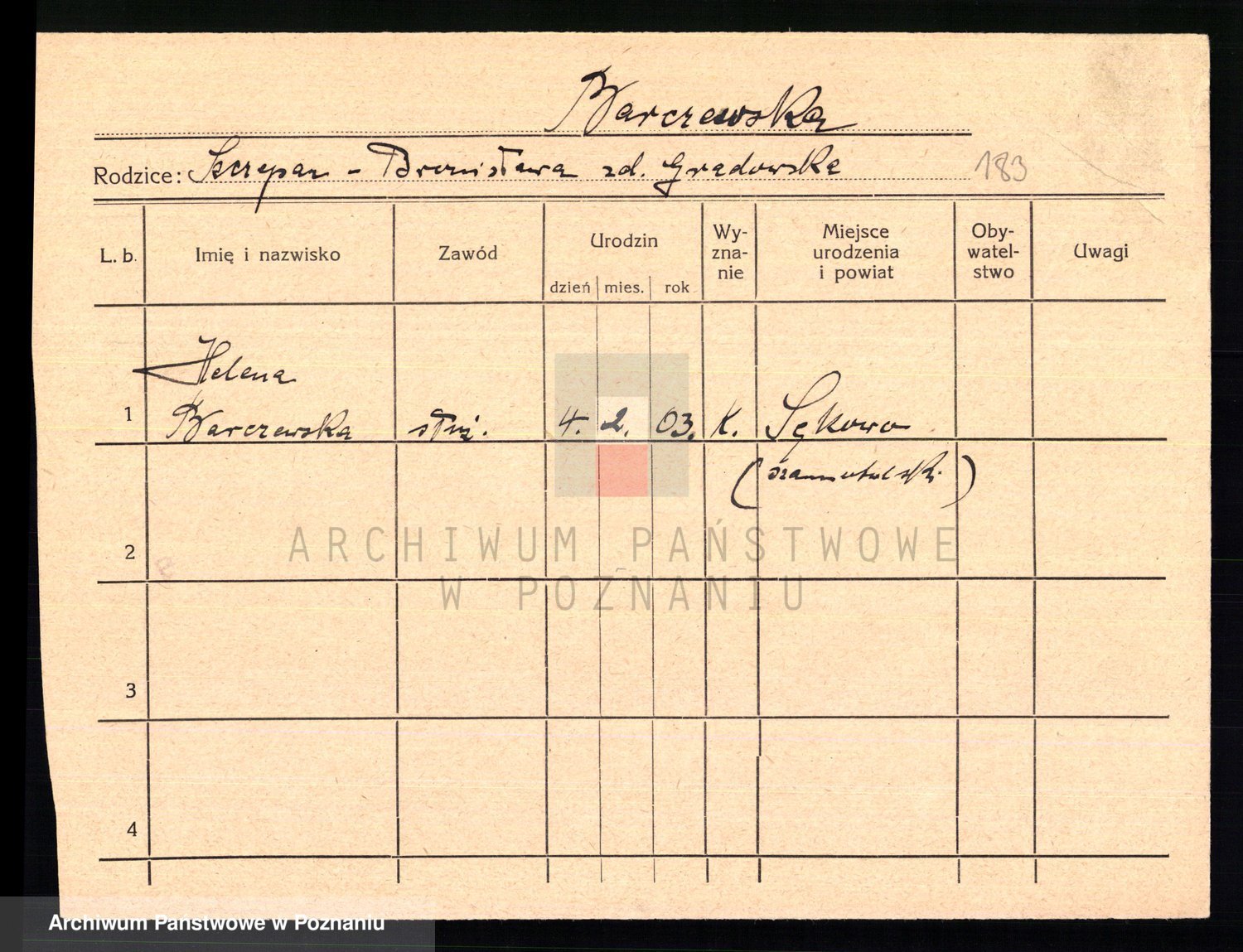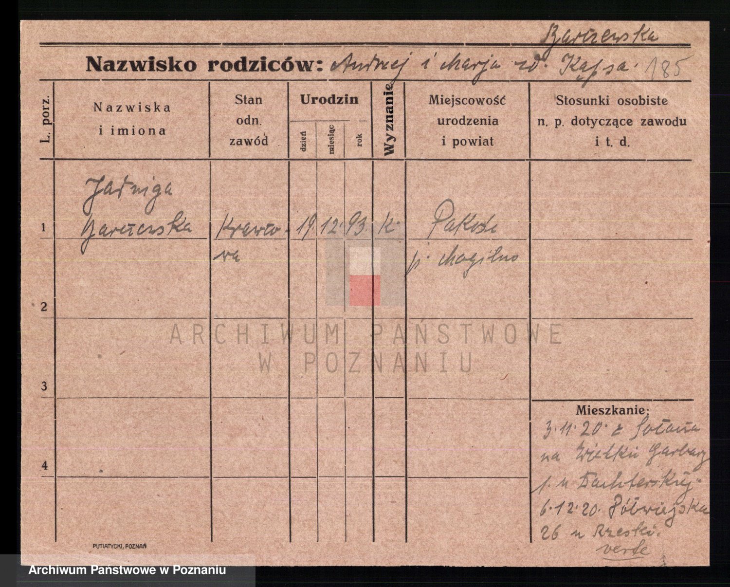 Podgląd karty osobowej dostępny jest po kliknięciu na nazwisko lub ikonkę karty. Można dokonywać powiększenia (ikony na górze) lub przechodzić między kolejnymi skanami (strzałki po bokach).