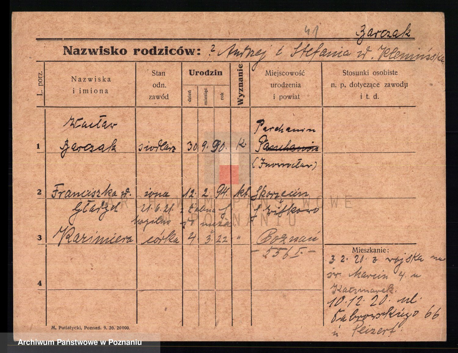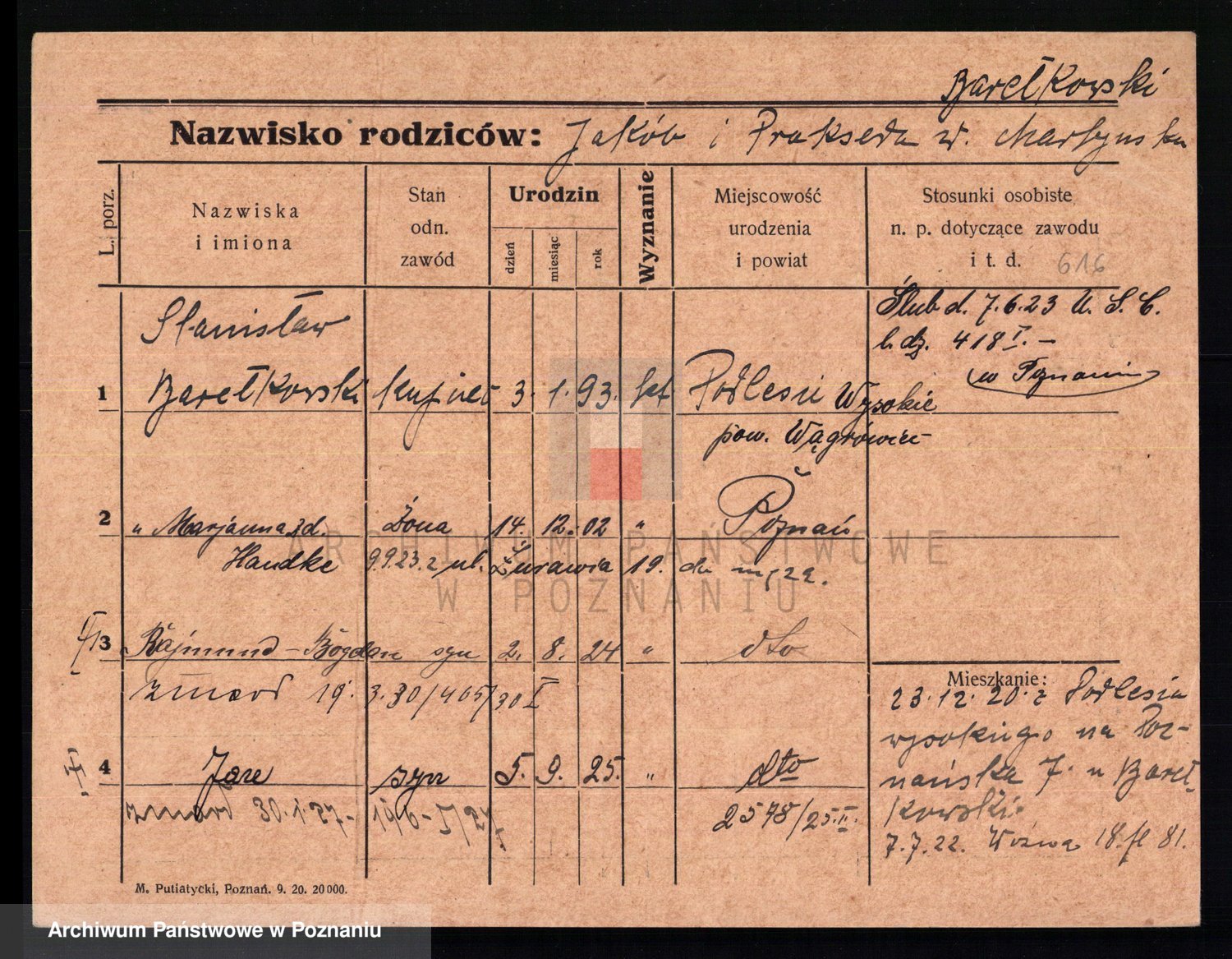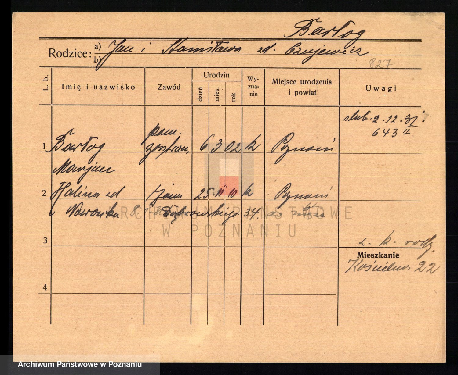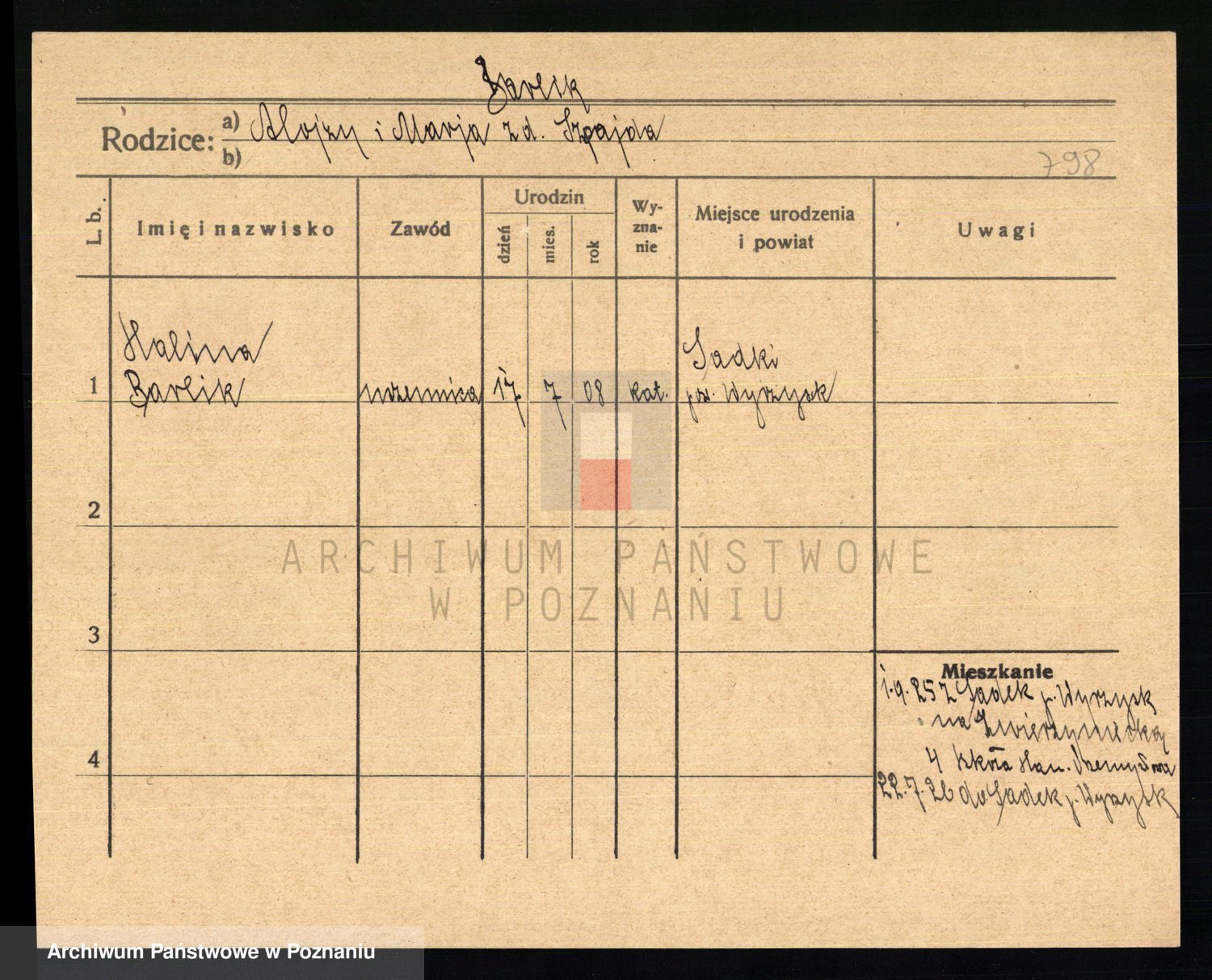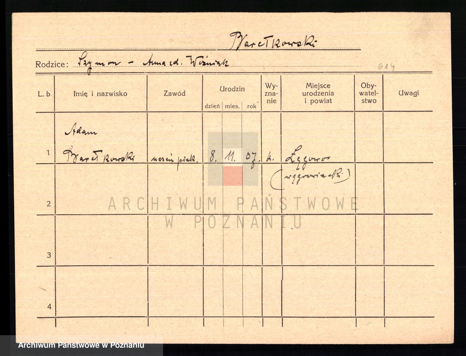 Podgląd karty osobowej dostępny jest po kliknięciu na nazwisko lub ikonkę karty. Można dokonywać powiększenia (ikony na górze) lub przechodzić między kolejnymi skanami (strzałki po bokach).