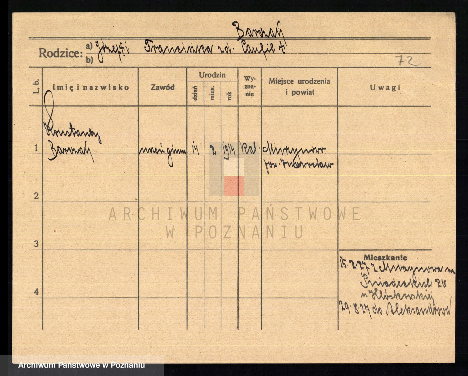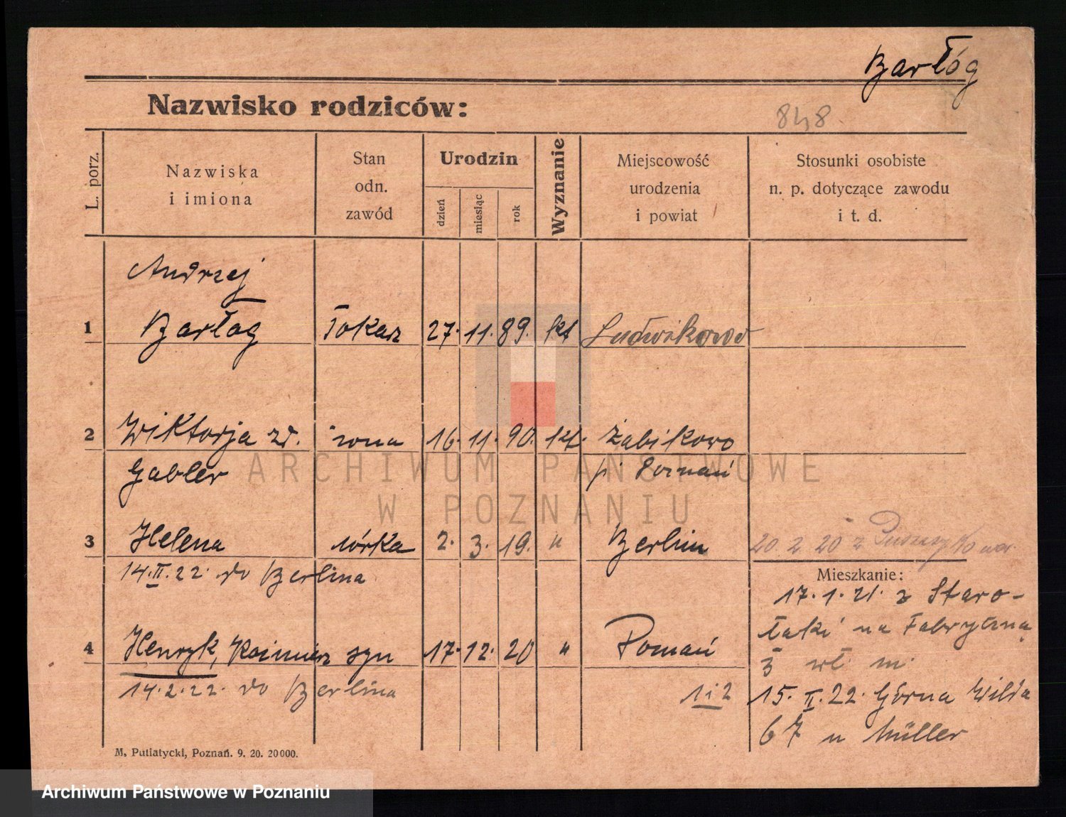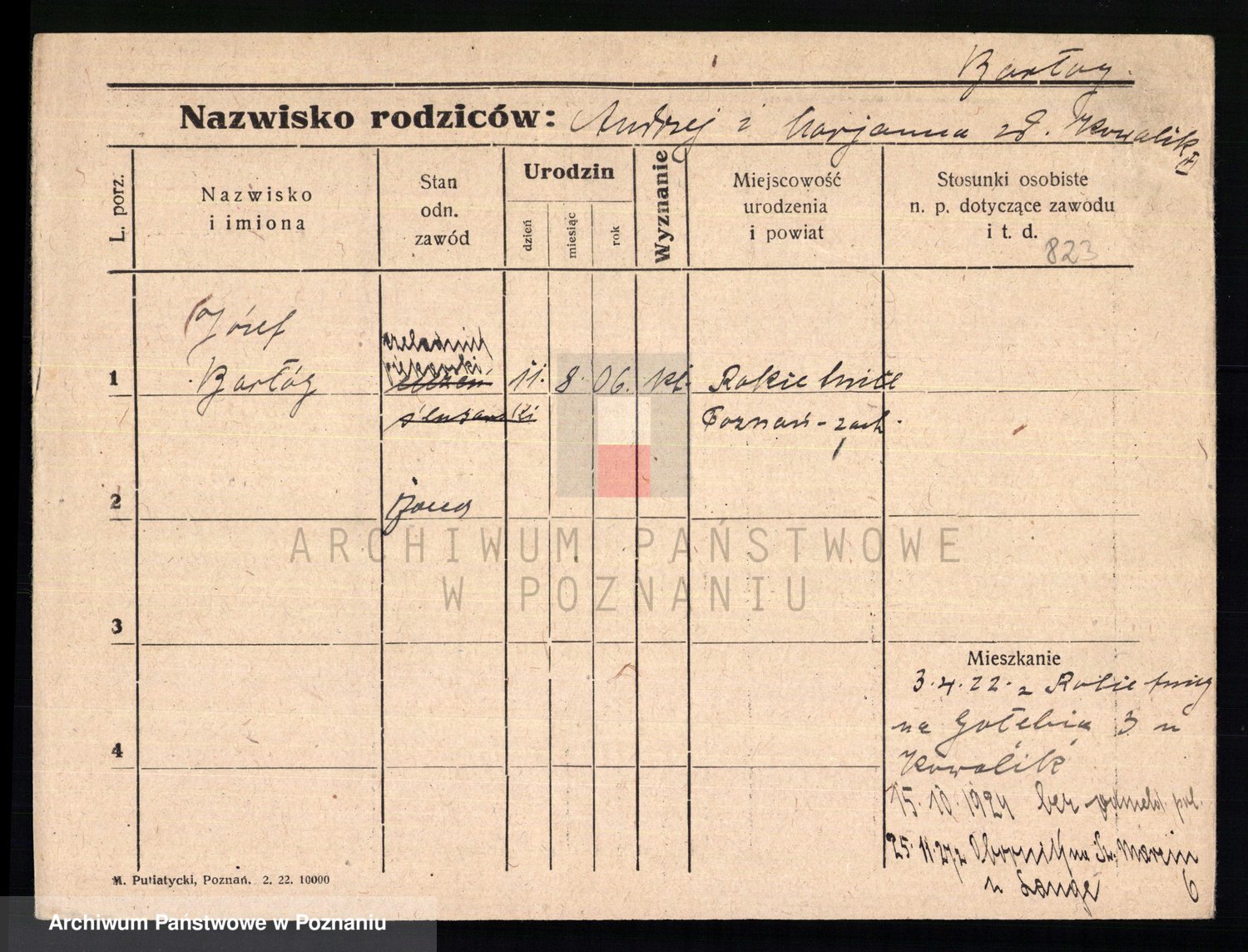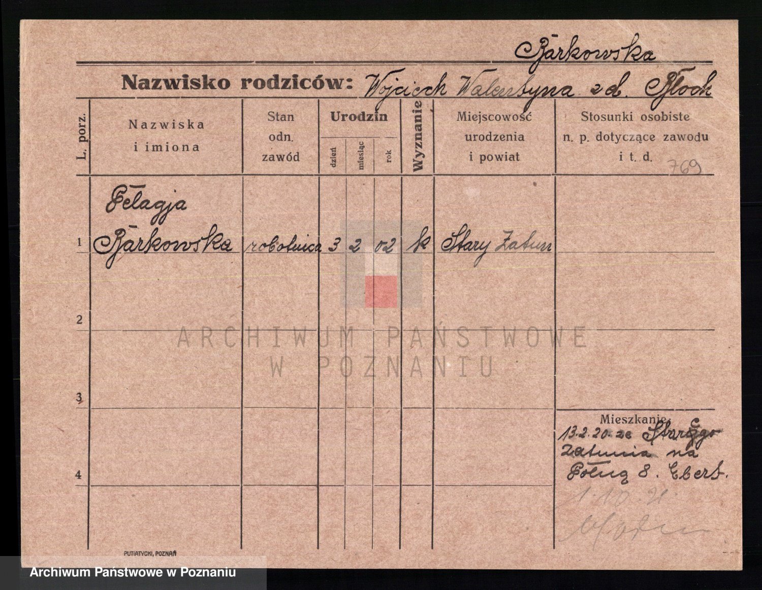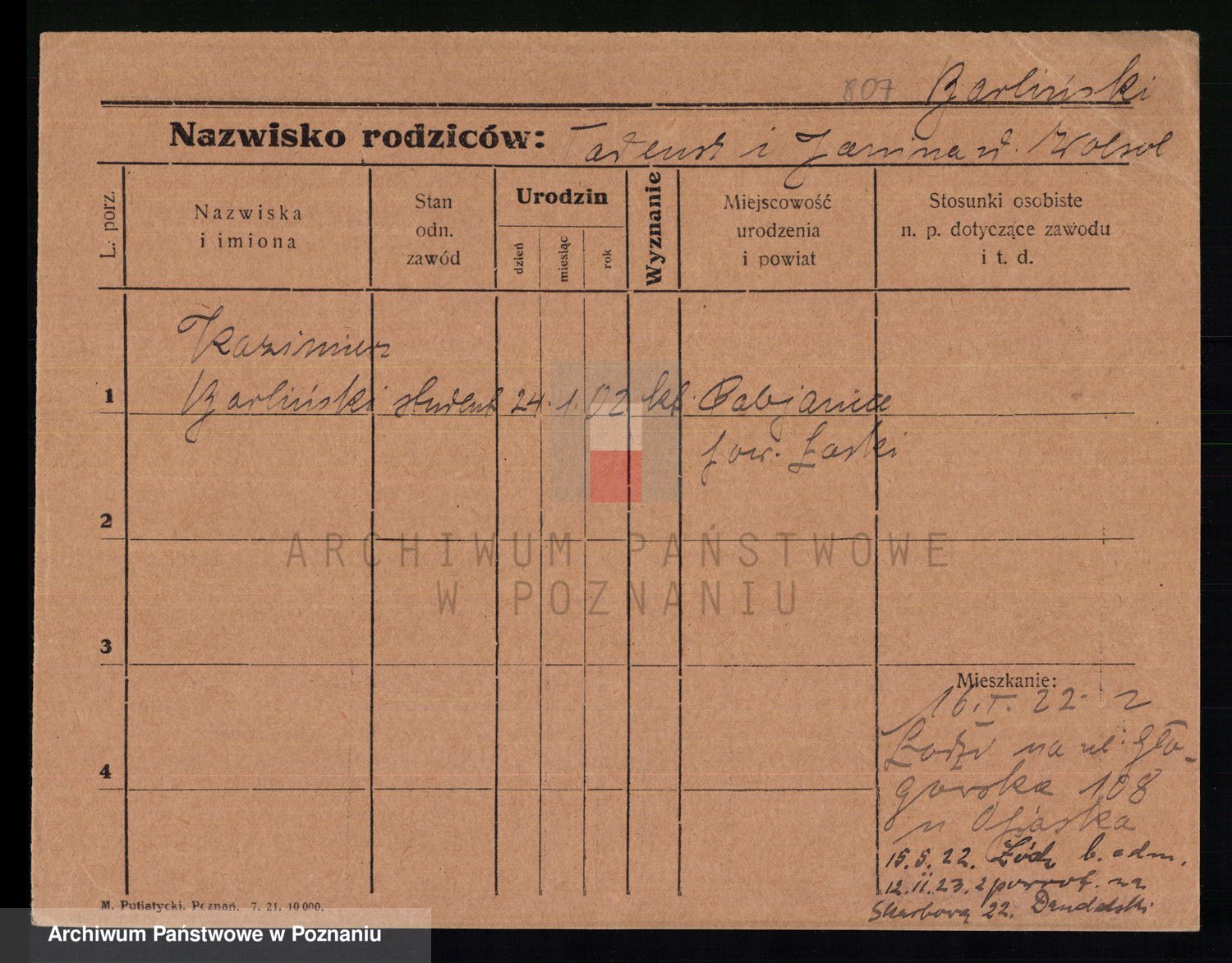 Podgląd karty osobowej dostępny jest po kliknięciu na nazwisko lub ikonkę karty. Można dokonywać powiększenia (ikony na górze) lub przechodzić między kolejnymi skanami (strzałki po bokach).