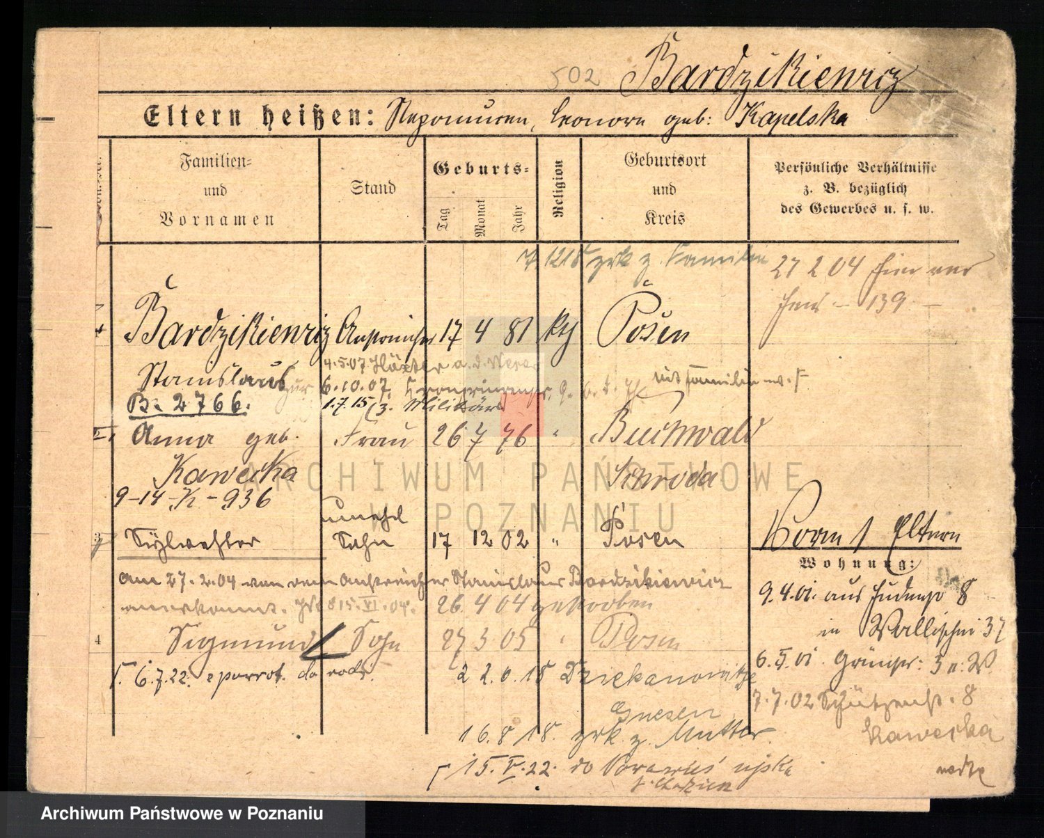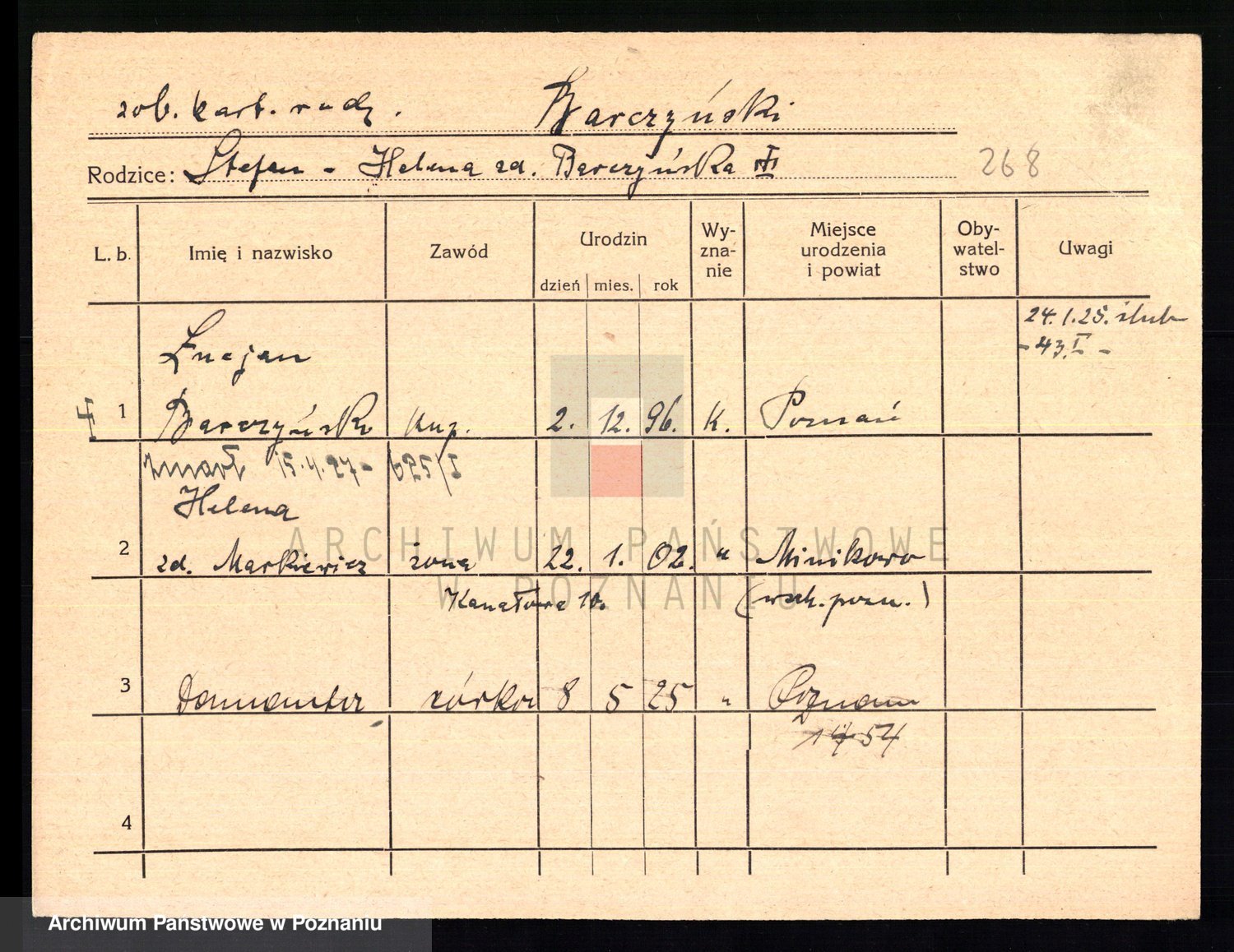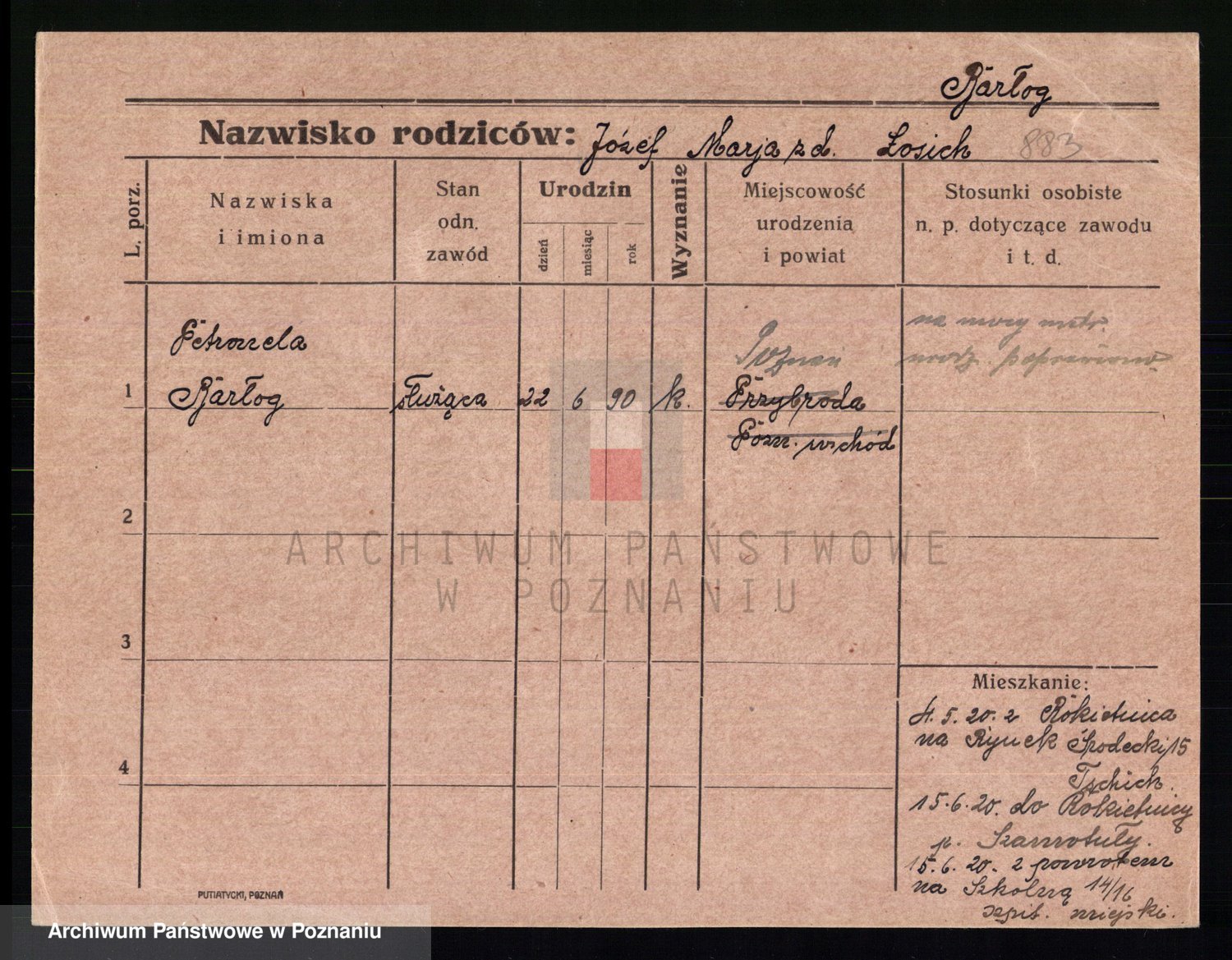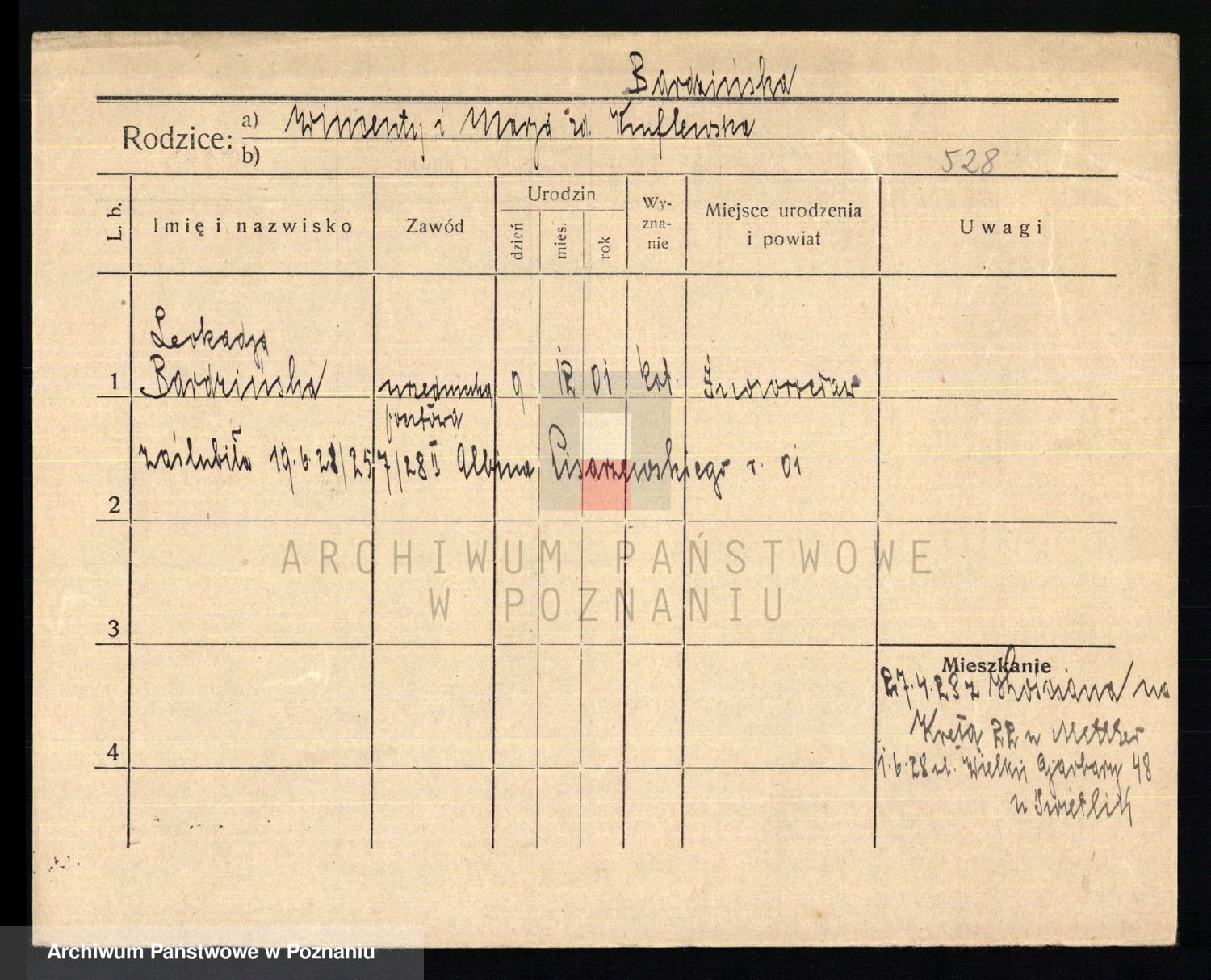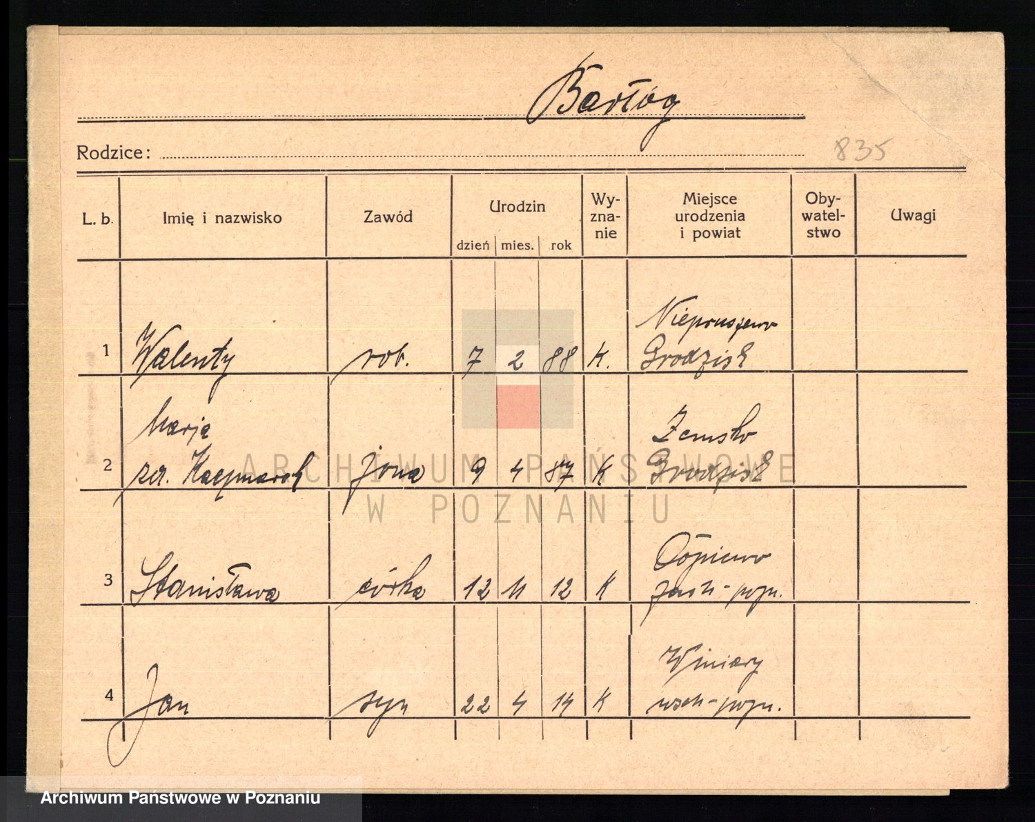Podgląd karty osobowej dostępny jest po kliknięciu na nazwisko lub ikonkę karty. Można dokonywać powiększenia (ikony na górze) lub przechodzić między kolejnymi skanami (strzałki po bokach).