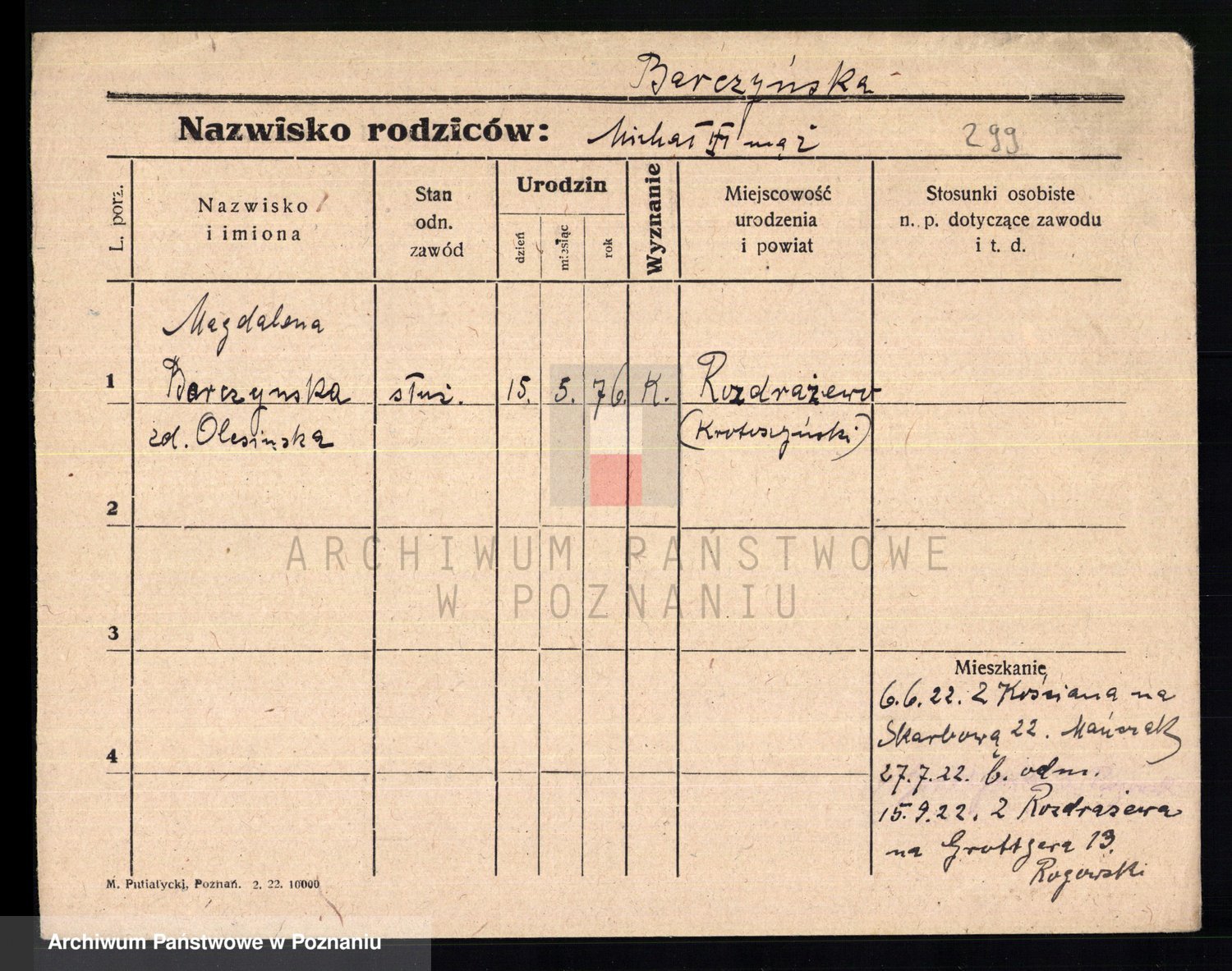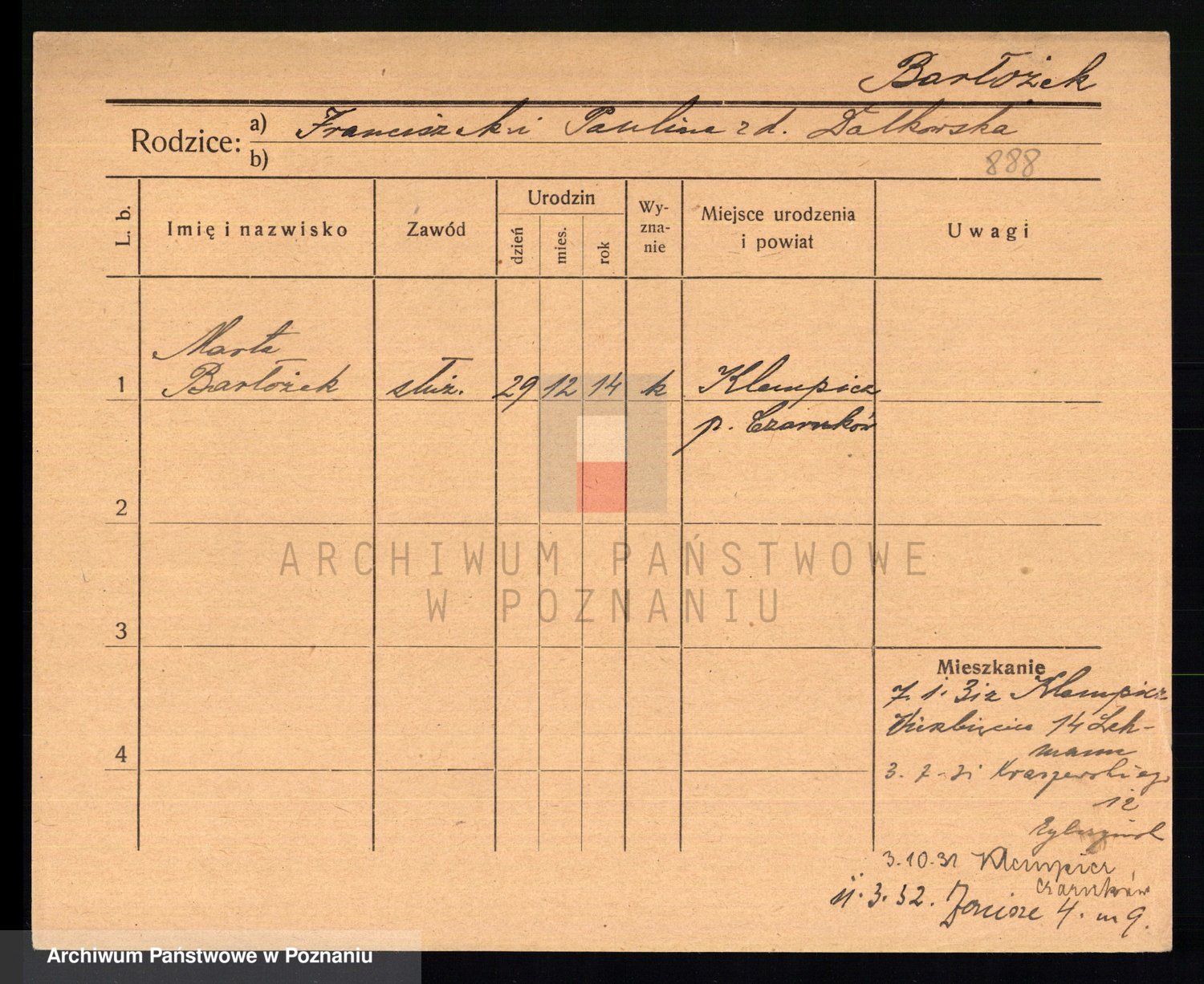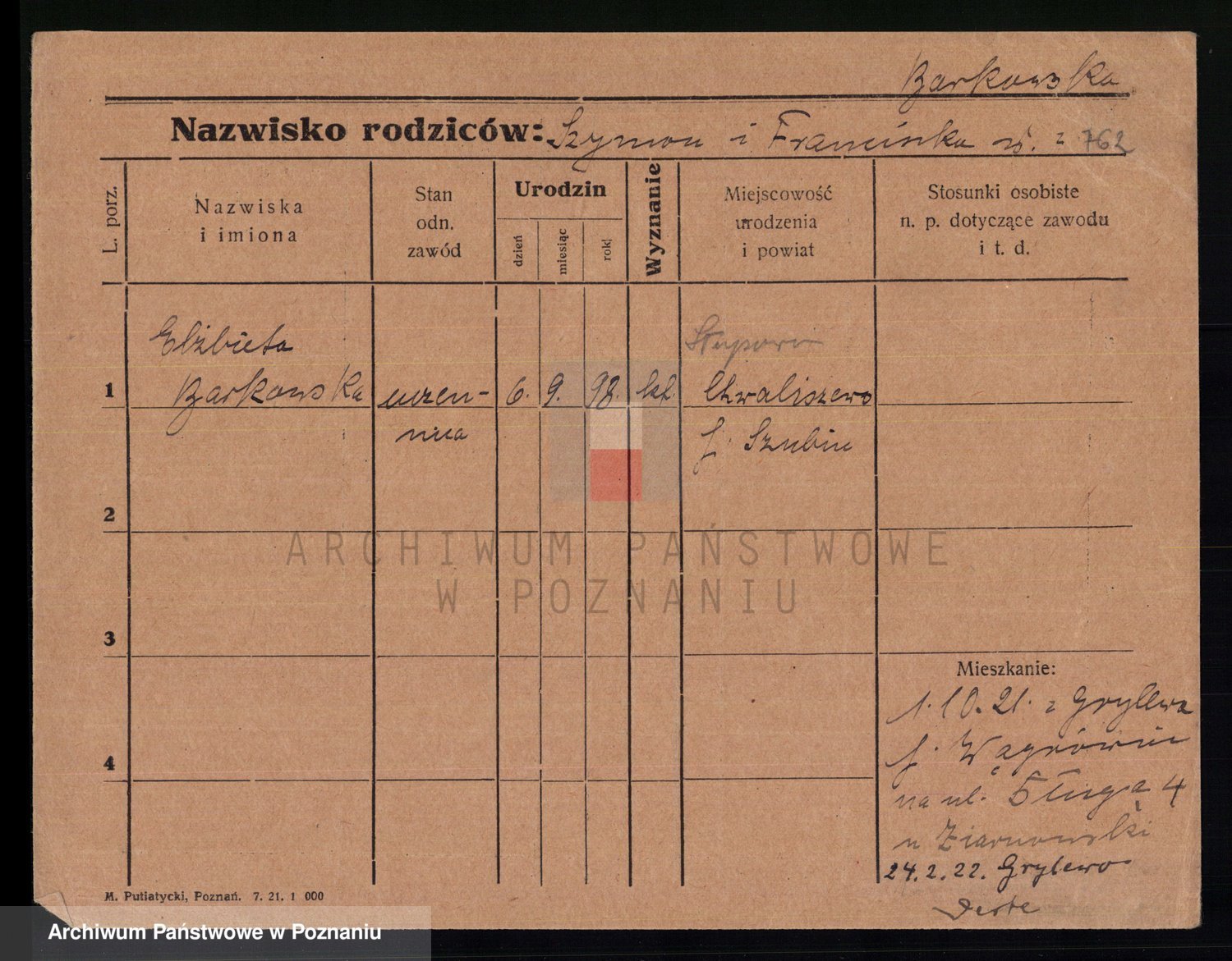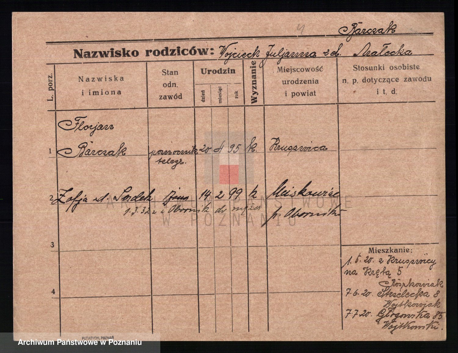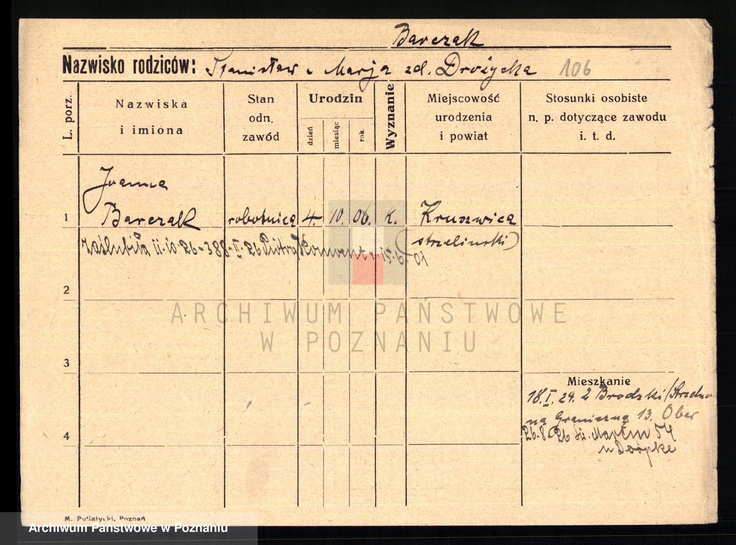 Podgląd karty osobowej dostępny jest po kliknięciu na nazwisko lub ikonkę karty. Można dokonywać powiększenia (ikony na górze) lub przechodzić między kolejnymi skanami (strzałki po bokach).