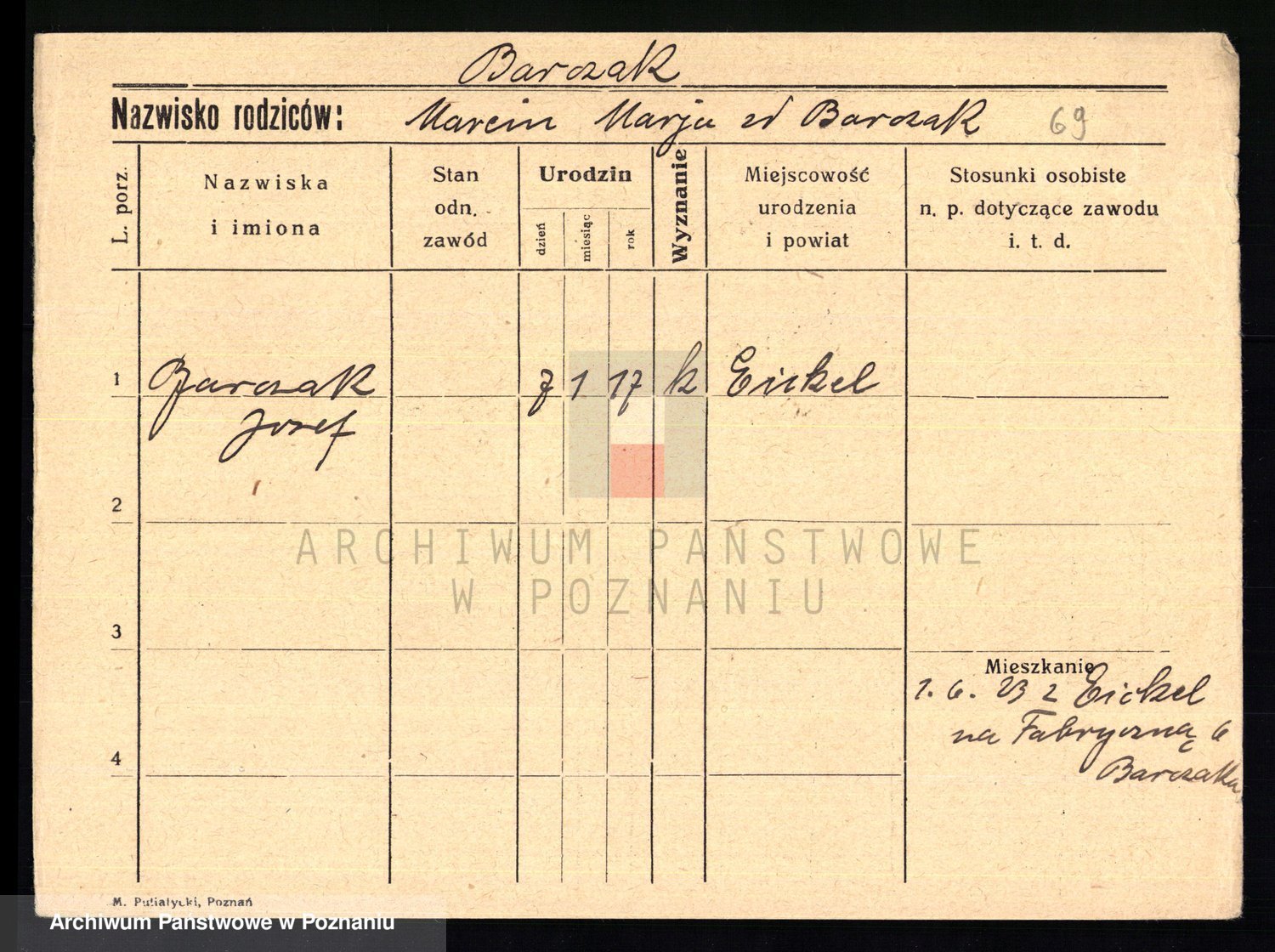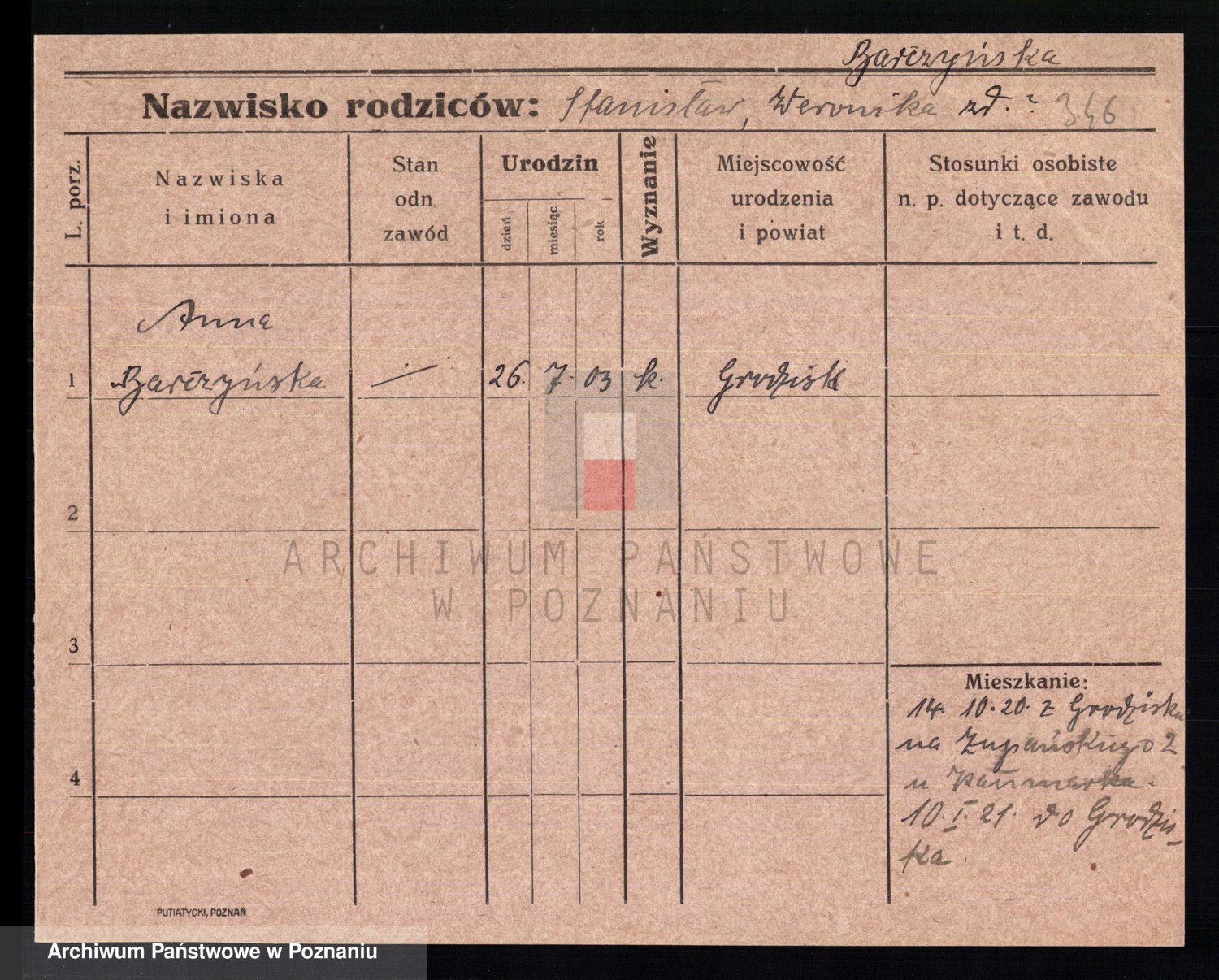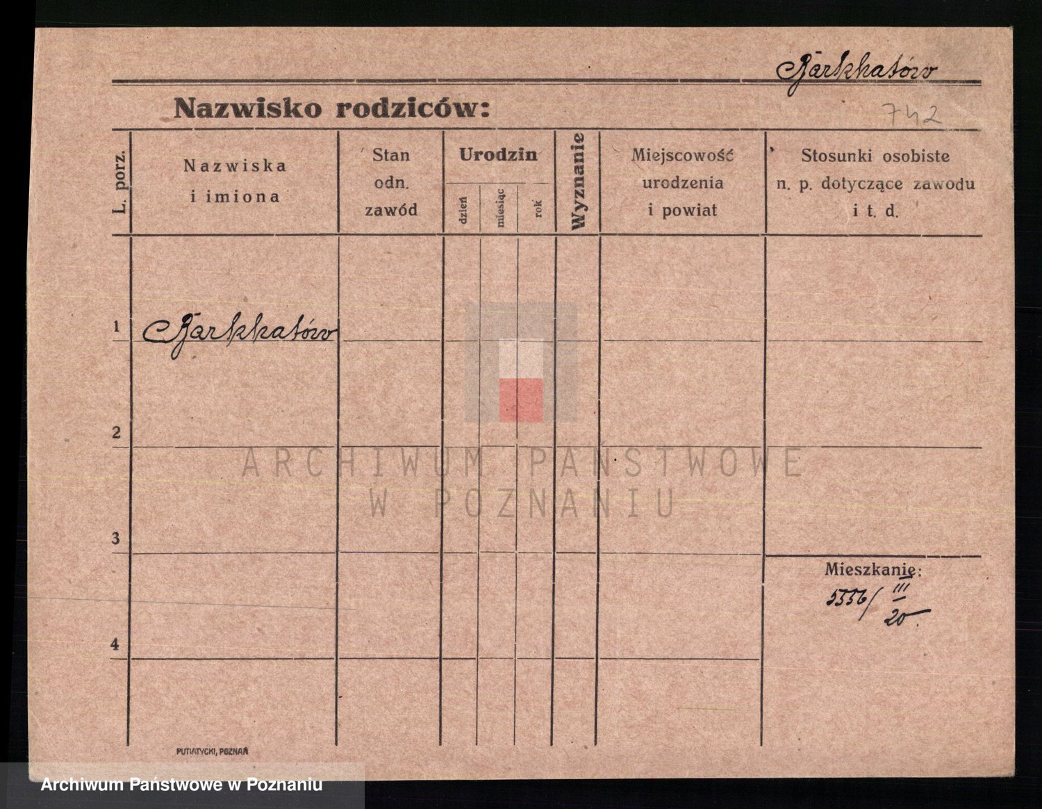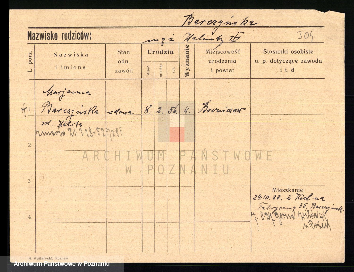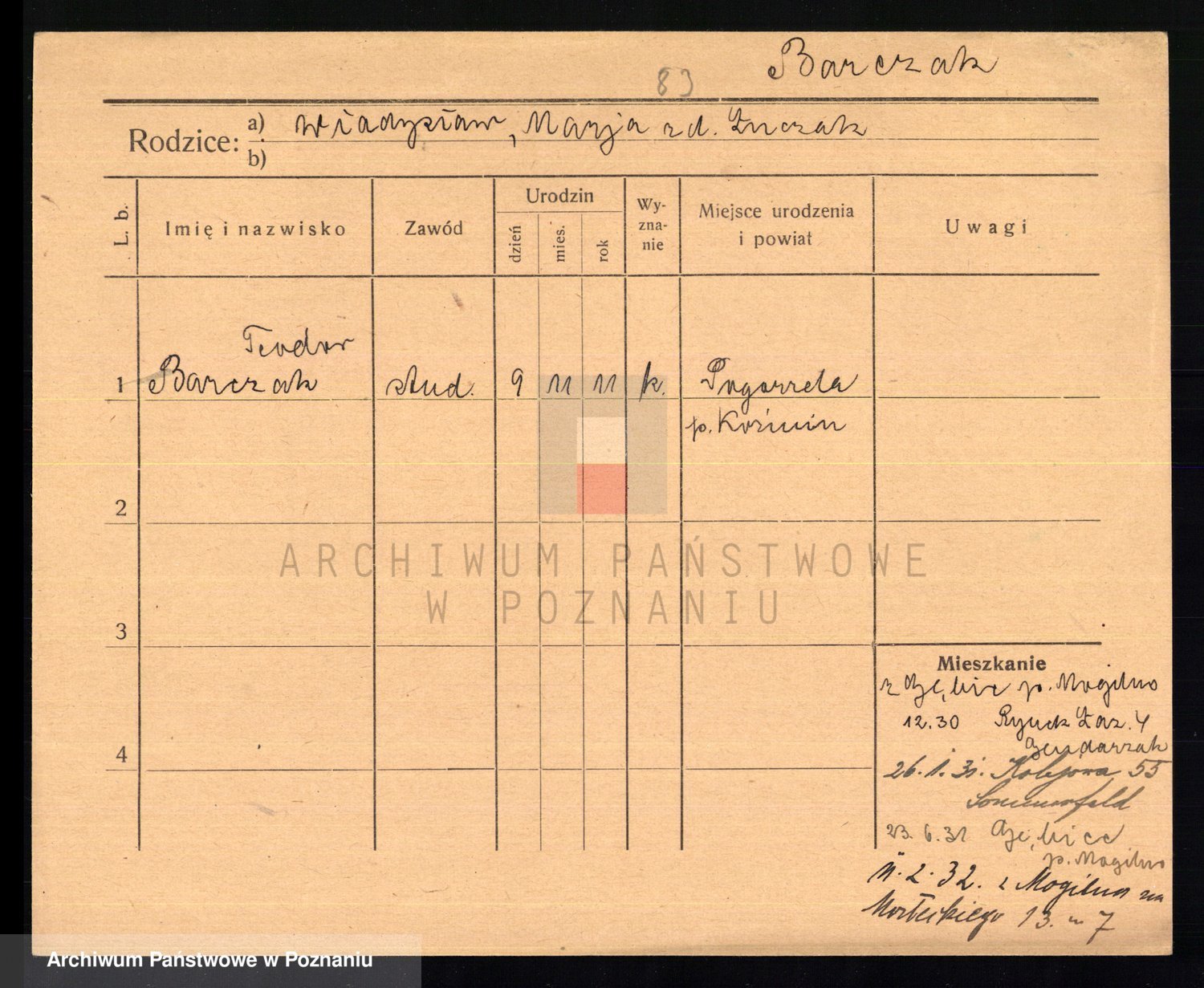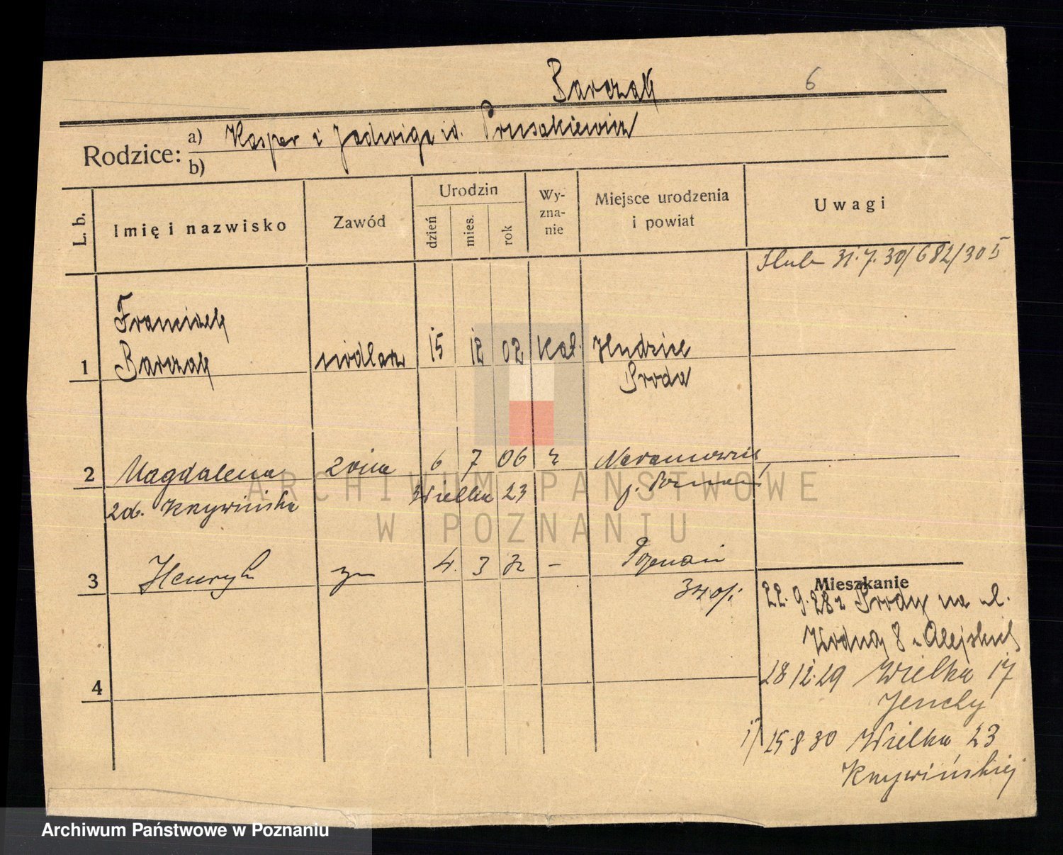 Podgląd karty osobowej dostępny jest po kliknięciu na nazwisko lub ikonkę karty. Można dokonywać powiększenia (ikony na górze) lub przechodzić między kolejnymi skanami (strzałki po bokach).