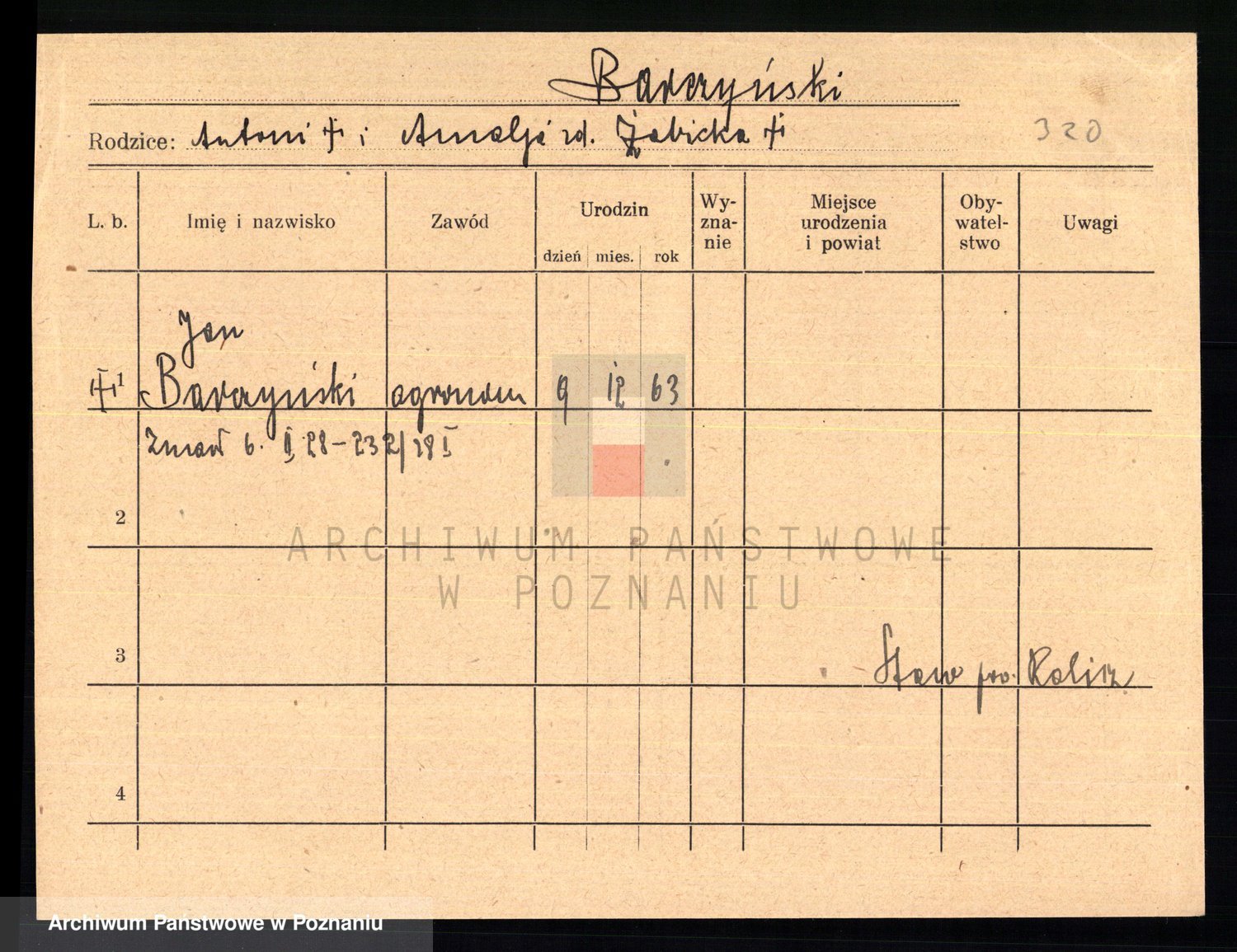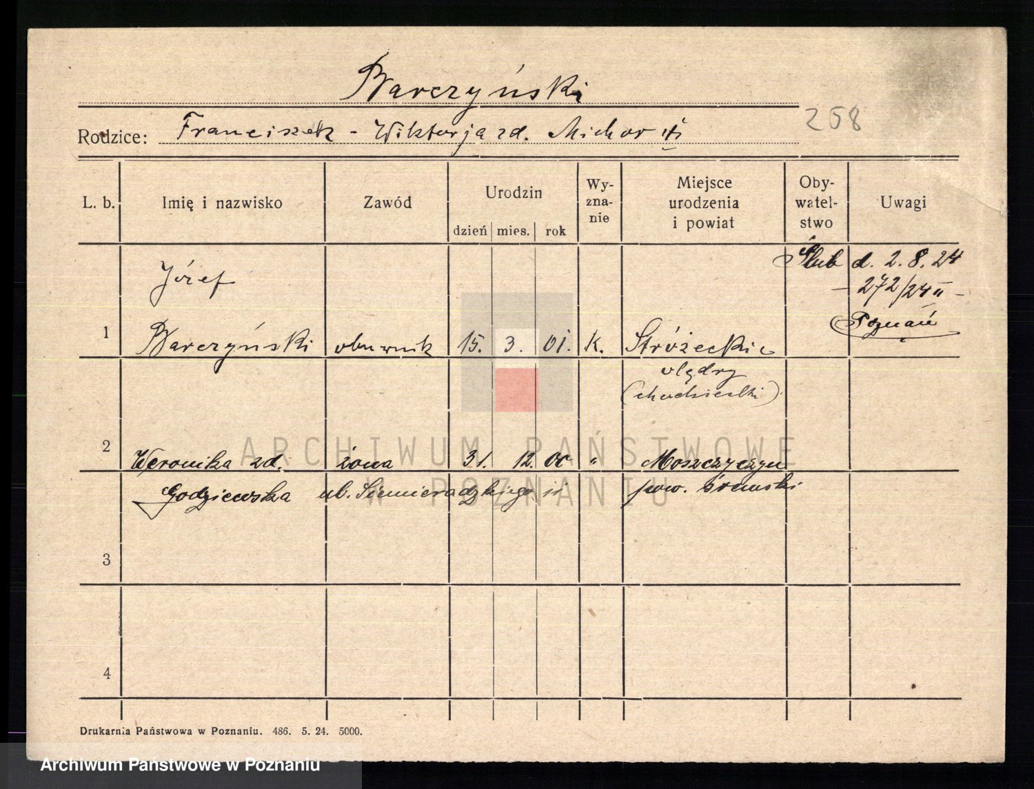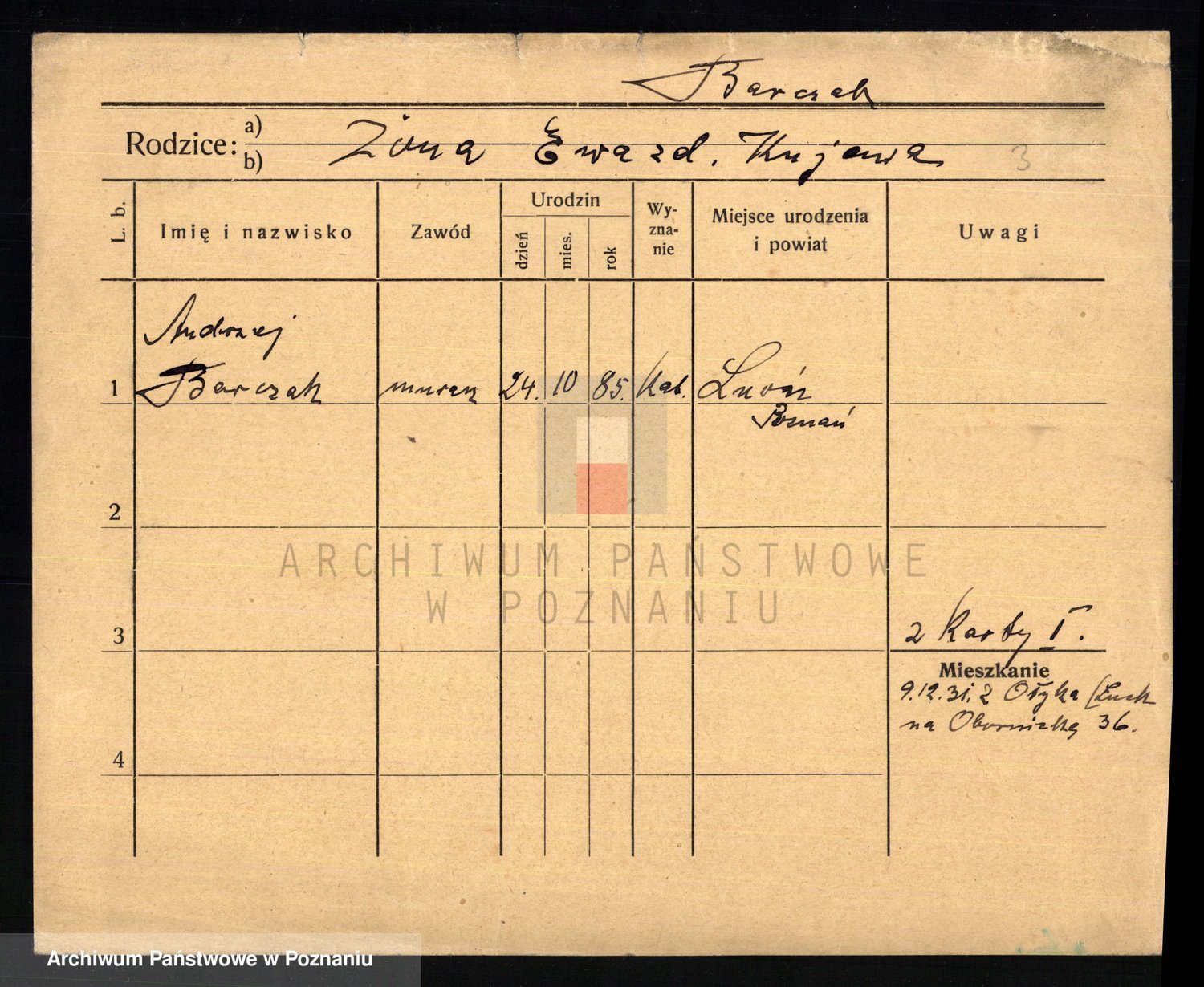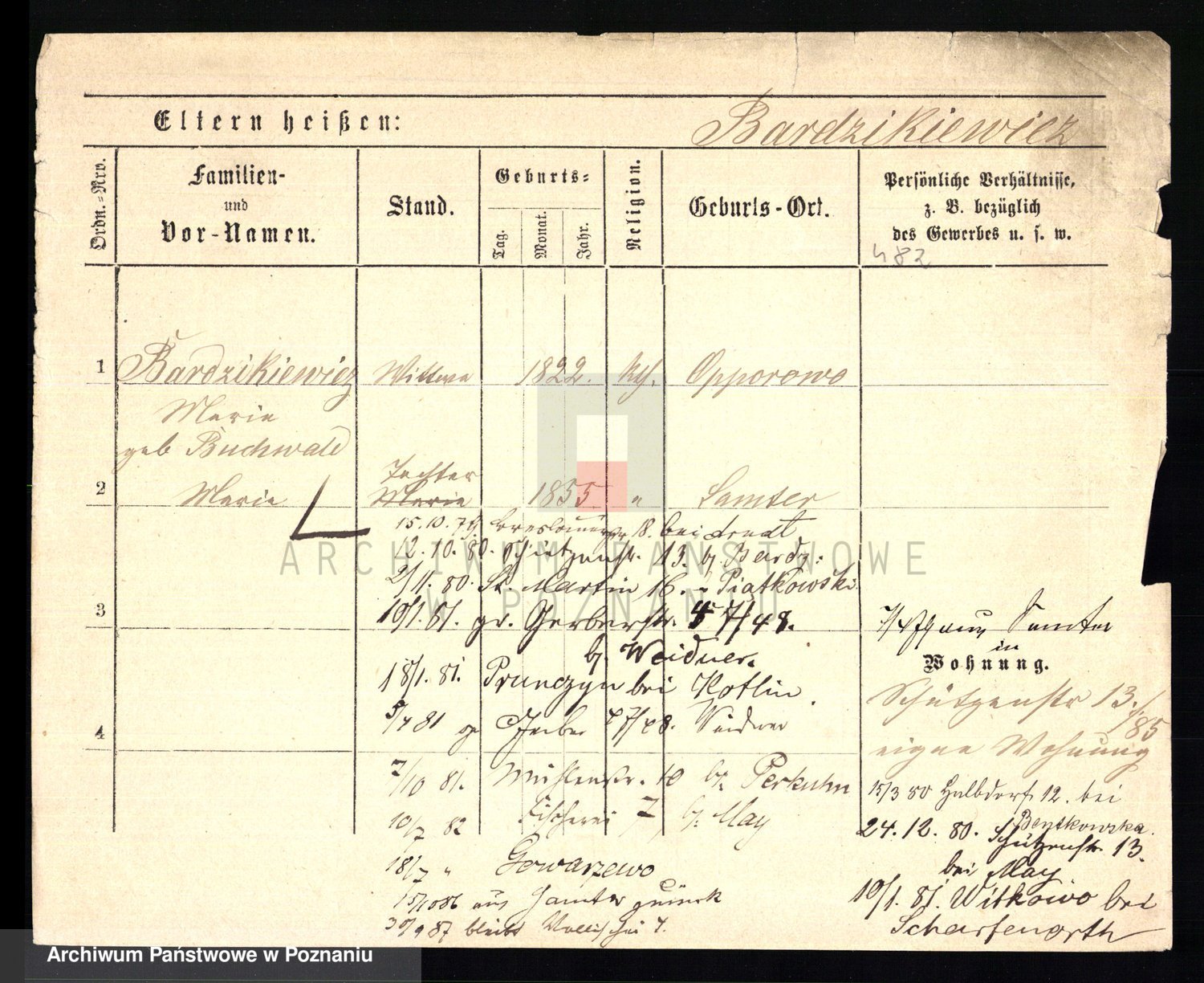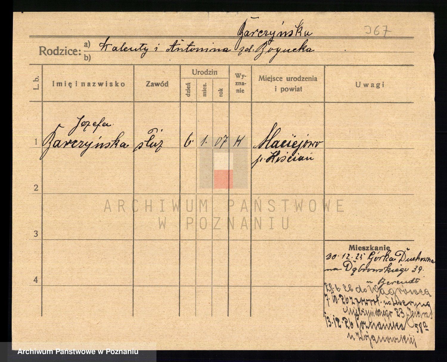 Podgląd karty osobowej dostępny jest po kliknięciu na nazwisko lub ikonkę karty. Można dokonywać powiększenia (ikony na górze) lub przechodzić między kolejnymi skanami (strzałki po bokach).