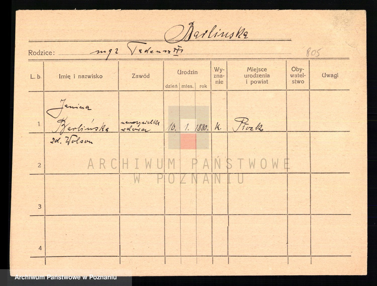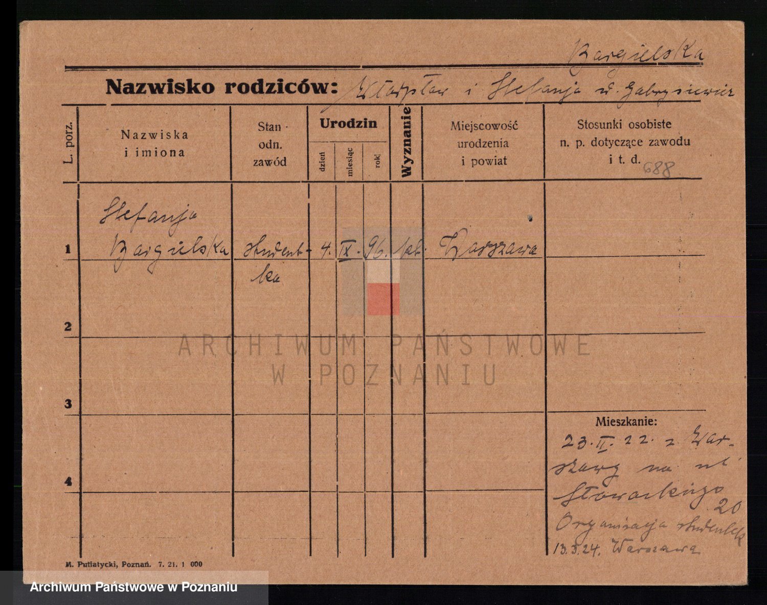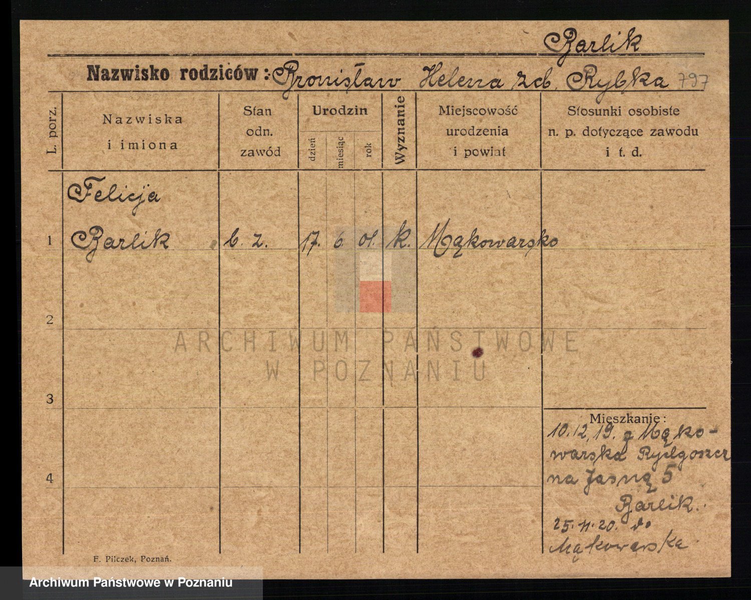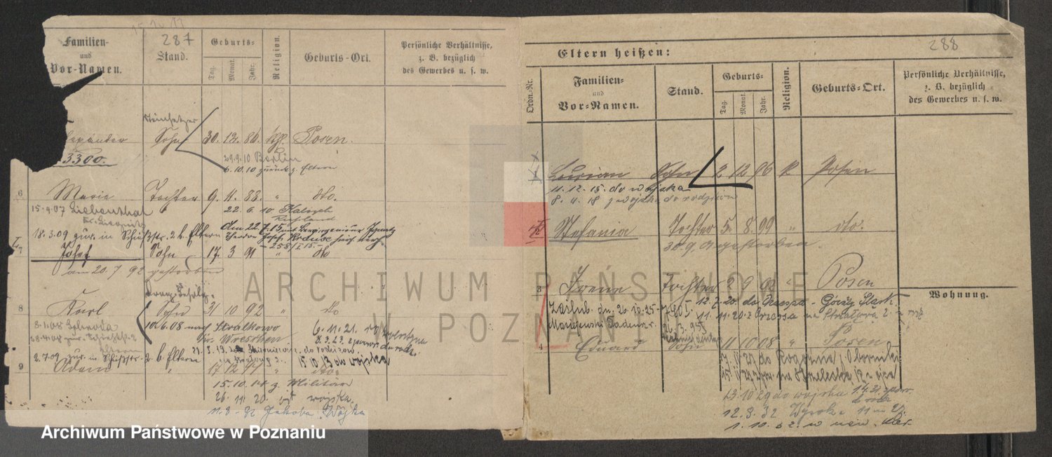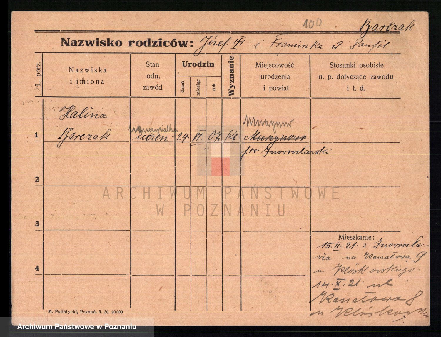 Podgląd karty osobowej dostępny jest po kliknięciu na nazwisko lub ikonkę karty. Można dokonywać powiększenia (ikony na górze) lub przechodzić między kolejnymi skanami (strzałki po bokach).