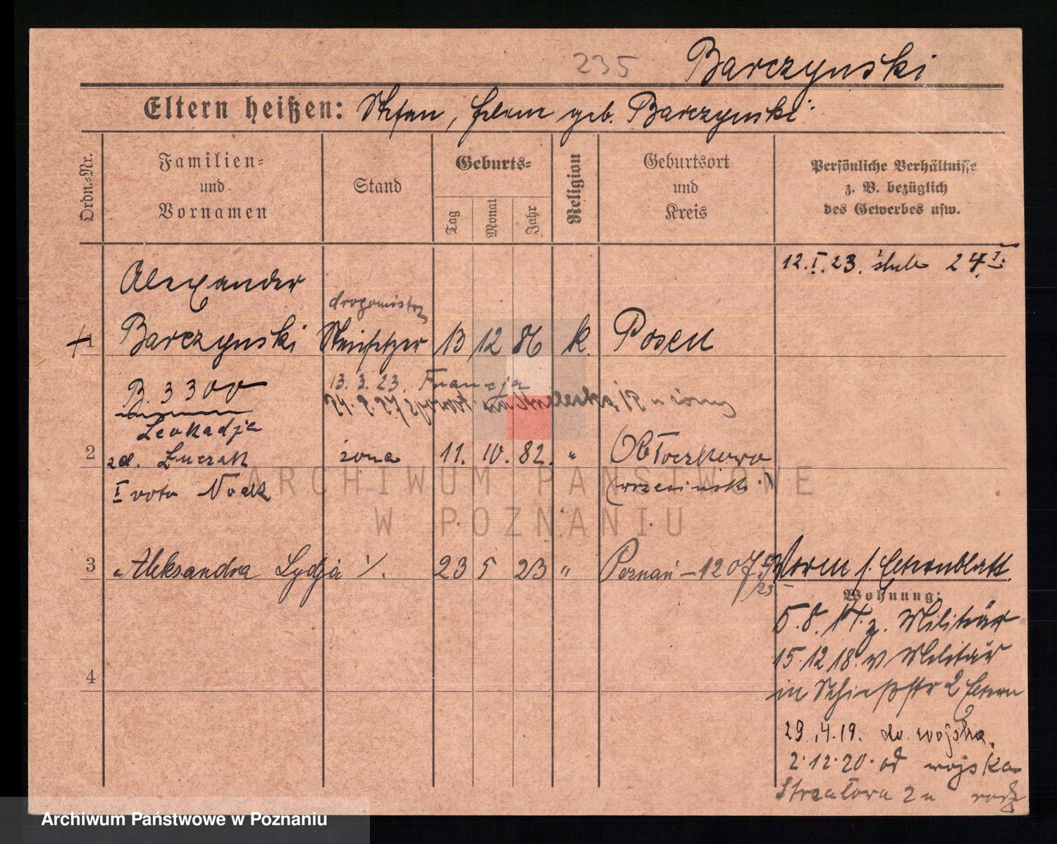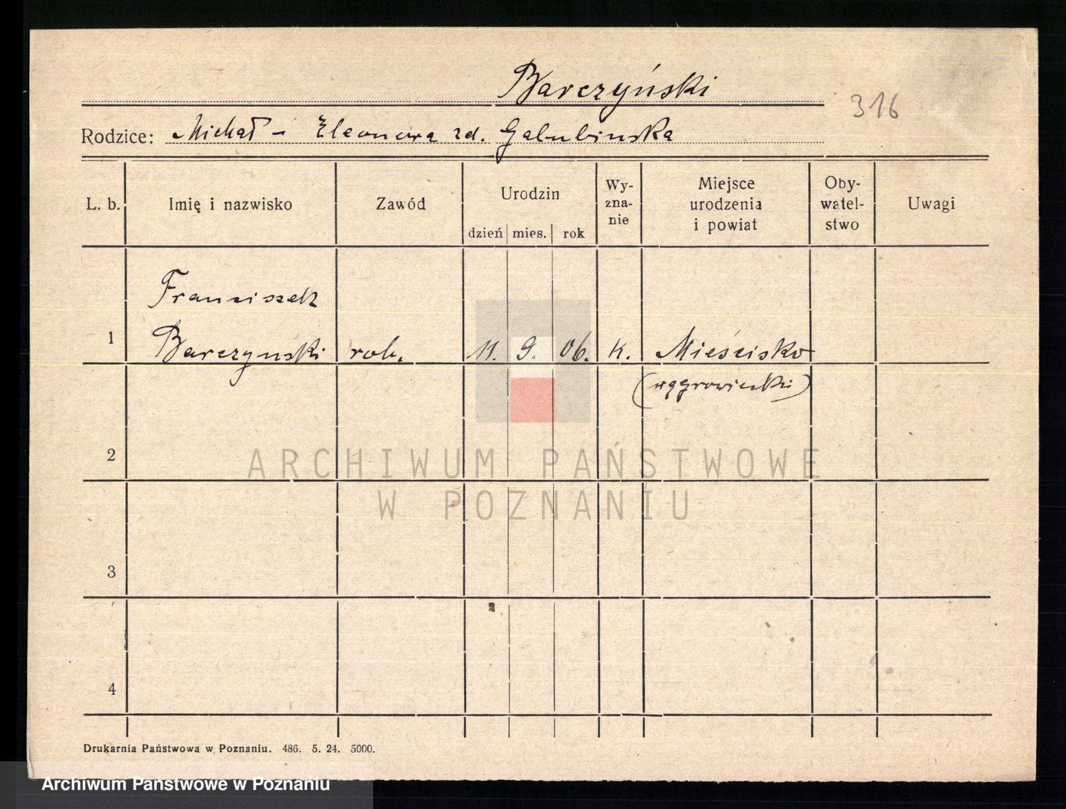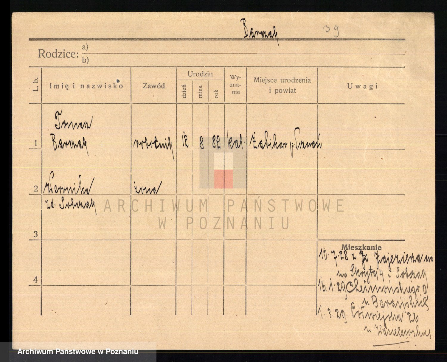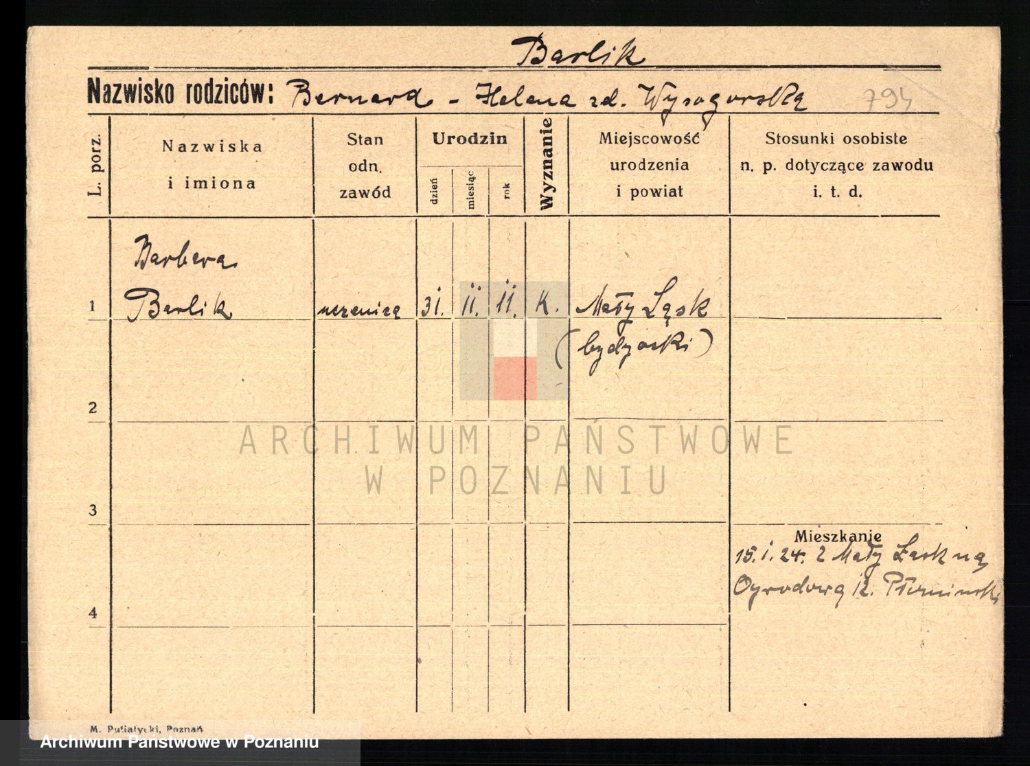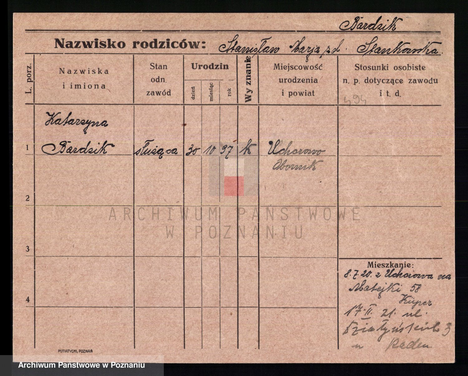 Podgląd karty osobowej dostępny jest po kliknięciu na nazwisko lub ikonkę karty. Można dokonywać powiększenia (ikony na górze) lub przechodzić między kolejnymi skanami (strzałki po bokach).