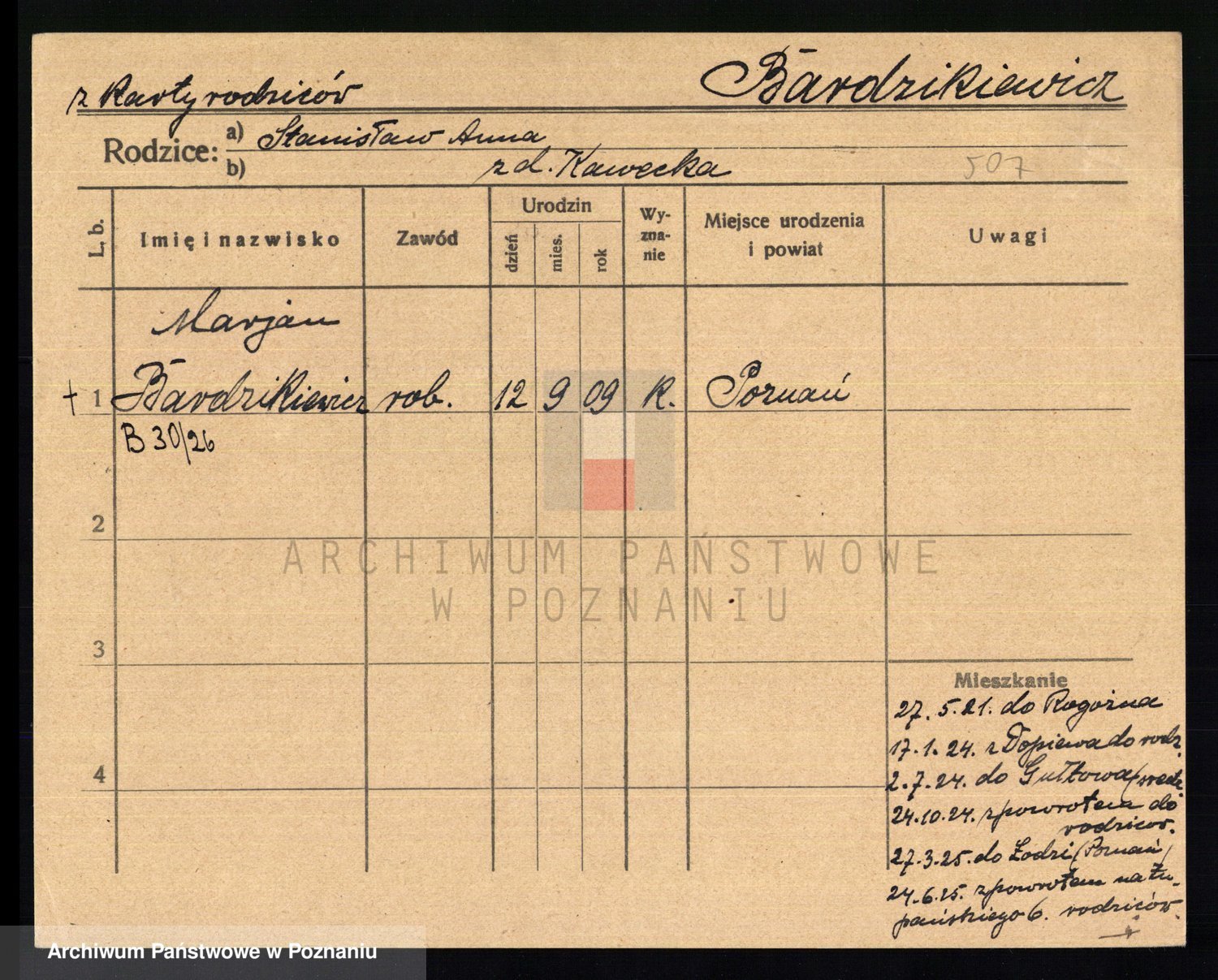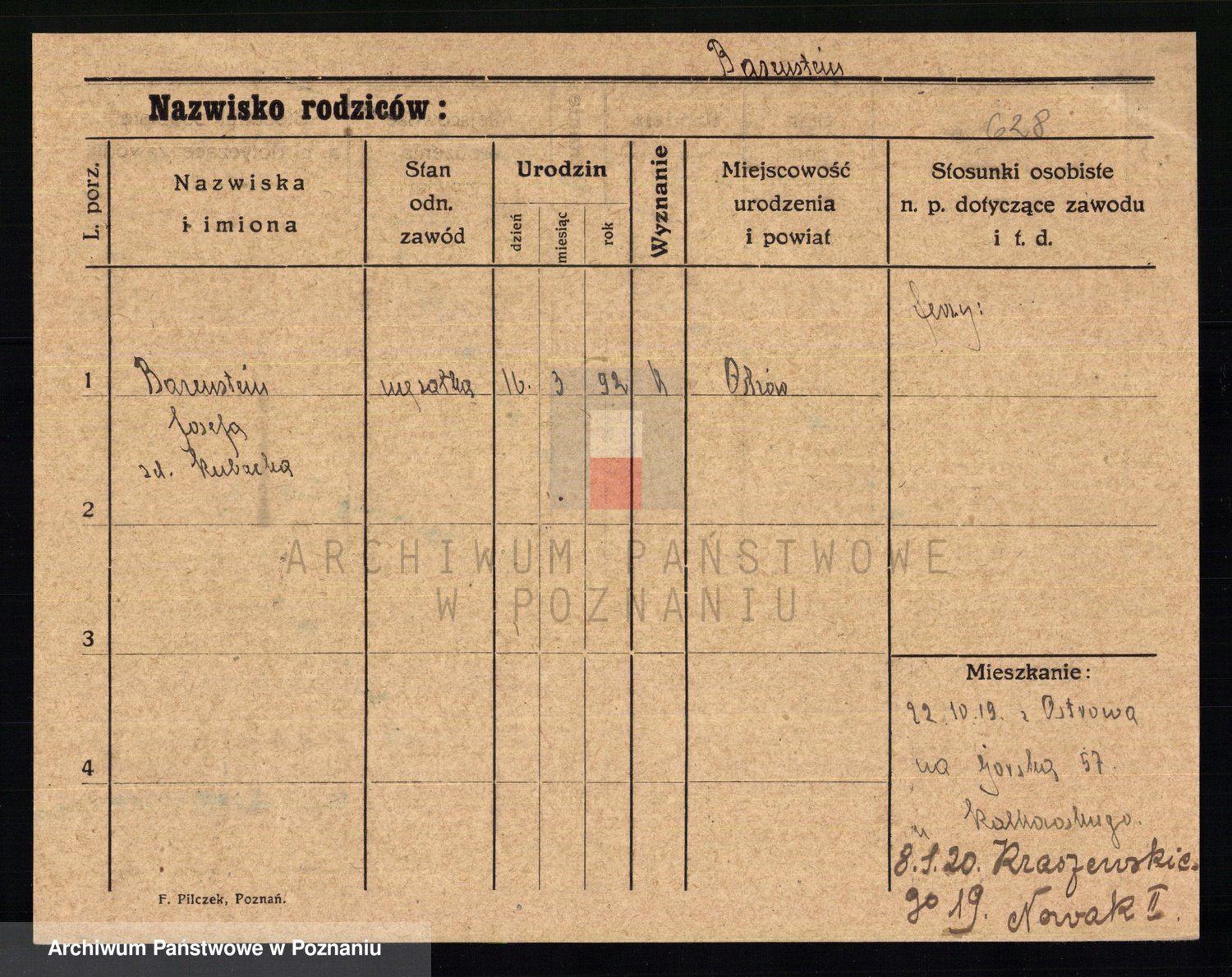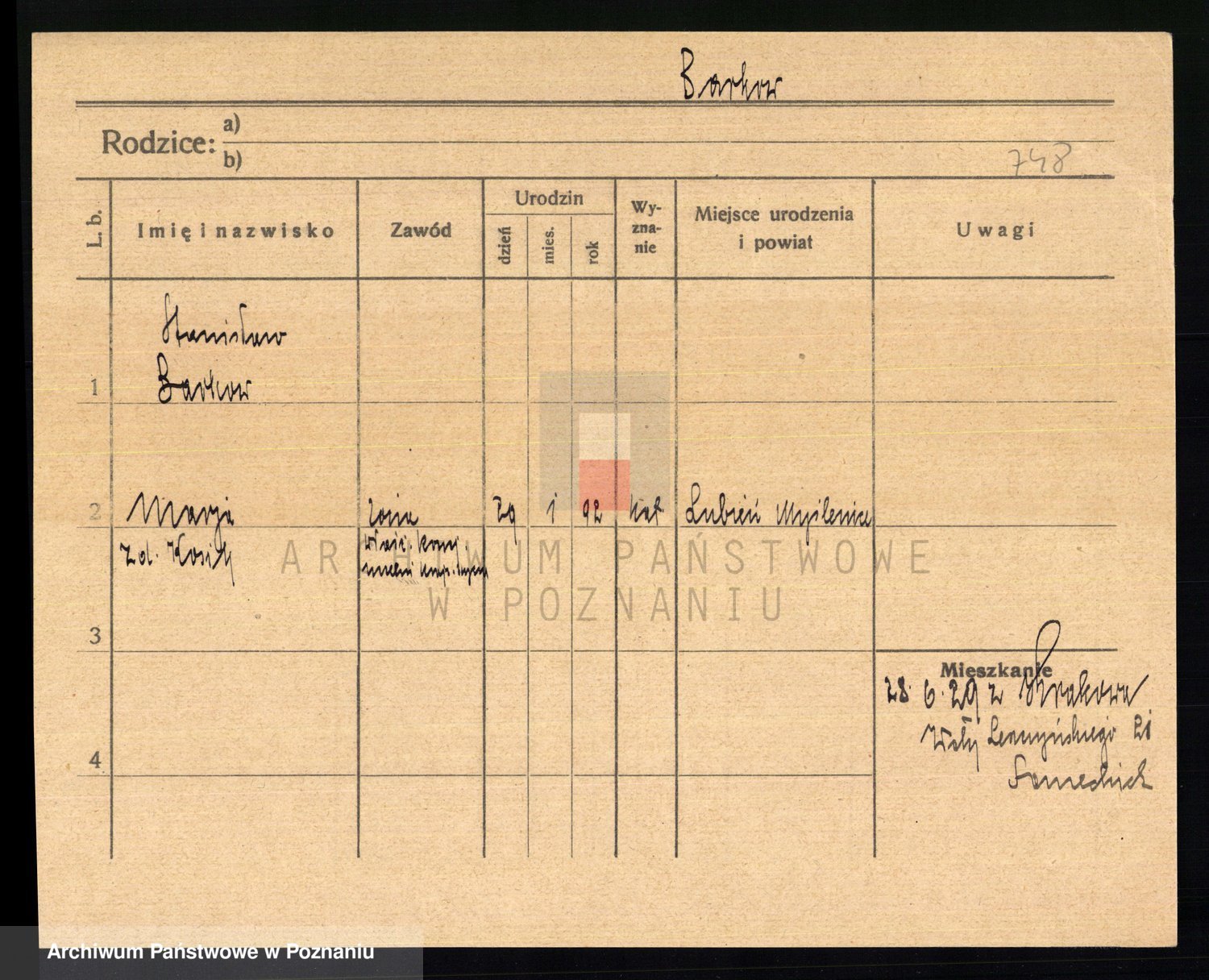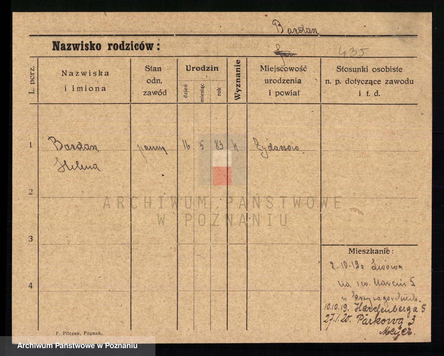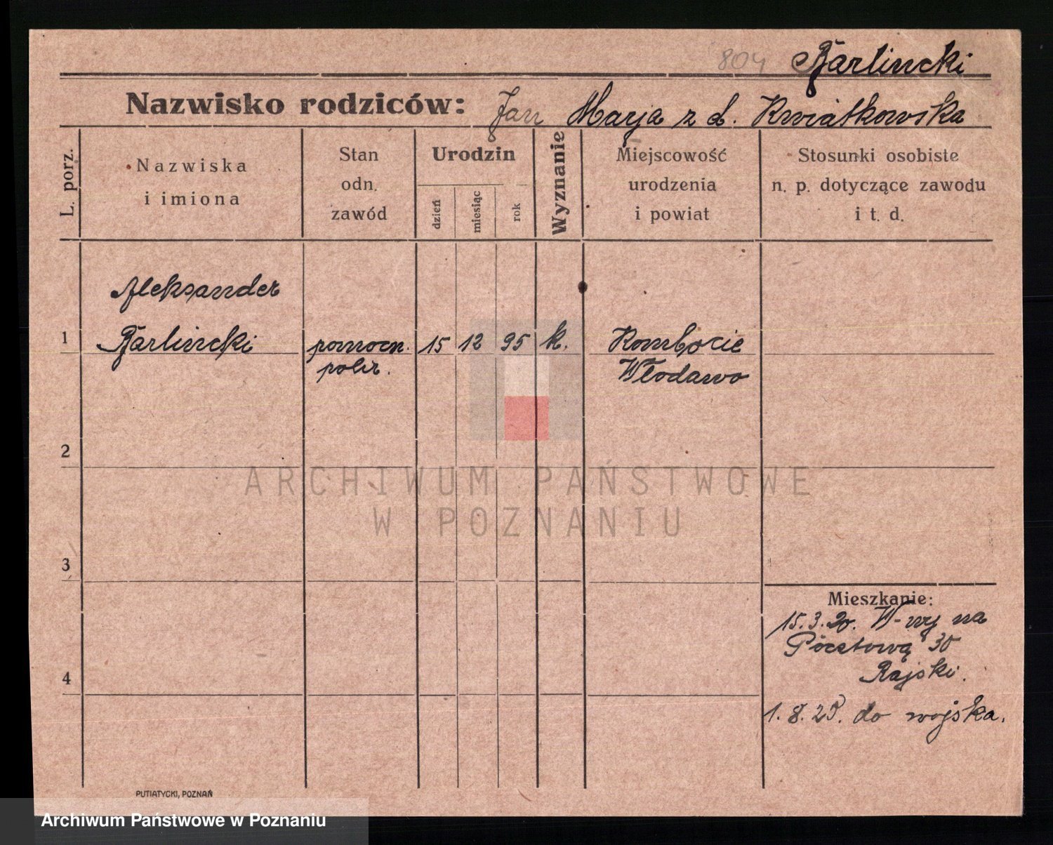 Podgląd karty osobowej dostępny jest po kliknięciu na nazwisko lub ikonkę karty. Można dokonywać powiększenia (ikony na górze) lub przechodzić między kolejnymi skanami (strzałki po bokach).