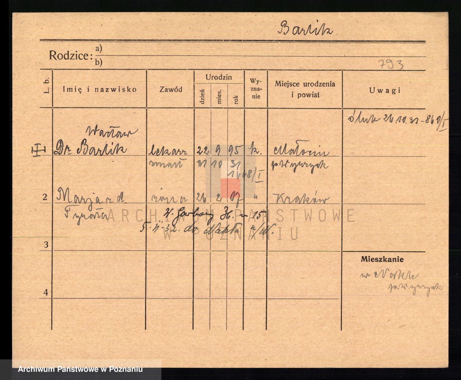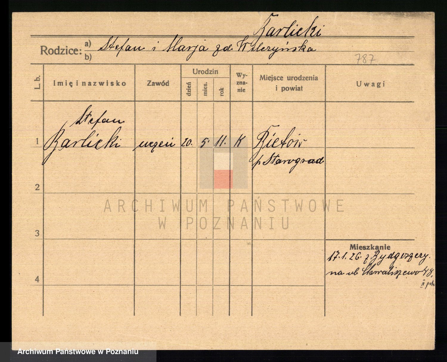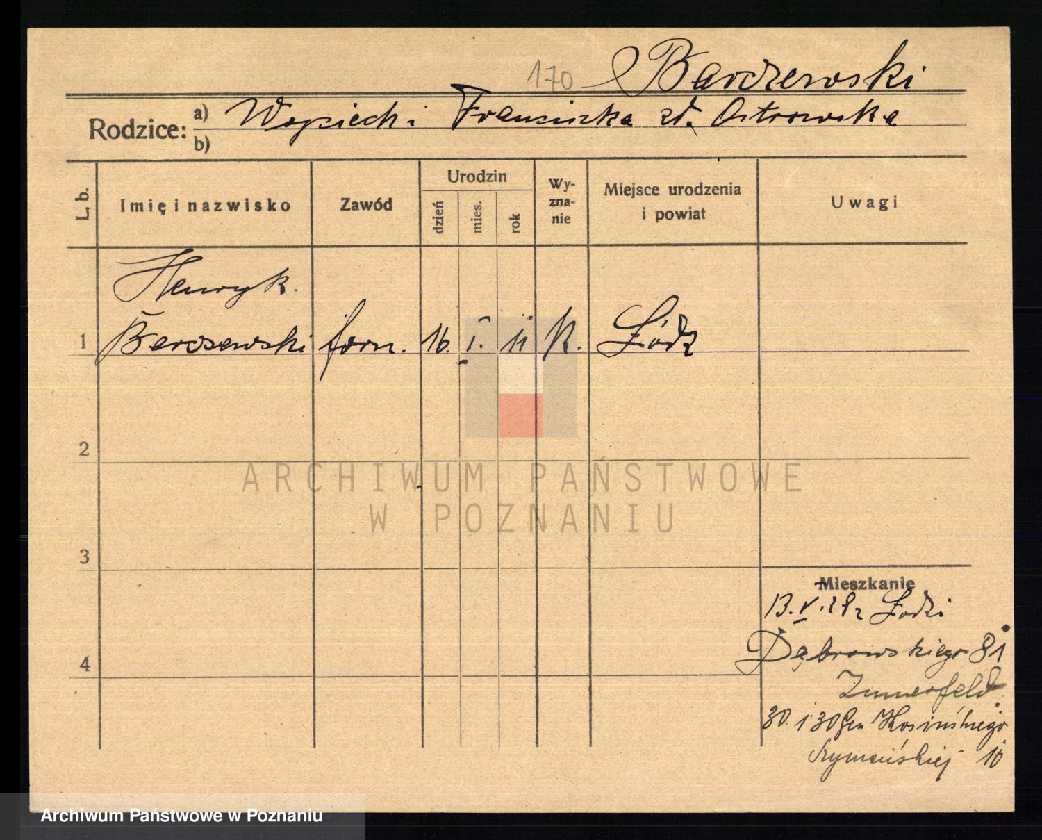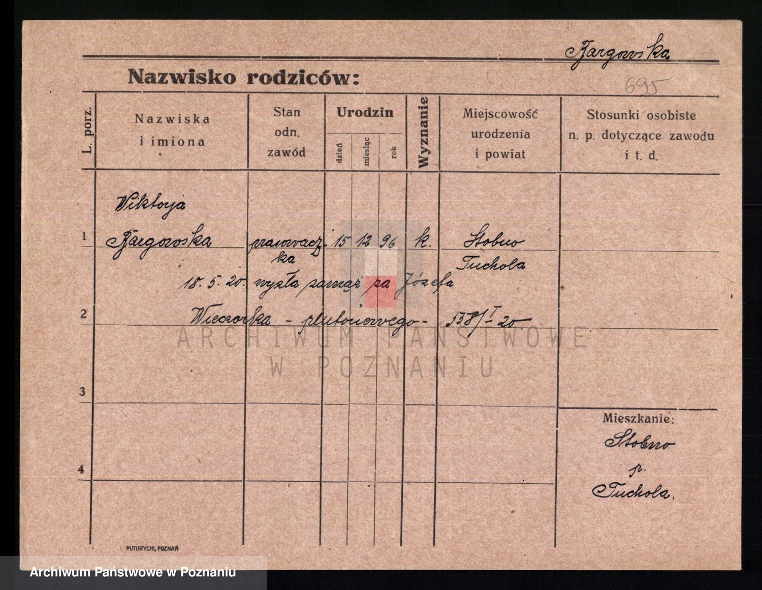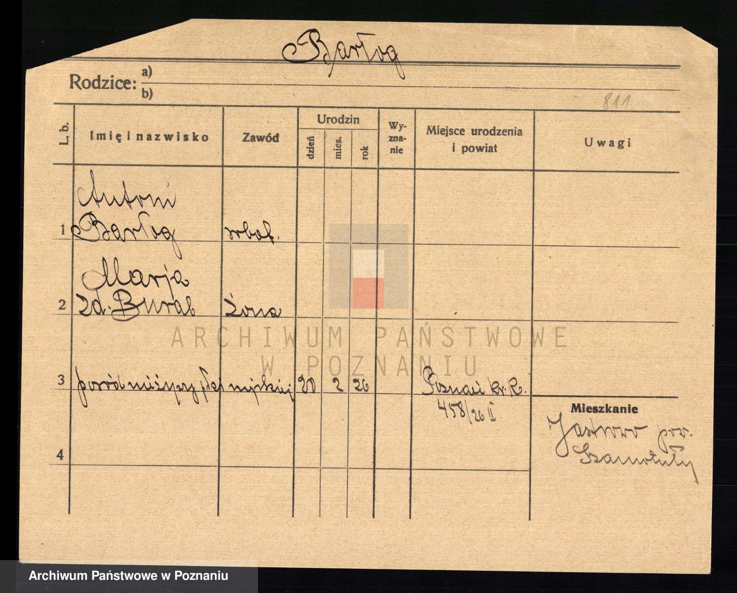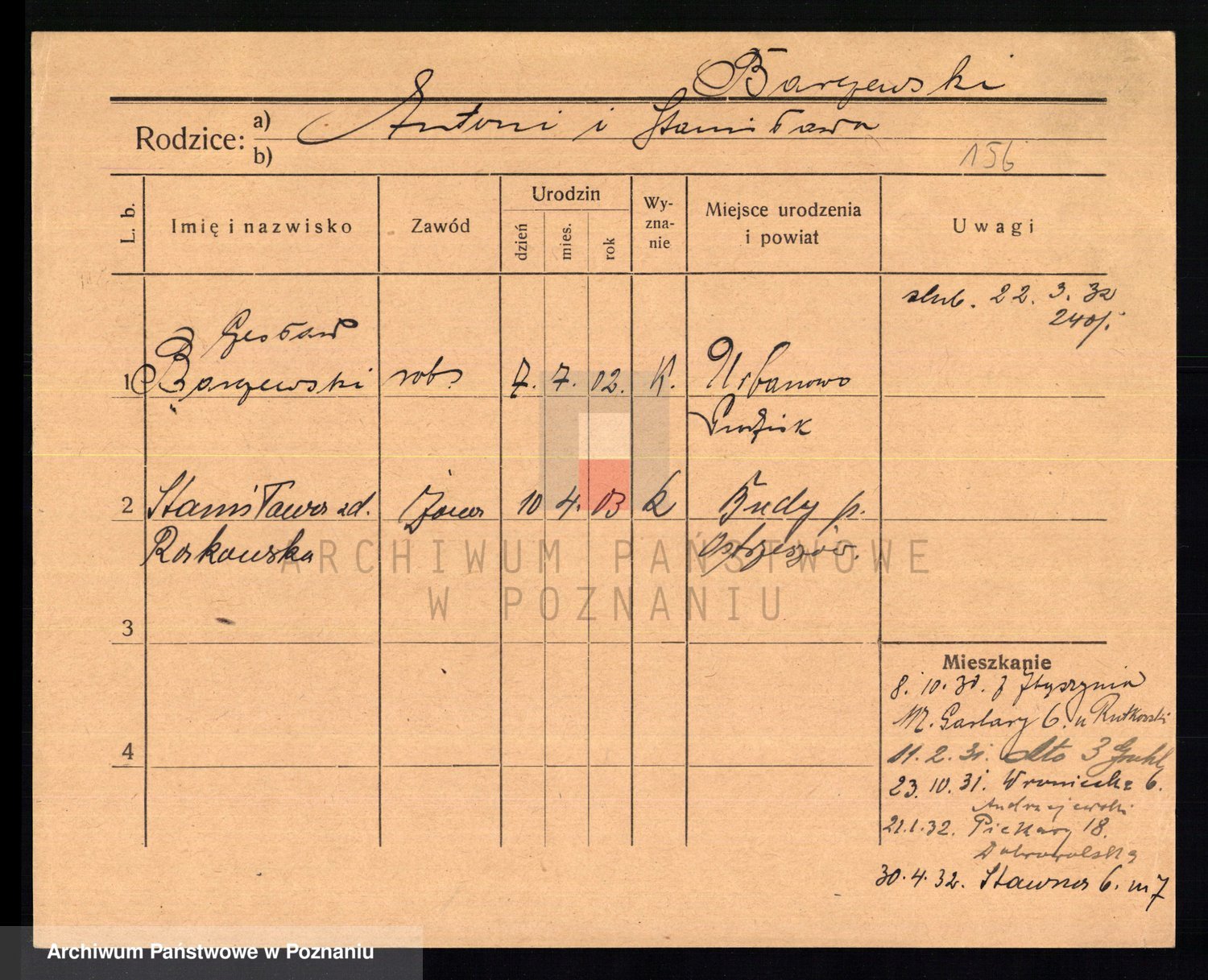 Podgląd karty osobowej dostępny jest po kliknięciu na nazwisko lub ikonkę karty. Można dokonywać powiększenia (ikony na górze) lub przechodzić między kolejnymi skanami (strzałki po bokach).