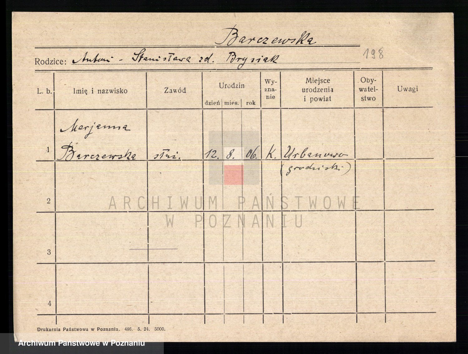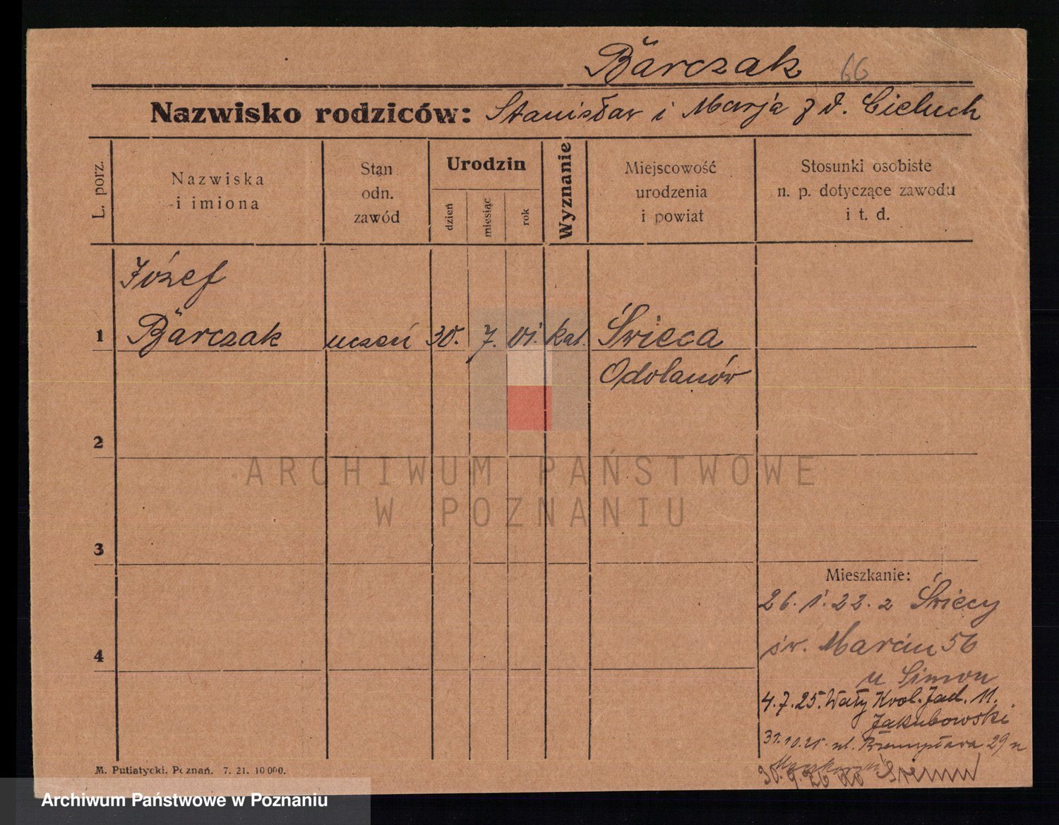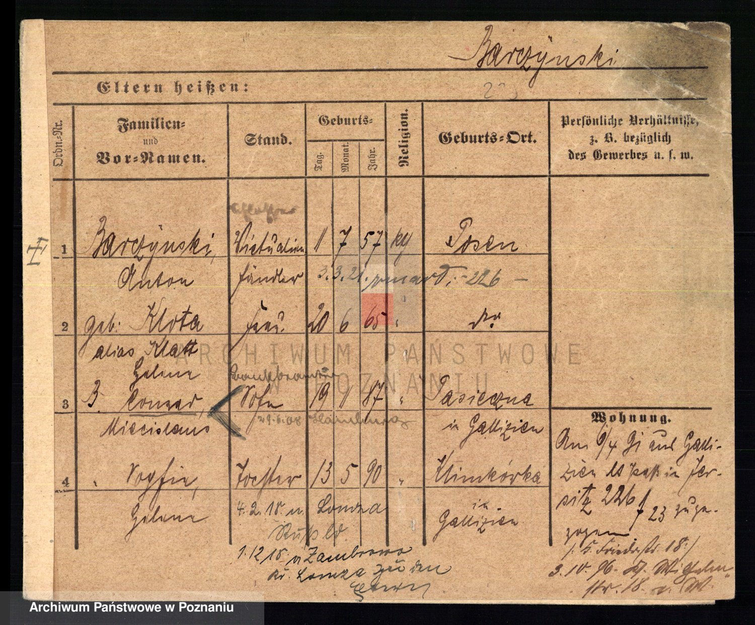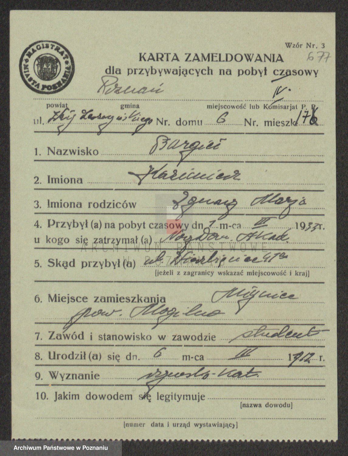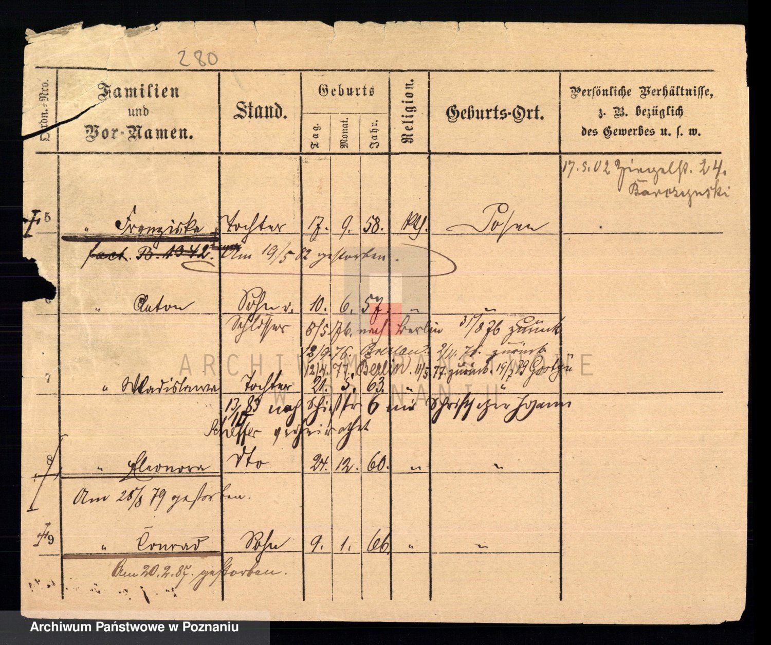 Podgląd karty osobowej dostępny jest po kliknięciu na nazwisko lub ikonkę karty. Można dokonywać powiększenia (ikony na górze) lub przechodzić między kolejnymi skanami (strzałki po bokach).