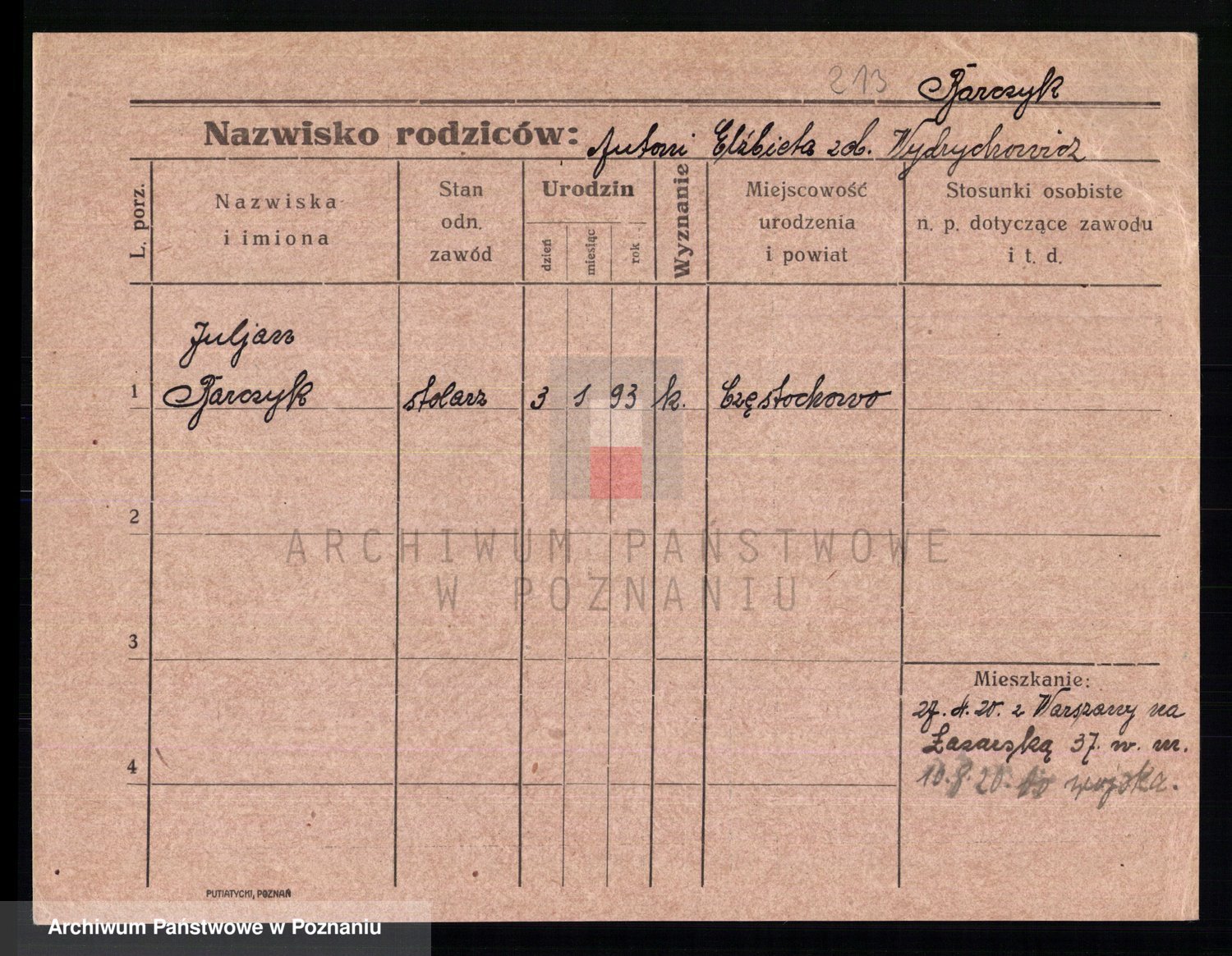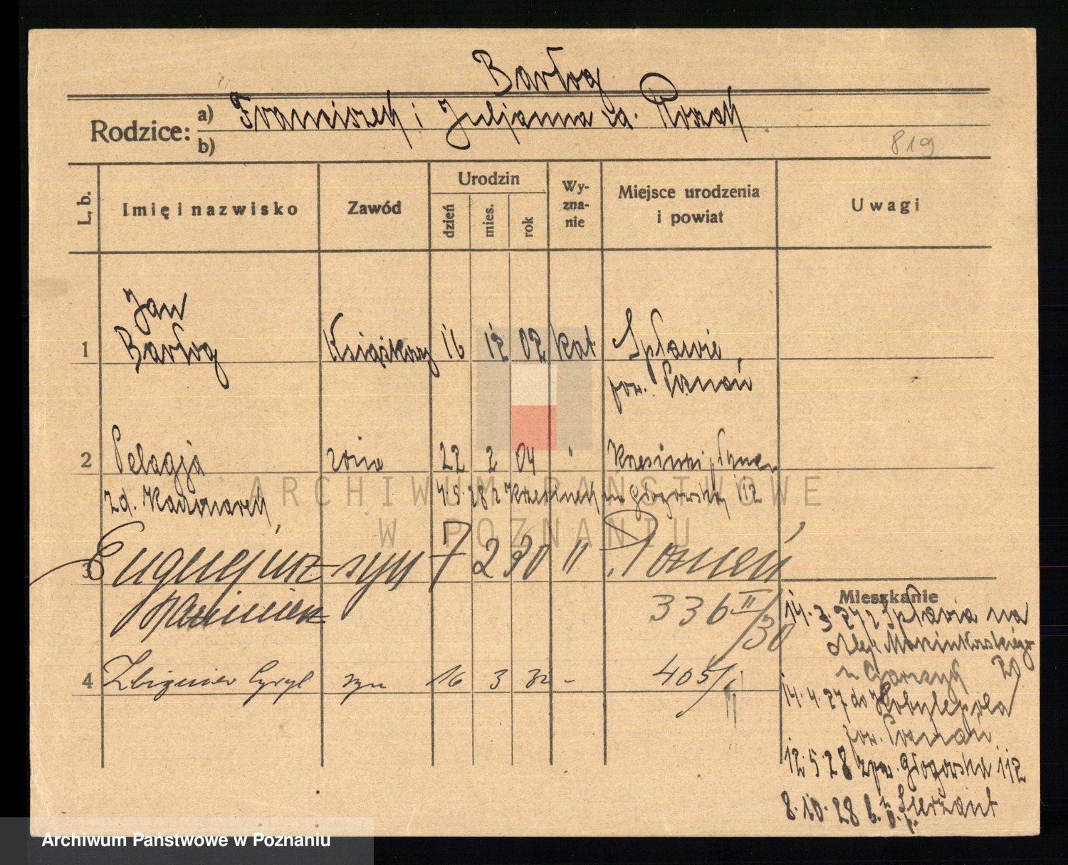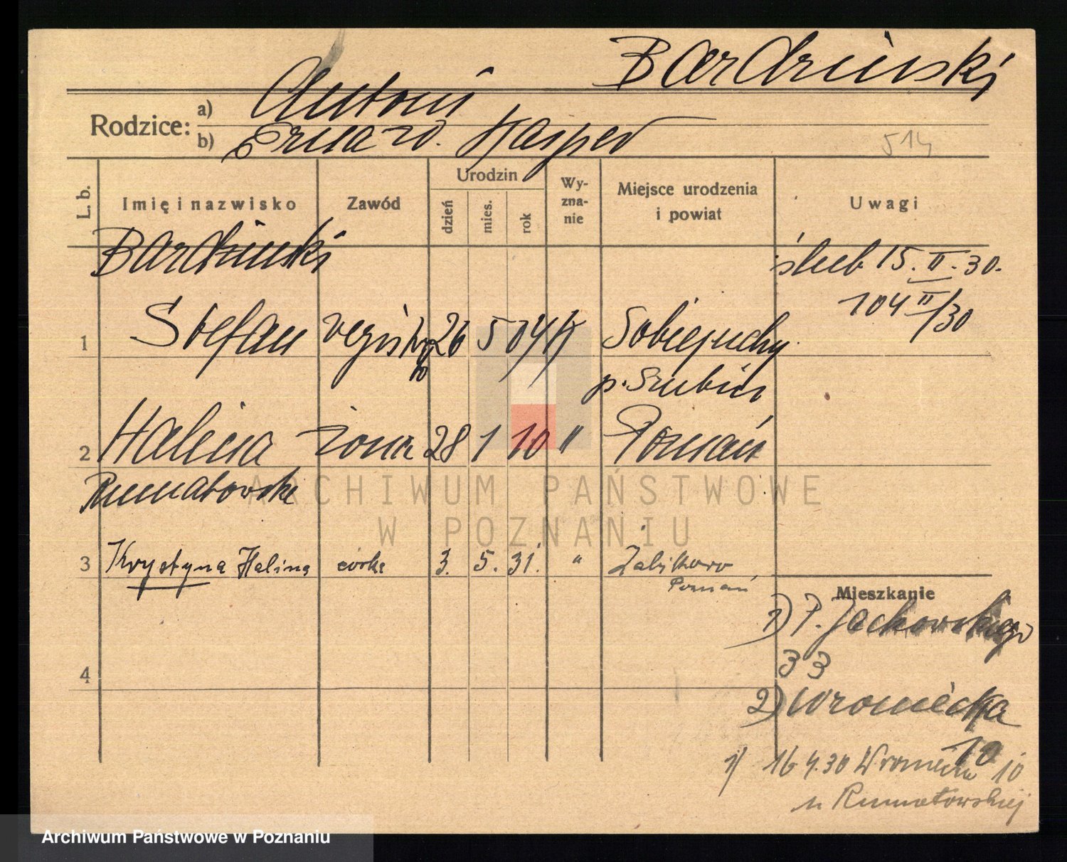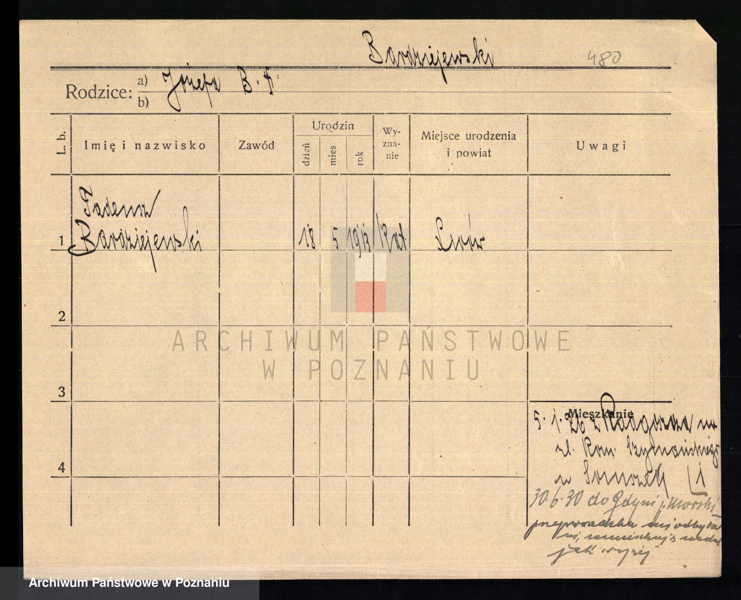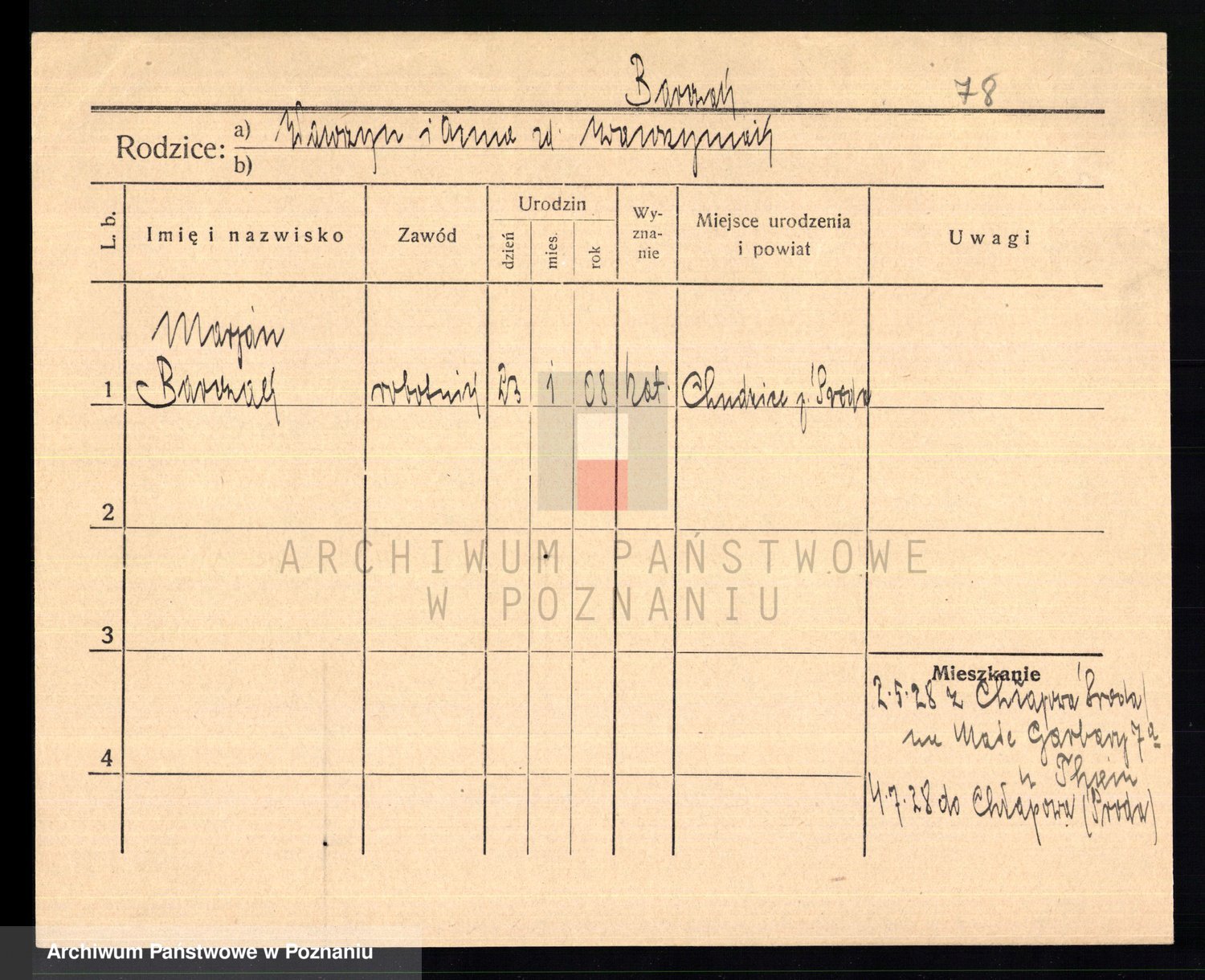 Podgląd karty osobowej dostępny jest po kliknięciu na nazwisko lub ikonkę karty. Można dokonywać powiększenia (ikony na górze) lub przechodzić między kolejnymi skanami (strzałki po bokach).