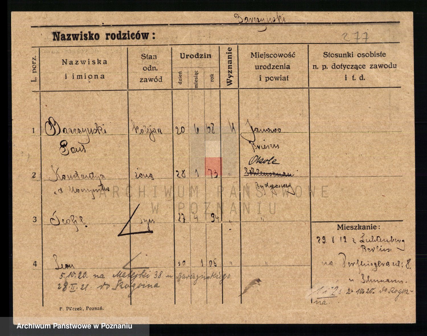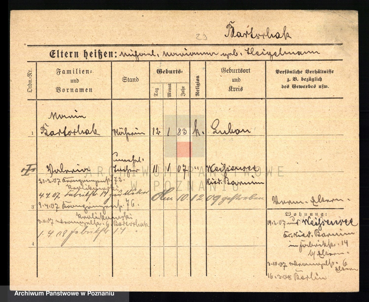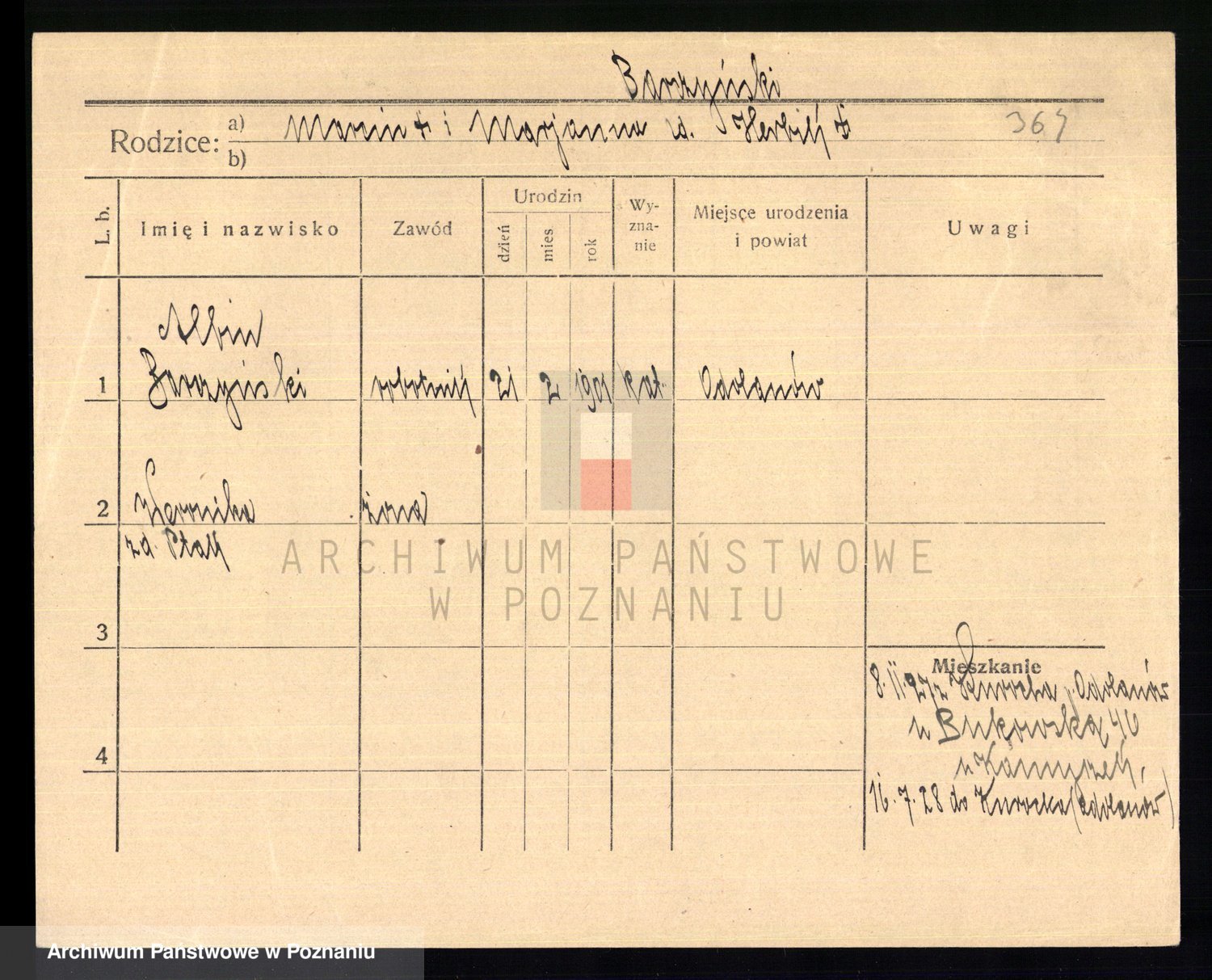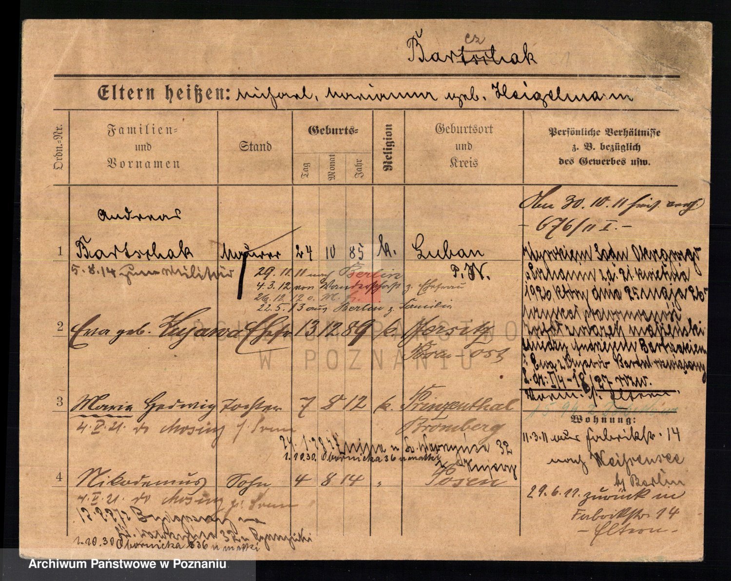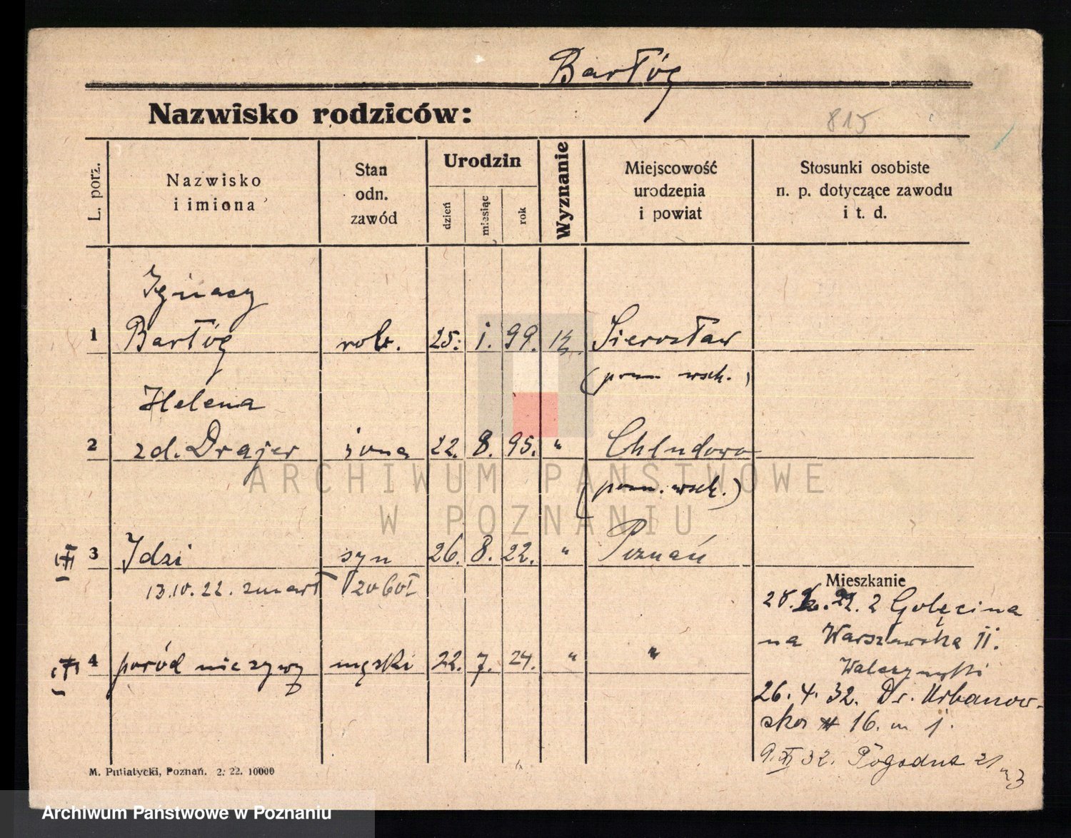 Podgląd karty osobowej dostępny jest po kliknięciu na nazwisko lub ikonkę karty. Można dokonywać powiększenia (ikony na górze) lub przechodzić między kolejnymi skanami (strzałki po bokach).