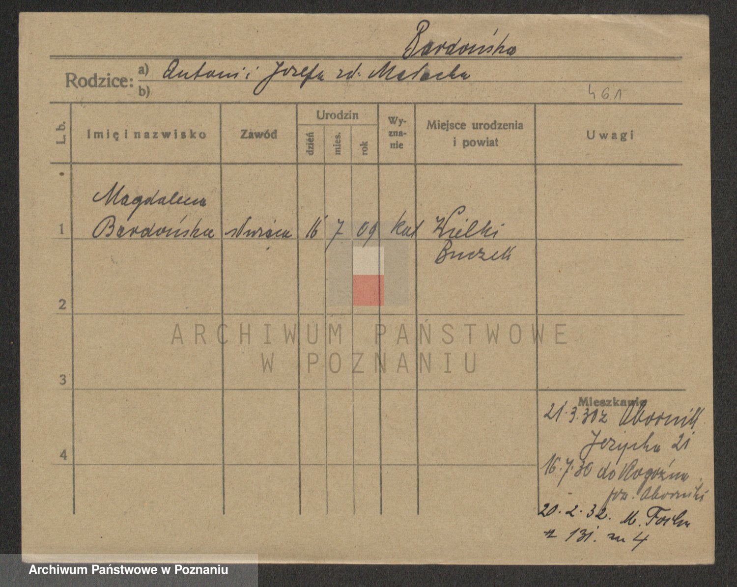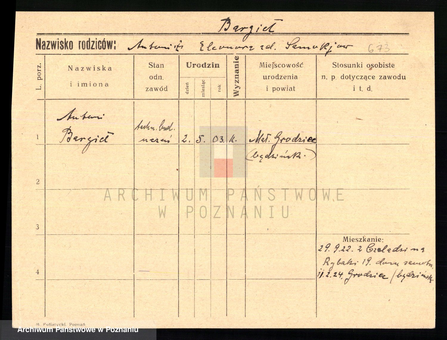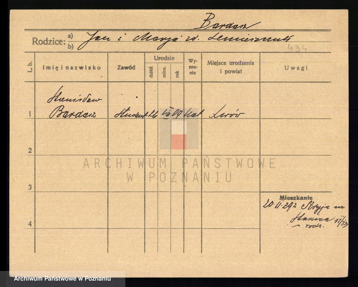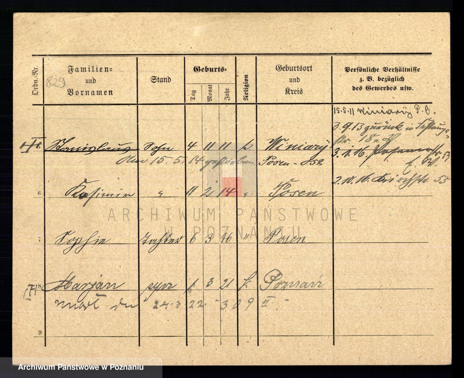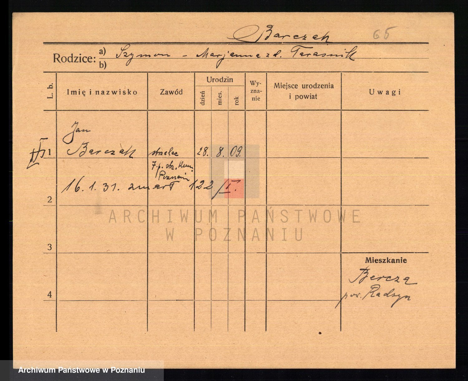 Podgląd karty osobowej dostępny jest po kliknięciu na nazwisko lub ikonkę karty. Można dokonywać powiększenia (ikony na górze) lub przechodzić między kolejnymi skanami (strzałki po bokach).