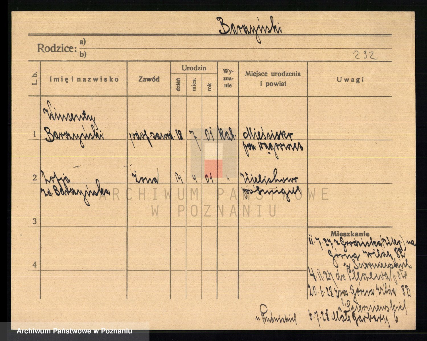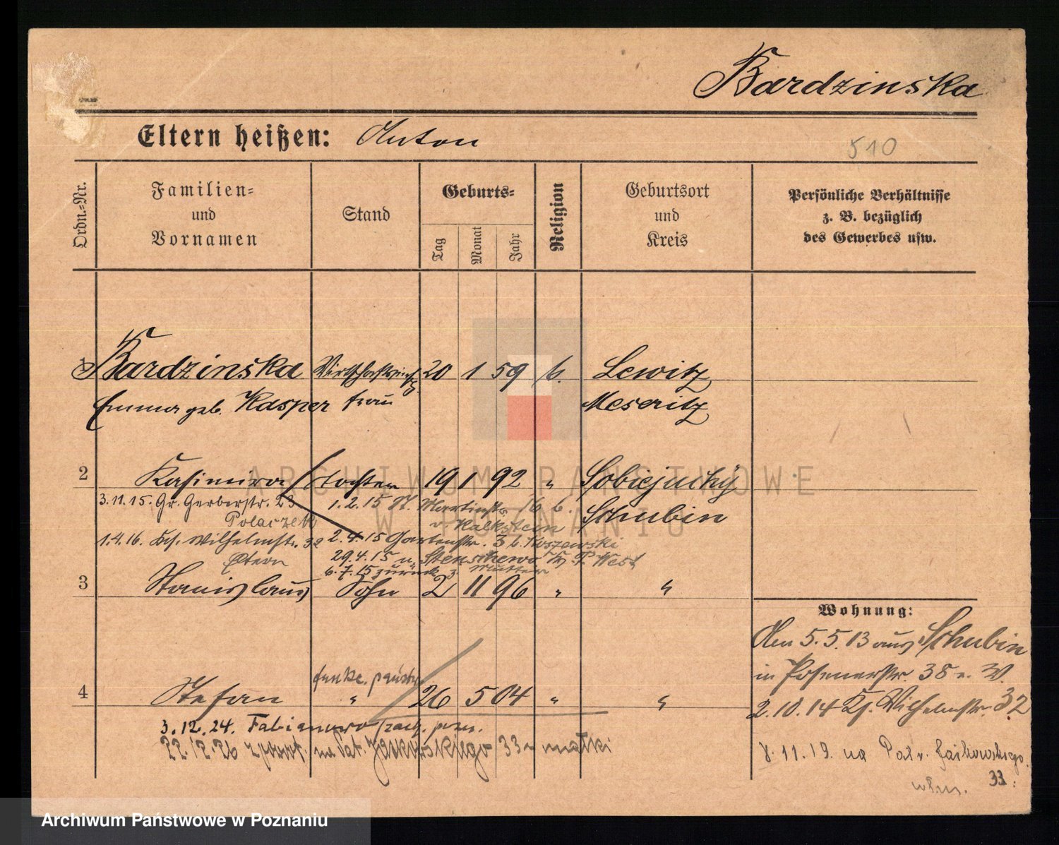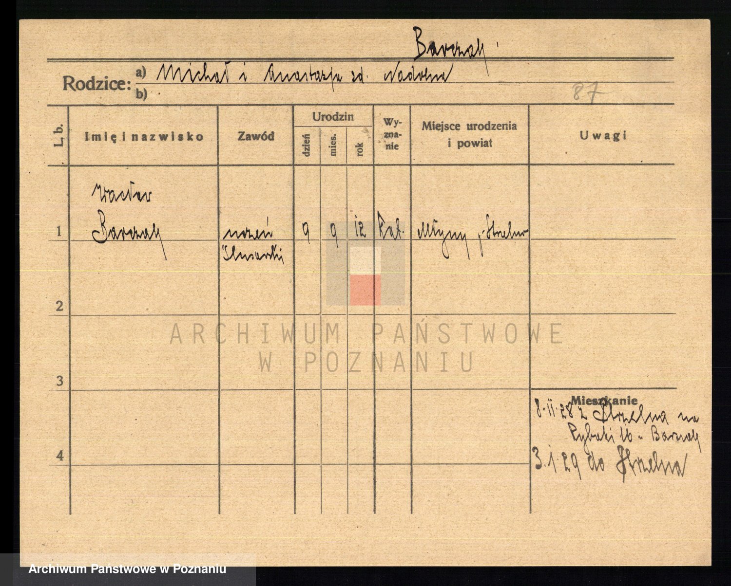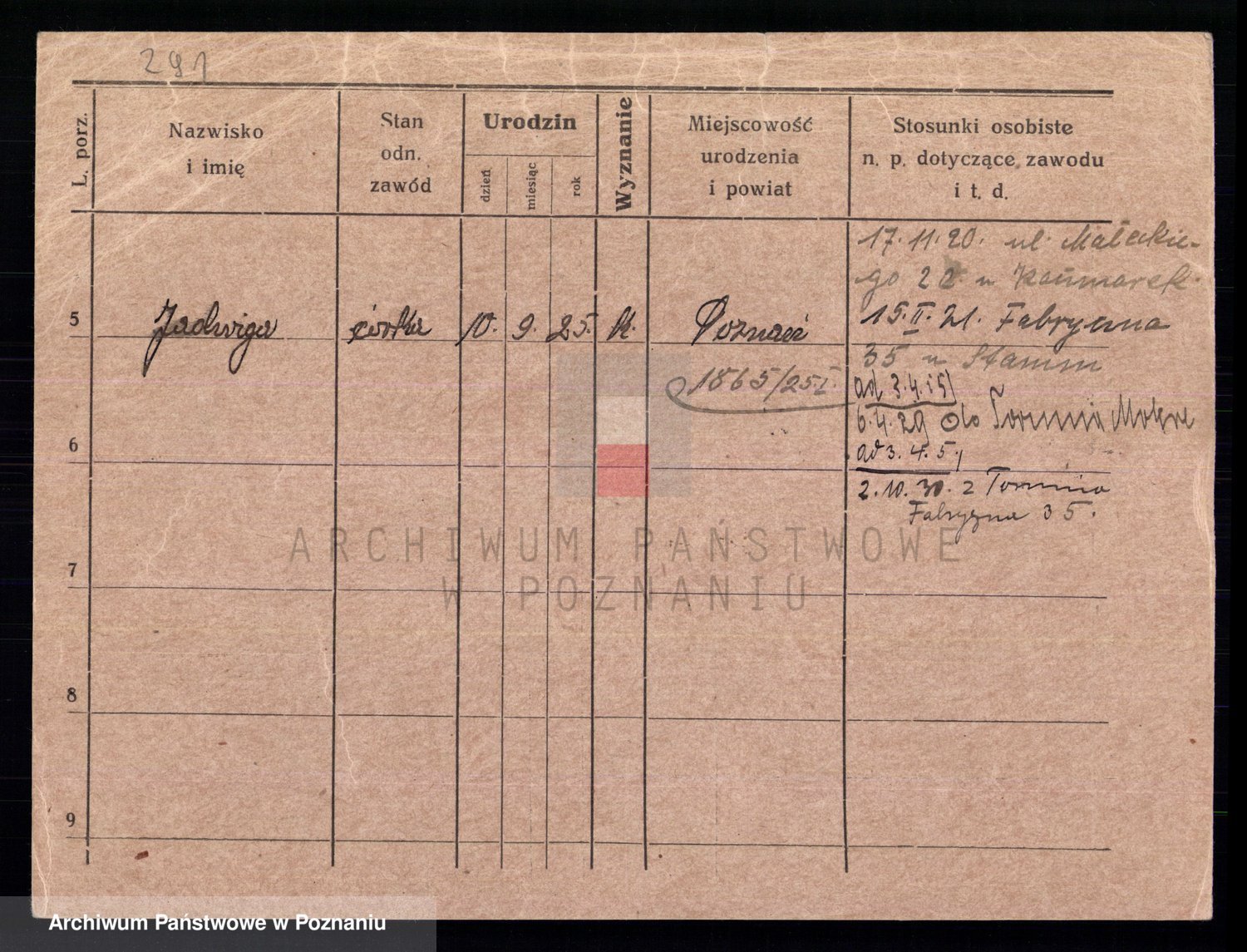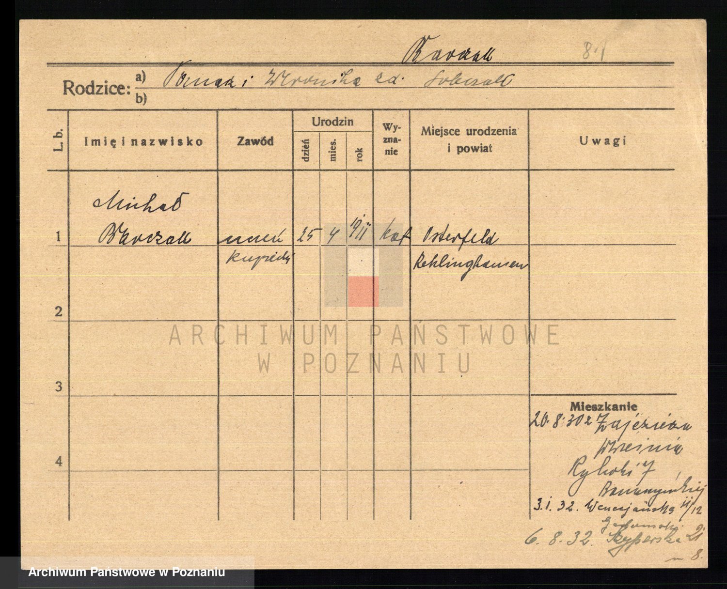 Podgląd karty osobowej dostępny jest po kliknięciu na nazwisko lub ikonkę karty. Można dokonywać powiększenia (ikony na górze) lub przechodzić między kolejnymi skanami (strzałki po bokach).