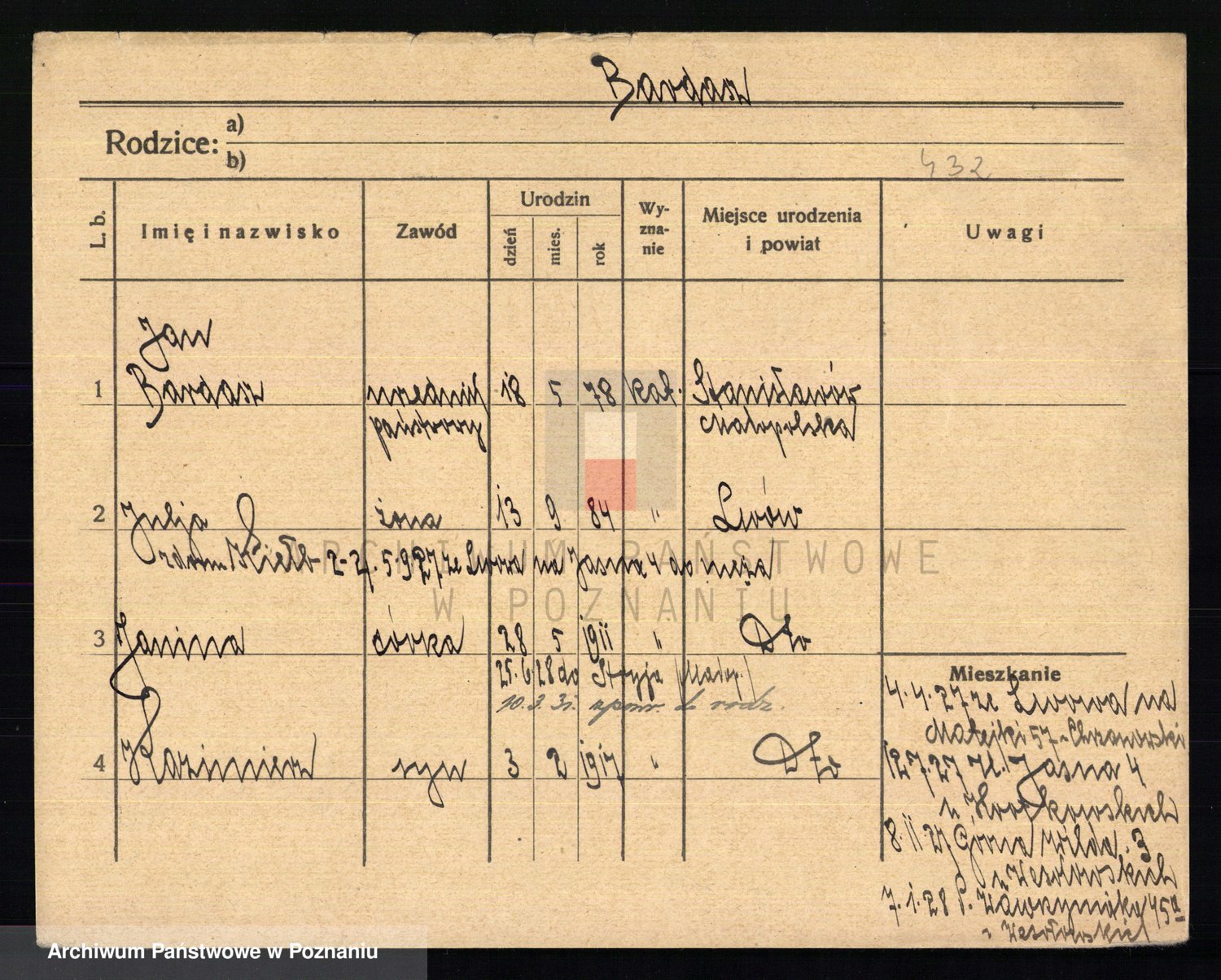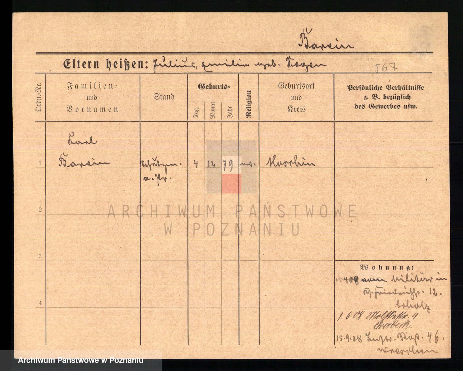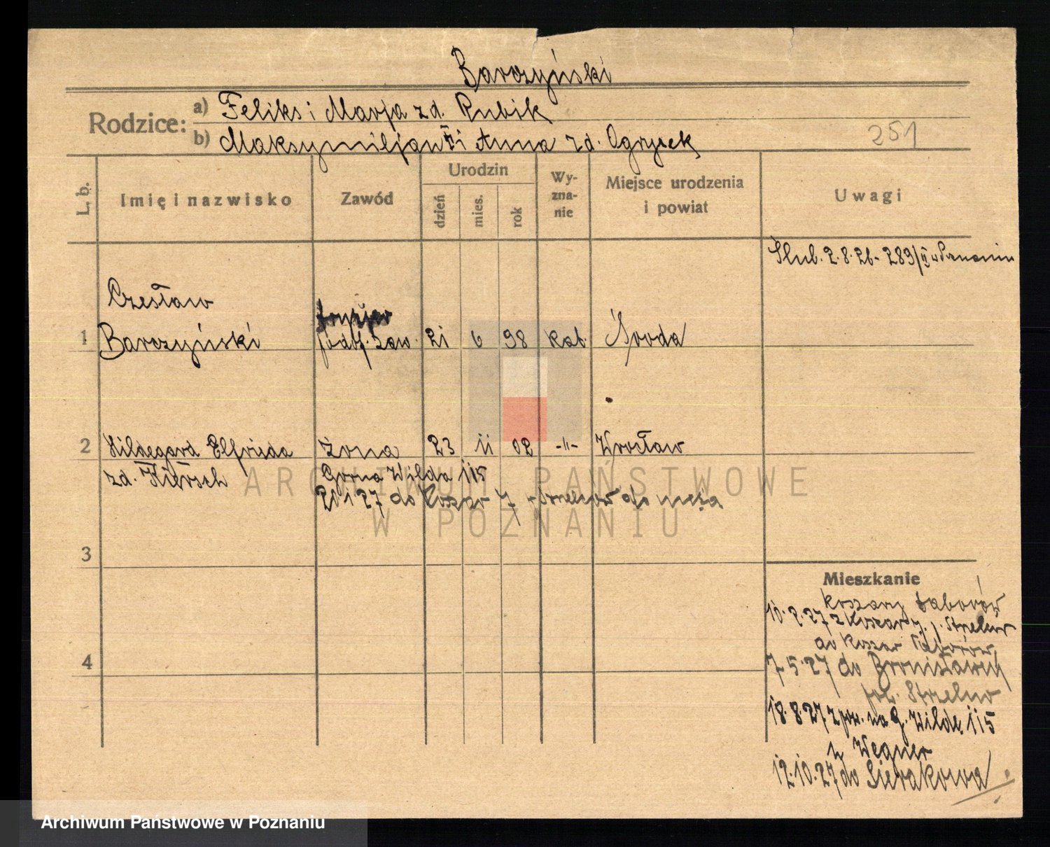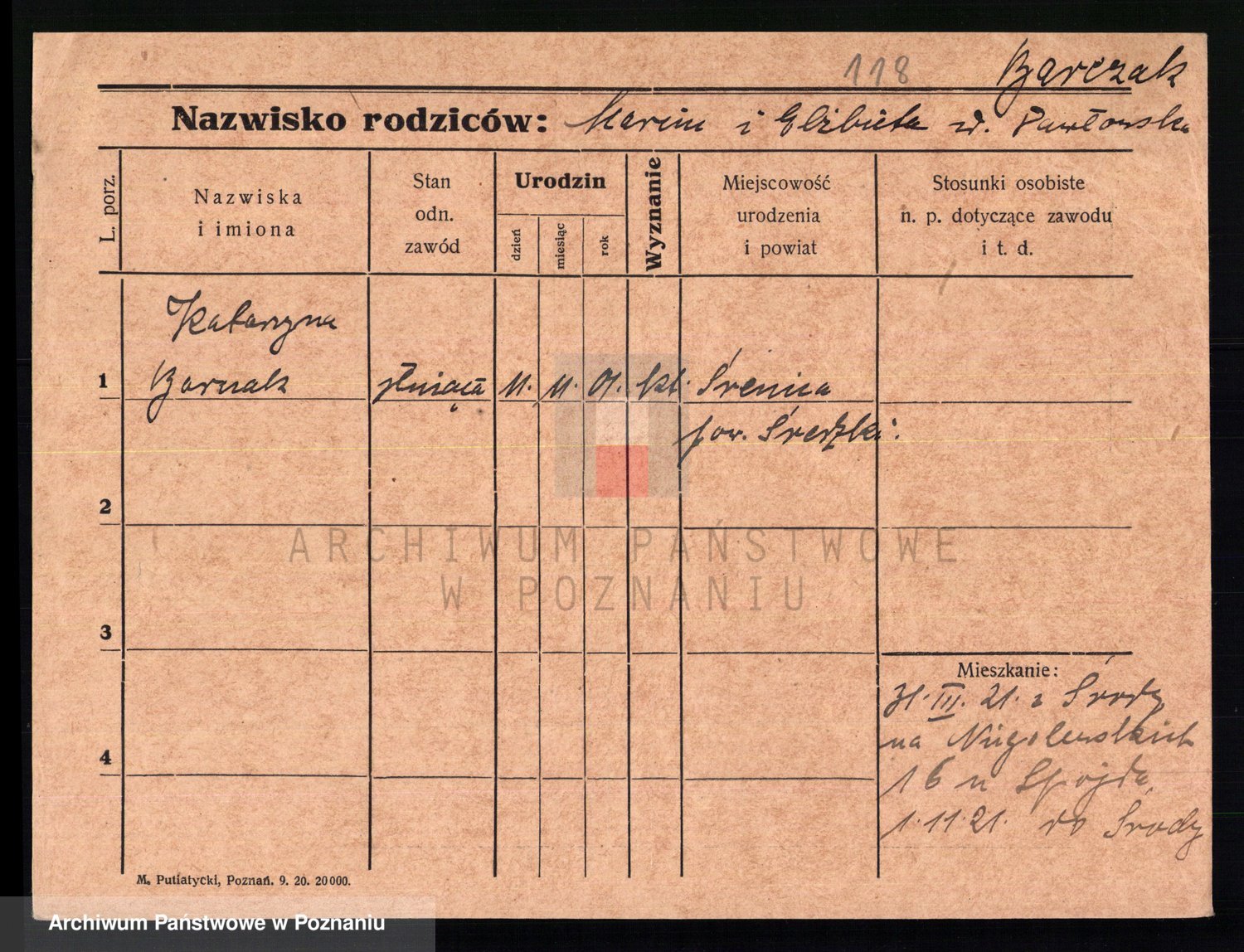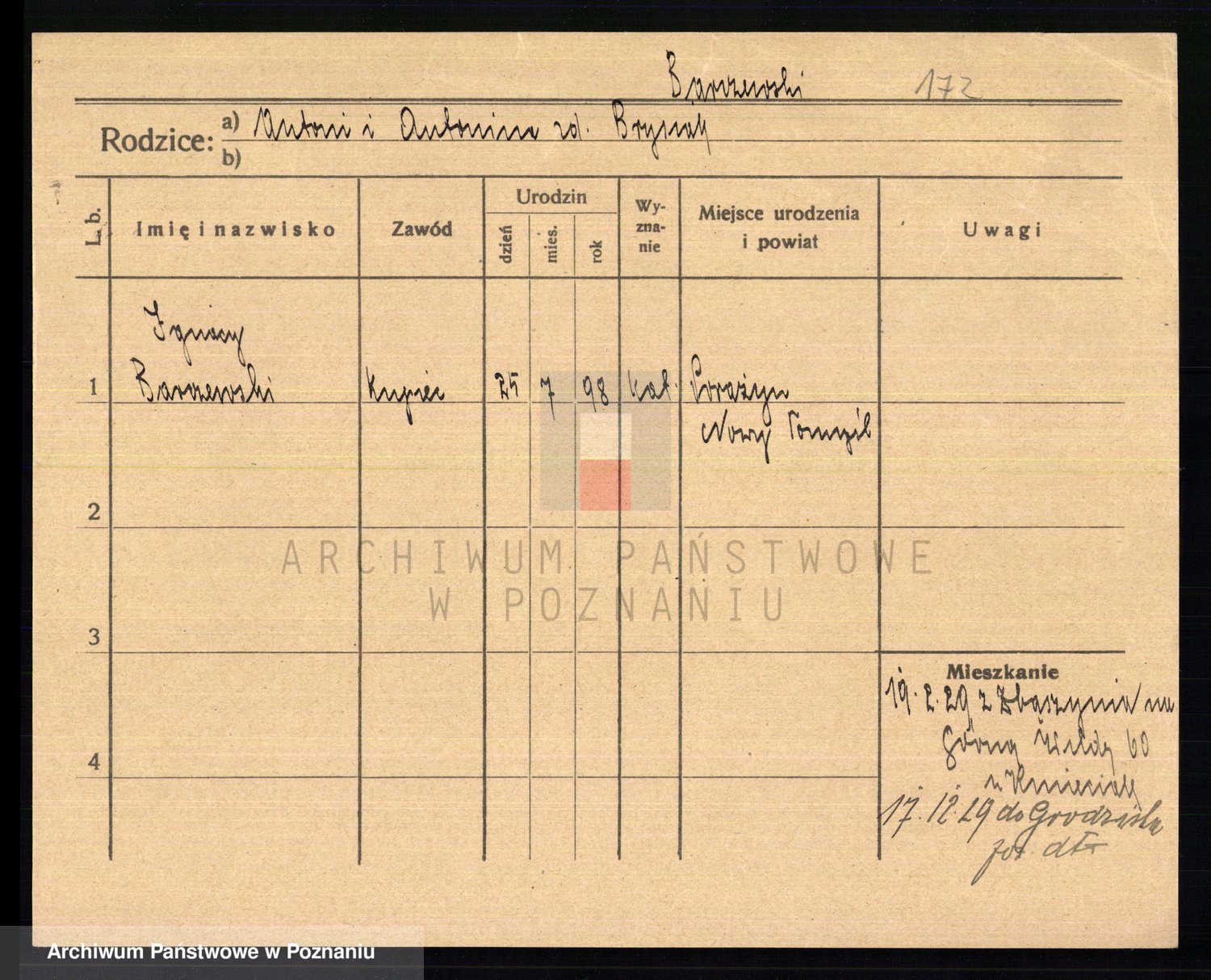Podgląd karty osobowej dostępny jest po kliknięciu na nazwisko lub ikonkę karty. Można dokonywać powiększenia (ikony na górze) lub przechodzić między kolejnymi skanami (strzałki po bokach).