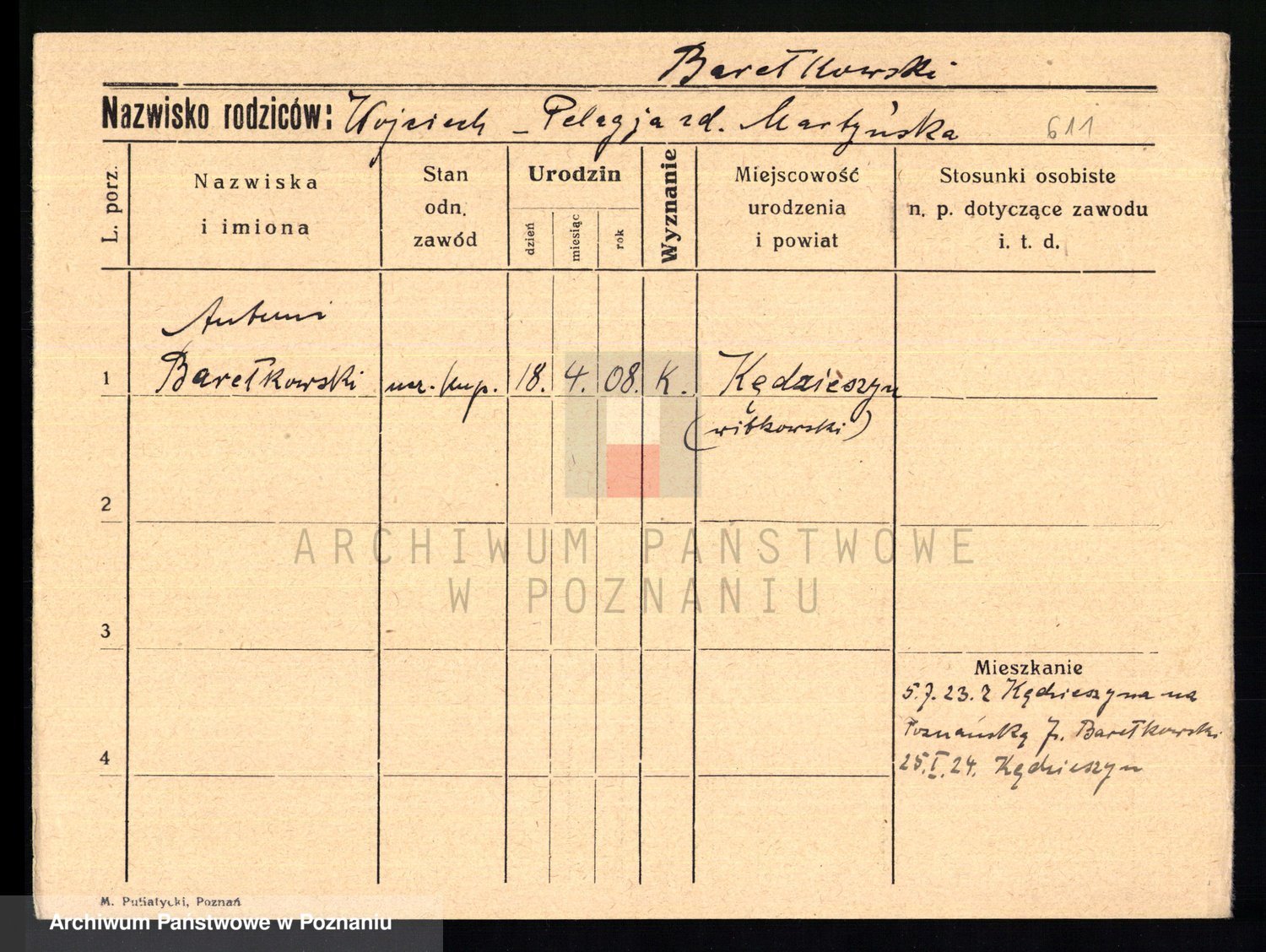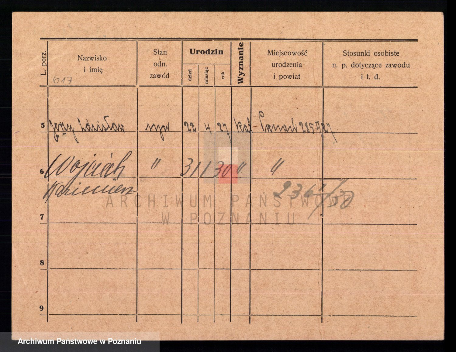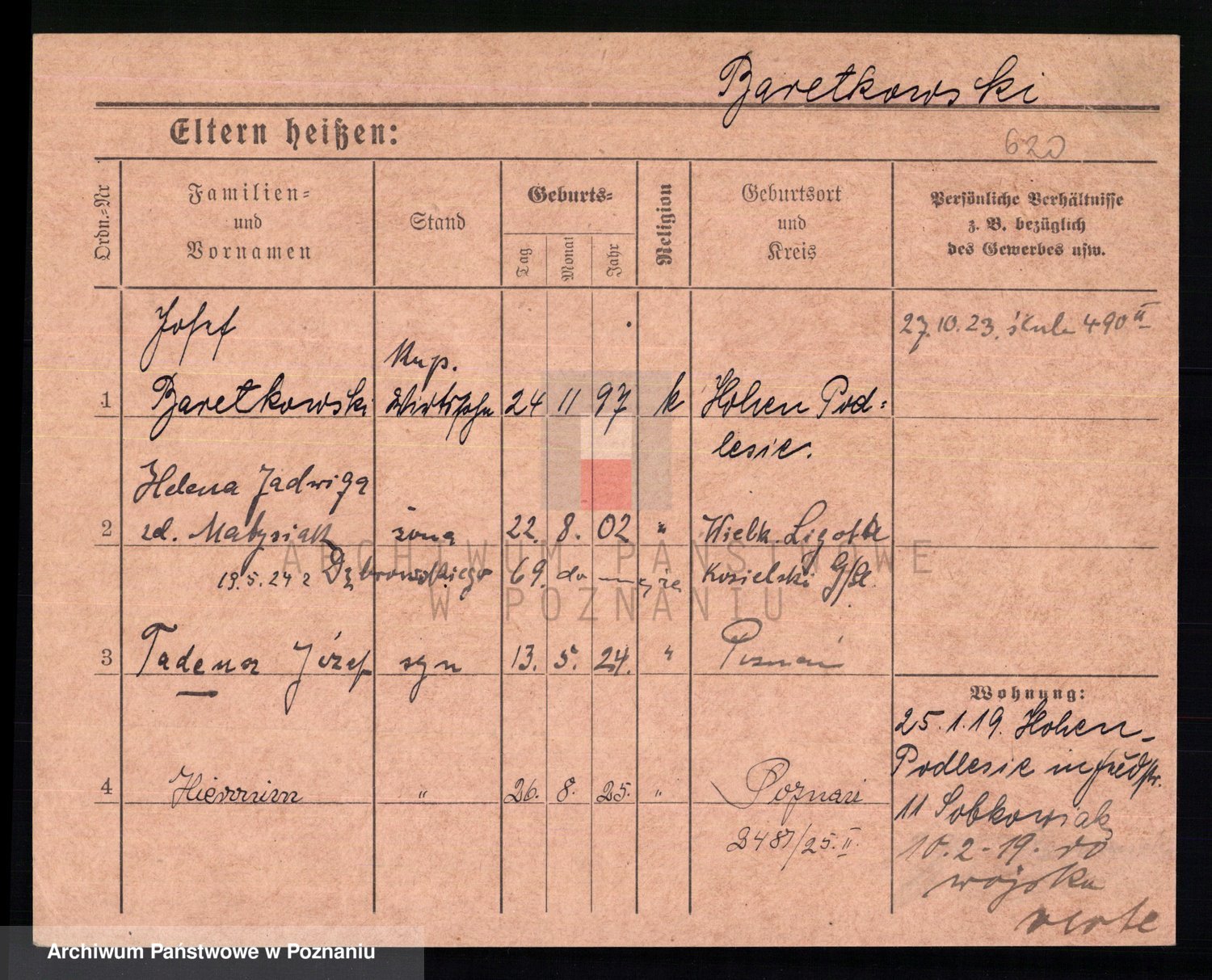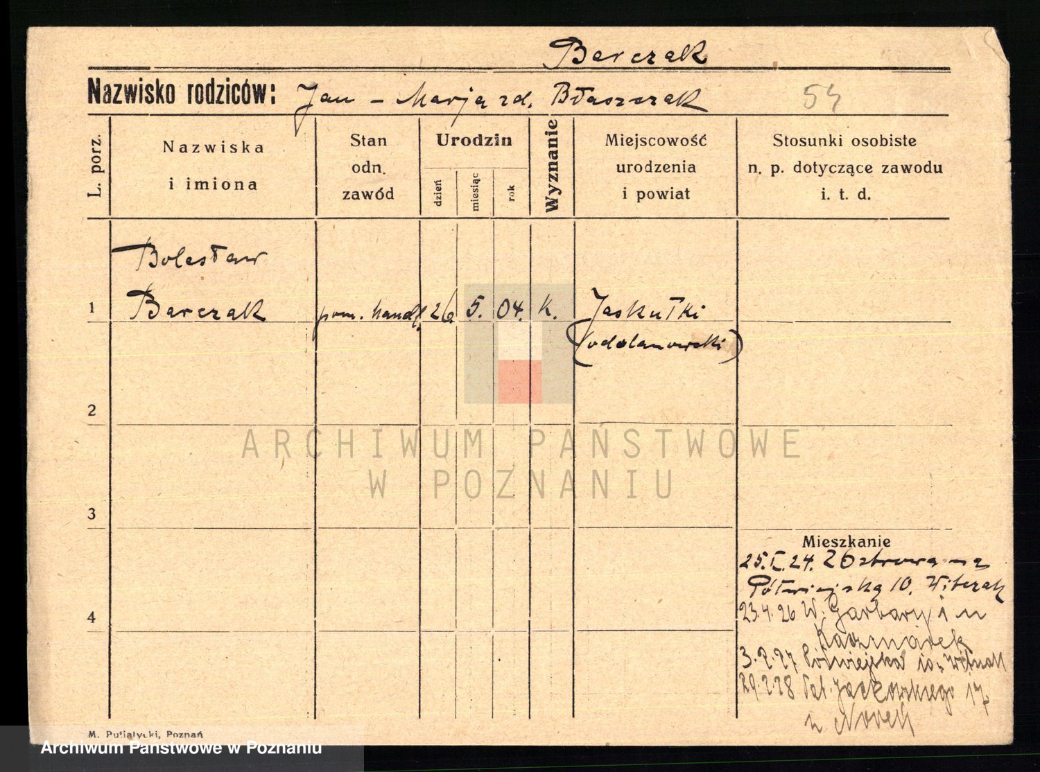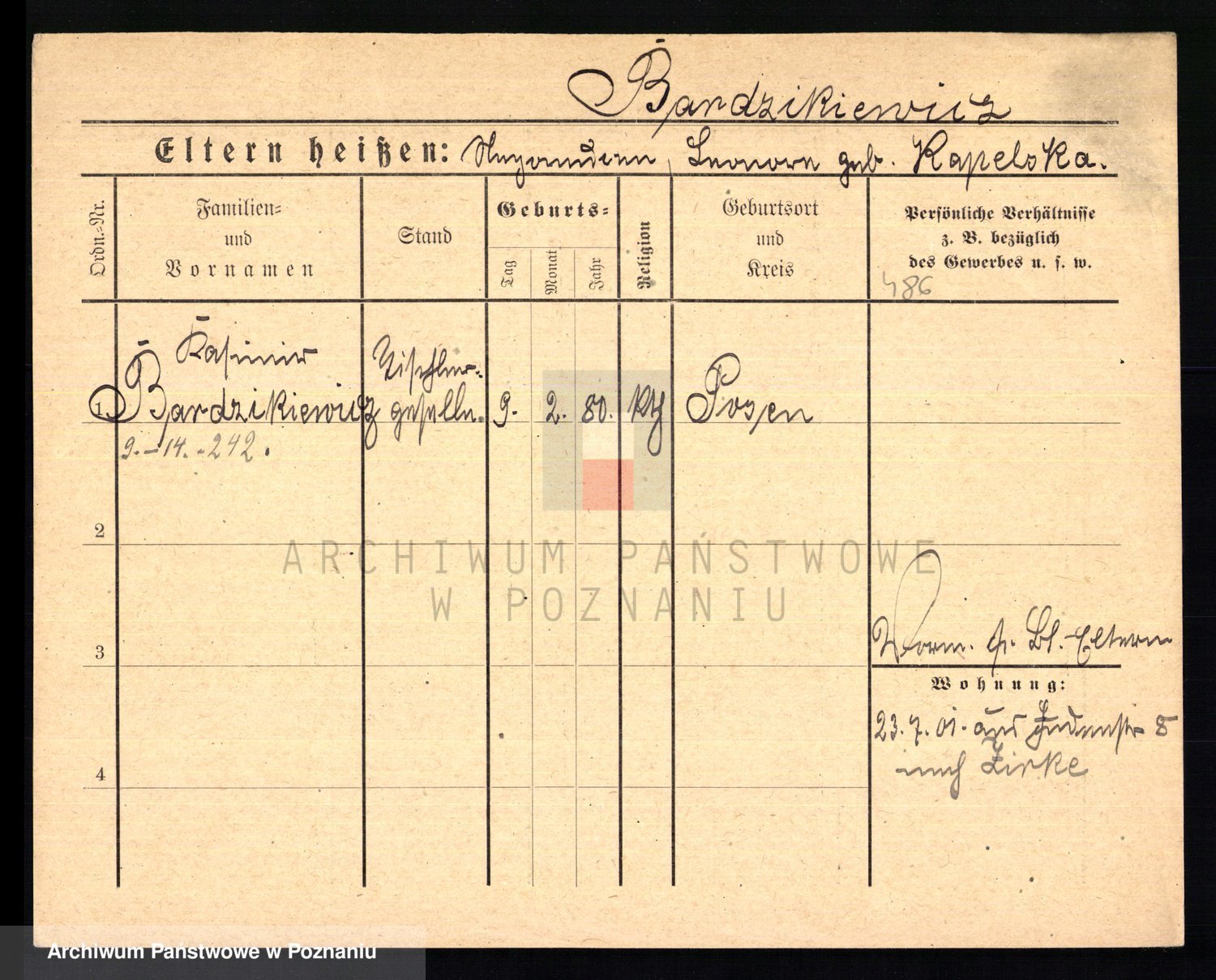 Podgląd karty osobowej dostępny jest po kliknięciu na nazwisko lub ikonkę karty. Można dokonywać powiększenia (ikony na górze) lub przechodzić między kolejnymi skanami (strzałki po bokach).