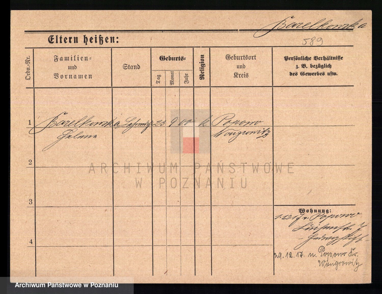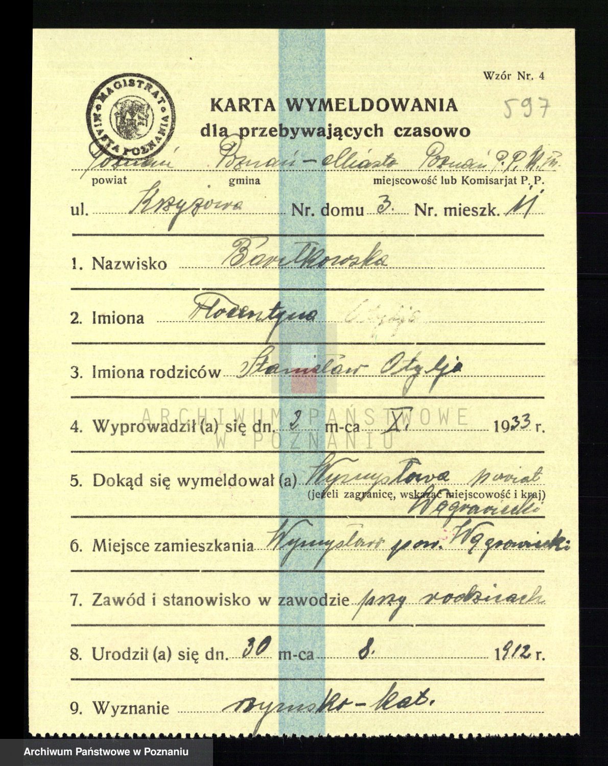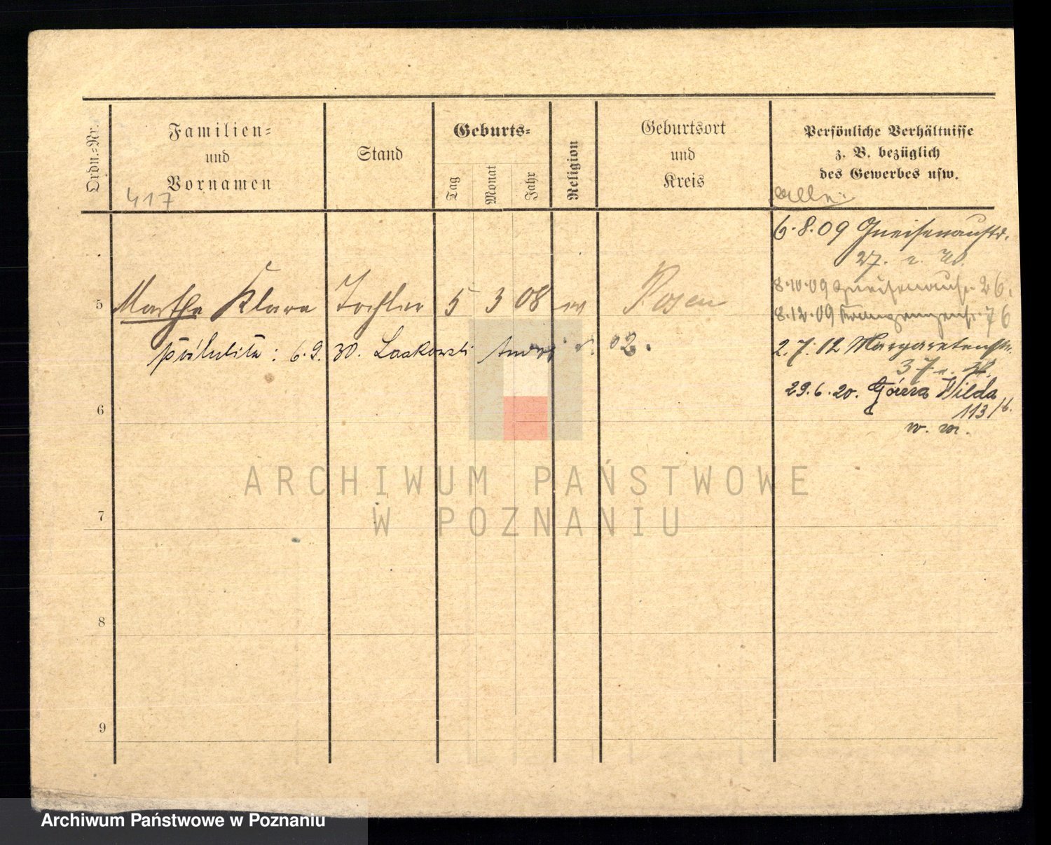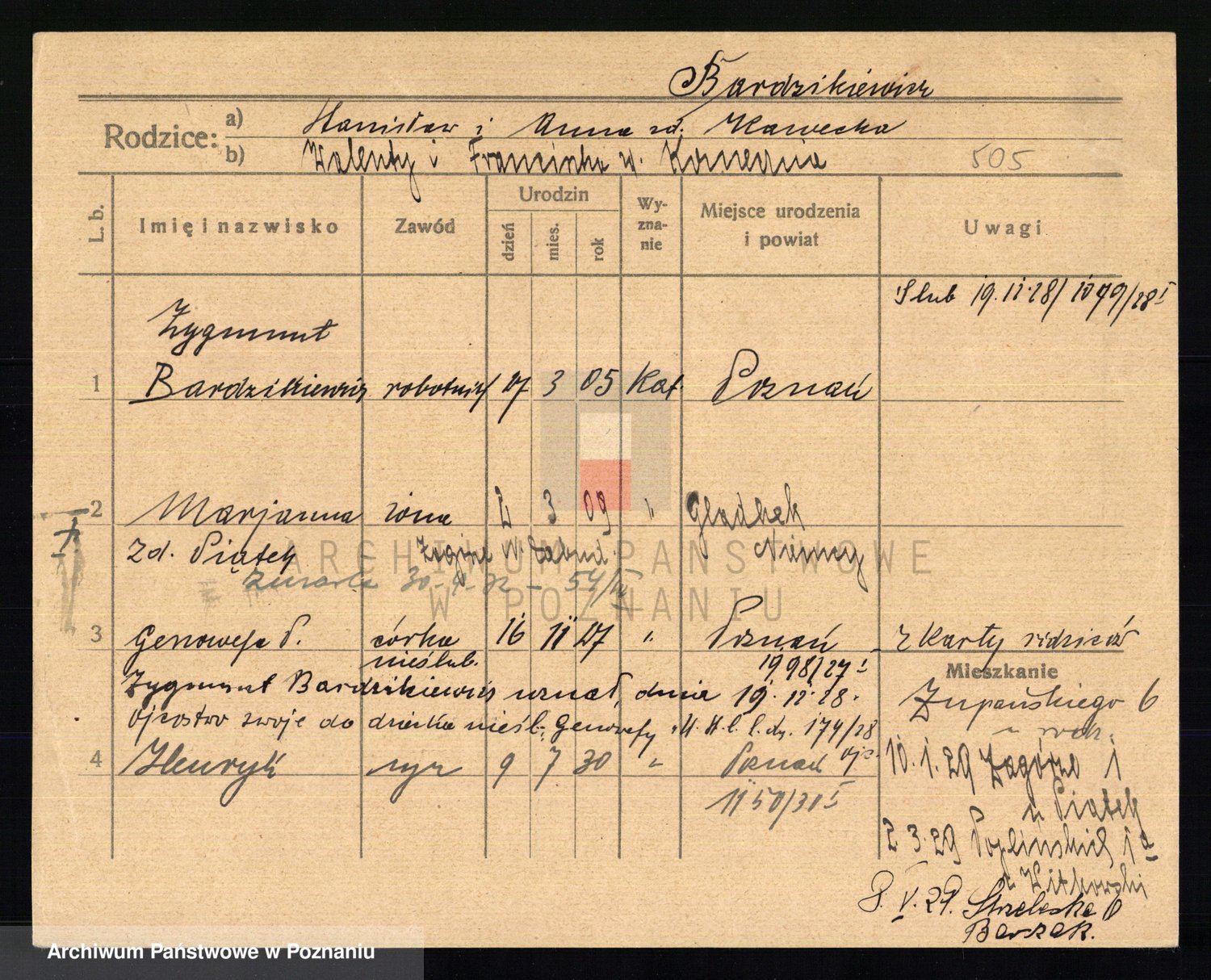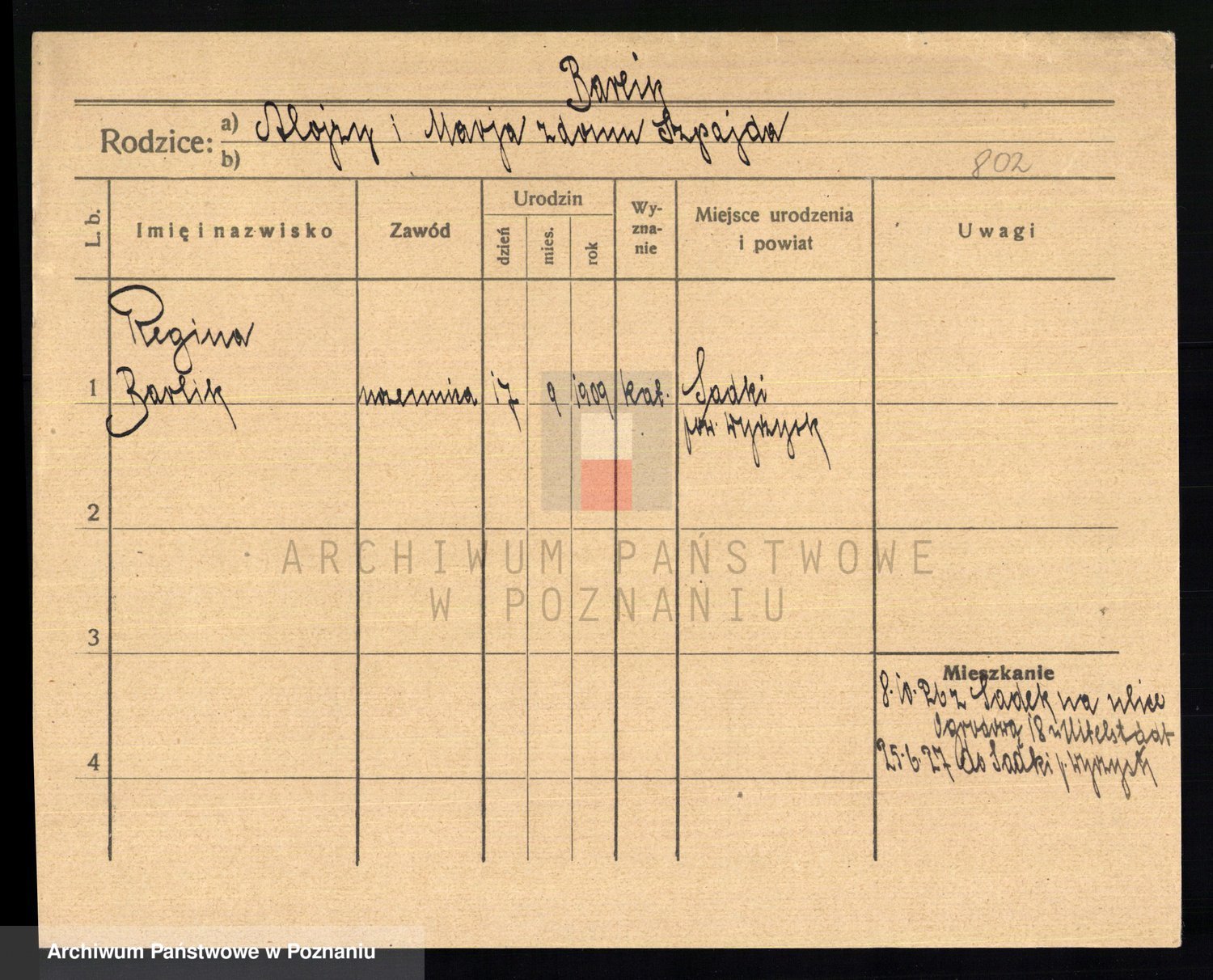Podgląd karty osobowej dostępny jest po kliknięciu na nazwisko lub ikonkę karty. Można dokonywać powiększenia (ikony na górze) lub przechodzić między kolejnymi skanami (strzałki po bokach).