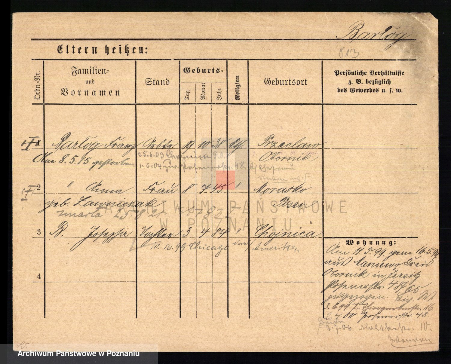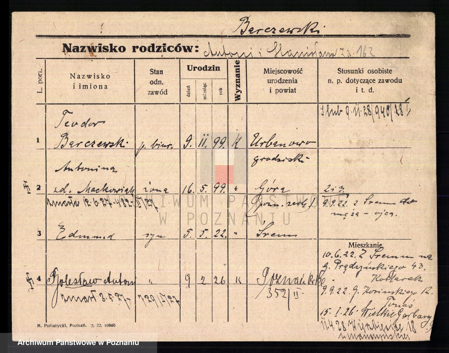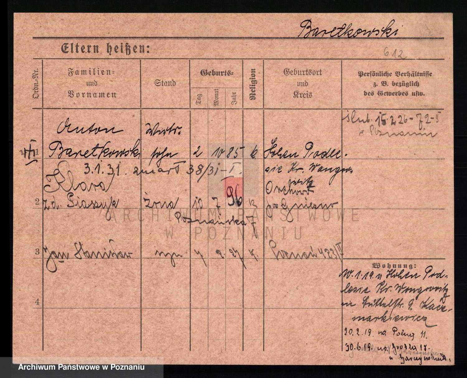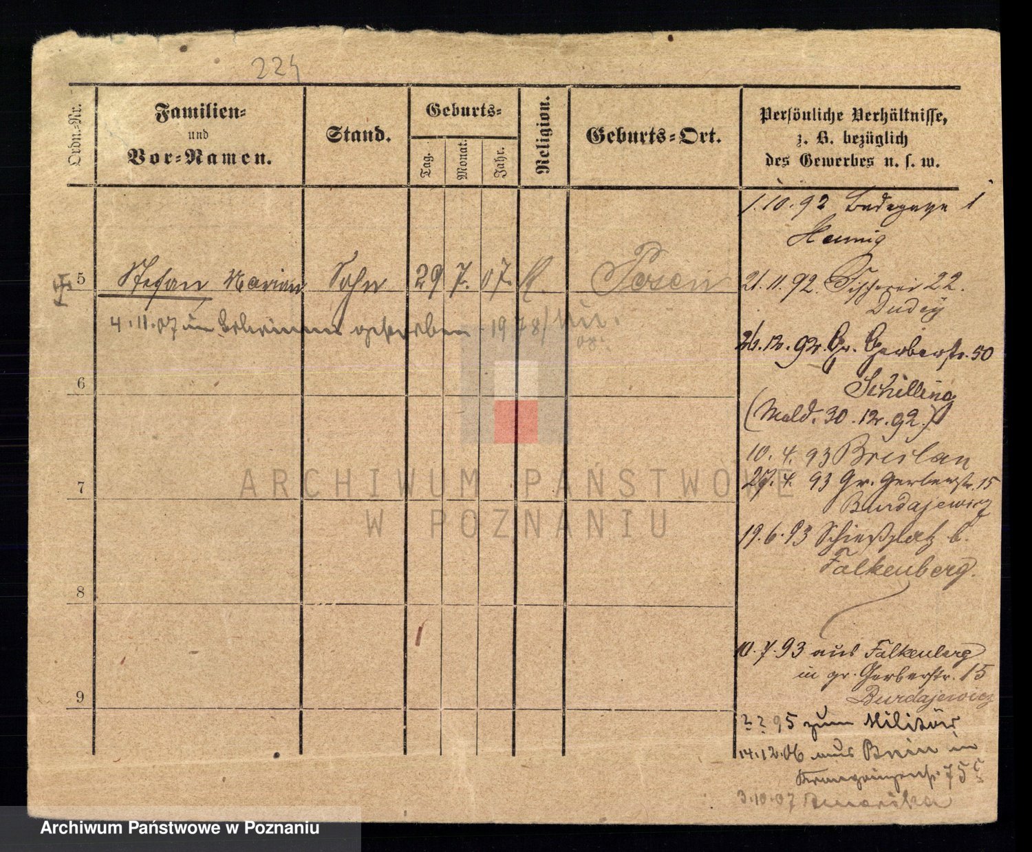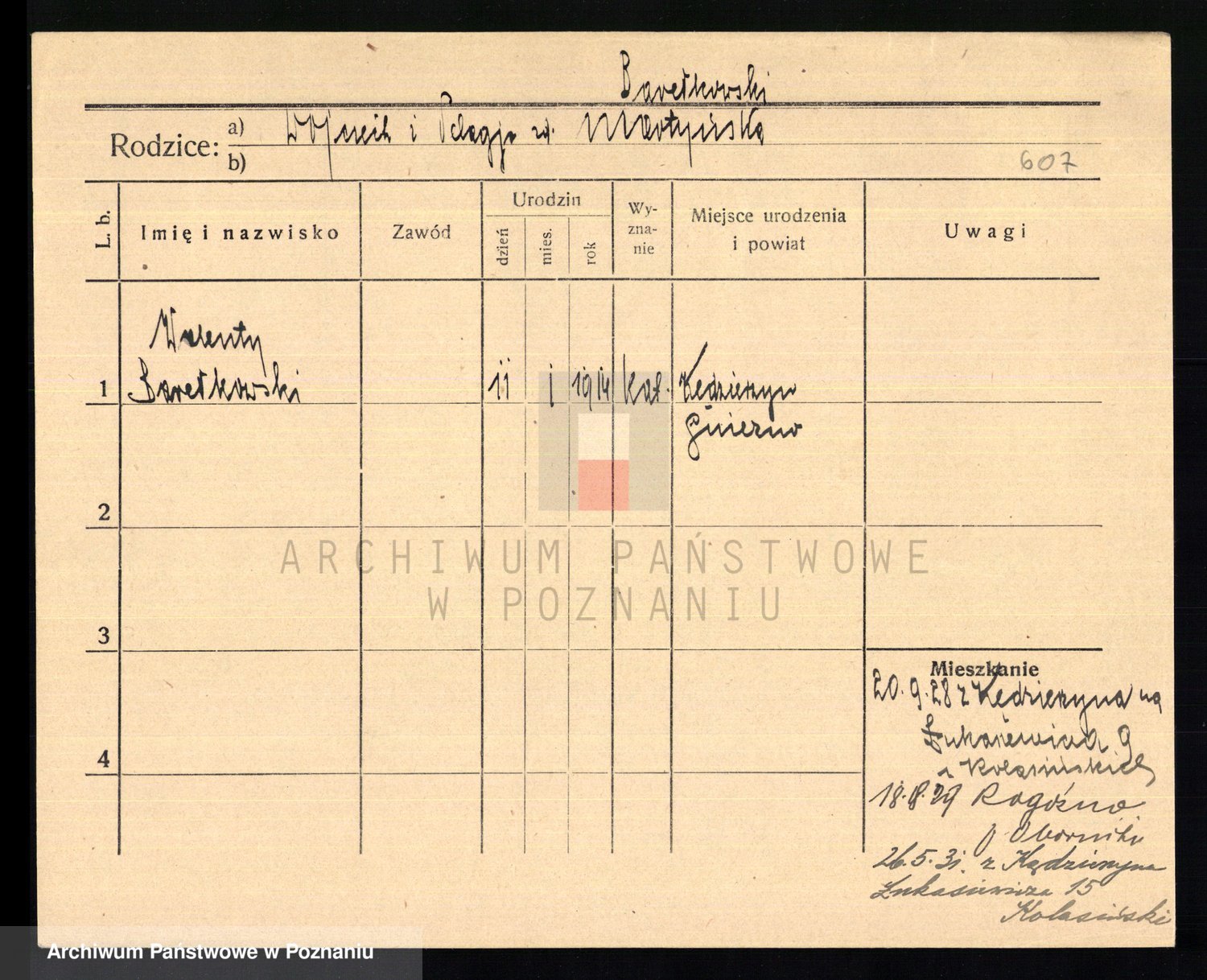 Podgląd karty osobowej dostępny jest po kliknięciu na nazwisko lub ikonkę karty. Można dokonywać powiększenia (ikony na górze) lub przechodzić między kolejnymi skanami (strzałki po bokach).