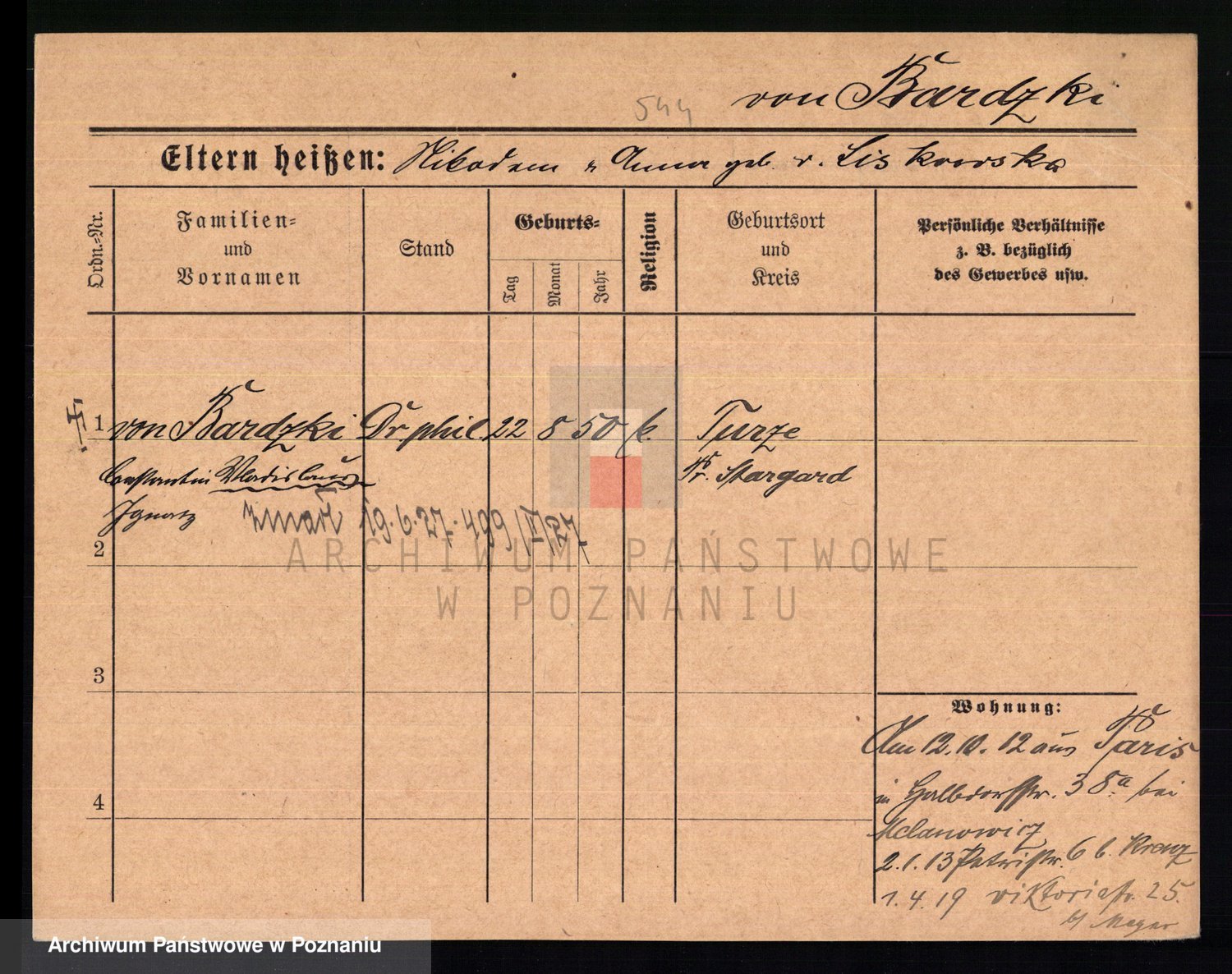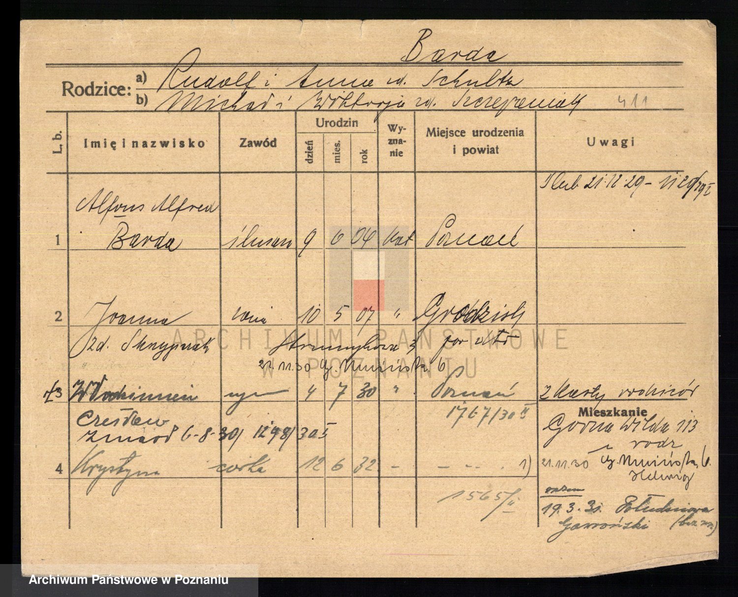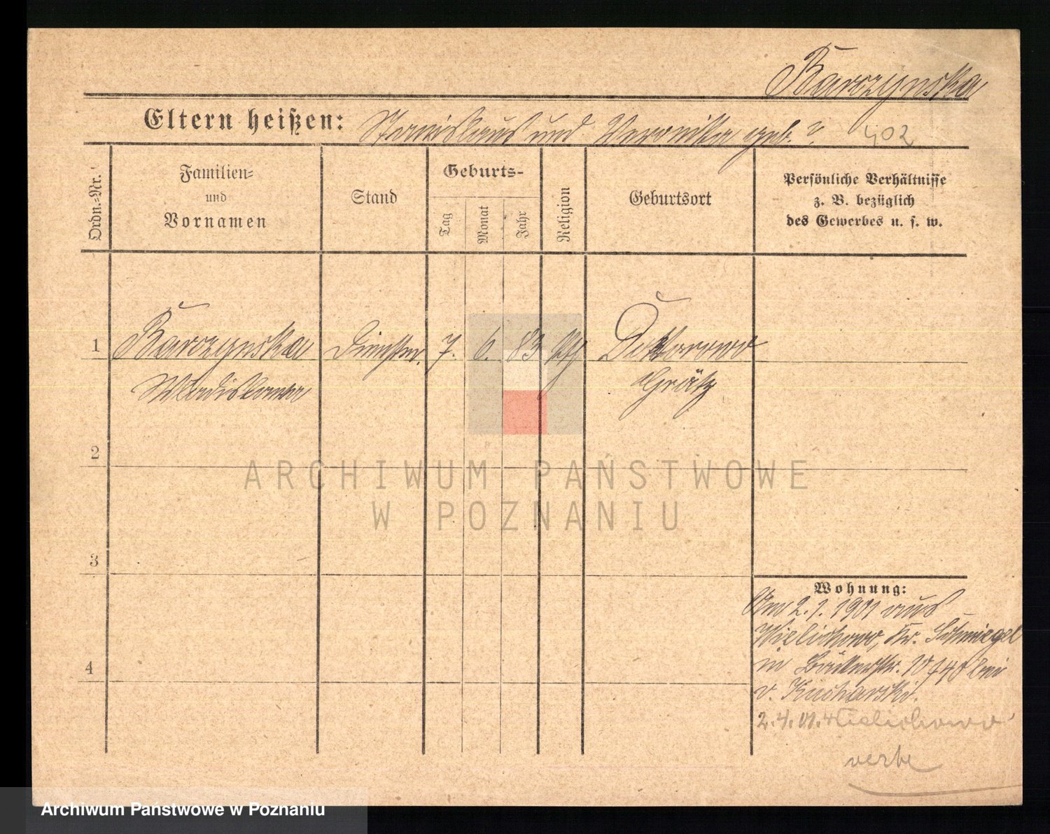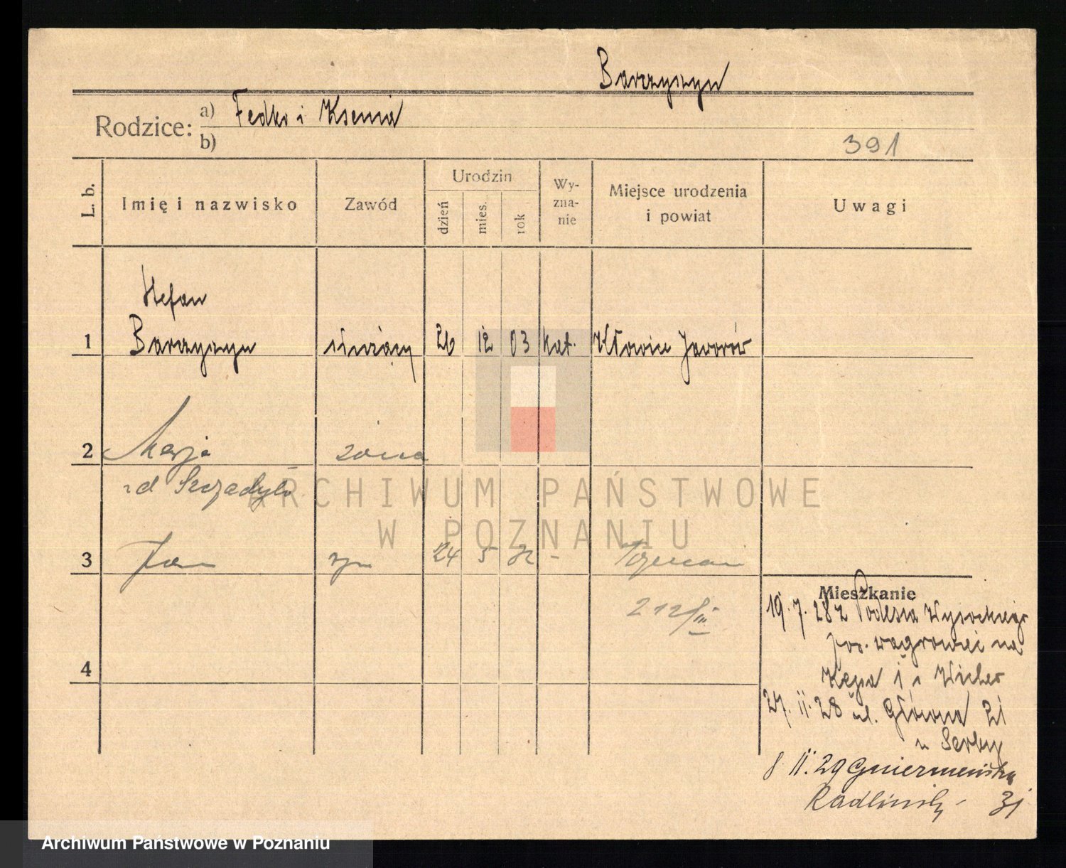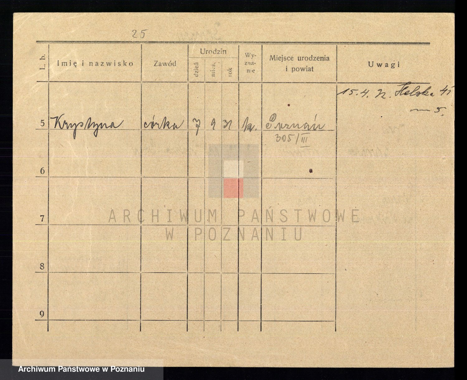 Podgląd karty osobowej dostępny jest po kliknięciu na nazwisko lub ikonkę karty. Można dokonywać powiększenia (ikony na górze) lub przechodzić między kolejnymi skanami (strzałki po bokach).