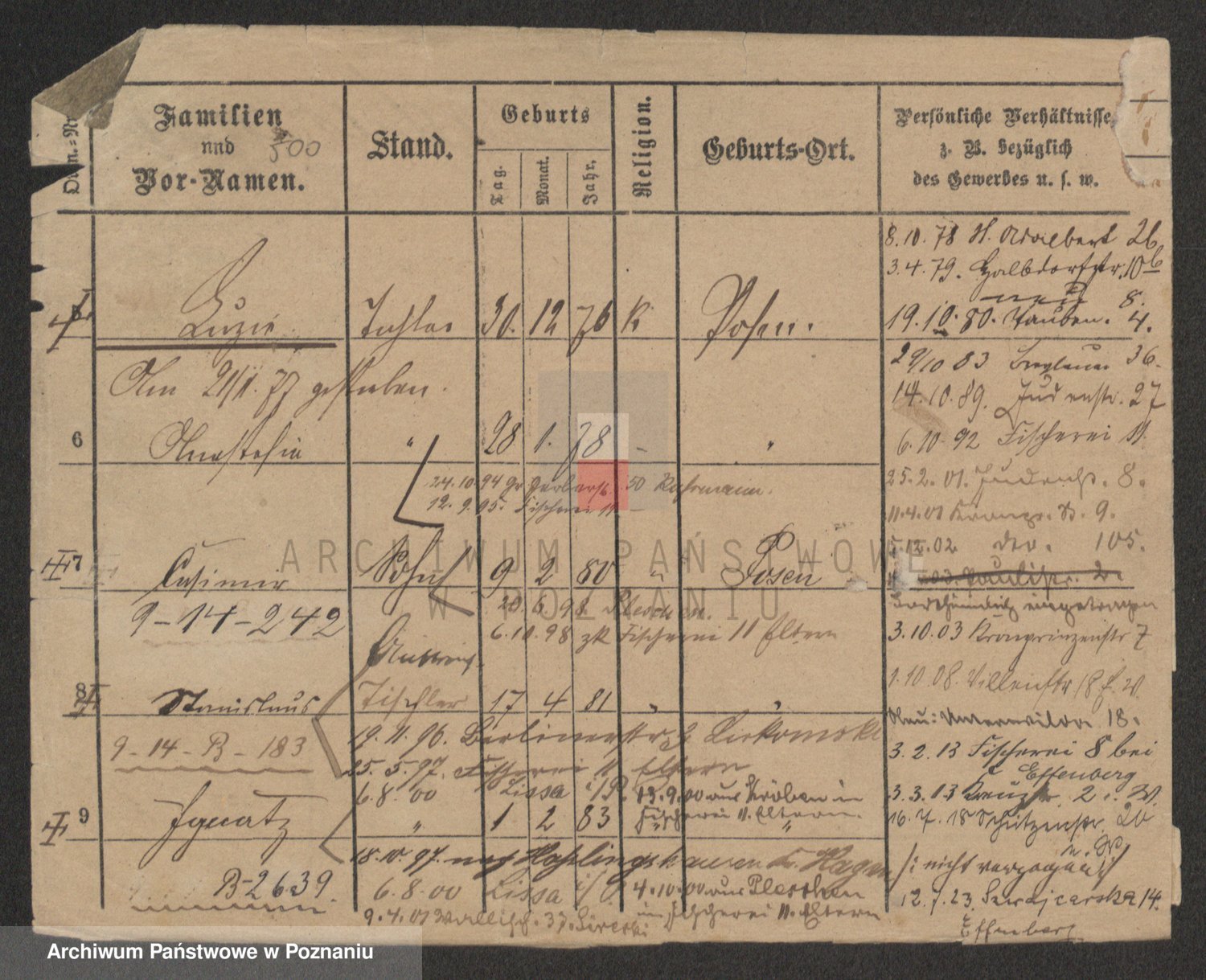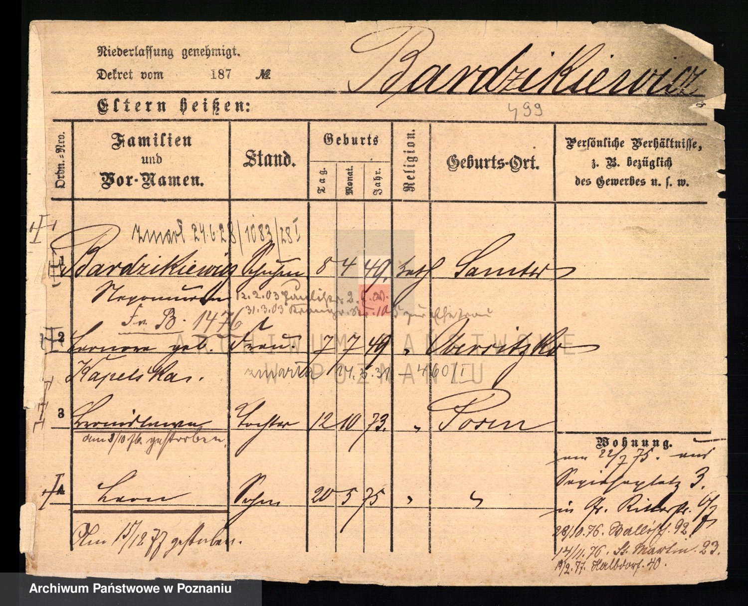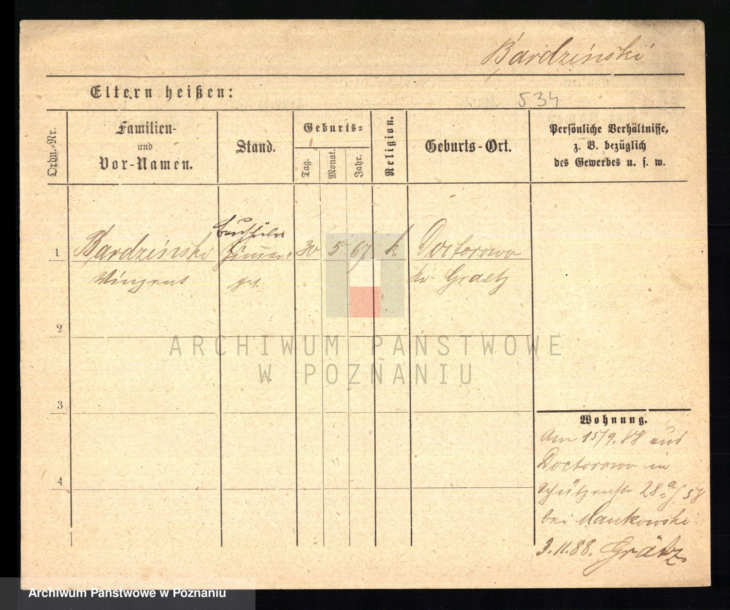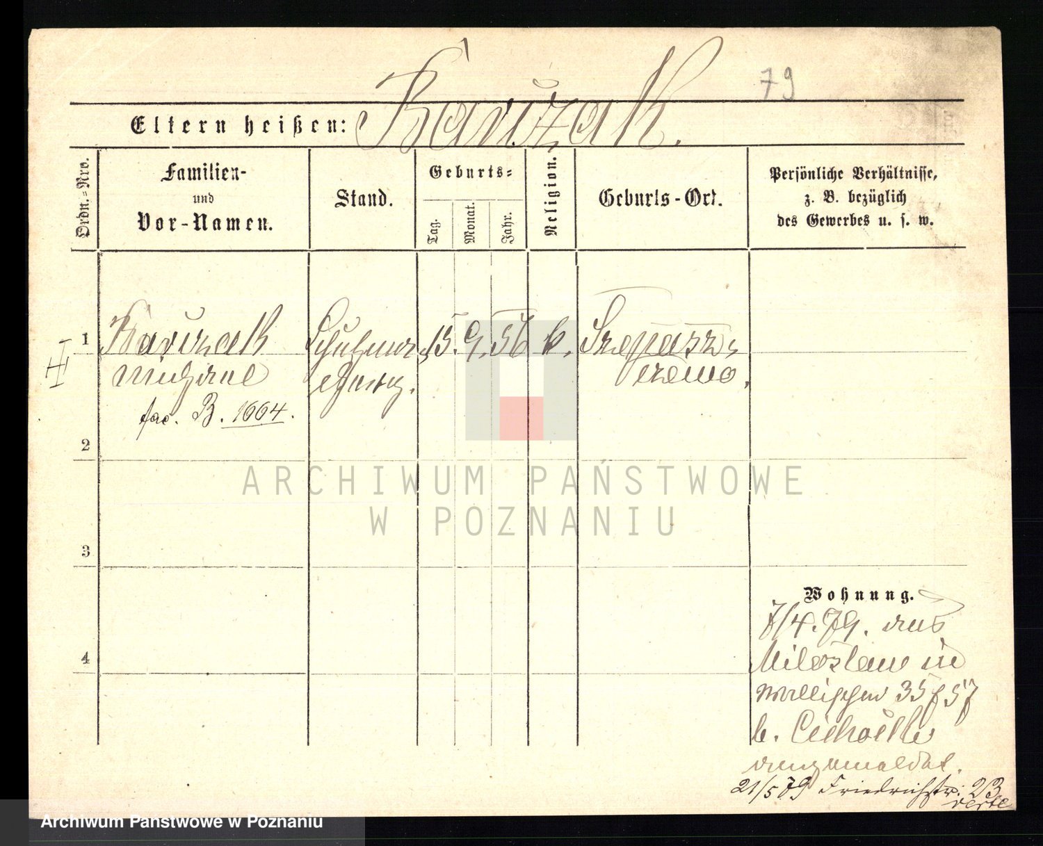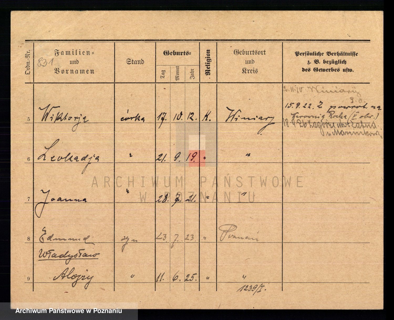 Podgląd karty osobowej dostępny jest po kliknięciu na nazwisko lub ikonkę karty. Można dokonywać powiększenia (ikony na górze) lub przechodzić między kolejnymi skanami (strzałki po bokach).