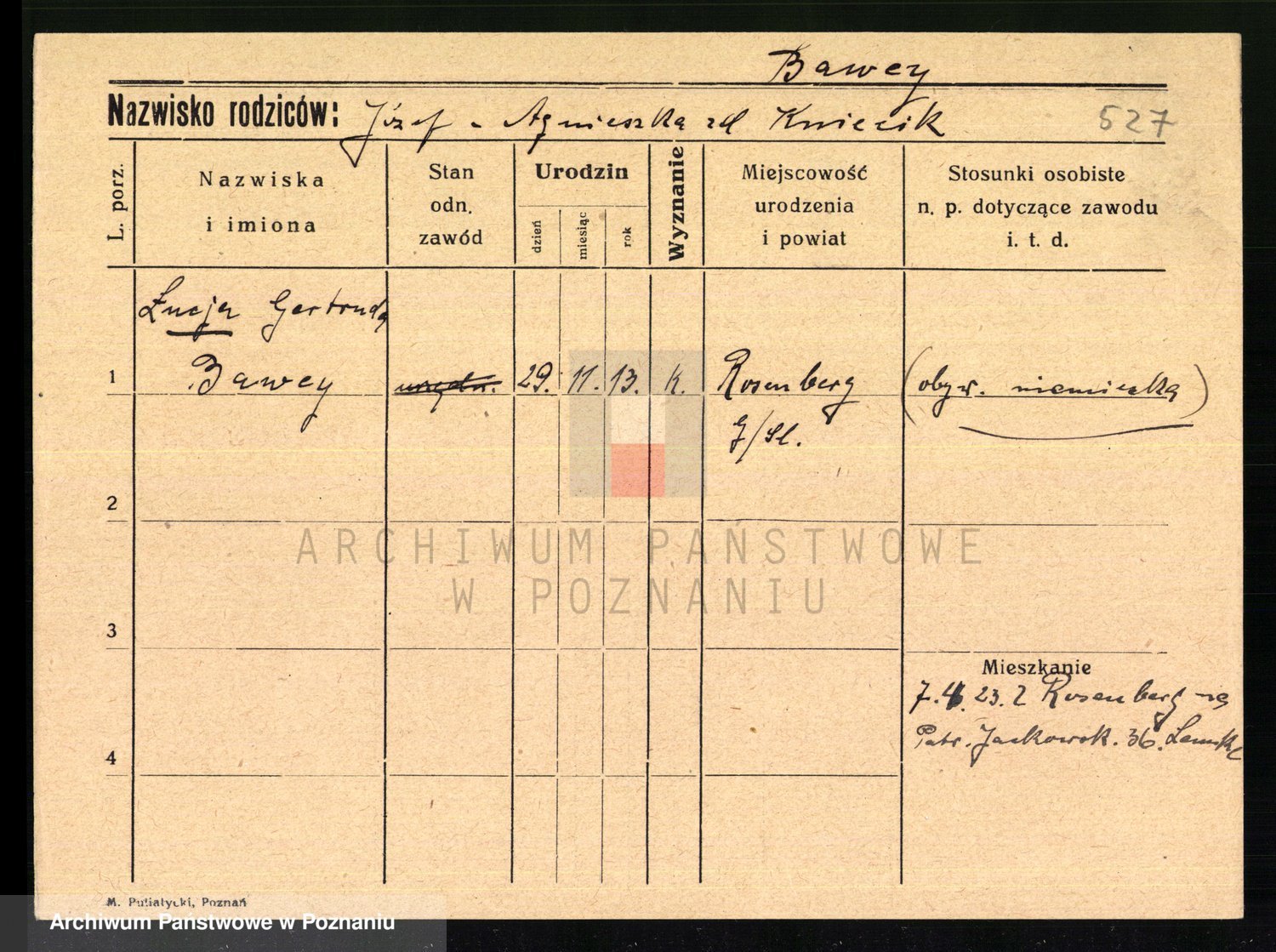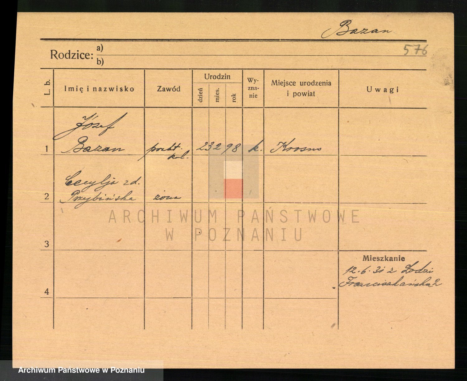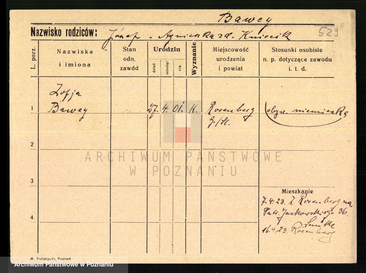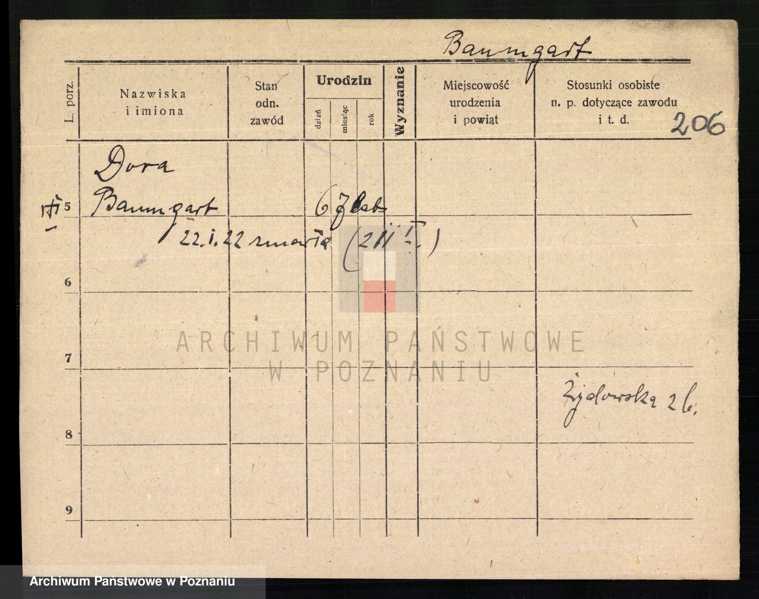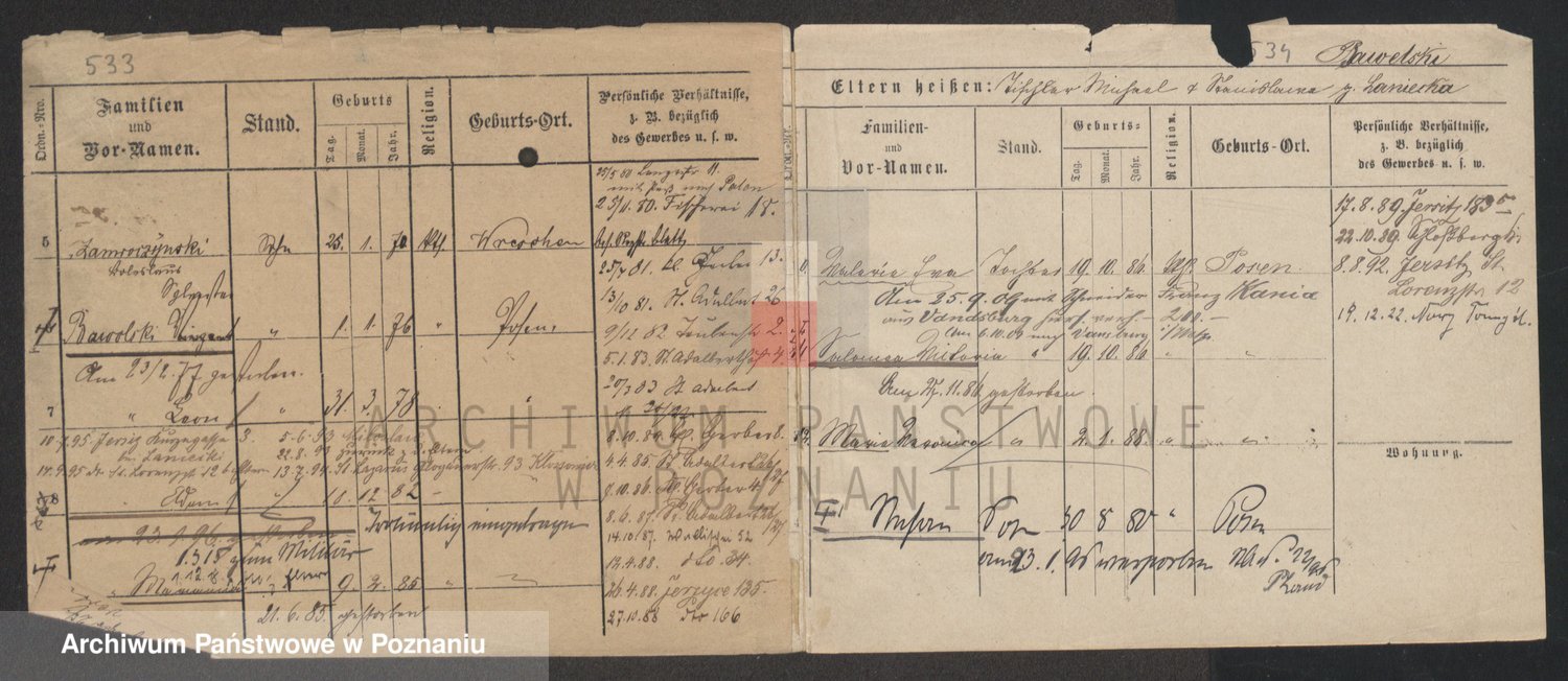 Podgląd karty osobowej dostępny jest po kliknięciu na nazwisko lub ikonkę karty. Można dokonywać powiększenia (ikony na górze) lub przechodzić między kolejnymi skanami (strzałki po bokach).