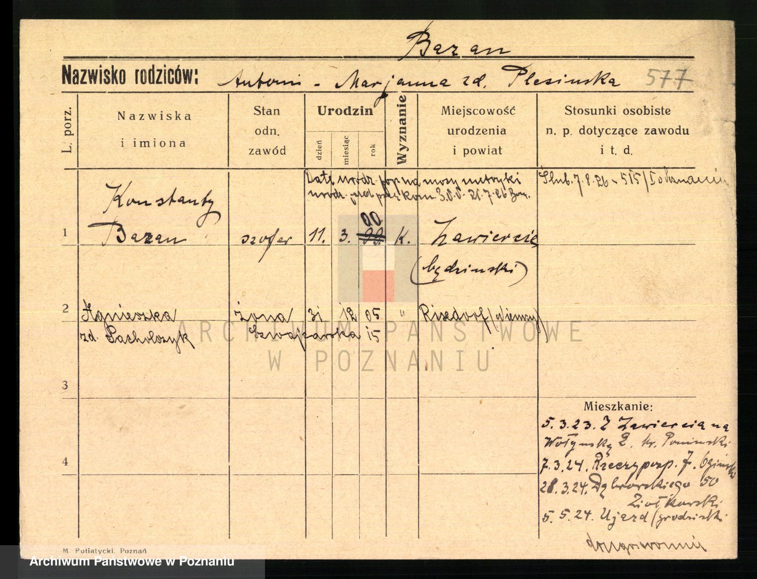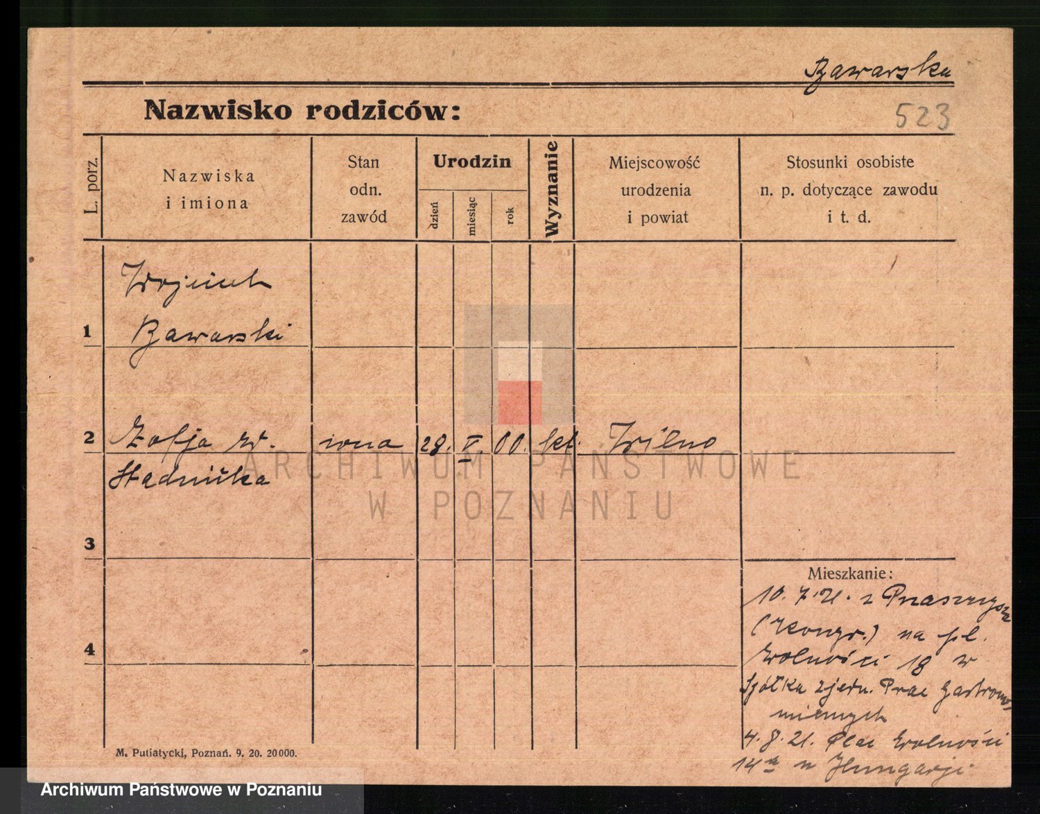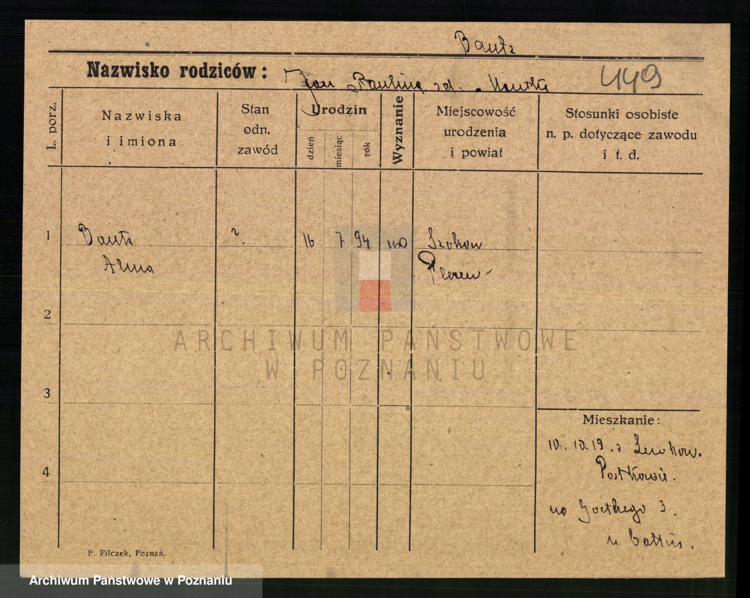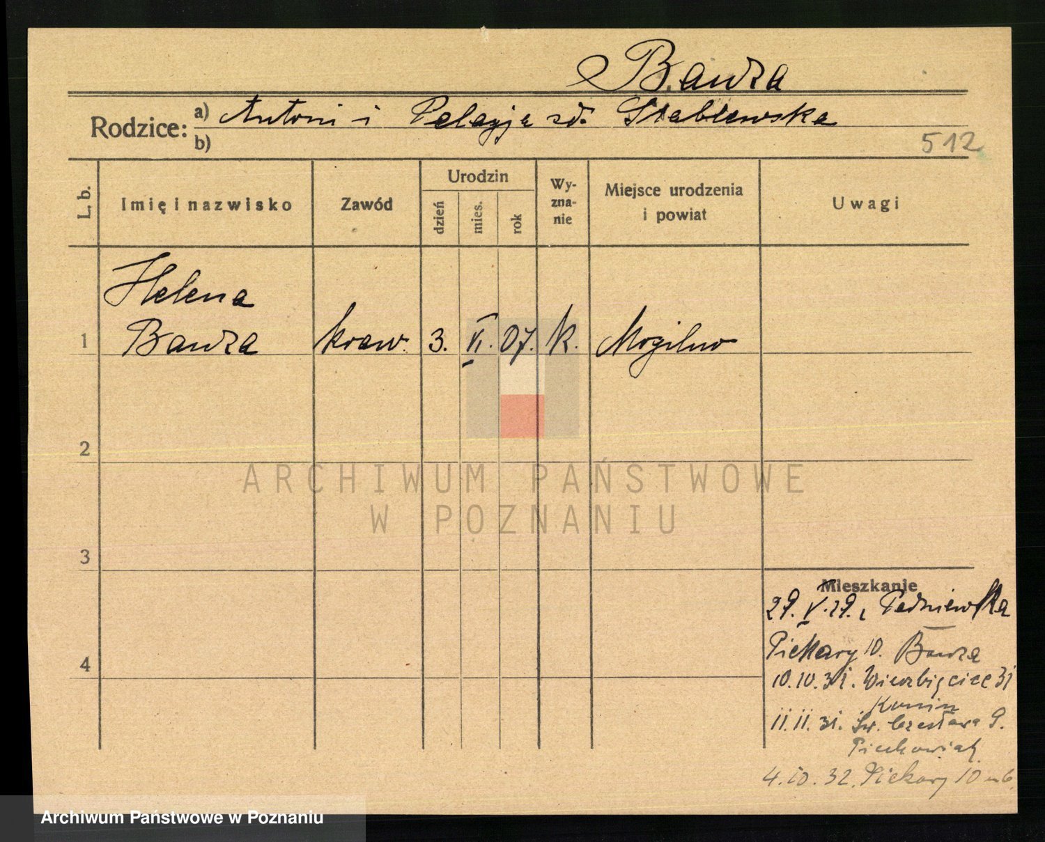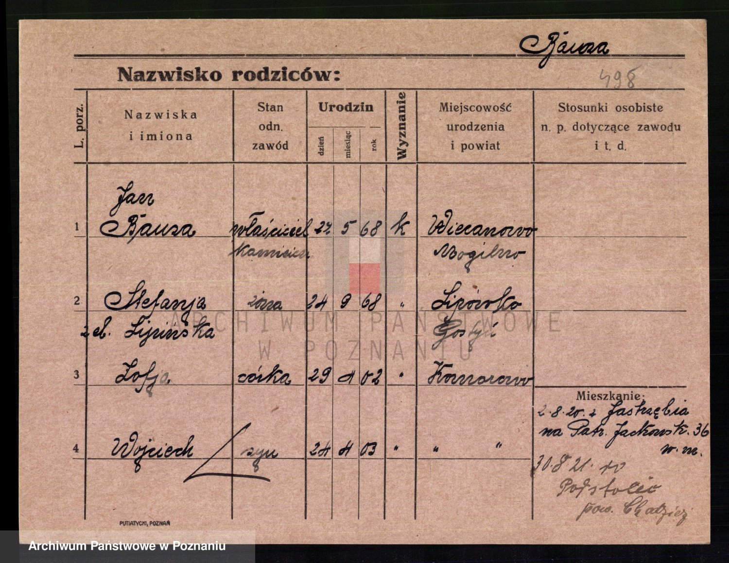 Podgląd karty osobowej dostępny jest po kliknięciu na nazwisko lub ikonkę karty. Można dokonywać powiększenia (ikony na górze) lub przechodzić między kolejnymi skanami (strzałki po bokach).