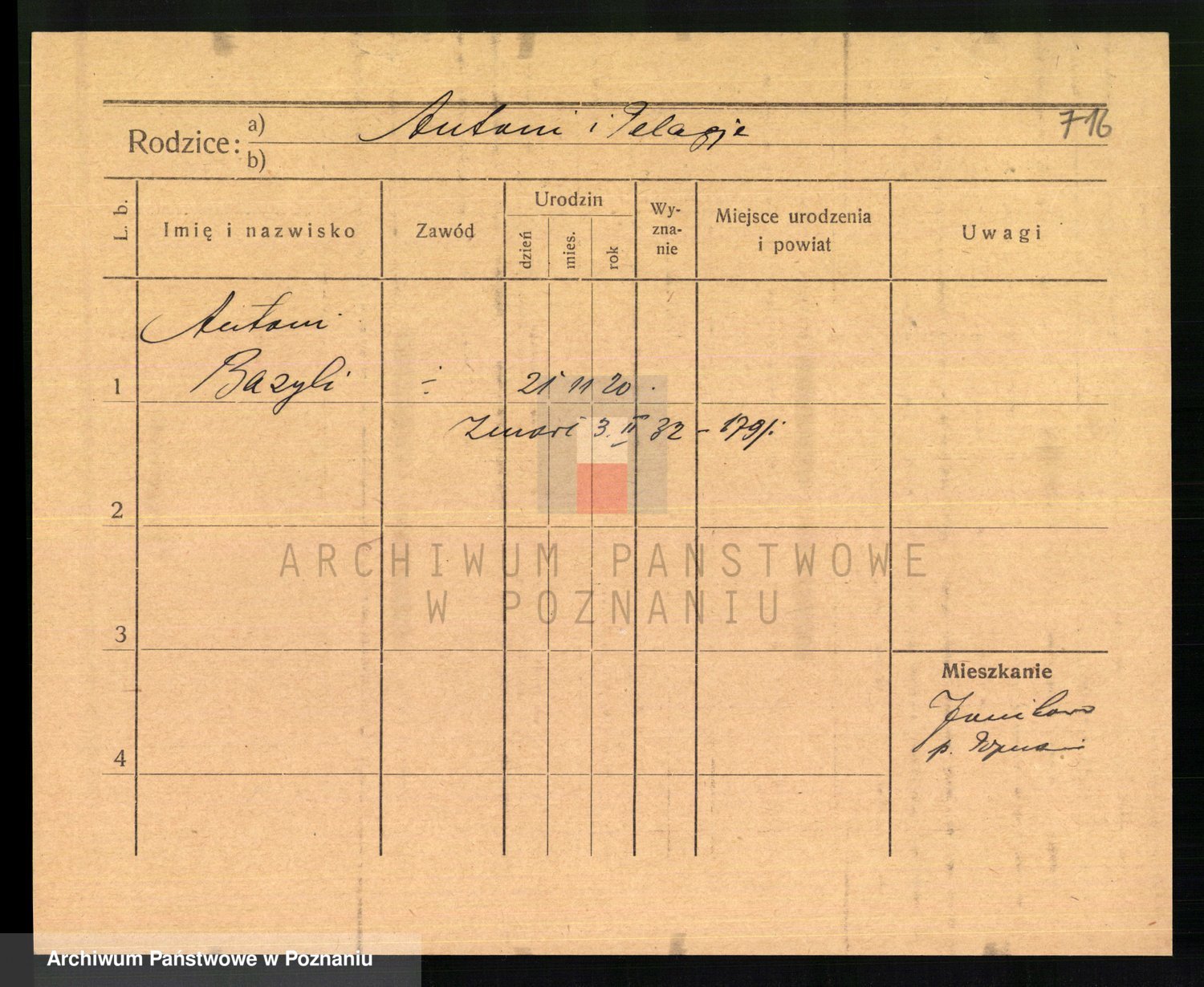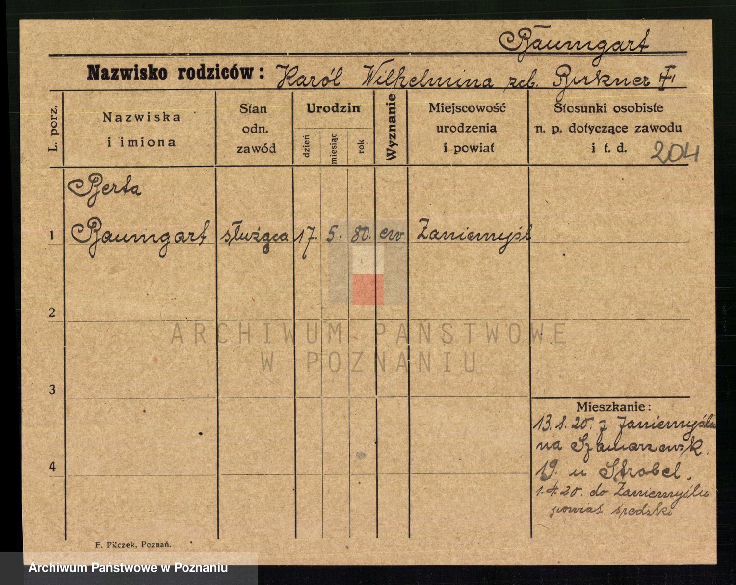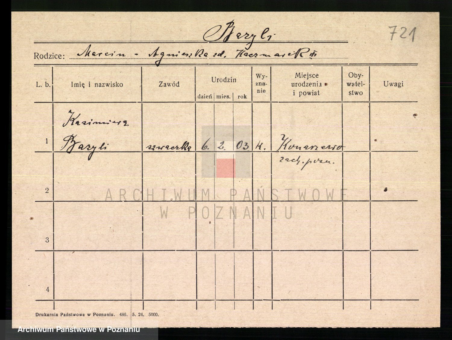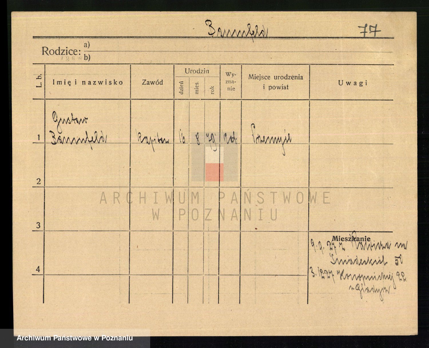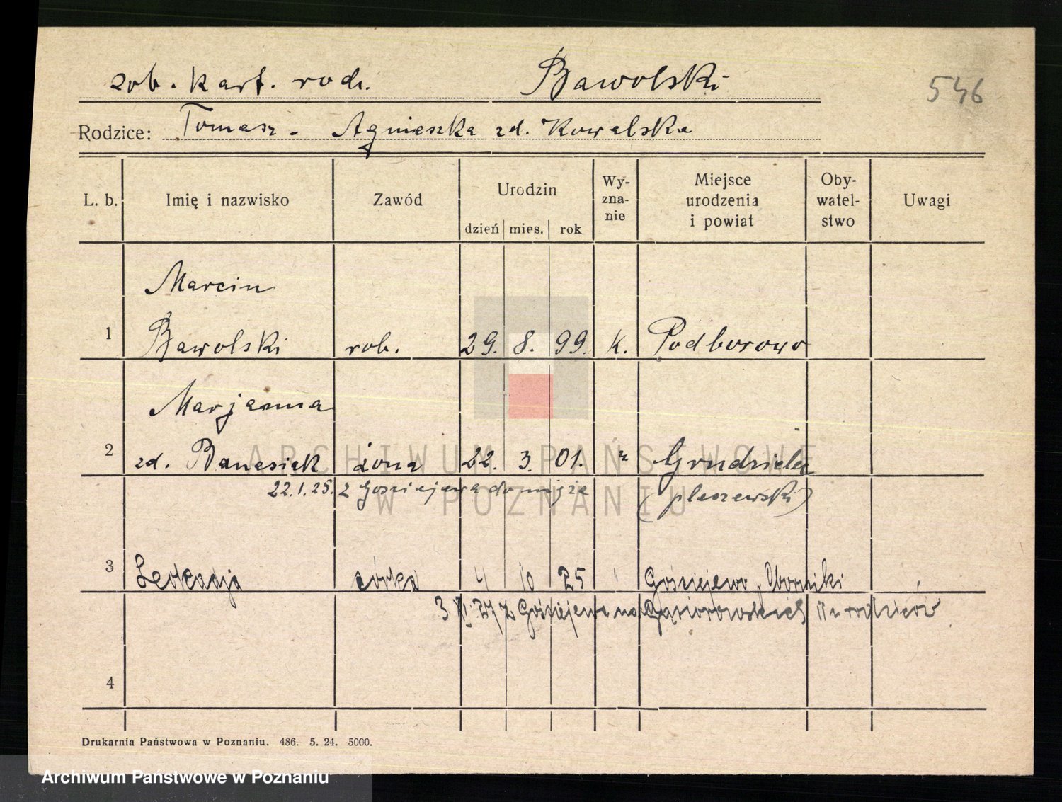 Podgląd karty osobowej dostępny jest po kliknięciu na nazwisko lub ikonkę karty. Można dokonywać powiększenia (ikony na górze) lub przechodzić między kolejnymi skanami (strzałki po bokach).