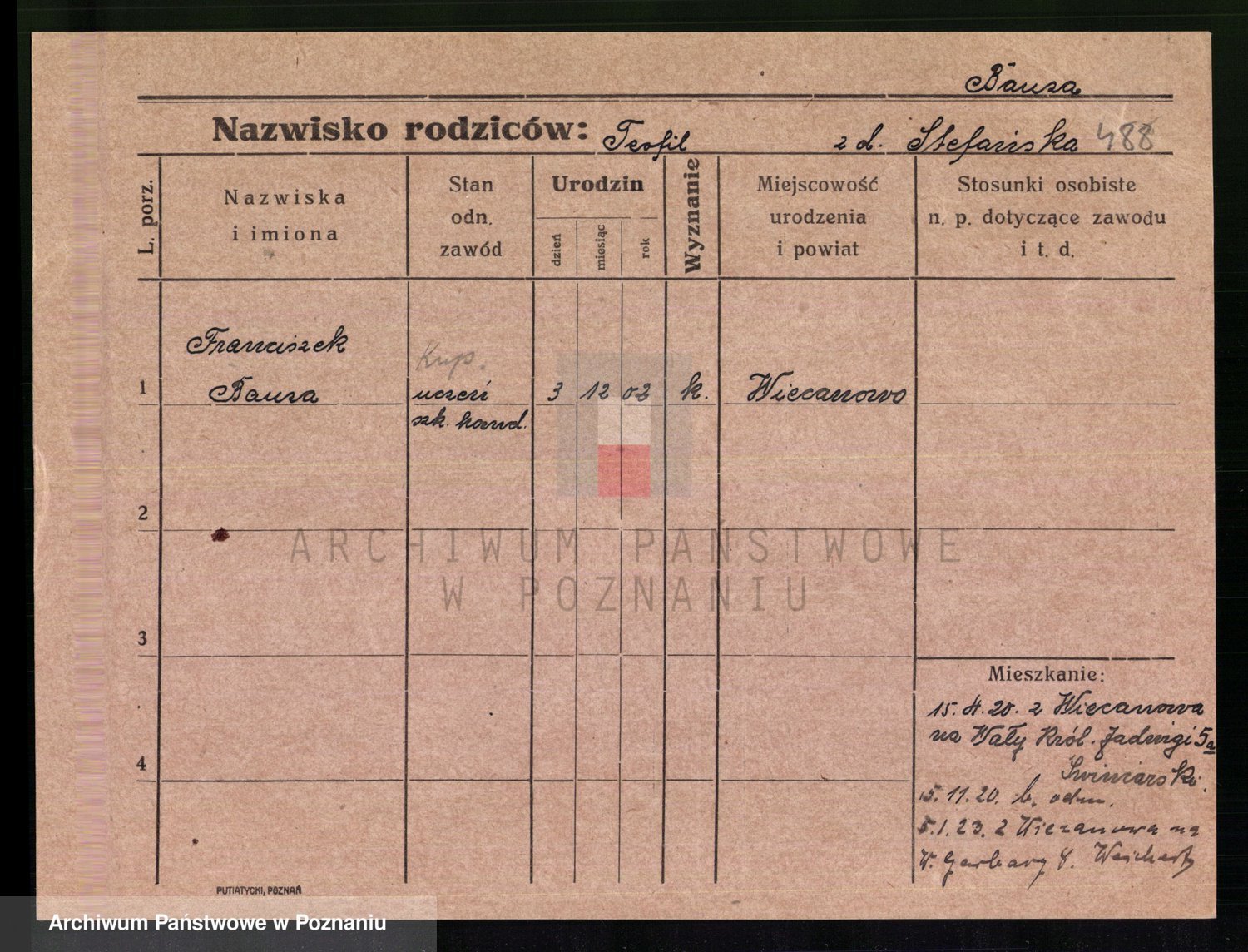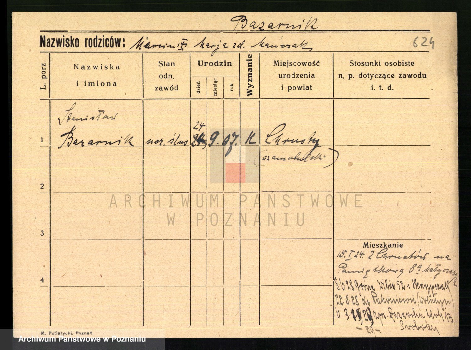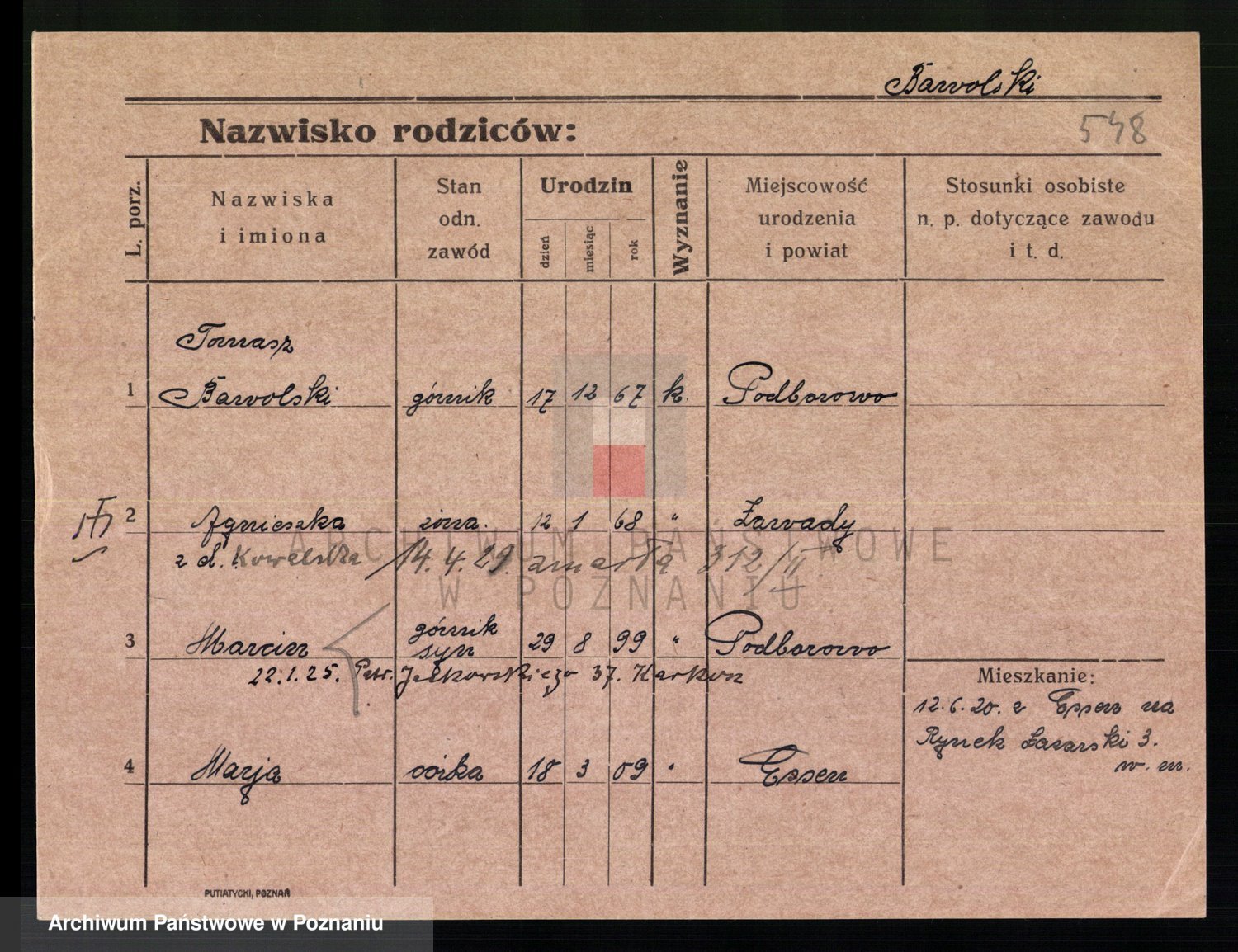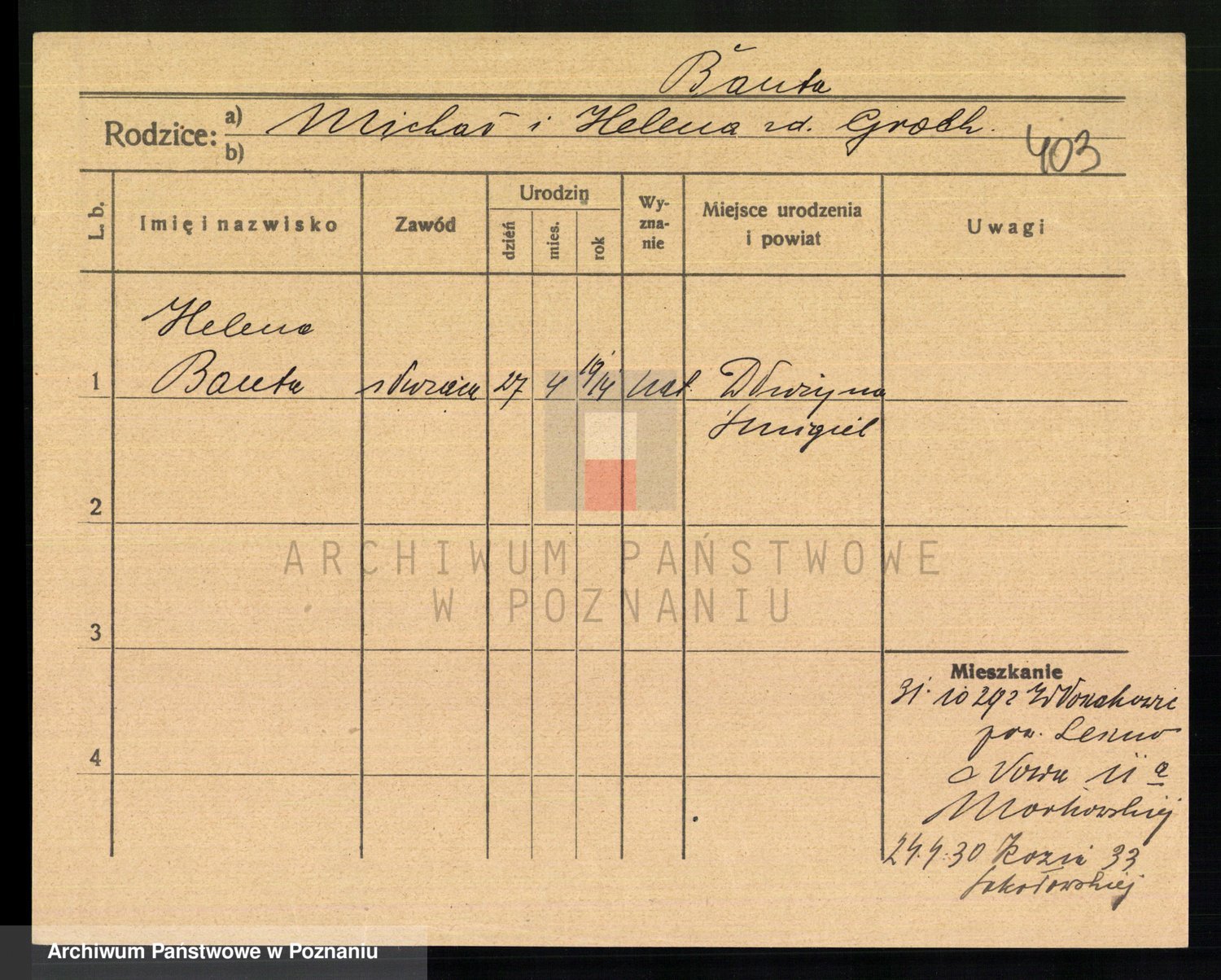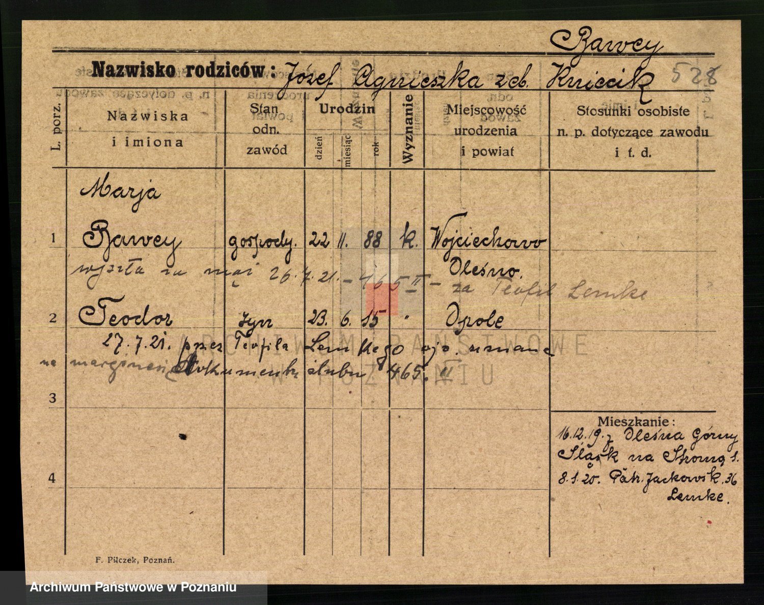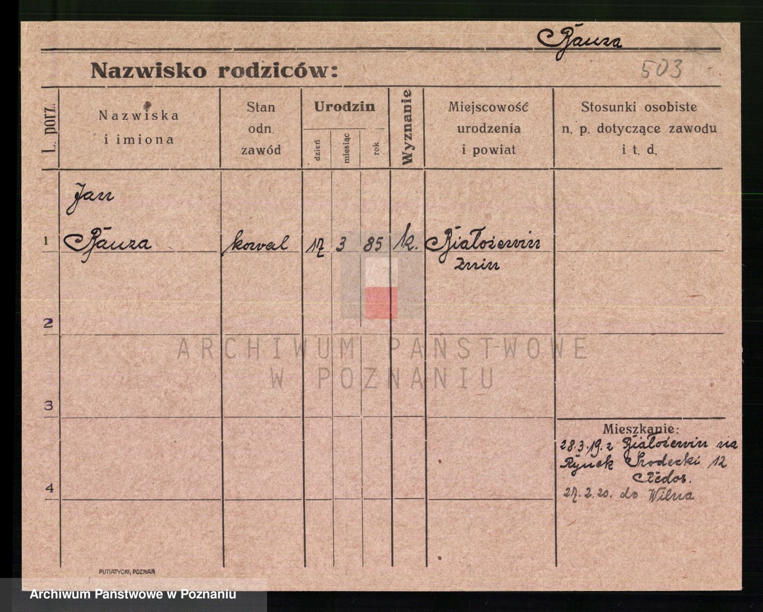 Podgląd karty osobowej dostępny jest po kliknięciu na nazwisko lub ikonkę karty. Można dokonywać powiększenia (ikony na górze) lub przechodzić między kolejnymi skanami (strzałki po bokach).