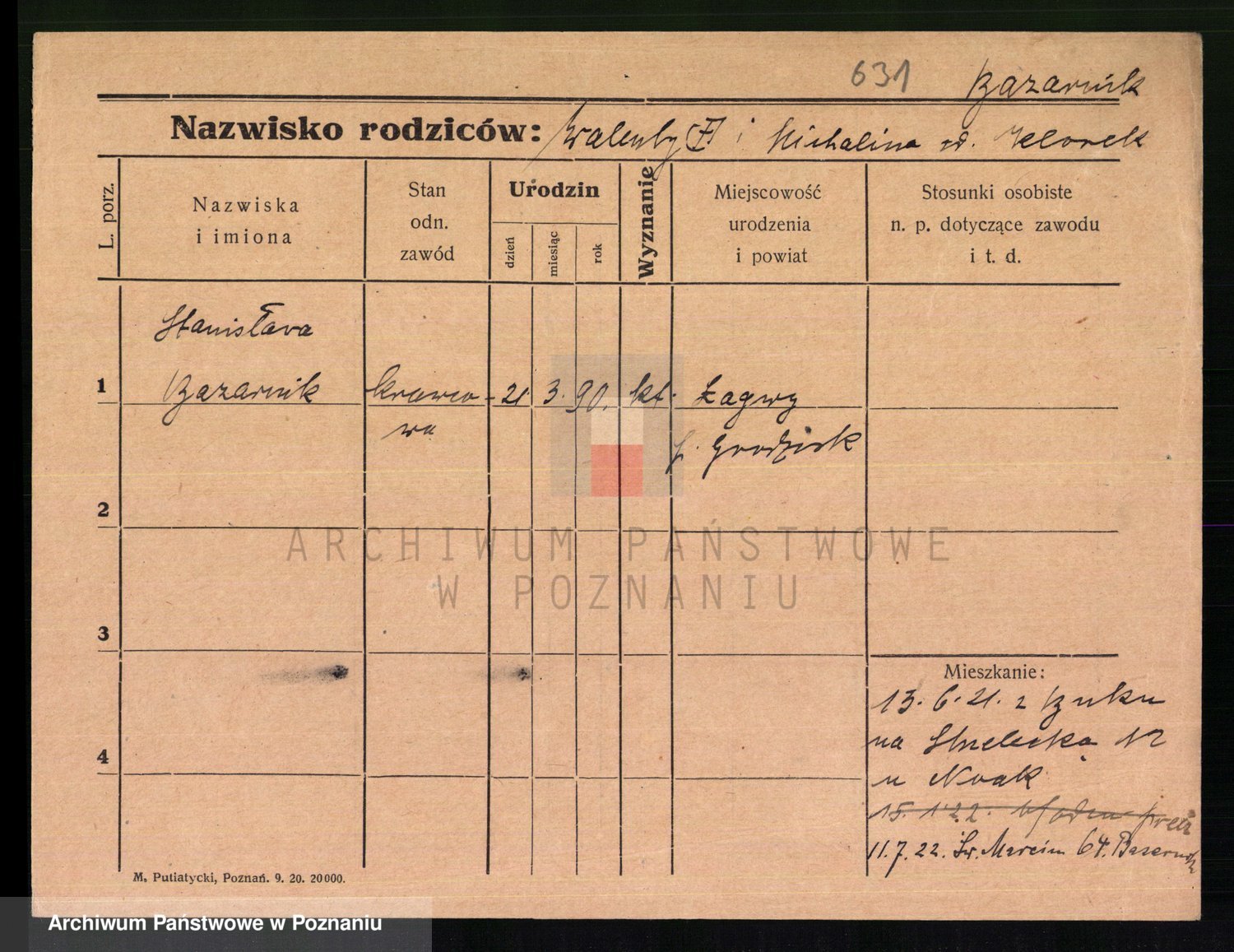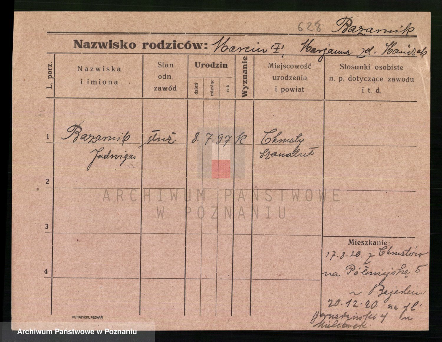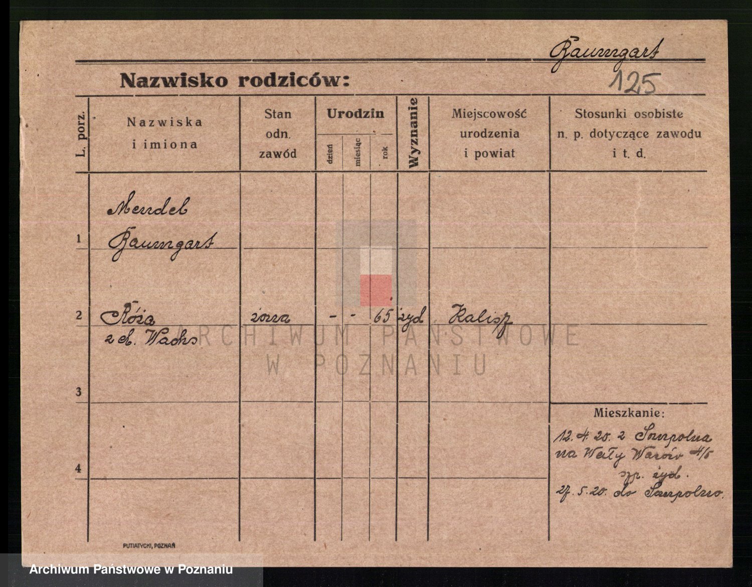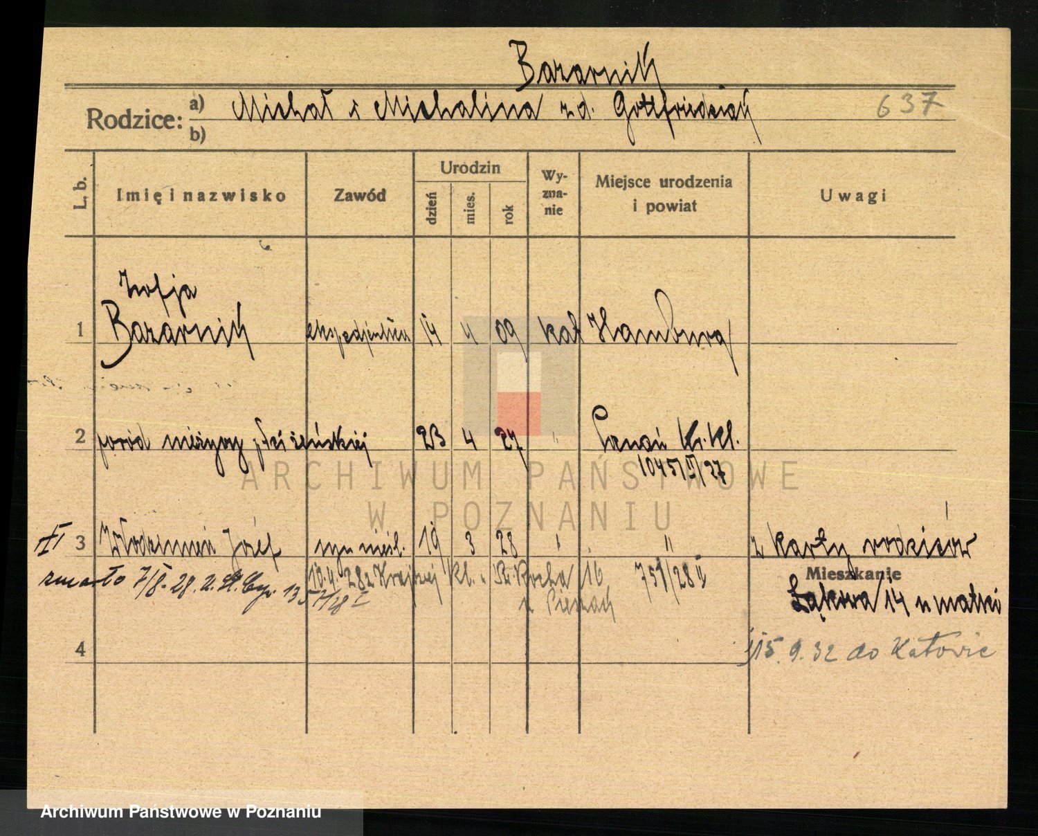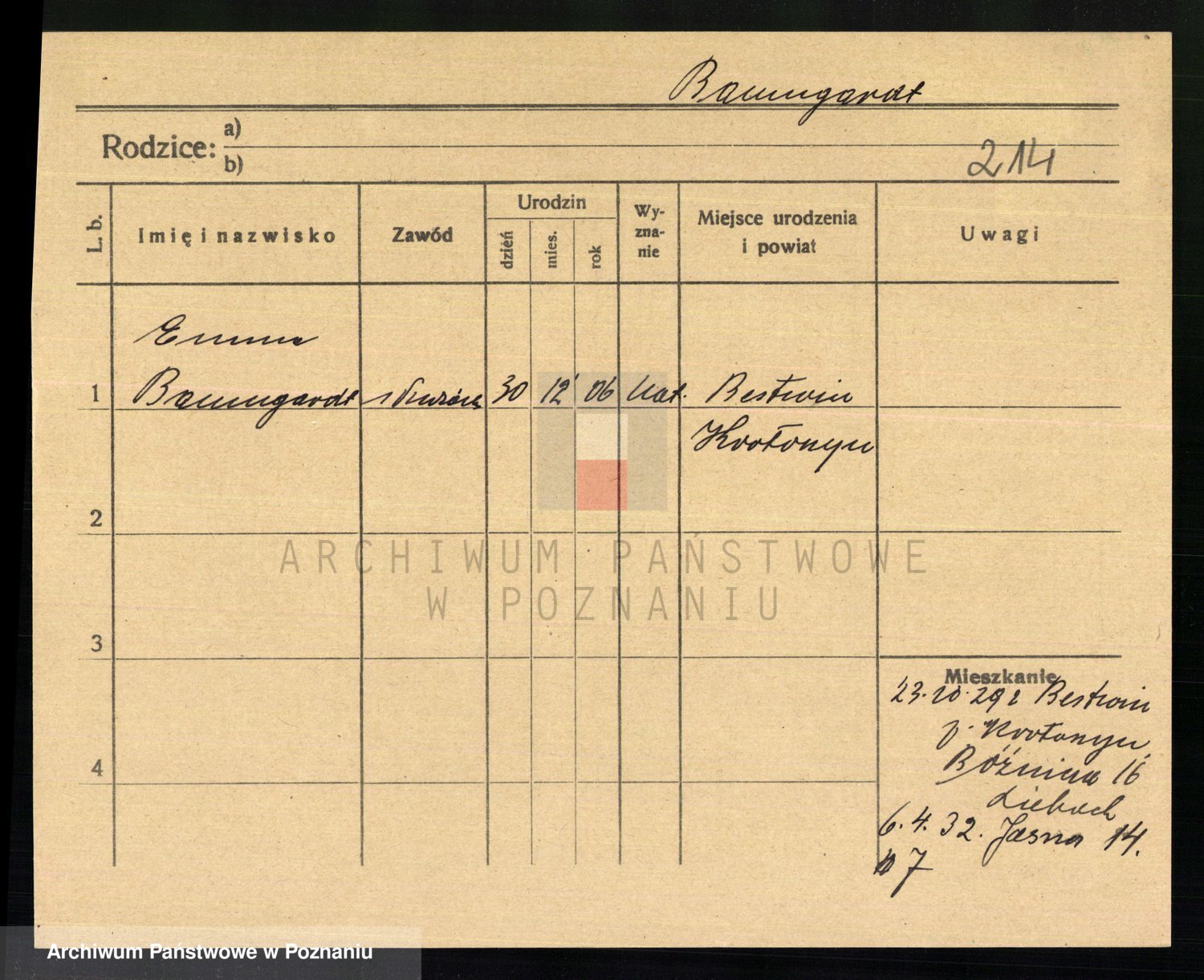 Podgląd karty osobowej dostępny jest po kliknięciu na nazwisko lub ikonkę karty. Można dokonywać powiększenia (ikony na górze) lub przechodzić między kolejnymi skanami (strzałki po bokach).