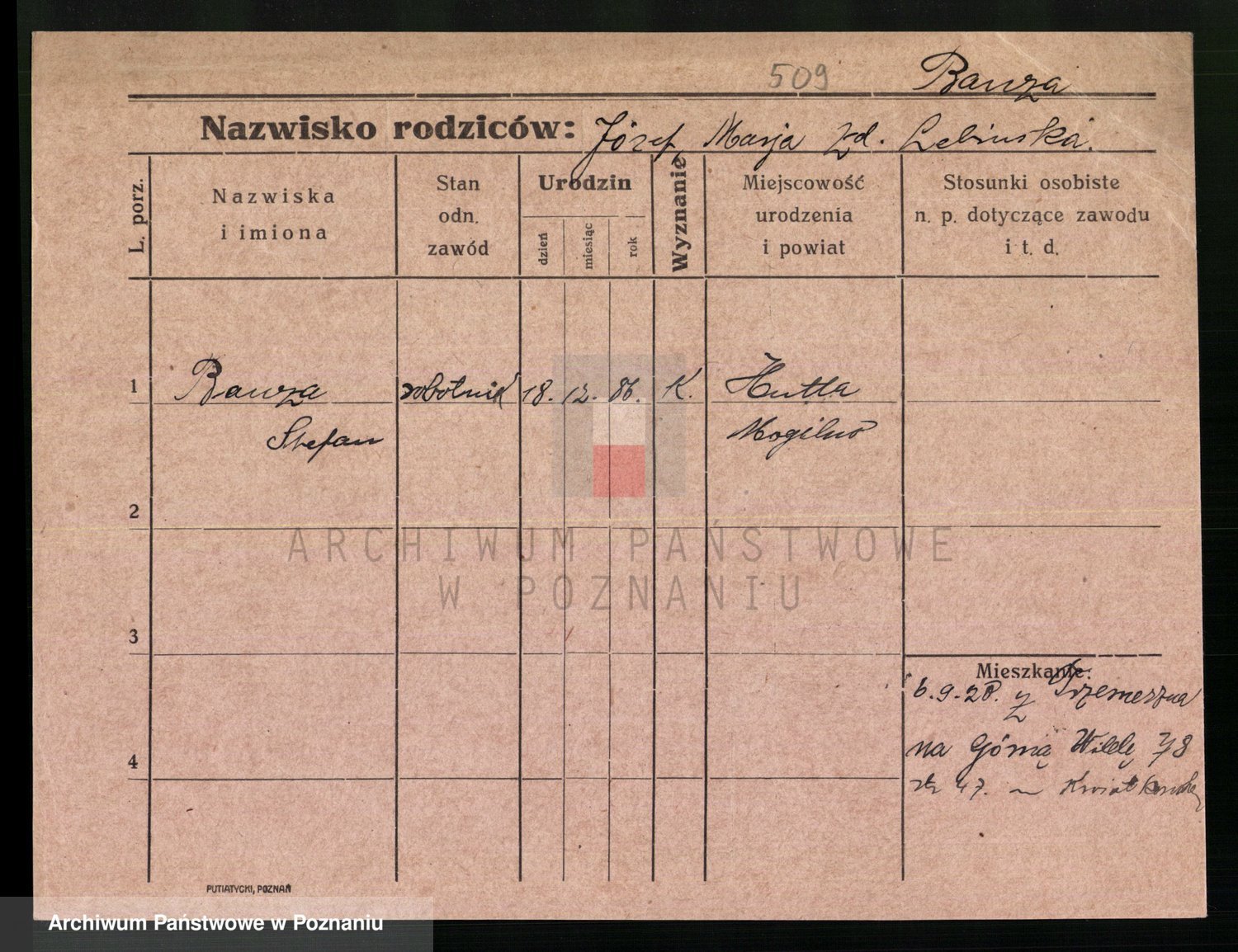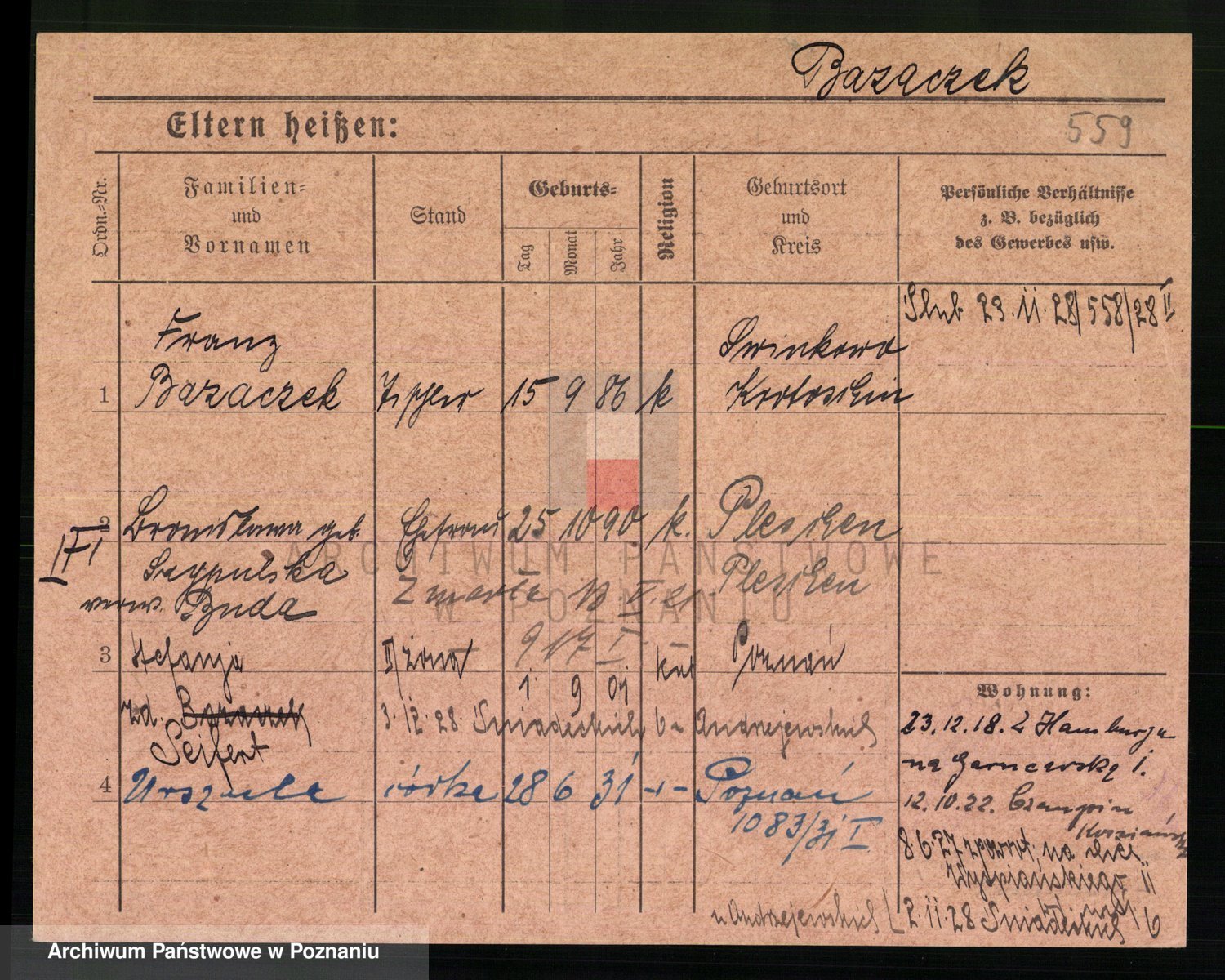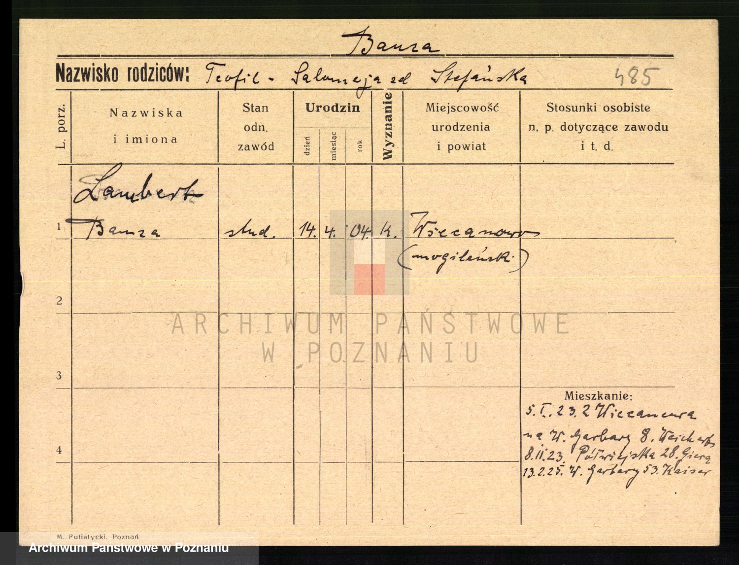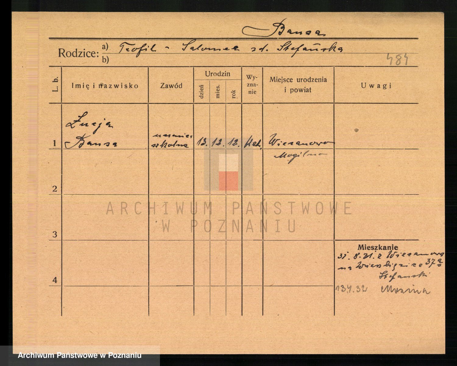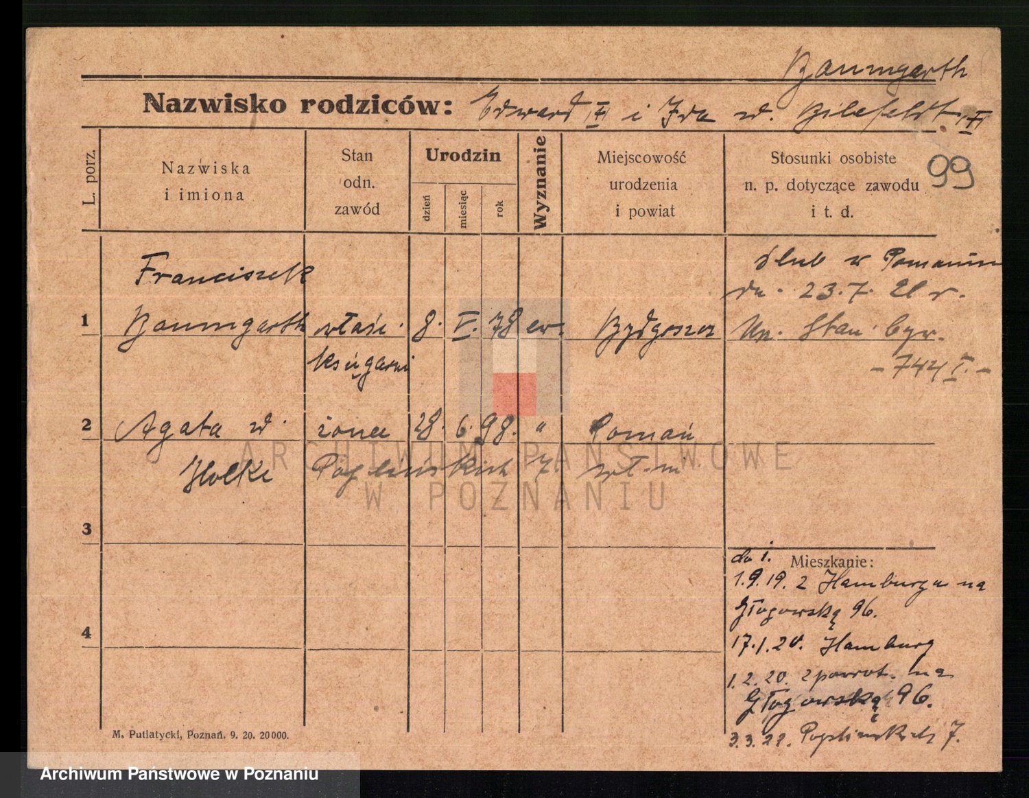 Podgląd karty osobowej dostępny jest po kliknięciu na nazwisko lub ikonkę karty. Można dokonywać powiększenia (ikony na górze) lub przechodzić między kolejnymi skanami (strzałki po bokach).