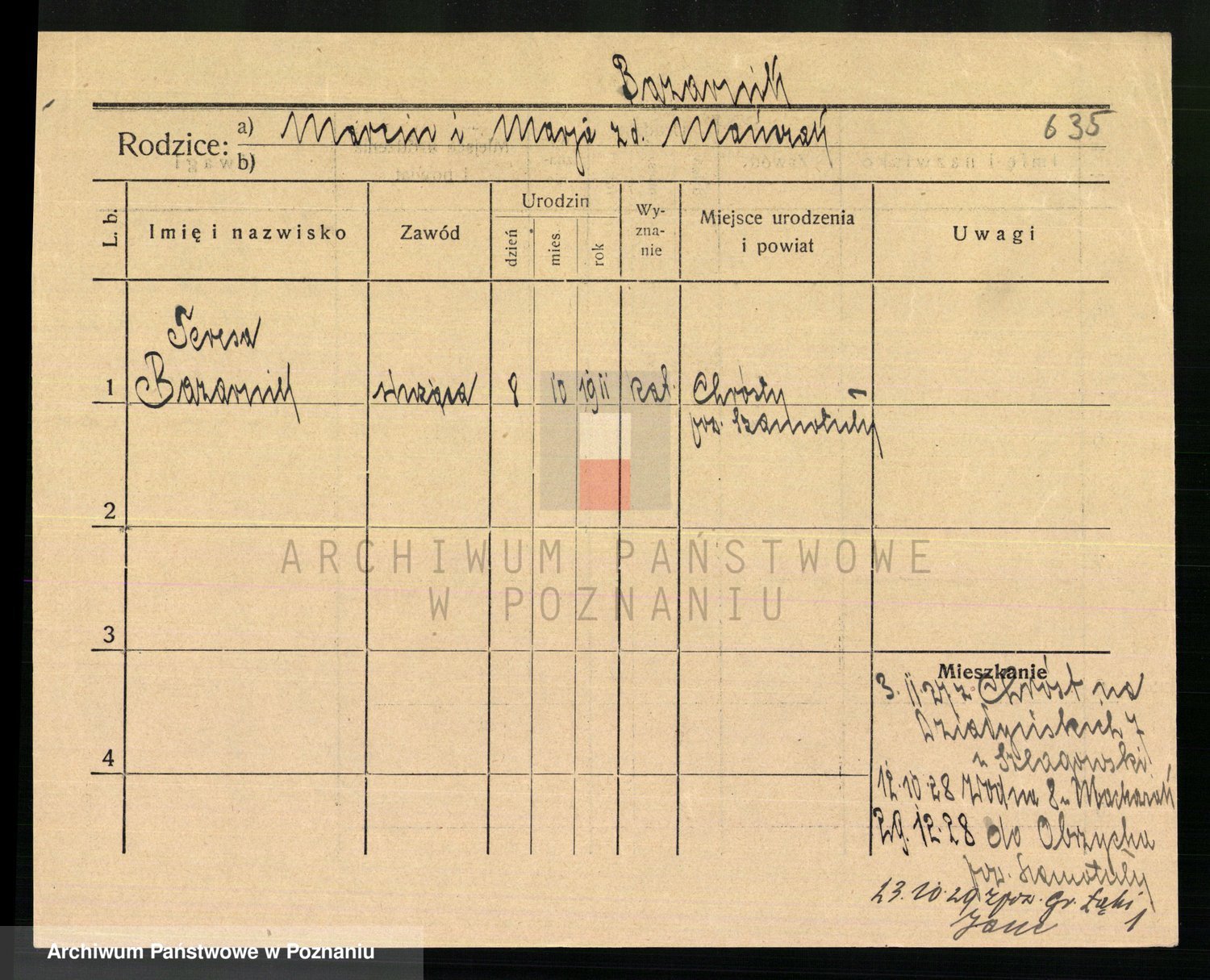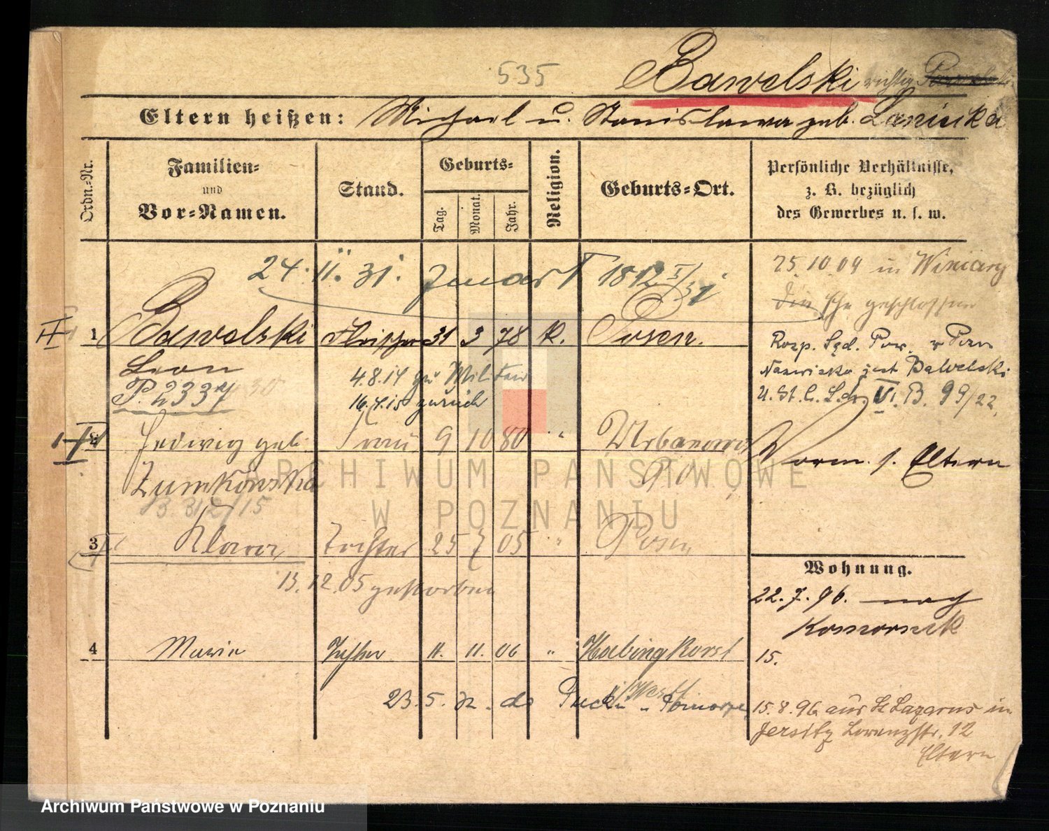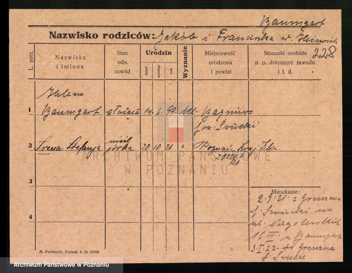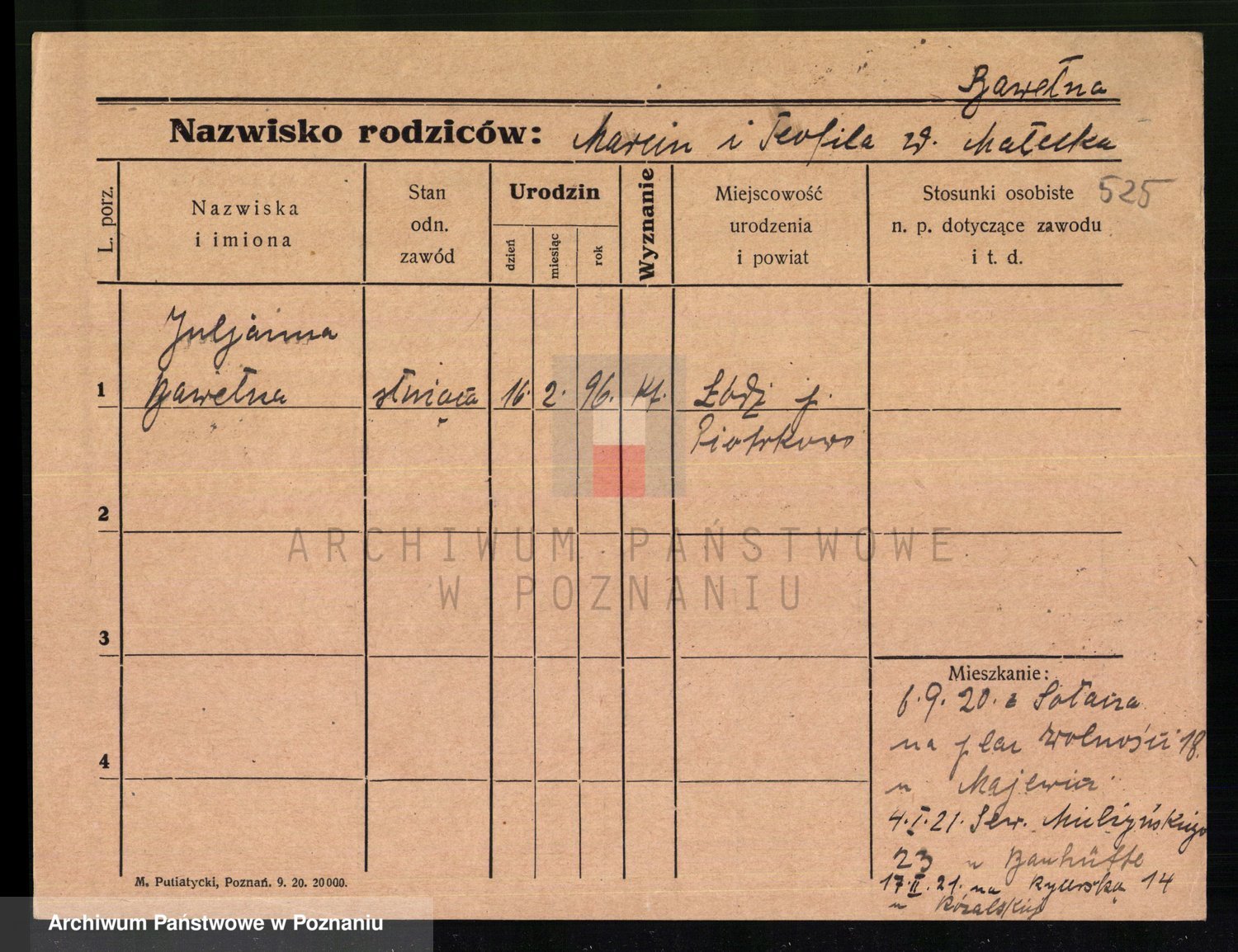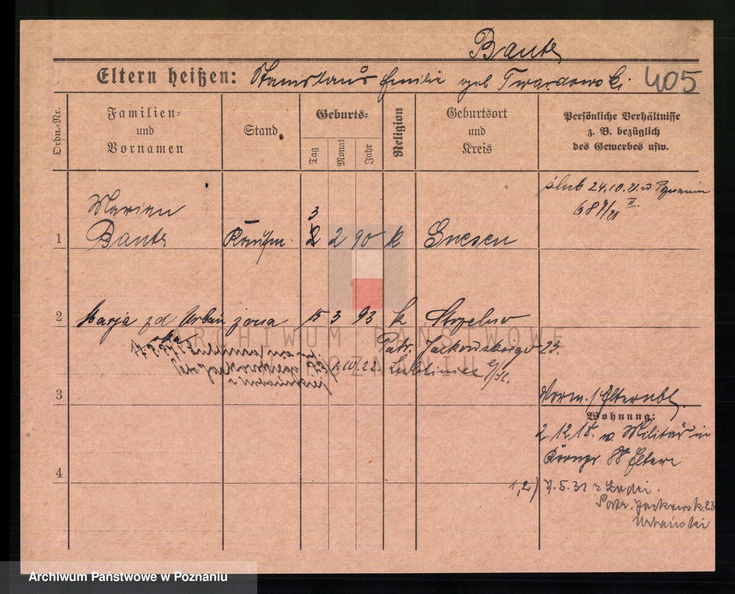 Podgląd karty osobowej dostępny jest po kliknięciu na nazwisko lub ikonkę karty. Można dokonywać powiększenia (ikony na górze) lub przechodzić między kolejnymi skanami (strzałki po bokach).