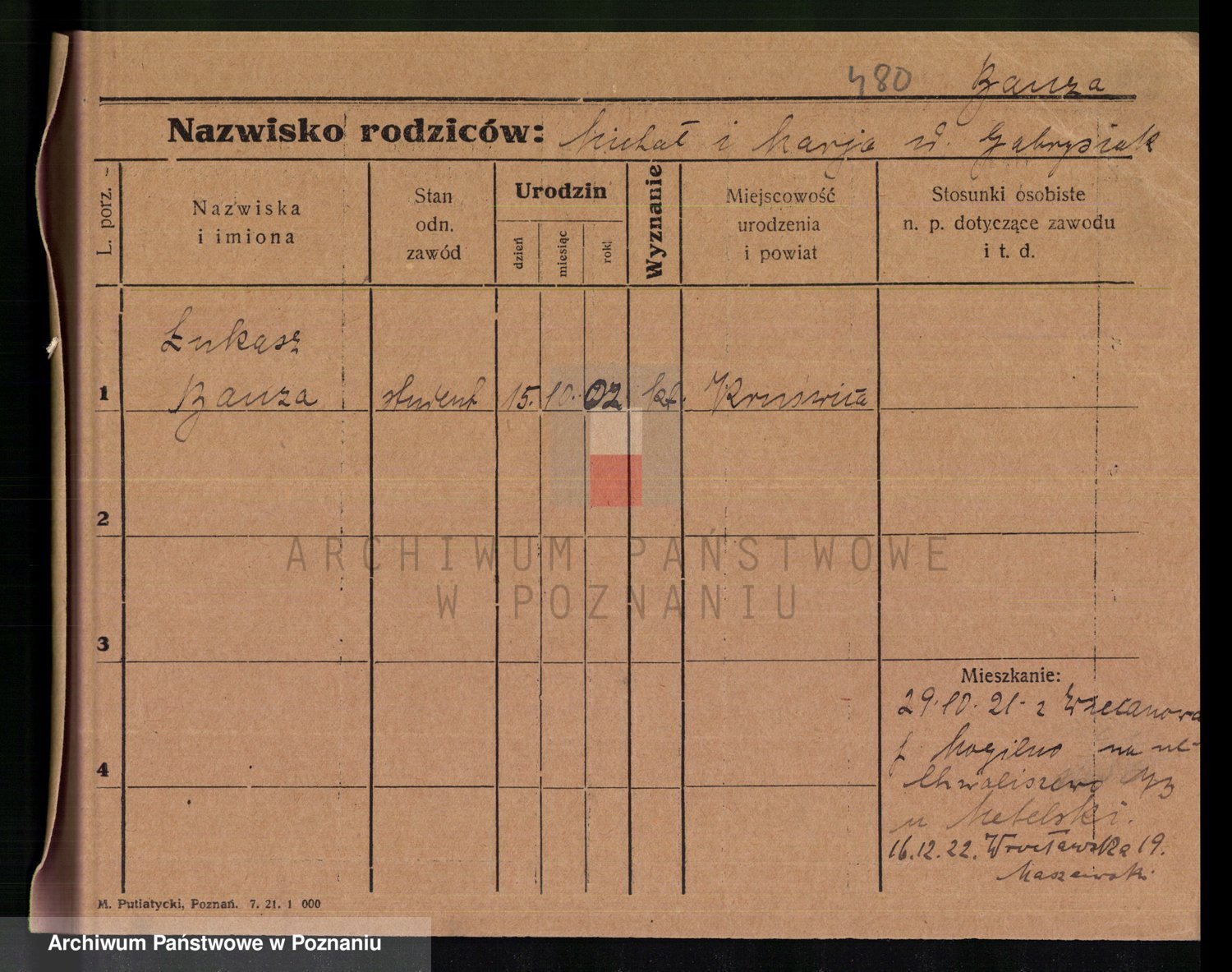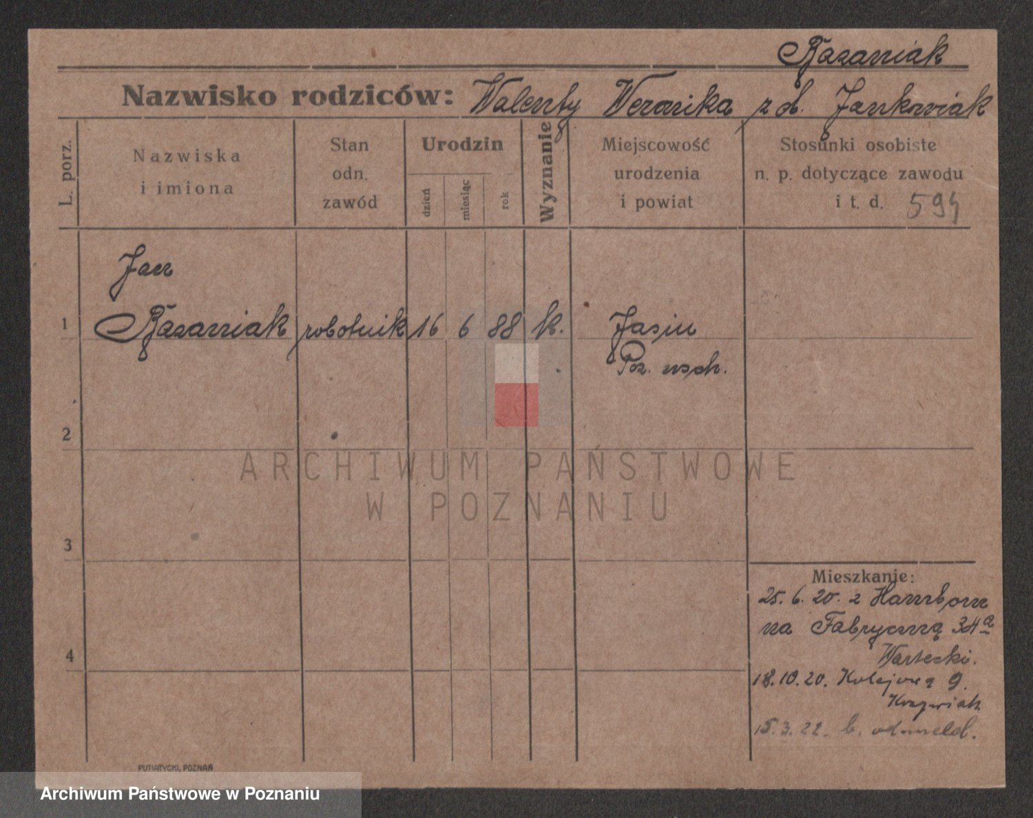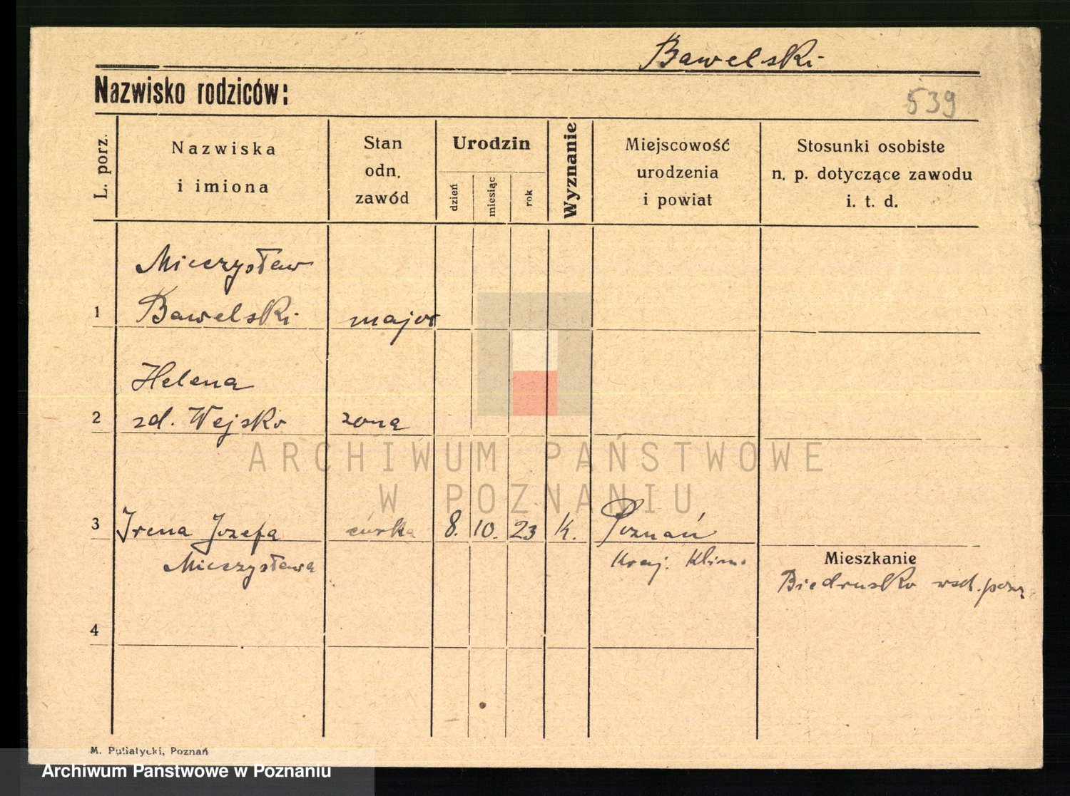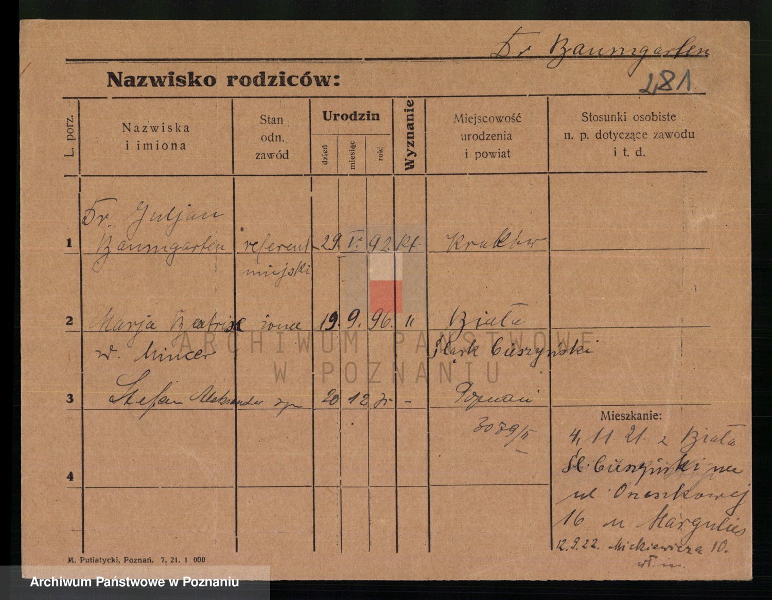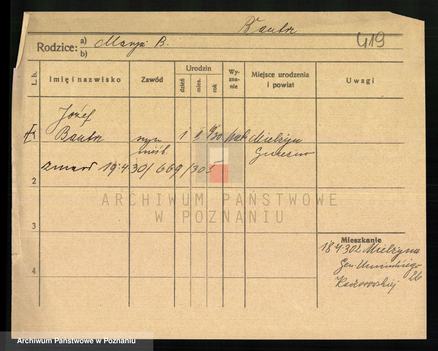 Podgląd karty osobowej dostępny jest po kliknięciu na nazwisko lub ikonkę karty. Można dokonywać powiększenia (ikony na górze) lub przechodzić między kolejnymi skanami (strzałki po bokach).