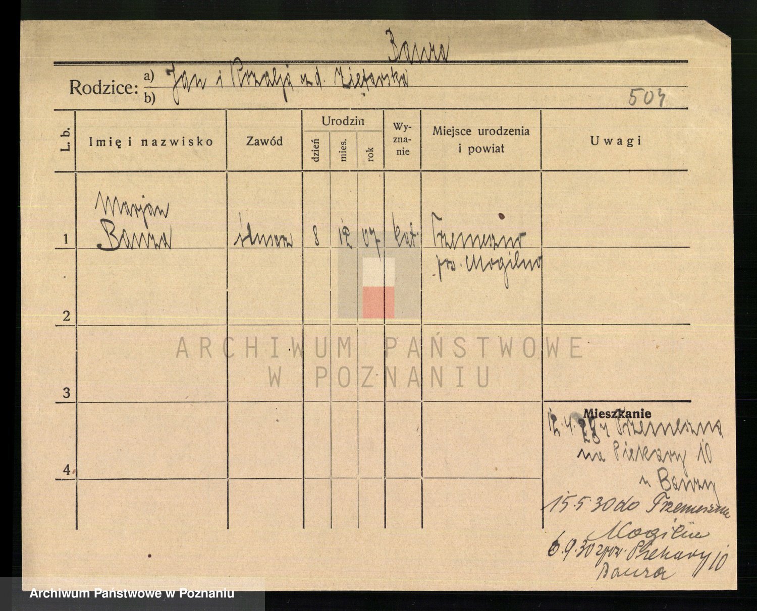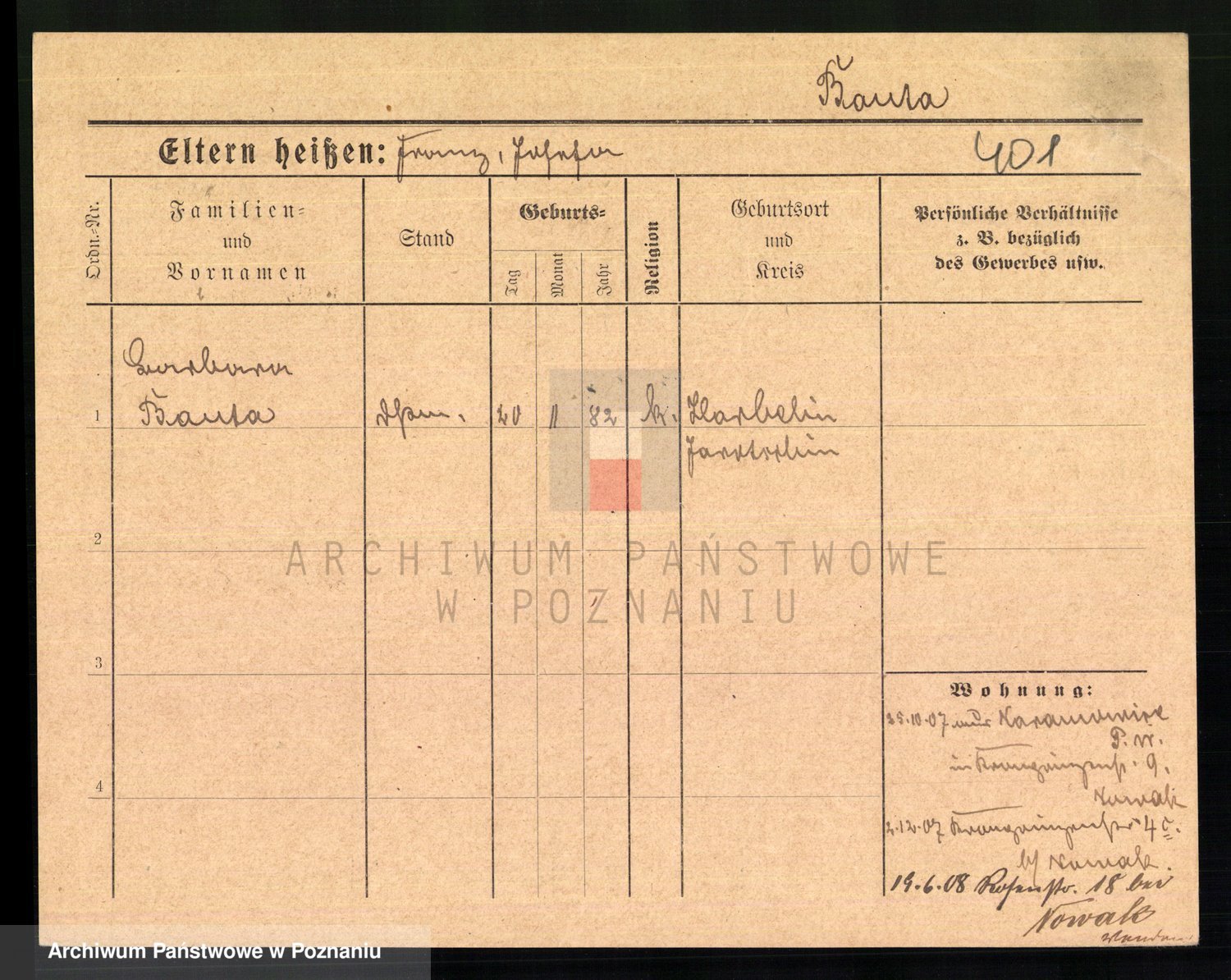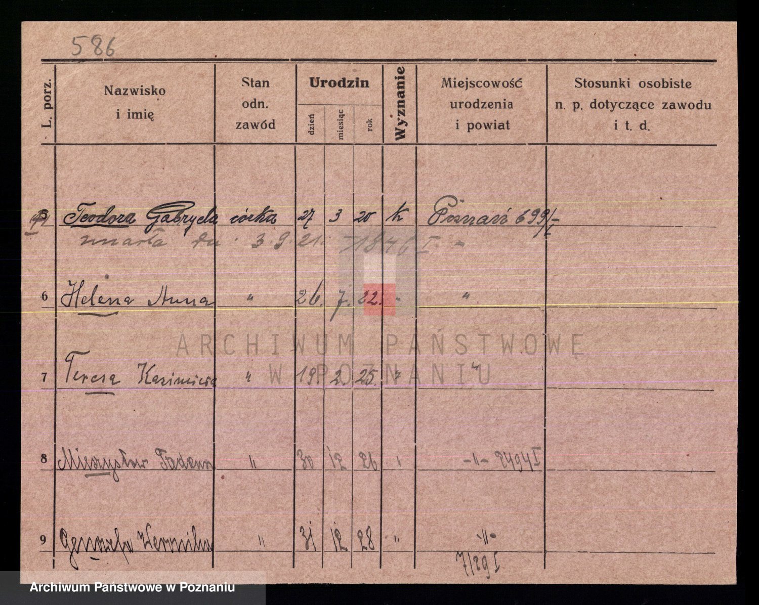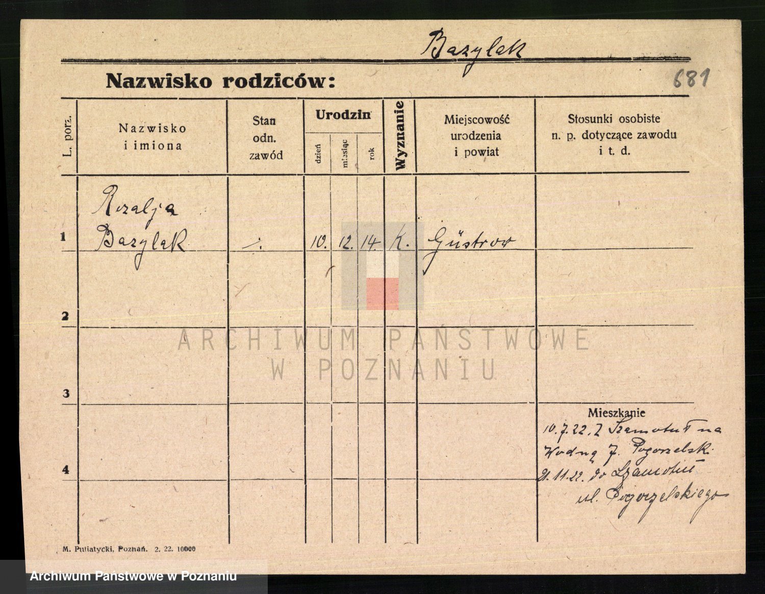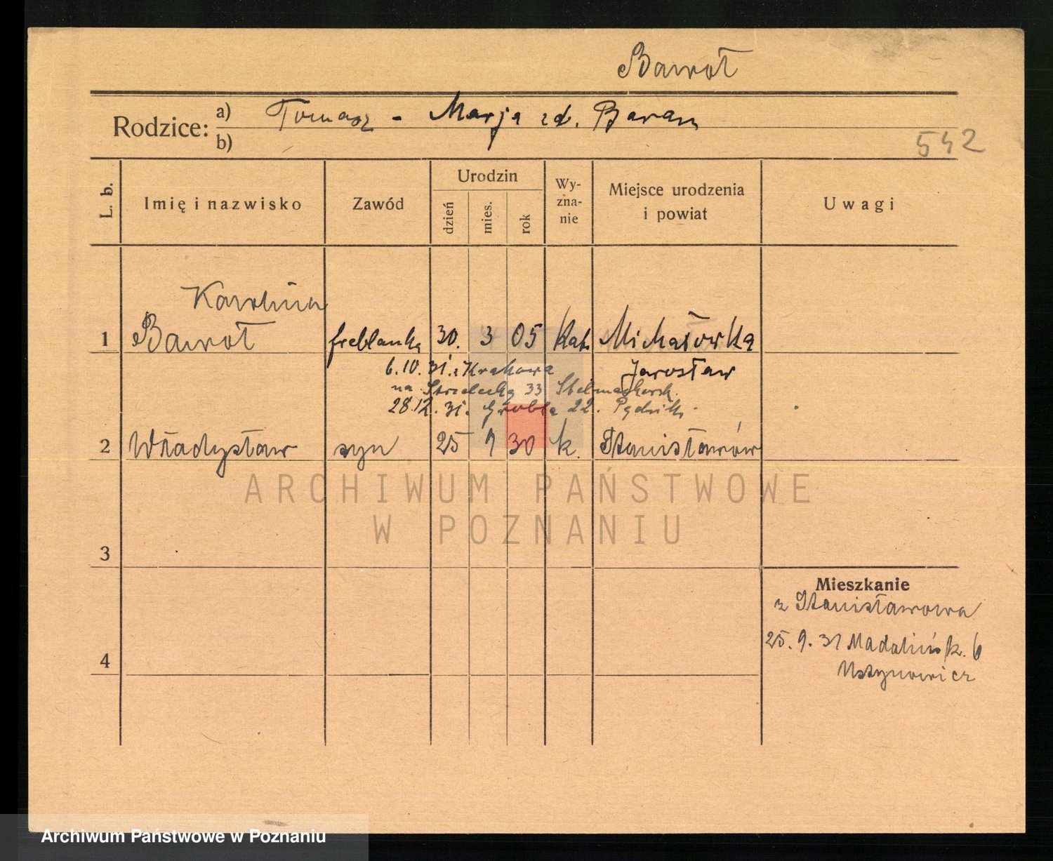 Podgląd karty osobowej dostępny jest po kliknięciu na nazwisko lub ikonkę karty. Można dokonywać powiększenia (ikony na górze) lub przechodzić między kolejnymi skanami (strzałki po bokach).
