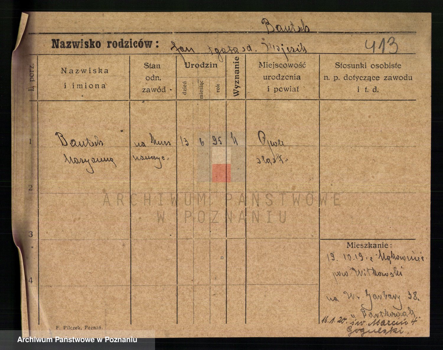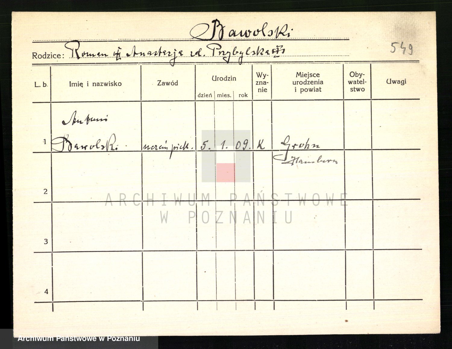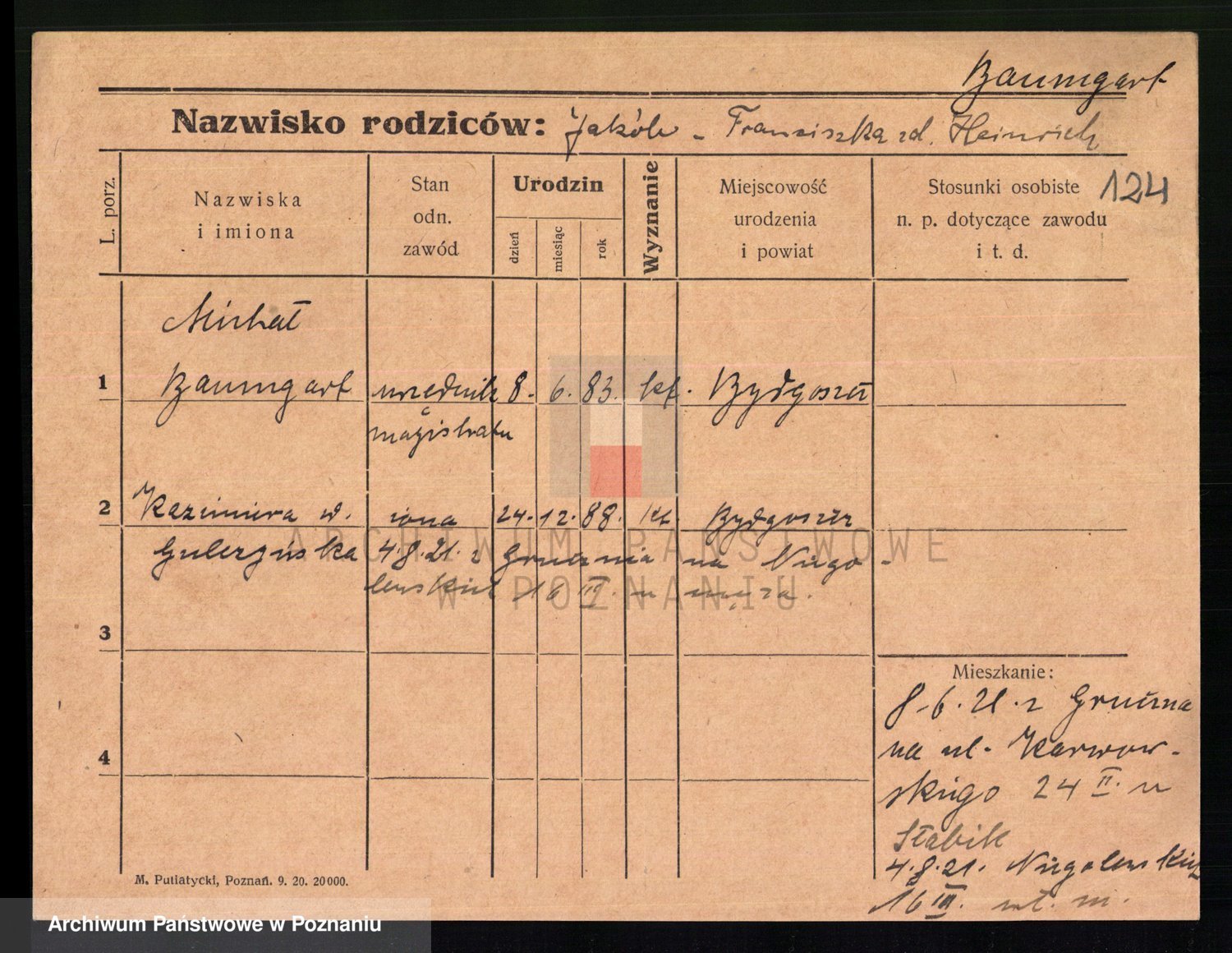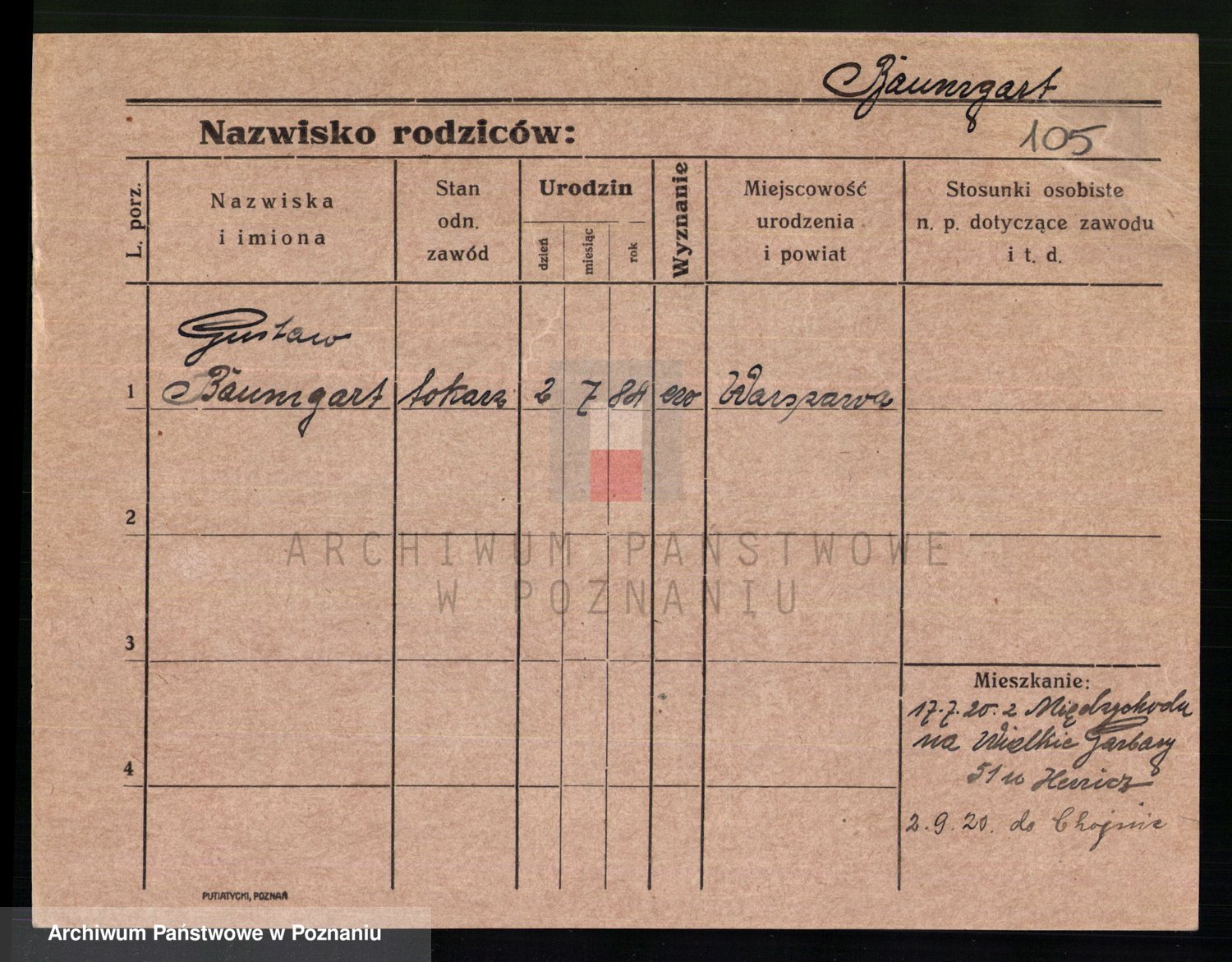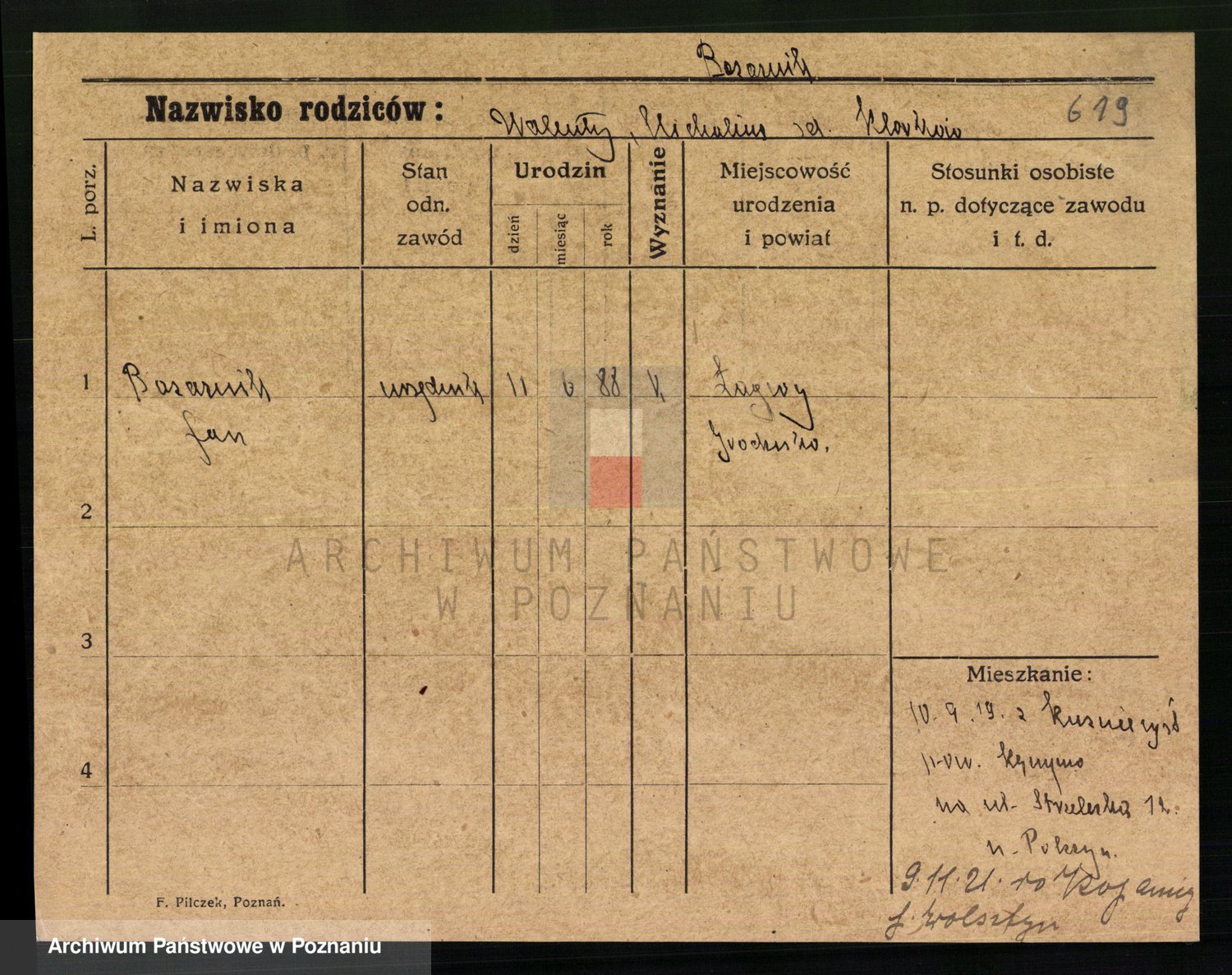 Podgląd karty osobowej dostępny jest po kliknięciu na nazwisko lub ikonkę karty. Można dokonywać powiększenia (ikony na górze) lub przechodzić między kolejnymi skanami (strzałki po bokach).