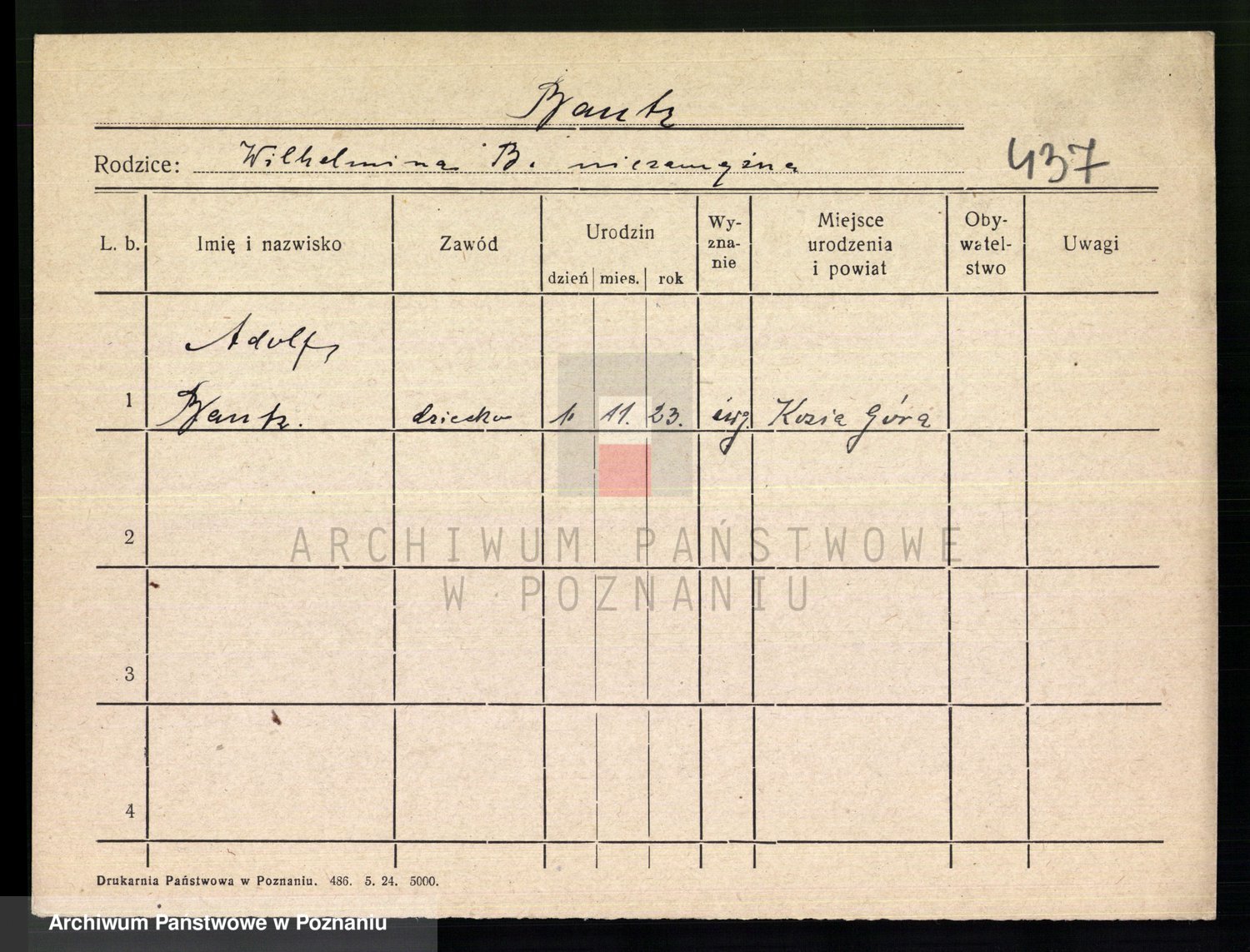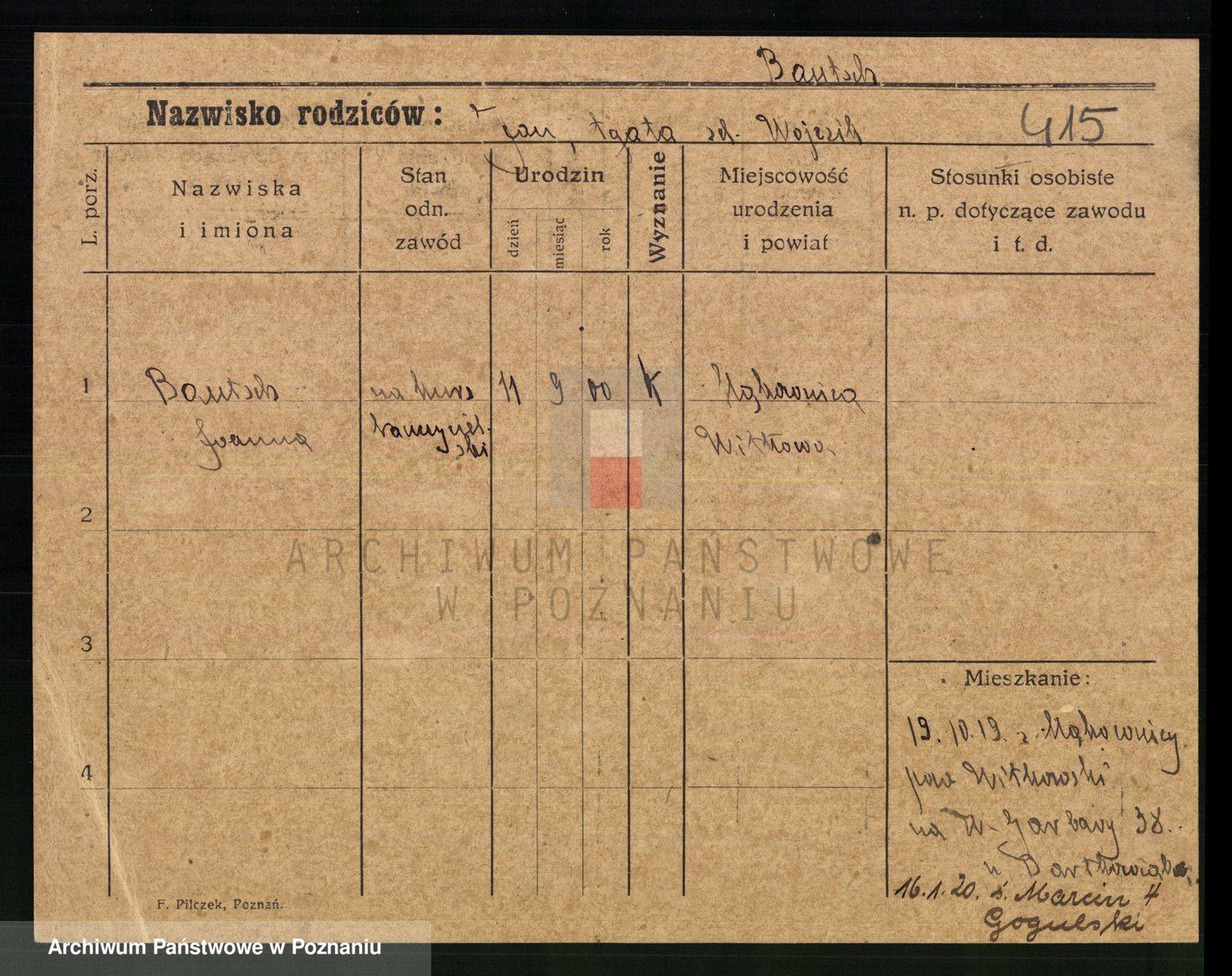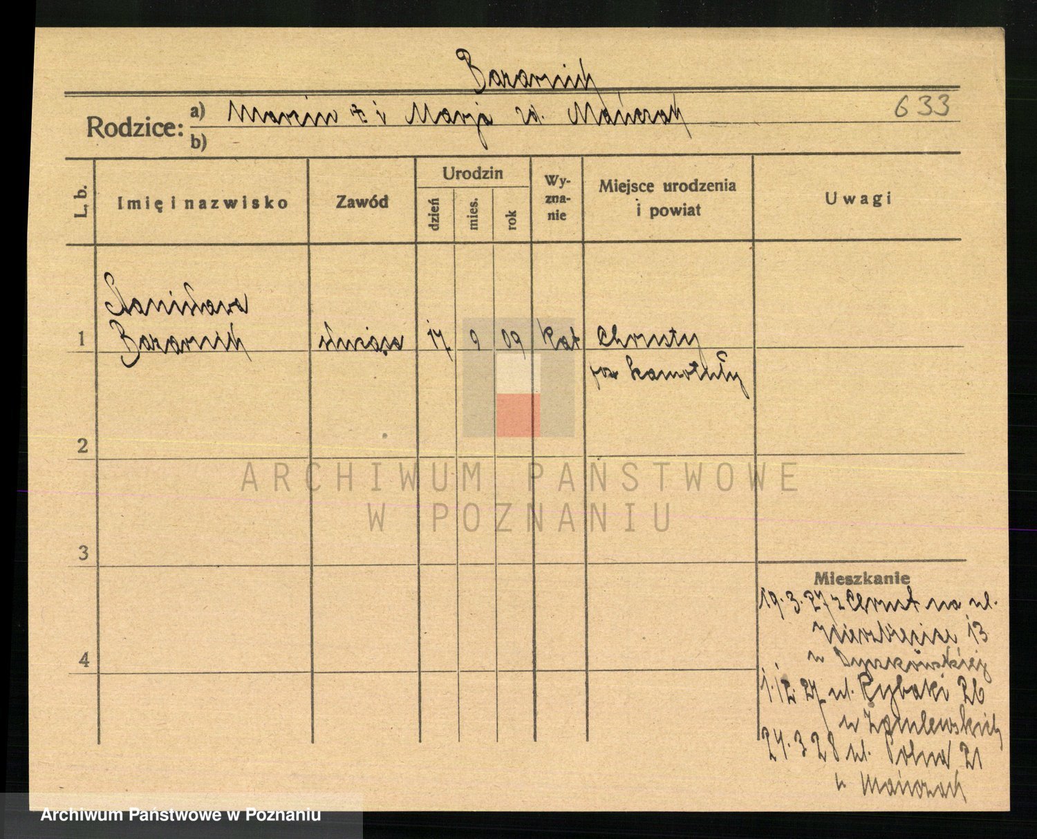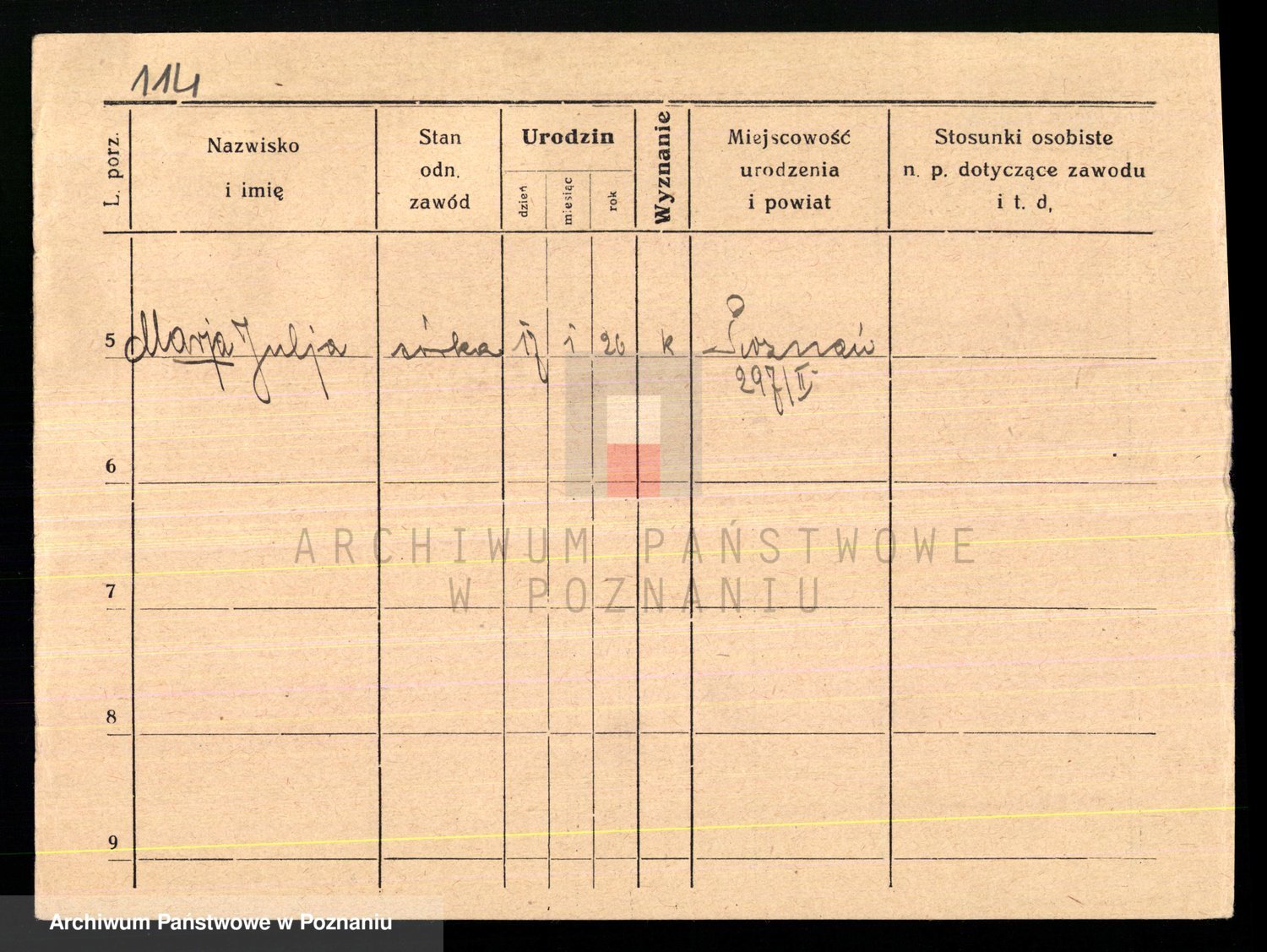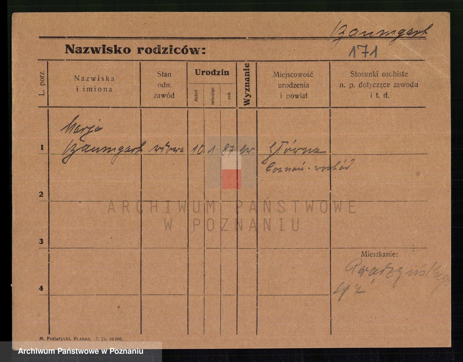 Podgląd karty osobowej dostępny jest po kliknięciu na nazwisko lub ikonkę karty. Można dokonywać powiększenia (ikony na górze) lub przechodzić między kolejnymi skanami (strzałki po bokach).