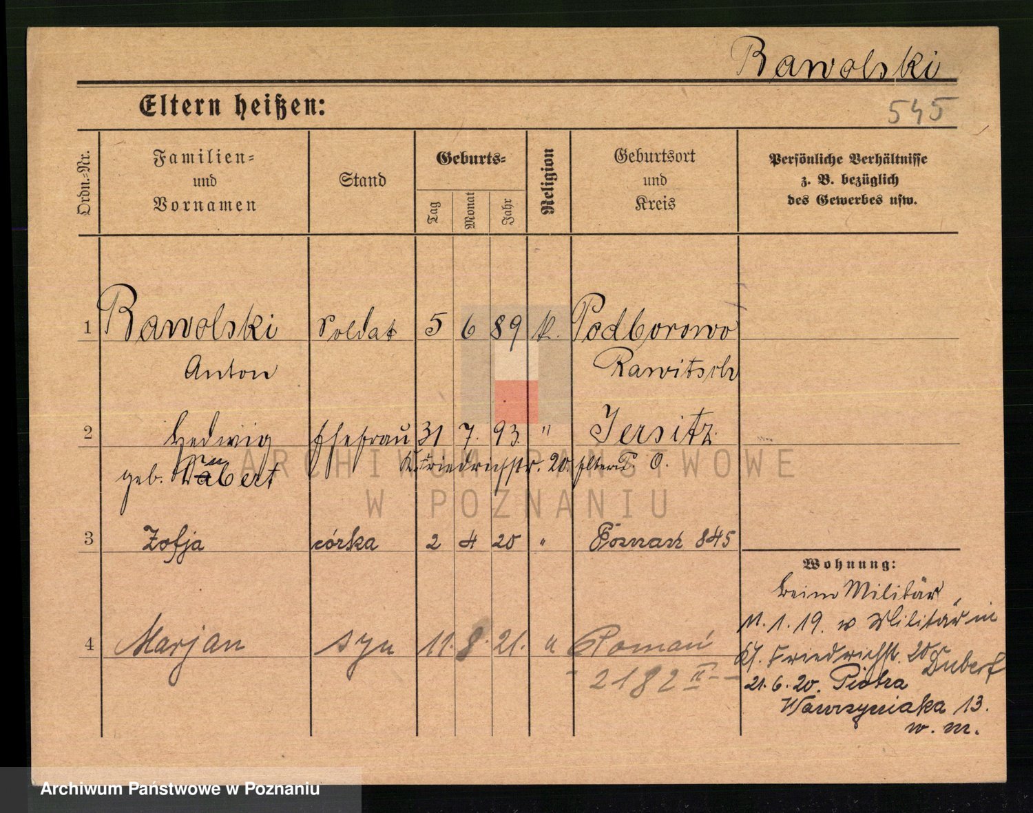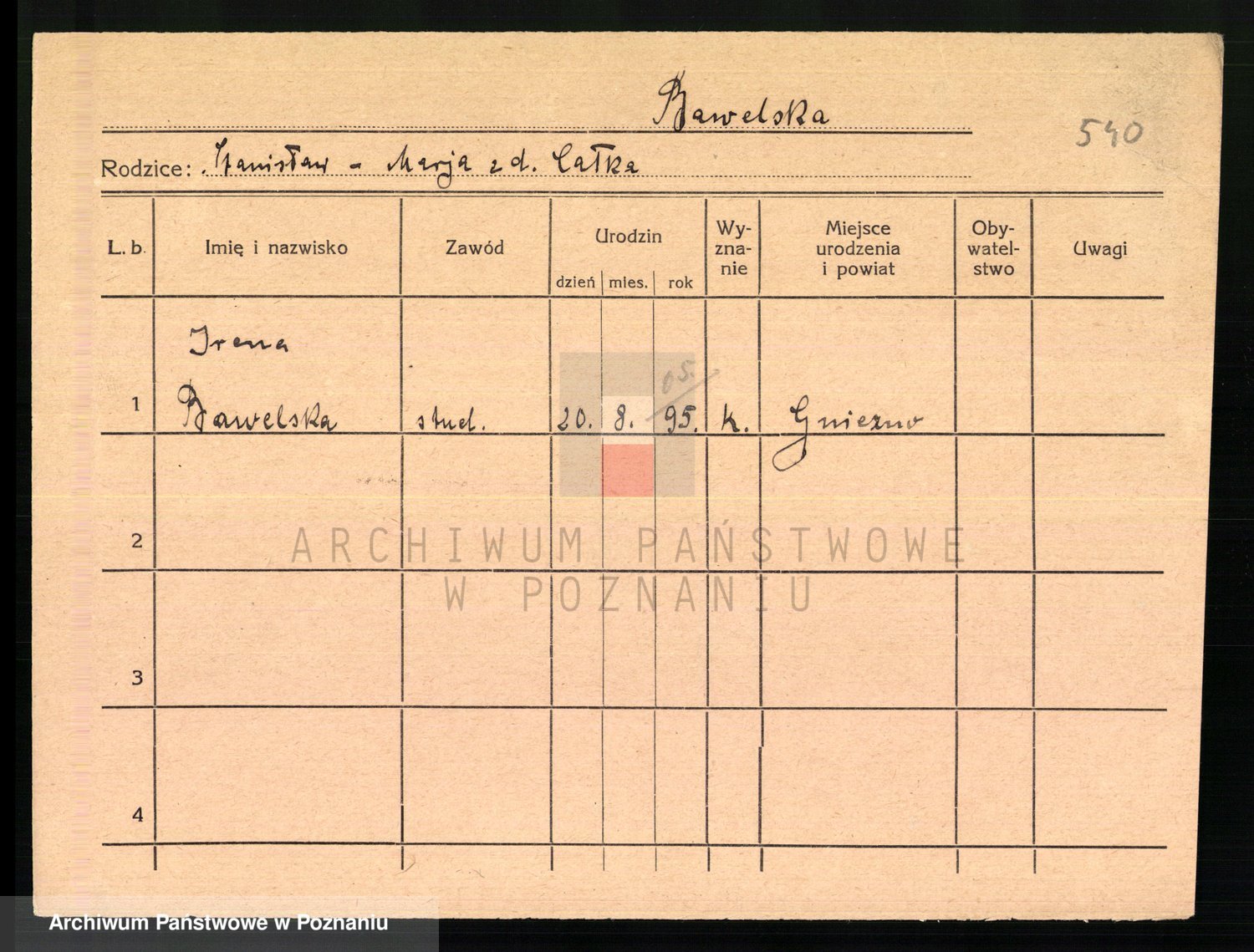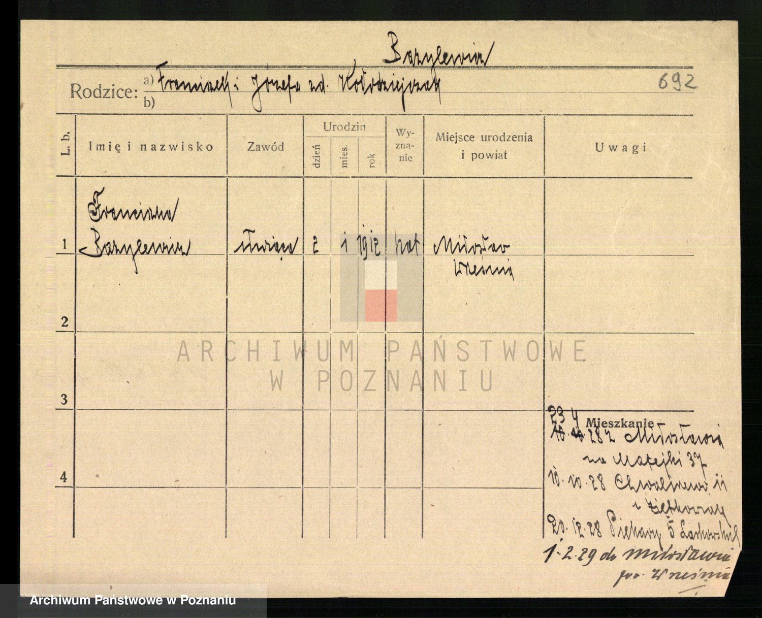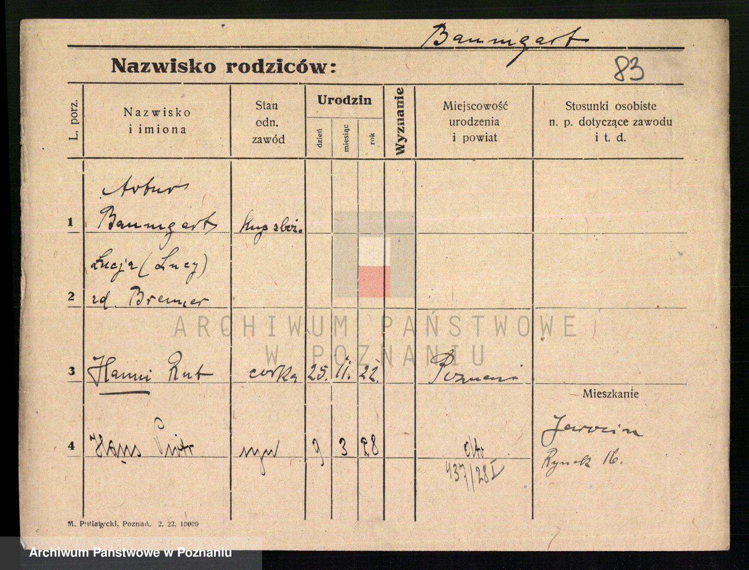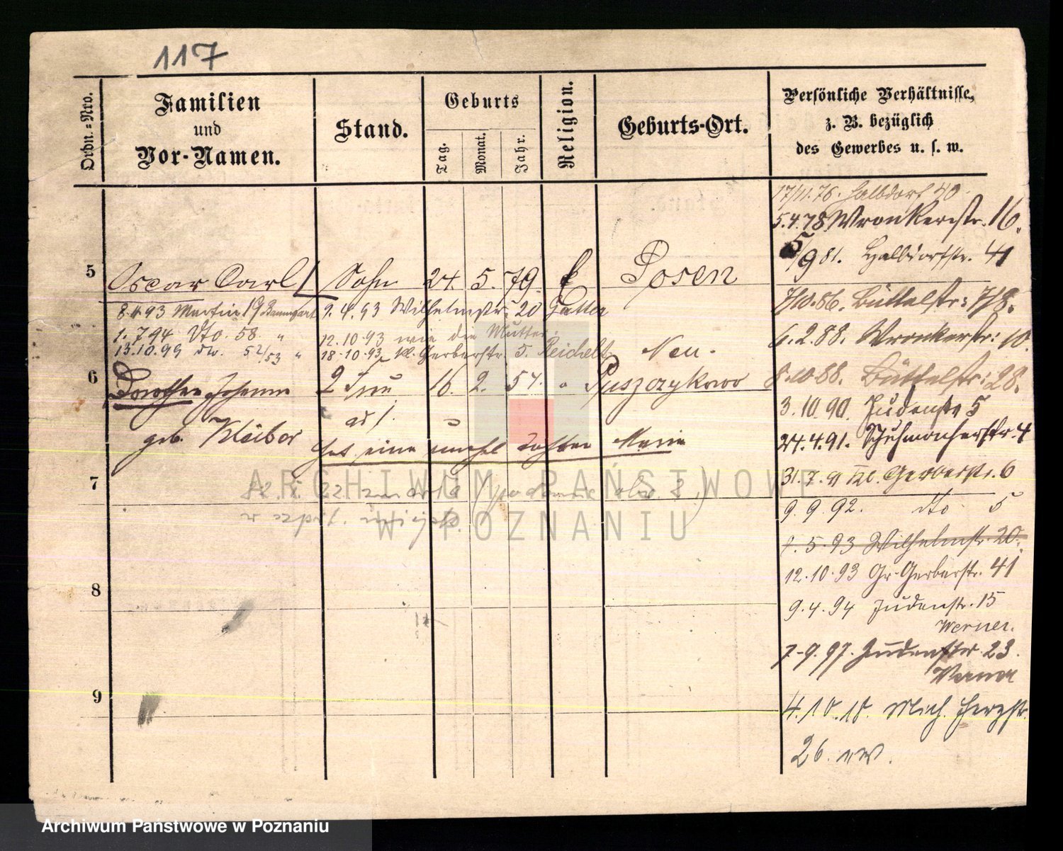 Podgląd karty osobowej dostępny jest po kliknięciu na nazwisko lub ikonkę karty. Można dokonywać powiększenia (ikony na górze) lub przechodzić między kolejnymi skanami (strzałki po bokach).